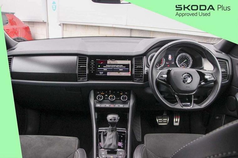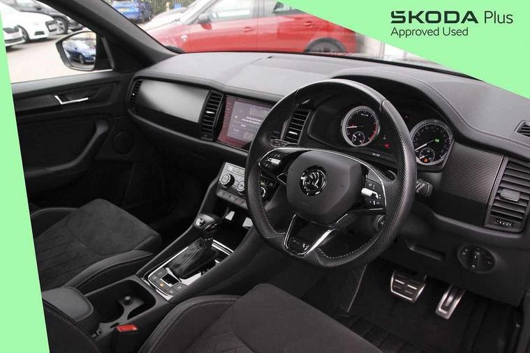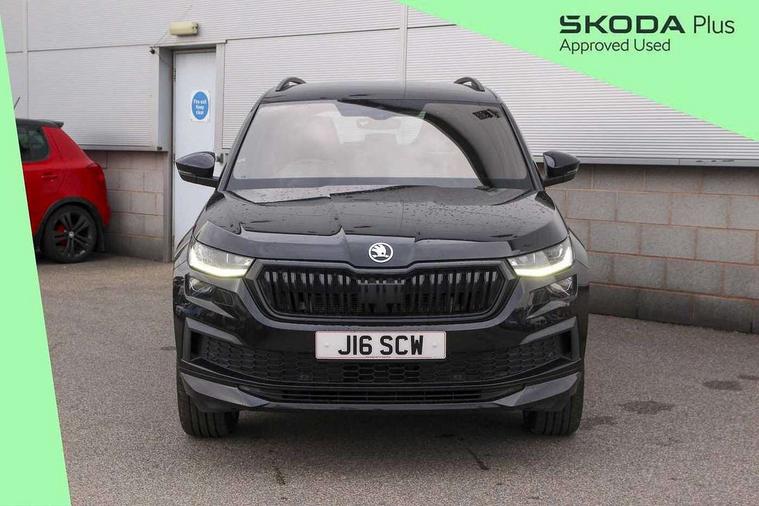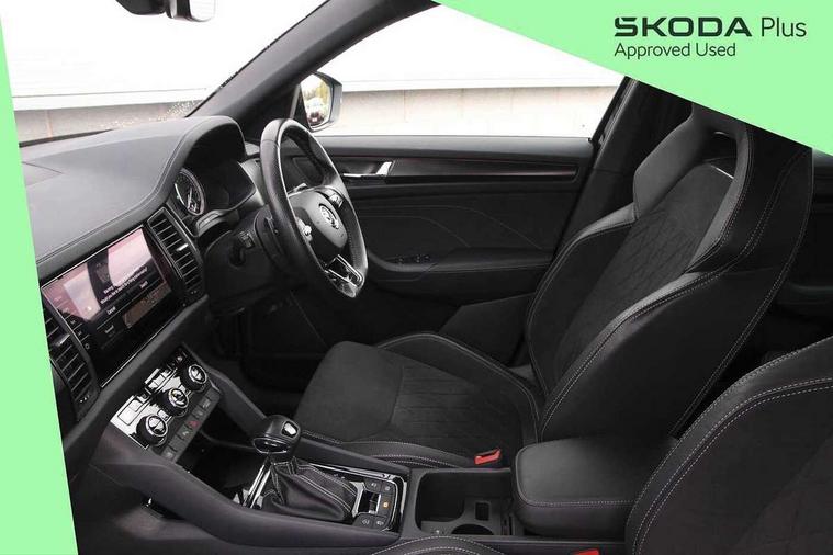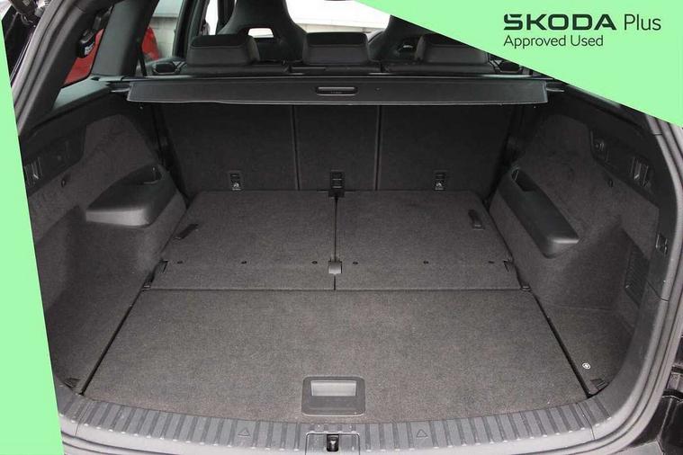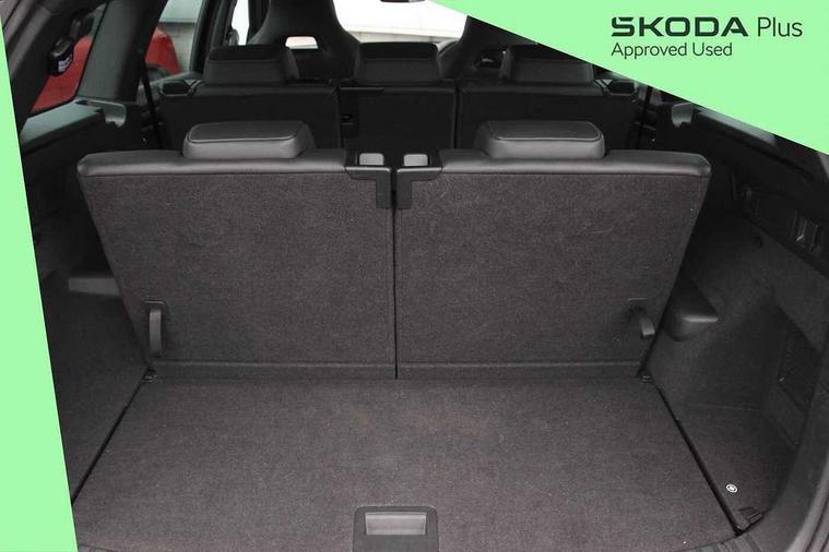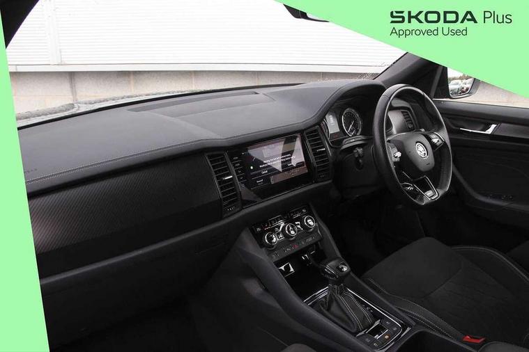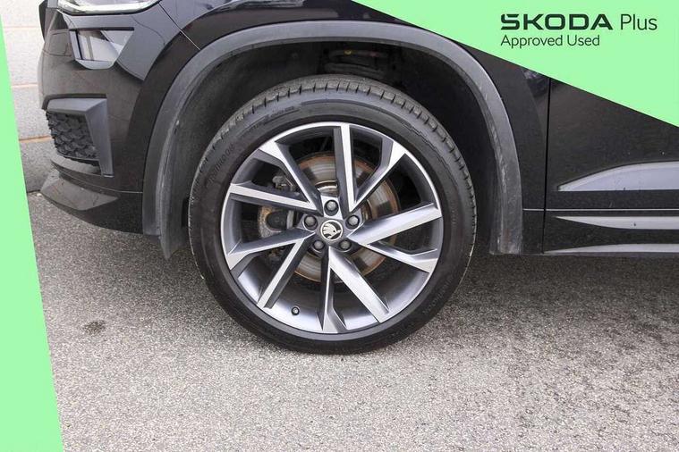 Bluetooth system, Columbus satellite navigation with 9.2" touchscreen, integrated Wi-Fi, web radio, Digital voice enhancement, E-call, ECO Stop/start function, Exterior temperature indicator, Progressive steering, Rear view camera, Smartlink wireless for apple carplay and wired for android auto, Speed limiter, Tailgate unlocking from outside, USB C Port x 2 in front centre console, Wireless charging, 8 Speakers, DAB Digital radio, Aero front windscreen wipers with intermittent function, Aero rear window wiper, Auto dimming rear view mirror, Black roof rails, Black sports styling including front grille and window surrounds, Black wheel arch surrounds, Body colour bumpers, Body colour door handles, Electric adjustable/heated/folding door mirrors, driver side auto dimming with boarding sports and memory function, Electric front and rear windows, Extended rear spoiler with finlets in gloss black, Front fog lights, Full LED matrix headlights with AFS (adaptive front light system), cornering function and AWL (all weather lighting system), Gloss black door mirrors, Headlight washers, Heated rear window, Invisible tailpipe, LED daytime running lights, LED rear fog light, LED third brake light in rear spoiler, Light assistant (coming/leaving home/tunnel light), Off-road style lower front bumper element, Privacy glass, Rain and light sensors, Rear diffuser, Rear LED lights (high functionality) with welcome effect and dynamic indicators, Rear side wing doors, Safety reflectors on front and rear doors, Sportline badge on front fender, Sports front and rear bumpers including lower rear chrome strip, Tailgate lettering in Black, Window control switches with black trim, Without engine designation, 12V socket in boot, 2 rails with 2 hooks, 2 seat bench in 3rd row, 3 seat bench in 2nd row, 4 foldable roof handles with rear coat hooks, 60:40 foldable rear seat with sliding adjustment and backrest angle adjustment, Aluminium pedals, Black roof headlining, Bottle holders in door panel in the 1.5 litre front and 1 litre rear, Cargo storage compartments, Chrome headlight control button, Chrome interior door handles, Coat hooks on B pillar, Covered storage compartment on driver side, Front centre armrest with storage compartment, cup holder and 12V socket, Front courtesy lights, Gear shift lever with chrome frame and black gloss insert, Grey stitching in front and rear armrests and door armrests + door inserts, Height adjustable front headrests, Illuminated and cooled glovebox, Illuminated luggage compartment, Isofix child seat fittings in outer rear seats with top tether, Manually adjustable steering column, Microsuede door panels, Net programme in boot (1x horizontal Net, 2x vertical Nets), Overhead glasses storage compartment, Pollen filter, Rear centre armrest with cupholders, Single front passenger seat, Sliding trunk cover, Small Bags on the inner sides of the front backrests, Sports seats, Sunvisors with illuminated vanity mirrors, Three rear height adjustable headrests, Ticket holder on A Pillar, Umbrella in door panel, Variable boot floor, LED Interior light pack - Kodiaq, Auto door release and activation of warning lights in the event of an accident, Child locks on rear doors, Driver and front passenger airbag with knee airbag and front passenger airbag deactivation, Electronic parking brake with hill start assist, Emergency rear braking signal, ESC (incl. ABS+MSR+ASR+EDS+HBA+DSR+RBS+MKB), Front assist with autonomous emergency braking, Front side airbags with curtain airbags, Fuel cut off safety device, Height adjustable front 3 point seatbelts + pretensioners, Hill hold control, Rear disc brakes, Safety vest holder in door, Seat belt reminder for all seats, Three point rear seat belts, Two tone horn, Tyre pressure monitor, Alarm with interior monitoring and tilt sensor with safe function, Anti-theft wheel bolts, Immobiliser, Keyless entry and start system (KESSY), Remote central locking with 2 keys, Black air vent surround, Carbon finish dashboard and door inserts, Grey stitching in dashboard, 20" Vega Anthracite alloy wheels, Temporary spare wheel (space saver),