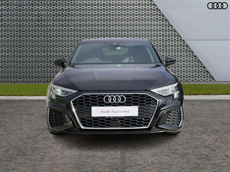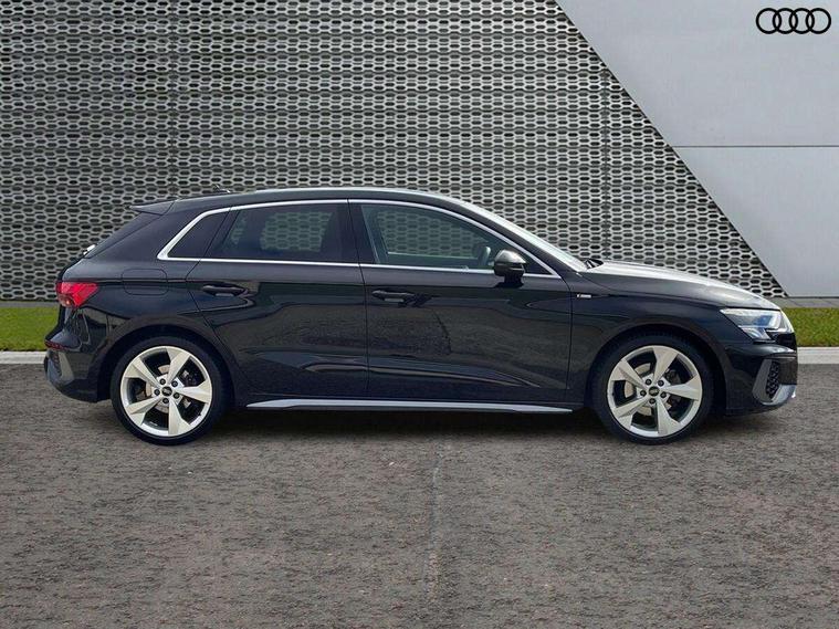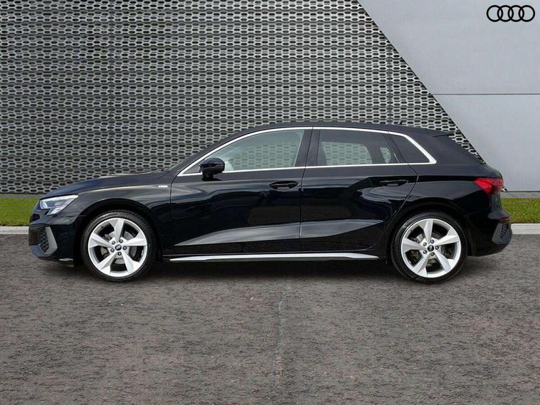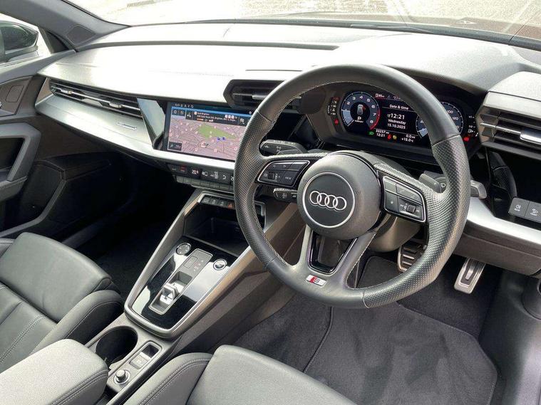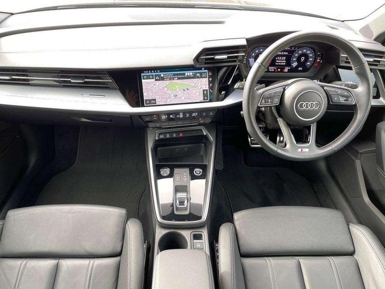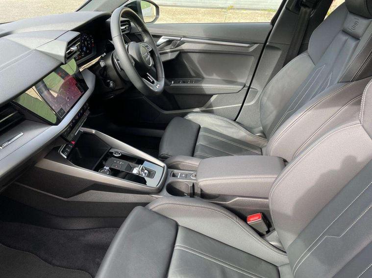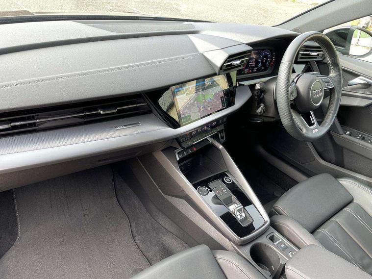 Audi drive select (Auto, Comfort, Dynamic, Efficiency and Individual), Audi smartphone interface, Audi Virtual Cockpit - 10.25" digital and colour instrument cluster, Automatic start/stop system with recuperation, Bluetooth interface, Camera based traffic sign recognition, Collision avoidance assistant, e-Call (emergency call), Electromechanical power speed sensitive steering, Lane departure warning system, MMI Navigation Plus with high resolution 10.1" colour touch screen display, Service indicator, Trip computer, Voice control system with natural language interaction, Sports suspension, 2xUSB-C connection with data and charging functions, 6 passive loudspeakers, DAB Digital radio, 3rd brake light, Acoustic glass windscreen, Aluminium window trim, Auto dimming frameless rear view mirror, Body colour exterior mirrors, Electrically adjustable/heated/folding/dimming door mirrors with kerb view includes integrated LED indications + kerb view function for passenger side, Front electric windows, Illuminated door sills with aluminium inserts at the front with S logo, LED daytime running lights, LED headlights with LED rear lights and dynamic rear indicators, Light and rain sensors, Privacy glass - dark tinted rear window, rear door and side windows, Rear electric windows, Rear side air outlets in grained matt black, Rear side wing doors, Rear wiper, S line bumpers, S roof spoiler, 12V socket and storage compartment in front centre console, 3 seat bench in 2nd row, 3 spoke leather multifunction steering wheel with paddle shift, 4 way electrically adjustable lumbar support for driver and front passenger, 60/40 split folding rear seat bench, Black cloth headlining, Dual zone electronic climate control, Front and rear centre armrest in artificial leather, Front and rear headrests, Front/rear floor mats, Height and reach adjustable steering wheel, Interior lighting - glove compartment light and right hand side, Luggage compartment floor covering, Manual boot compartment lid, Manually adjustable front seats, Seat side bolsters, Single front passenger seat, Stainless steel pedals and front footrest in black, Twin leather upholstery with front sports seats S embossed logo, Aluminium interior elements pack - A3 Sportback, LED interior lighting pack - A3 Sportback, S line styling pack - A3 Sportback, 3x3 point rear seat belts, Driver and front passenger airbag with passenger airbag deactivation, Electronic Stabilisation Control (ESC) including ABS, ASR and EDL, First aid kit with warning triangle and 2 safety vests, Front side airbags with head airbags and interaction airbag, Pre-sense front with pedestrian and cyclist detection, Seatbelt monitoring, Tyre pressure loss indicator, Anti theft alarm, Anti-theft wheel bolts, Electronically operated child locks, Immobiliser, Remote control central locking, Dark spectrum aluminium inlays, accent surfaces in the dashboard and centre console in platinum grey silk effect paint finish,