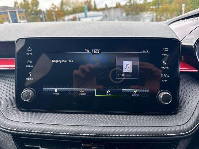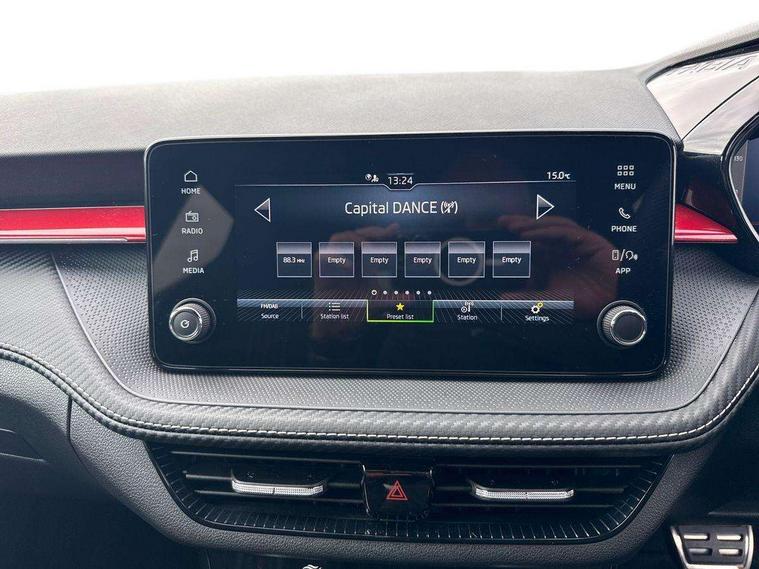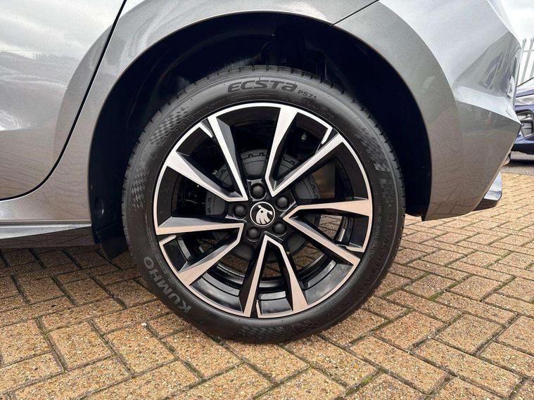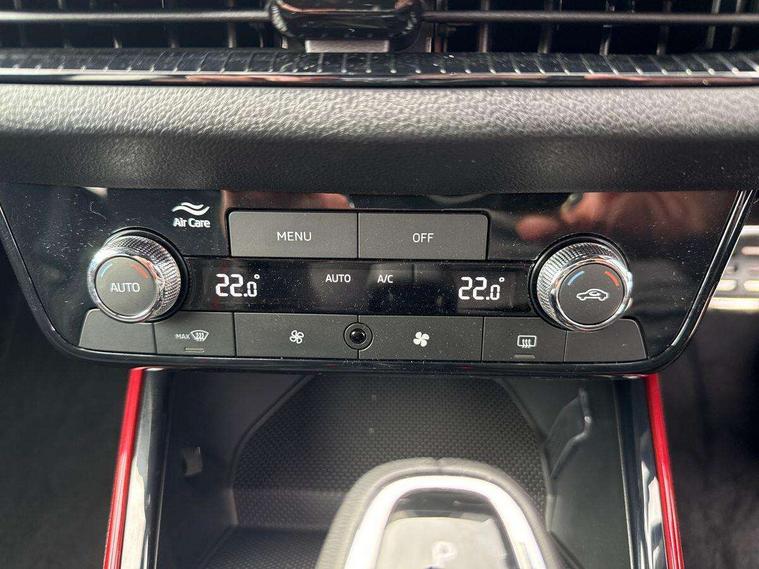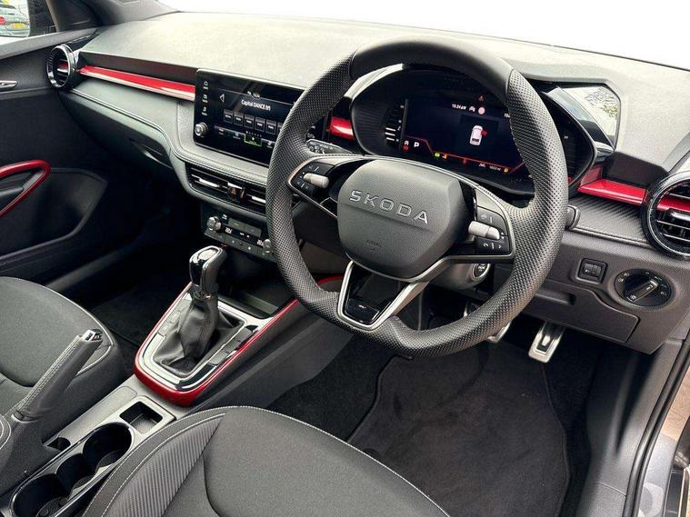 Advanced driver attention and drowsiness monitor, Bluetooth connection, Electromechanical power steering, Exterior temperature gauge, Service interval indicator, Traffic sign recognition, Virtual cockpit with 10.25" colour display, Wireless SmartLink for Apple CarPlay and Android Auto, 6 Speakers (4 in front and 2 in rear), Auxiliary socket for external MP3 player, DAB digital radio reception, Auto dimming rear view mirror, Black radiator grille, Body coloured bumpers, Door mirror integrated indicators, Front and rear electric windows, Front window wiper intermittent control, Headlight range control - Automatic, Ice scraper in fuel cap, LED daytime running lights with coming and leaving home feature, LED rear lights, Monte Carlo badging, Privacy glass, Rear LED fog light, Rear side wing doors, Rear window wiper with washing nozzles, Roof mounted spoiler, SKODA tailgate lettering in black, Sports bumpers, Third brake light, 2 reading lights in front and 2 reading lights in rear, 3 rear headrests, Aluminium pedals, Backrest split and folding, Black headlining, Central console with removable cup holder and storage box, Chrome handbrake release button, Door sills with fabia badging, Dual zone air conditioning with climatronic electronic control, Fabric/artificial leather upholstery, Front centre armrest, Front sports seats, Gearshift knob/handle in leather, Hand brake lever handle in leather, Height adjustable front headrests, Height adjustable front seats, Height adjustable steering wheel, ISOFIX and TopTether anchorage points to the outer rear seats, ISOFIX and TopTether on the front passenger seat, Luggage compartment lighting, Manually adjustable lumbar support in front seats, Metallic painted red central console cover, Metallic red interior door handles, Pollen filter, Rear seat bench unsplit, Single front passenger seat, Sun visors with mirror and airbag label on passenger side, Textile floor mats, Ticket holder, Umbrella in drivers door, 3-point height adjustable front seats belts with pretensioner and force limiter, Automatic warning lights in case of crash, Driver and passengers airbag with switch off function, e-Call+, ESC including ABS, MSR, ASR, EDS, HBA and XDS, Front and rear seat belt warning, FRONT ASSIST (AEB City and AEB Inter Urban), Front side airbags, Head airbags, Hill hold control, One tone horn, Pedestrian protection, Three rear 3-points safety seat belts with pretensioner and force limiter including stop function for outer rear seat belts, Tyre pressure monitoring system, Anti-theft alarm system including immobiliser, interior monitoring, backup horn, and towing protection, Central locking with radio remote control, interior controls, SAFE function and 2 foldable keys, Carbon effect door and side trim panels, Carbon effect lower decorative trim with white stitching, Monte carlo air vents, Red metallic upper decorative trim, Anti-theft wheel bolts protection, Super-low rolling resistance tyres,