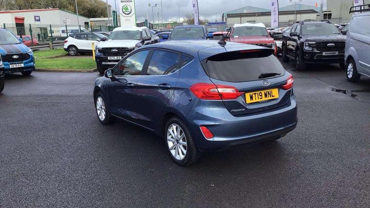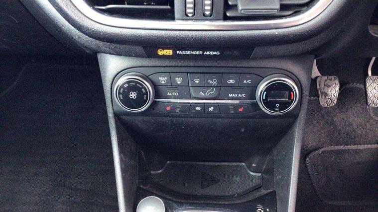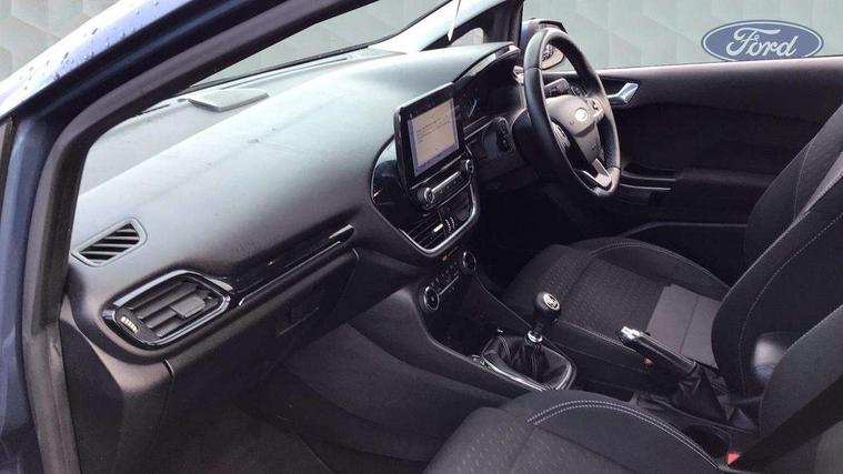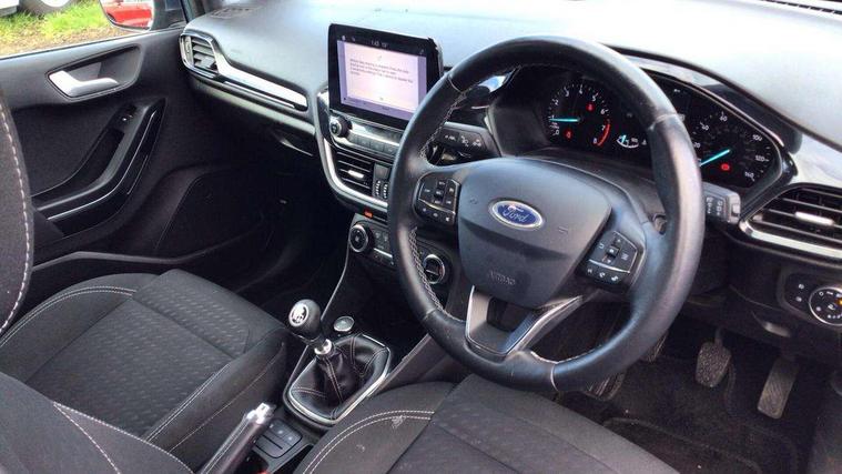 Bluetooth system, Electric power steering, Ford easy fuel, Trip computer, 2 USB ports, Auxiliary input socket, DAB Digital radio, Steering wheel mounted controls, Auto dimming rear view mirror, Automatic headlights, Body colour bumpers, Body colour door handles, Body colour electric adjustable heated door mirrors with integral indicators, Body colour rear spoiler, Chrome beltline trim, Chrome lower window surround, Cornering front fog lights, Electric front windows/one touch facility, LED Night signature to rear lights, LED rear lights, Power foldable door mirrors with puddle lights, Quickclear heated windscreen, Rain sensing wipers and auto dimming rear view mirror, Rear privacy glass, Rear wiper, Tinted glass, Upper front grille chrome surround, 12V Accessory socket in centre console, 3 spoke leather trimmed steering wheel with audio control, 60/40 split folding rear seat, Adjustable head restraints, Ambient lighting, Boot carpet, Centre console with armrest and illuminated cupholders, Chrome inner door handles, Cloth upholstery, EATC - Electronic Auto Temperature control, Footwell illumination, Front and rear velour floor mats, Front map reading lights, Front seat and rear pockets, Height adjustable driver's seat, Illuminated glovebox, Leather gear knob, Leather trimmed handbrake handle, Load area light, Luxury woven headliner, Overhead console with sunglasses holder, Pollen filter, Rake/reach adjustable steering wheel, Rear centre head restraint, Driver assistance pack - Fiesta/Titanium/Titanium X/Active B+O/Active X/ST-Line X, NCAP Pack - Fiesta, 3 point seatbelts on all rear seats, ABS+EBA, Curtain airbags, Driver and passenger airbags, Drivers knee airbag, Electronic stability control with hill start assist, Front passenger airbag deactivation, Front side airbags, Seatbelt warning, Tyre pressure monitoring system, MyKey system, Remote central locking & engine immobiliser, Thatcham Cat.1 alarm,