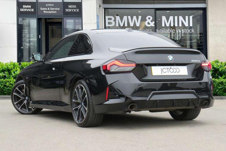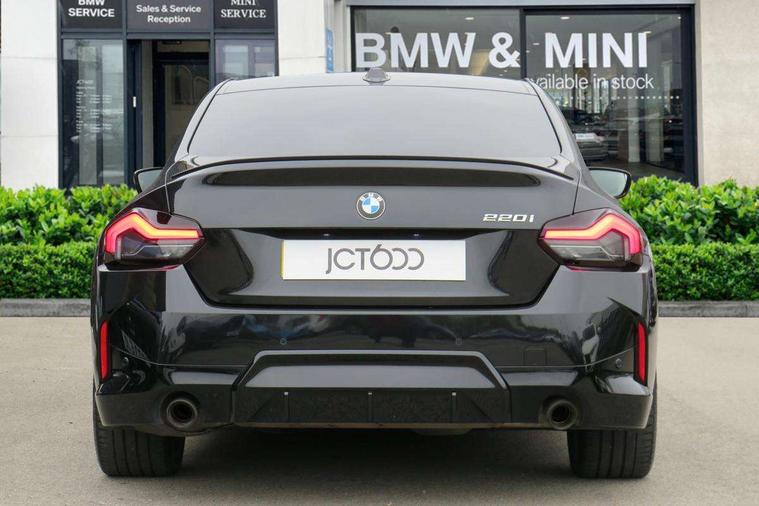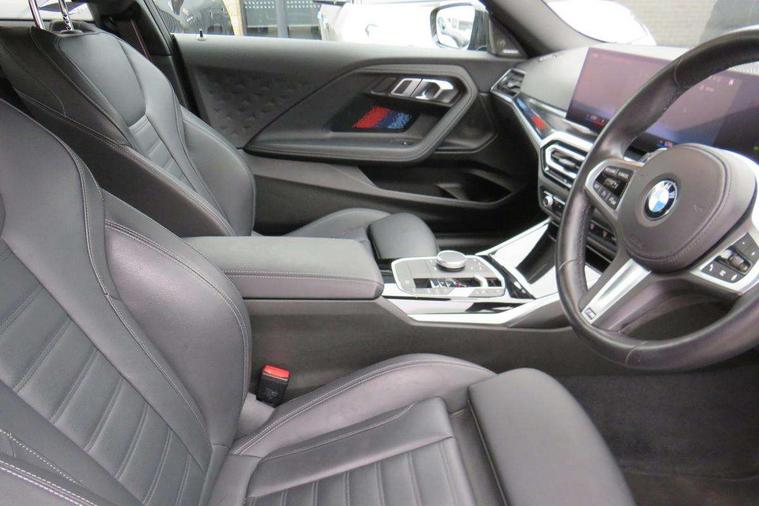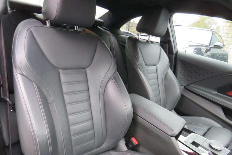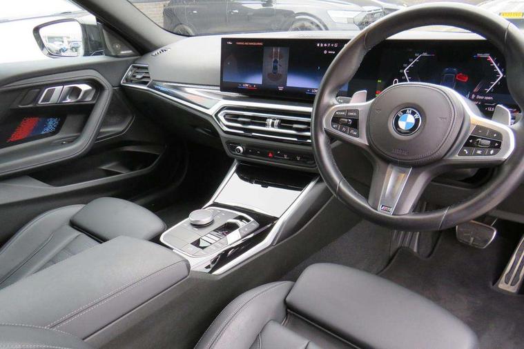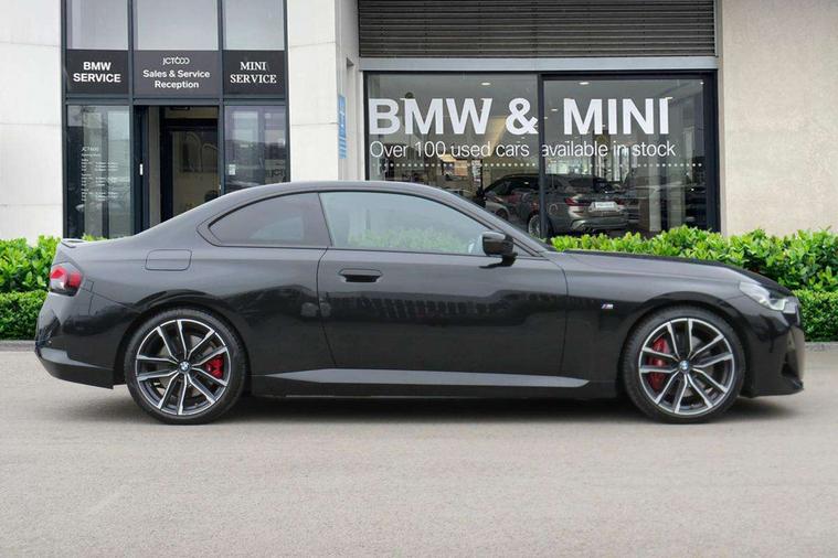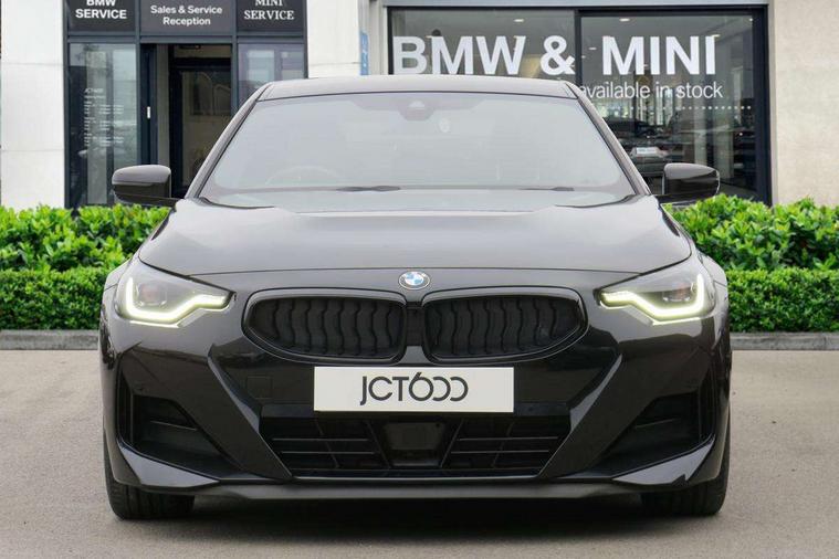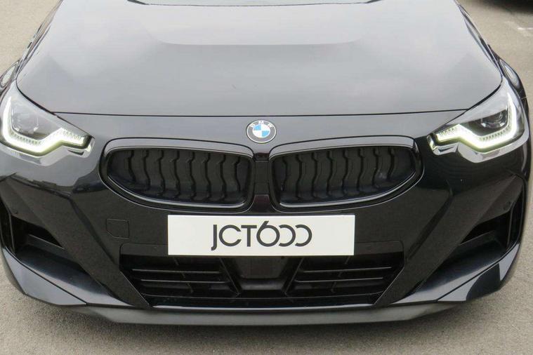 Attentiveness assist, Auto start-stop, Bluetooth, BMW ConnectedDrive online services, BMW Teleservices, Check Control warning system for monitoring of lights and door/luggage compartment open warning, Direct selection buttons, Drive off assistant, Eco pro mode, Electric power steering, Front and rear parking sensors, Front/rear Parking distance control, iDrive controller with turn and press function, Integrated owners handbook, Intelligent functions, Live cockpit plus with nav function 12.3" instrument cluster and 14.9" centre display, Oil sensor for level and grade, Optimum shift indicator, Personal Profile, Touch operation on control display, Variable sport steering, Widescreen multi-media display, Aluminium lightweight construction, Balancer shaft, BMW TwinPower Turbo four-cylinder petrol engine, Double VANOS, Drive performance control with ECO PRO comfort + sport mode, Electronic differential lock, High precision injection, M sport suspension, Petrol Particulate Filter, Sport automatic steptronic transmission with gearshift paddles, manual gearshift time display, launch control, coasting idle ECO PRO/COMFORT modes, Twin scroll turbocharger with Valvetronic, DAB tuner, Acoustic windscreen wipers for reduced driving noise, Adaptive LED Headlights, Automatic windscreen wipers and automatic headlight, Automatically dimming rear view mirror, Body colour door handles flush with door surface, Body colour door mirrors, Body colour front and rear bumpers, Daytime running lights, Electric windows - front and rear, with open/close fingertip control and trap release, Exhaust tailpipes x2 - 90mm in left and right, Fading support, Front and rear bumper system with replaceable deformation elements, Front door sill finishers in black plastic with BMW designation, Front windscreen wipers with integrated washer jets, Green tinted heat protection glazing, High beam assistant, High gloss shadowline exterior trim in mirror triangle cover, mirror cover panel, mirror bezel and window border, High level third brake light, Indicators integrated int mirror housing, LED registration plate light, LED technology rear tail lights, brake lights and turn indicators, Lightweight engineering, Model designation on right side of tailgate, One piece kidney grille with hight gloss chrome surround, Rear boot, Rear fog lights, Reversing light in rear light cluster, Shark fin antenna, Single part LED rear lights with smoked glass components, Trailer stabilisation logic, Visible VIN plate, 12V power socket in front centre console with blanking plug, 2 cupholders in front centre console, 3 zone automatic air conditioning, Ambient lighting, Compartment in front of cupholder, Conditioned based service, Driver seat backrest width adjustment, Front and rear side armrests integrated into door trim, Front armrest, Front door pockets, Front head restraints, Front sport seats, Heated front seats, Illuminated glove compartment with separate small compartment, M headliner Anthracite, M sport leather steering wheel, Manually adjustment steering wheel column, Rear seat backrest with manual 40:20:40 split folding, Rear seat centre foldable armrest with integrated cup holder, Single front passenger seat, Storage compartment between rear seats, Storage tray and compartment with cover in centre console, Sun visors with vanity mirrors and insert tab, Through loading system with 40/20/40 split folding 2 rear seat in 2nd row, Two folding rear seat headrests, Velour floor mats, Additional storage compartment pack without USB - 2 Series Coupe, Connected pack professional - 2 Series Coupe, Interior and exterior mirror pack - 2 Series Coupe, M Sport exterior styling aerodynamics pack - 2 Series Coupe, 2 tone horn, Anti lock braking system (ABS) with cornering brake control, Automatic Stability Control (ASC), BMW emergency call, Brake drying, Child seat ISOFIX attachment for the two outer rear seats, Crash sensor activating of airbags, Unlocking doors, hazard warning lights, interior light, safety battery terminal, Deactivation of fuel pump in the event of a crash, Driver and front passenger airbags, Driver and front passenger side airbags, integrated in the door side seat backrest bolsters for all seat variants, Dynamic brake control, Dynamic stability control + (DSC+), Dynamic Traction Control - DTC, Electrically operated hand brake including automatic hold function and automatic release when driving off, Front and rear disc brakes, Front passenger airbag deactivation, Head airbags for all 4 outer seats, Manual deactivation of front passenger airbag, Seat belt security check for driver and front passenger, Seatbelt warning, Side impact protection, Three point seat belts on 4 seats including front belt stopper, pyrotechnic belt tensioners and belt force limiters, Tyre pressure sensor, Warning triangle and first aid kit, Alarm system (Thatcham 1) with remote control and electronic engine immobiliser, Central locking switch for all doors, fuel filler cap and luggage compartment, Deadlocking function system to all doors, Drive away locking system on all doors and luggage compartment, Locking wheel bolts, Start/Stop button (illuminated) in centre console with keyless engine start and Auto Start-Stop deactivation button, Two remote control key with integrated key - one button for open and close doors/fuel flap/tailgate and separate button for unlock luggage compartment, BMW mobility tyre sealing system, Electrically powered 12V compressor, Reduced rolling resistance tyres,