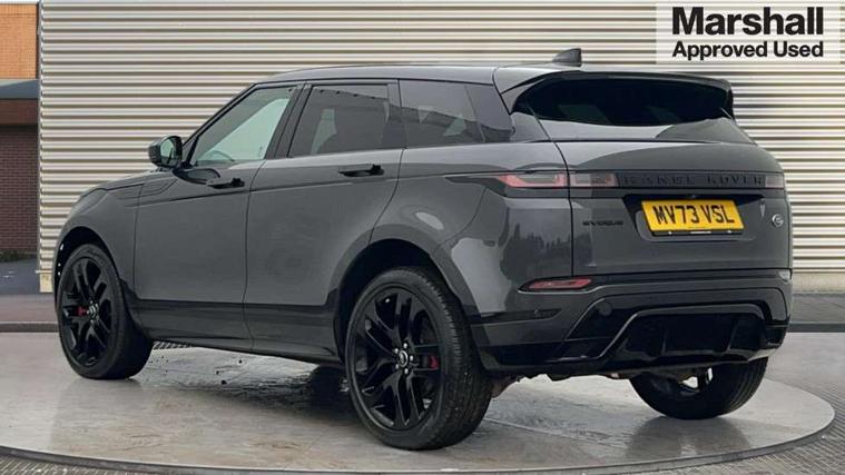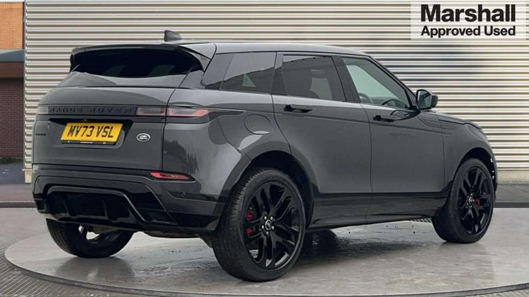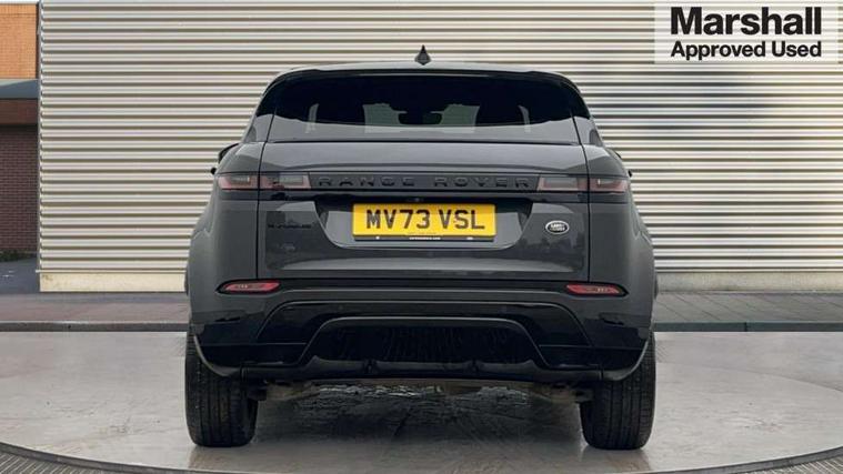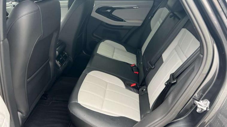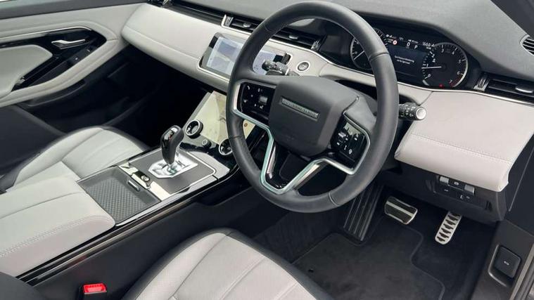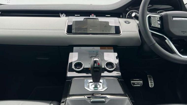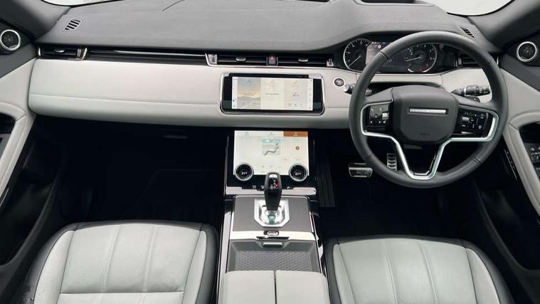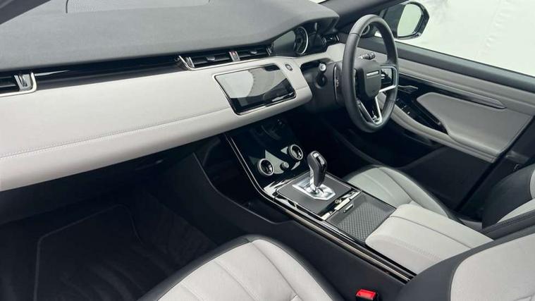 Adaptive cruise control, Android Auto, Apple car play, Blind spot assist, Bluetooth connectivity, Brake pad wear indicator warning light, Driver condition monitor, eCall emergency system, Electronic power assisted steering (EPAS), Front and rear parking aid, InControl remote, Land Rover InControl apps, Lane keep assist, Pivi pro connected includes upgraded infotainment, connected navigation pro, Nuance speech licence, Push button starter, Rear collision monitor, Rear traffic monitor, Traffic sign recognition with adaptive speed limiter, Voice control system, All terrain progress control, Efficient Driveline, Large fuel tank, Passive suspension, Terrain Response 2 Auto, Digital Audio Broadcast radio-DAB, Steering wheel mounted controls, Auto headlights, Automatic headlight levelling, Electric windows with one touch open/close and anti trap, Evoque and R-Dynamic badge, Flush deployable exterior door handles, Heated rear window with timer, Heated washer jets, Heated windscreen, Power fold, auto-dimming, heated door mirrors with approach lights and auto dimming driver side, Rain sensing windscreen wipers, Rear fog lights, Rear side wing doors, Rear wiper, Tailgate spoiler, Third brake light, 40:20:40 split folding rear seats with centre headrest and armrest, Ambient interior lighting, Bright metal pedals, Isofix system on outer rear seats, Overhead lighting console, Overhead stowage for sunglasses, Passive front head restraints, Rear air vents, Rear centre headrest, Rear head restraints, Satin chrome gearshift paddles, Single passenger seat, Sunvisors with illuminated vanity mirrors, Twin sliding front centre armrest, 3 rear 3 point seatbelts, Anti-lock braking system (ABS), Customer configurable autolock, DSC - Dynamic Stability Control, Electronic brake force distribution, Electronic parking brake, Electronic traction control, Emergency braking, Front and rear seatbelt reminder, Hill descent control, Hill launch assist, Low traction launch, Power operated child locks, Roll stability control, Six airbags - Driver and passenger airbags/driver knee airbag/front side airbag and curtain airbags, Torque vectoring brake, Tyre pressure monitoring system, Alarm, Immobiliser, Intrusion sensor, Keyless entry, Locking wheel nuts,