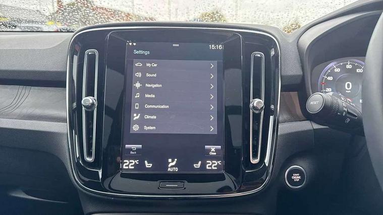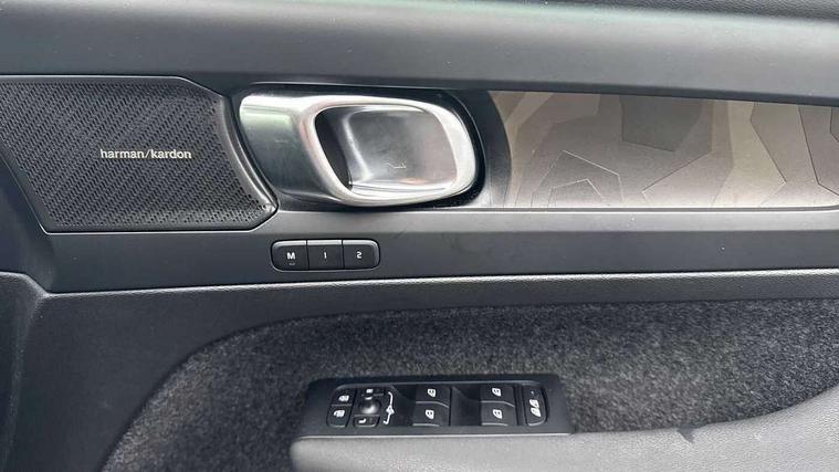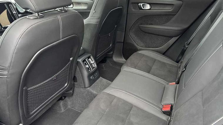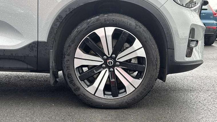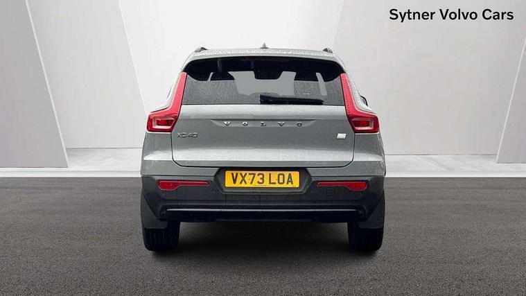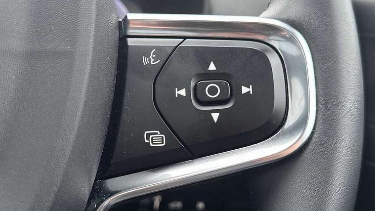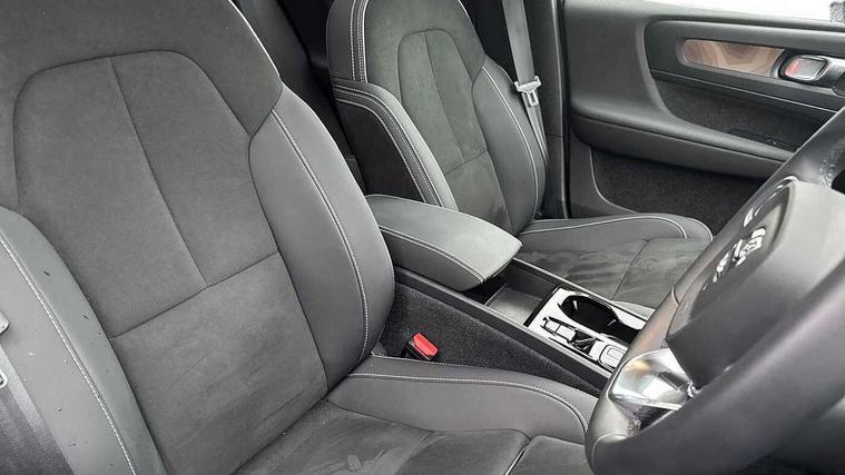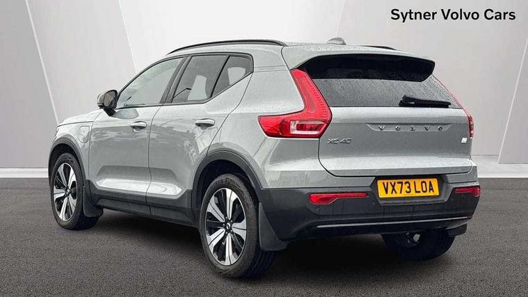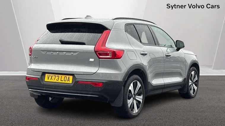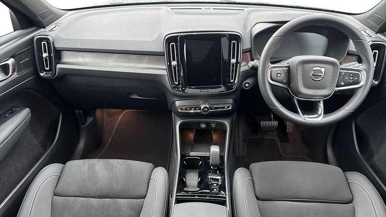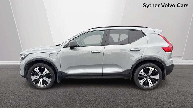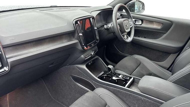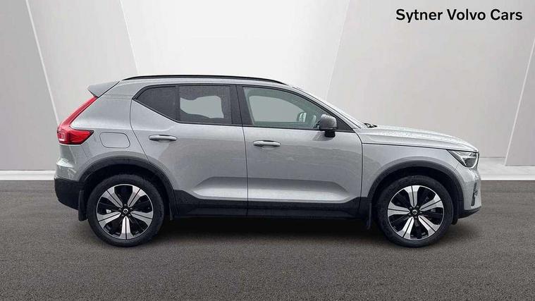 12.3" Active TFT crystal driver's instrument display, 360 degree surround view parking camera, 9" centre console portrait touch screen, Adjustable steering wheel force, Bluetooth hands free telephone kit, Drive mode selector, E-call, Front park assist, Hands free power tailgate, Lane keep assist with driver alert control, Oncoming Lane Mitigation, Rear park assist, Sensus navigation with European mapping and traffic information, Speed limiter, Speed sensitive steering, Voice activated control for key functions, Wireless Smartphone Integration includes Apple CarPlay and Android auto, Wireless/Inductive Mobile Phone Charging, 3.7 kW monophase on board charger, 7m 10amp charge cable with 3 pin plug and 7m 1 phase 16amp type 2/mode 3 charge cable, Dynamic chassis, Electric front axle drive, Recharging port located in nearside front wing, DAB Digital radio, Low speed exterior sound speaker, Premium Sound by Harman Kardon, Dolby Pro Logic II Surround Sound, Dirac Unsion, 12 speakers/600W and subwoofer, Steering wheel mounted remote controls, Active bending pixel LED headlights with adaptive shadow technology, Active high beam incorporating daytime running lights, Adaptive brake lights with high level LED brake lights, Auto dimming interior mirror, Automatic headlamp levelling, Dark tinted windows for rear door side windows and cargo compartment, Front and rear electric windows, Front recharge aluminium tread plates, Headlight cleaning system, High gloss black front and rear skid plate, High gloss black mesh front grille with high gloss black surround, High gloss black window trim, Home safe and approach lighting, Integrated roof rails in high gloss black, LED front fog lights, Power glass tilt and slide panoramic sunroof with sun curtain, Puddle lights, Rain sensor with automatic windscreen wiper activation, Rear side wing doors, Rear wiper, Roof antenna, Roof spoiler, Visible VIN plate, 12V socket in front tunnel console and cargo compartment, 2 zone electronic climate control with clear zone air quality system and pollen filter, 3 seat bench in 2nd row, 3 Spoke tailored steering wheel with chrome trim, 60/40 versatile split folding rear seat, A-pillar parking ticket holder, C-pillar Recharge logo, Centre console cupholders and storage, Floor mats, Front door pocket, front cupholder, ambient front door, rear reading, rear courtesy, instrument panel and tailgate lighting, Front footwell illumination, Front headrests, Front reading light and theatre lighting, Front seat cushion extensions, Front tunnel pocket, Glovebox bag hook, Heated front seats, Height adjustable passenger seat, Height/reach adjustable steering column, High gloss centre tunnel deco, Illuminated glovebox, Illuminated luggage compartment, Illuminated vanity mirrors, Isofix attachments on rear seats, Load protection net, Multi directional lumbar support, Power driver seat with memory + exterior mirrors memory, Power folding rear headrests, Power passenger seat, Rear armrest / integral cup holders / storage tray, Single front passenger seat, Underfloor cargo storage, Climate pack without heated front seats - XC40, Driver assist pack - XC40, 3x3 point rear seatbelts, City safety includes pedestrian, cyclist and large animal detection and front collision warning with full auto brake, Drivers knee airbag, Dual stage driver/passenger airbags, Electronic parking brake with auto hold, First aid kit, Front and outer rear seatbelt reminder and pretensioners, Front seats SIPS airbags, Hill descent control, Hill start assist, Inflatable curtain, Passenger airbag cut-off device, Power child locks on rear doors, Road sign information display, Run off Road Mitigation, Run off Road Protection, SIPS (Side Impact Protection System), Slippery road and hazard light alert, Stability and Traction Control with Spin control, Engine Drag Control and Corner Traction Control, Tyre pressure monitoring system, Vehicle deceleration control with Anti-lock Brake System, Electronic Brake Distribution and Emergency Brake Assist, Warning triangle, WHIPS whiplash protection system - front, Anti-theft alarm including immobiliser/volume sensor + level sensor, Care key with user defined top speed, Key integrated remote control central locking + fuel flap with deadlocking system and auto open/close power windows, Keyless drive includes keyless entry and keyless start, Locking wheel nuts, Private locking for tailgate,