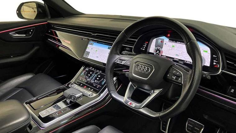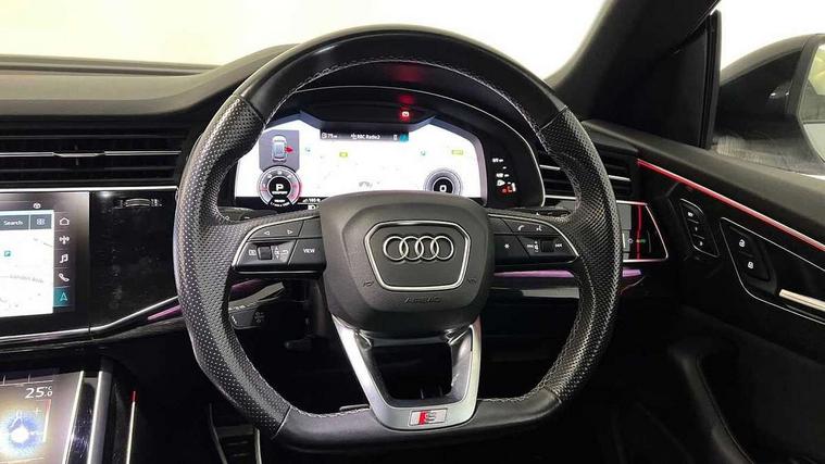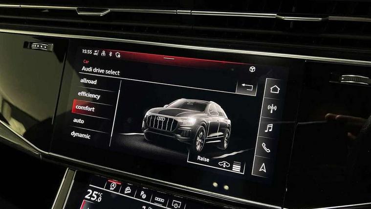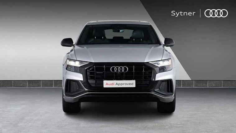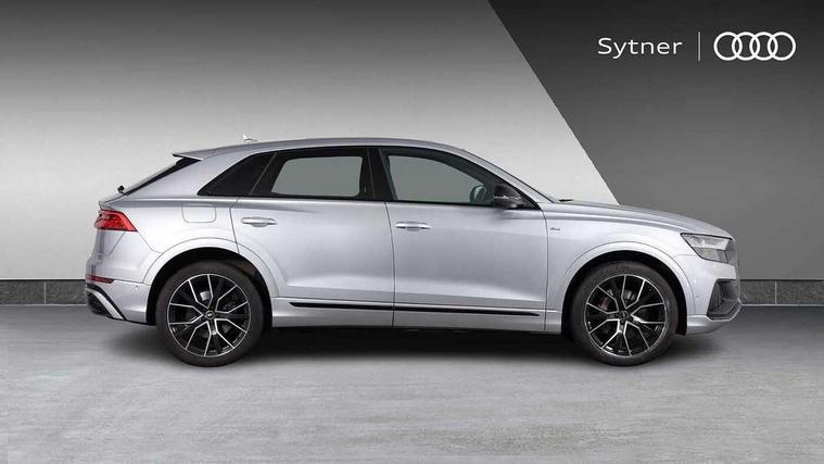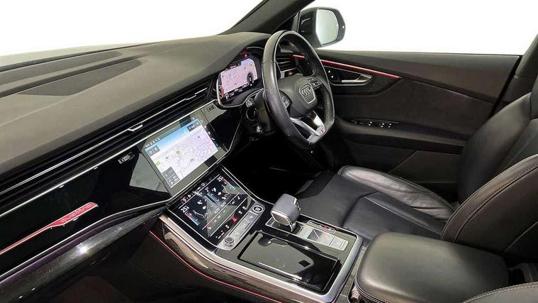 10.1" and 8.6" Dual colour touchscreens, Audi connect safety and service (e-call), Audi connect with Amazon Alexa Integration, Audi drive select, Audi parking system plus includes 360 degree display with front and rear sensors, Audi phone box with wireless charging, Audi smartphone interface includes wireless Apple carplay/Android Auto, Audi virtual cockpit - 12.3" high resolution LCD display with fully customisable instrument cluster, Automatic start/stop system, Electro-mechanical PAS, Low washer fluid indicator, MMI - Multi Media Interface control system, MMI navigation plus with MMI touch, Natural voice recognition, On board computer, Operating buttons in black, glass look with haptic feedback, Power operated tailgate, Rear view camera, Service interval indicator, 48V Mild hybrid technology, Adaptive sport air suspension, Diesel particulate filter, Quattro all wheel drive with self locking centre differential, Audi music interface with 2 USB ports with charge and data functions, Audi sound system with 6 channel amplifier, 180 watt amplifying capacity and 10 loudspeakers including subwoofer, Aux-in socket, DAB Digital radio, Acoustic windscreen, Audi HD Matrix LED headlights with dynamic front and rear indicators, Auto dimming frameless rear view mirror, Coming/leaving home lighting function, Electric front+rear windows, Electrically adjustable/heated/folding/dimming door mirrors with kerb view includes integrated LED indications + kerb view function for passenger side, Headlight washers, Heat insulating glass in windshield, LED signature daytime running lights, Platinum grey front spoiler lip and diffuser insert with honeycomb grille in black, Privacy glass - dark tinted rear and rear side windows from B-pillar backwards, Rain and light sensors, Rear wiper, 4 zone deluxe automatic climate control, 4-way lumbar support for front seats, 40:20:40 split folding rear bench seat, Black cloth headlining, Comfort front centre armrest, Driver seat memory function, Electrically adjustable front seats, Front head restraints, Front/rear floor mats, Heated front seats, ISOFIX child seat mounting for front passenger seat and 2 outer rear seats with top tether child seat mounting for all 3 rear seats, LED interior ambient lighting, Luggage compartment sill protection in stainless steel, Rear centre armrest with 2 cupholders, Rear headrests, Rear seat bench plus, Stainless steel pedals, Sunvisors with illuminated vanity mirrors, Tool kit, Titanium Black Styling Pack - Q8, 3 point seatbelts on all seats, Audi pre sense front, Driver and front passenger, front side and curtain airbags, Electromechanical parking brake, Electronic Stability Control (ESC) including ABS, ASR and EDL, Front passenger airbag deactivation, Hill descent control, Hill hold assist, Predictive pedestrian protection, Seatbelt monitoring, Traction control, Tyre pressure loss indicator, Warning triangle and first aid kit, Anti theft alarm with tow away protection, Anti-theft wheel bolts and wheel loosening detection, Immobiliser, Keyless go with remote central locking, Polished oak trim with grey finish inlay, Tyre repair kit,