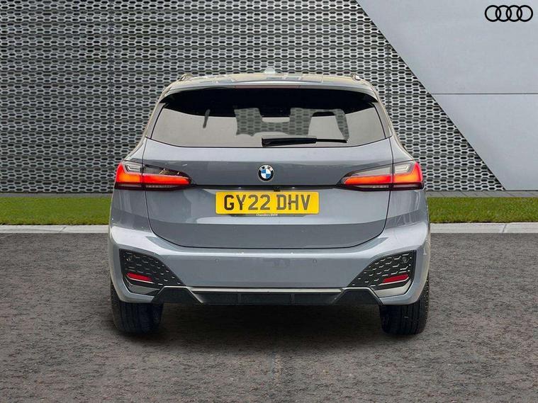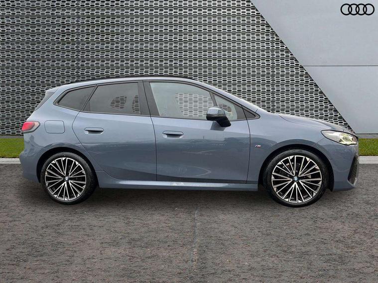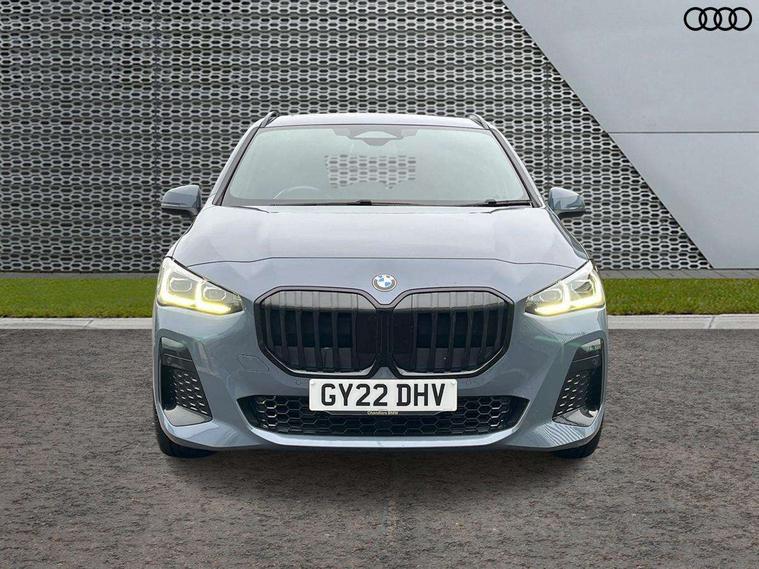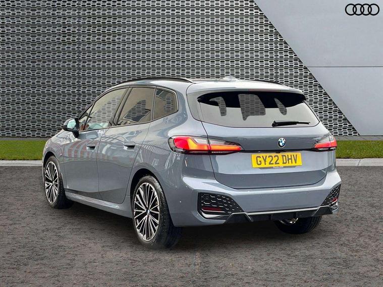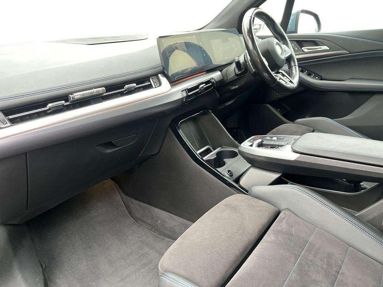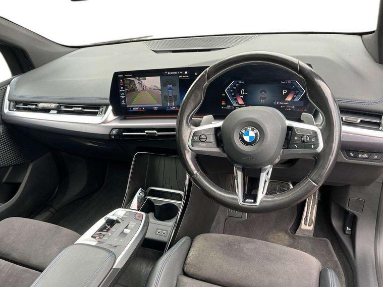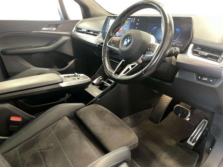 Active Guard incl speed limiting and lane departure functions with auto steering, and front collision warning with brake intervention, Automatic powered tailgate, Automatic start/stop function, BMW Online services, BMW Teleservices, Brake pad wear indicator in front and rear, Condition based service, Drive off assistant, Flat air vents on instrument panel in high gloss black, adjustable slats with elements in pearl chrome, iDrive controller, Language version English, On board computer - average speed+fuel consumption, service interval, clock/date, odometer/trip meter, outside temperature display and ice warning, Parking assistant with active park distance control, reversing assistant, lateral parking aid and rear view camera, Servotronic variable electric power steering (EPS), Smartphone integration, Widescreen display, Drive performance control with ECO PRO comfort + sport mode, Gear selector switch with toggle operation, M Adaptive suspension, Petrol Particulate Filter, Steptronic transmission with double clutch and gear shift paddles, 2x USB Type C ports in front centre console for charging and data transfer, 2x USB Type C ports in rear centre console for charging, DAB Digital radio, Welcome sound upon opening of the front driver or passenger door, Air inlet middle part on front apron in lines specific design with trim strip in satinised aluminium, Automatic headlights, BMW emblem, engine compartment lid and tailgate, Body colour roof mouldings, Body coloured door mirror caps, Contoured rear roof spoiler in vehicle colour with side aeroblades in black high-gloss, Driver side exterior mirror lighting with BMW logo projection, Dynamic brake lights, Electric adjustable heated door mirrors, Electric windows - front and rear, with open/close fingertip control, anti-trap facility and comfort closing, Folding door handles integrated flush with surface, Front and rear windscreen wipers with heated front washer nozzles, Front bumper cover with independent design in body colour with inserts in black high gloss, Front bumper design elements in satinised aluminium, Front door exit lights, Front door sill finishers aluminium inserts with M inscription, Front entry sills with aluminium inserts + BMW inscription, Front oramental grille with radiator grille bars in satinised aluminium, Heated rear window, Hidden exhaust pipe, High gloss shadow line, High gloss shadowline roof rails, Key with M identification, LED Daytime running lights and parking lights with turn indicators, LED number plate light, LED third brake light in rear spoiler, M identification on sides, Manual headlight range control, Model inscription on right tailgate, Rain sensor, Rear bumper cover with independent design in body colour with inserts in black high gloss, Rear bumper trim strip in satinised aluminium, Rear side wing doors, Shark fin antenna, Side sill covers with independent design in Body colour, Trailer stabilisation logic, Trims on front and rear bumper covers colour-coordinated with side window graphic, Visible VIN plate, Welcome lighting, Windscreen washer nozzle for rear view camera, 12V power socket in luggage compartment and front centre console, 12V socket in right side trim panel, 2 bag hooks in luggage compartment, 2 front reading lights, 2 open cup holders in front centre console, 3 seat bench in 2nd row, 40:20:40 split folding rear seat backrests, Ambient lighting front and rear, Automatic two zone climate control air conditioning, Bottle trays in all doors, Child seat ISOFIX attachment for two outer rear seats and front passenger seat with anchorage points, Driver and front passenger sports seats, Four grab handles integrated in roof lining, Front and rear door pockets, Front and rear footwell lighting, Front and rear side armrest integrated into door trim, Front centre console storage compartment, Front head restraints, Glovebox with light, Heated front seats, Height adjustable 3 rear head restraints, Interior door handle recess light on all doors, Luggage compartment lighting, M Anthracite headlining, M specific floor mats, M sport leather steering wheel, Map pockets, Mechanical rear seats with fore/aft adjustment, Multi-function controls for steering wheel, One piece parcel shelf opens together with tailgate and removable, Rear cloth hooks, Single front passenger seat, Sliding rear seat bench, Stainless steel pedals, Steering wheel column manual adjustment, Storage compartment lighting in centre console and storage tray in centre stack, Storage compartment net in left side trim panel, Storage compartment with folding cover under centre console armrest cushion, Storage tray in right side trim panel, Sunvisors with illuminated vanity mirrors, Three spoke sport leather steering wheel, Connected pack professional - 2 Series Active Tourer, Technology pack - 2 Series Active Tourer - MY22, 3 point seatbelts on all seats, front pyrotechnic belt tensioners, stopper and belt force limiters, rear coded belt buckles, Airbag - Front driver and passenger, front and rear head, front side, curtain head protection, manual deactivation of front passenger airbag possible, Anti lock braking system (ABS) with brake assist, Automatic hold function, BMW emergency call, Brake drying, Braking readiness, Child proof locking system in rear door, Cornering brake control, Crash Sensor - activates hazard/interior lighting + unlocks doors, DSC - Dynamic Stability Control, Dynamic brake control, Dynamic Traction Control - DTC, Electromechanical parking brake, Energy recovery system, Front disc brakes, Integrated braking system, PC iBrake PostCrash approach control warning with light braking function, Rear disc brakes, Tyre pressure monitoring system, Warning triangle and first aid kit, Anti theft alarm system, Closing system with central locking, Engine immobiliser, Locking wheel bolts, Front centre console trim in high gloss black with my mode expressive, BMW mobility tyre sealing system, Reduced rolling resistance tyres,