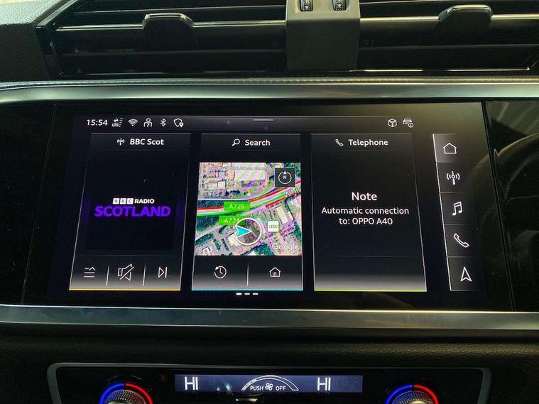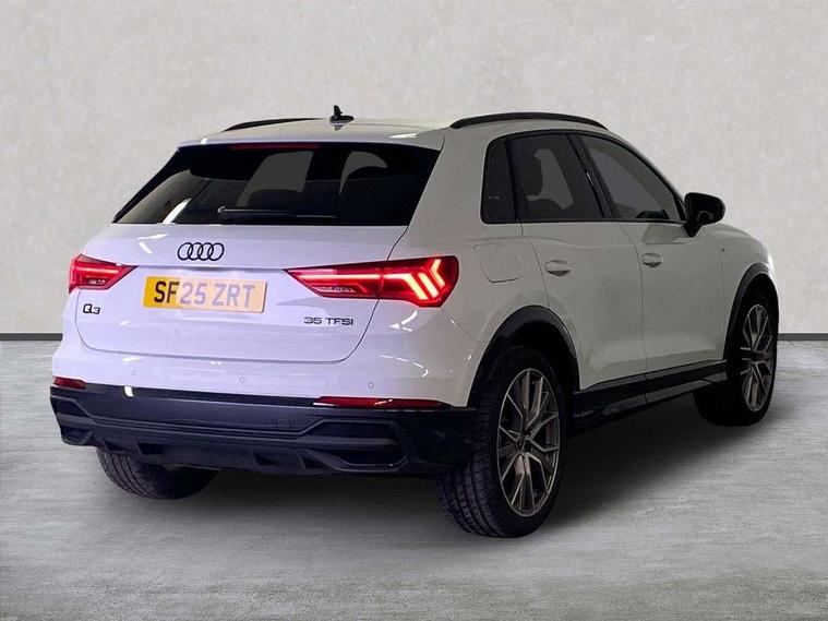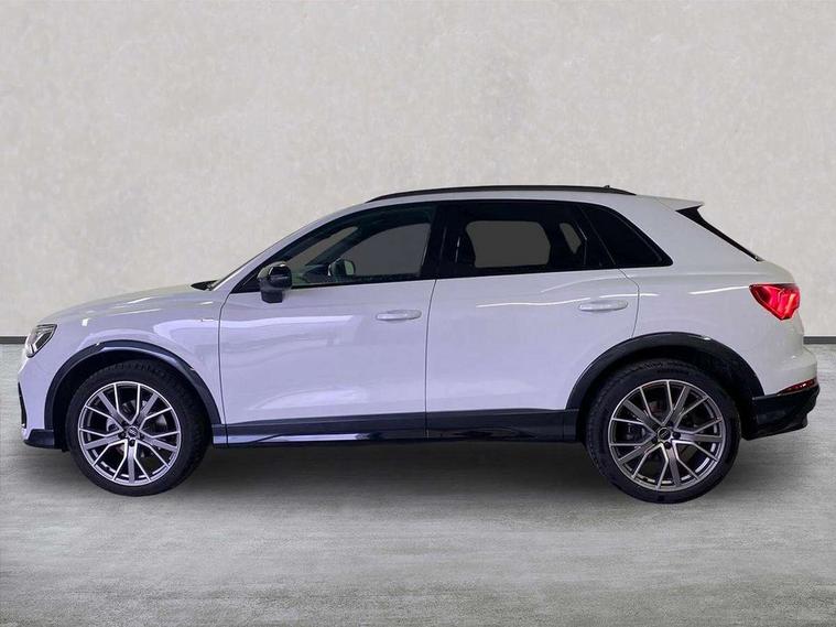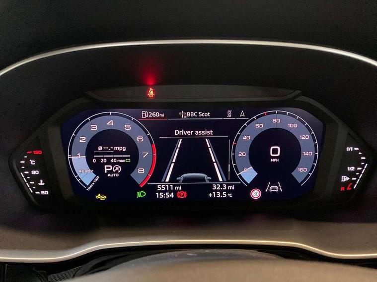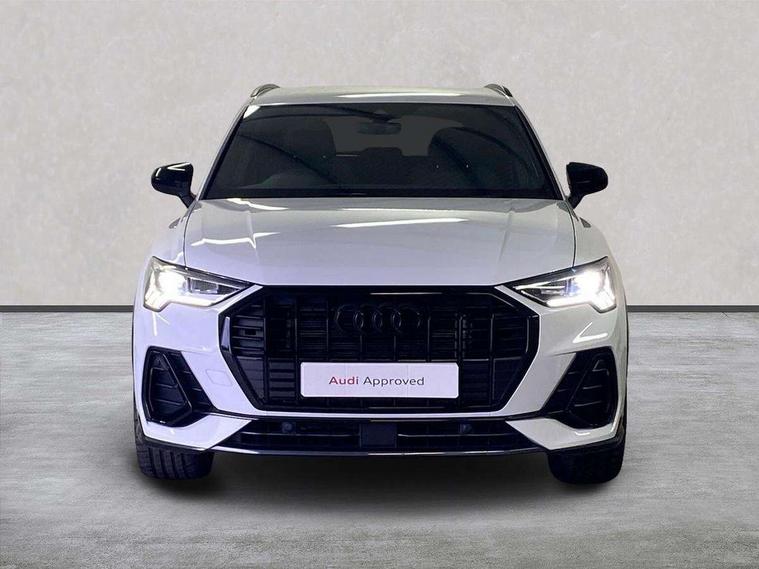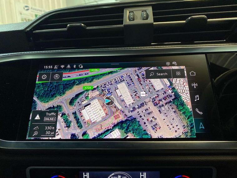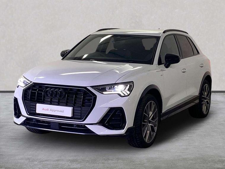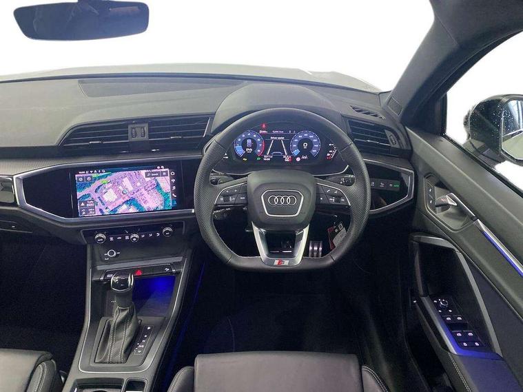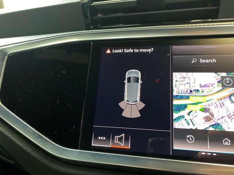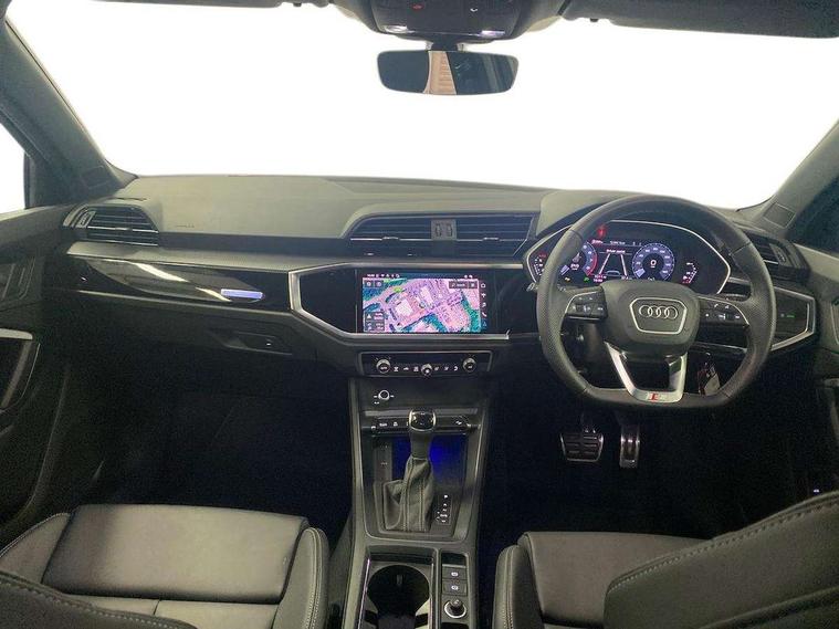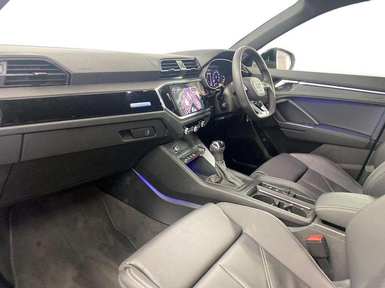 Amazon alexa Integration, Audi connect safety and service, Audi drive select, Audi lane departure warning, Audi Virtual Cockpit - 10.25" display, Bluetooth interface, Camera based traffic sign recognition, Distraction and Fatigue warning, Legal emergency call, MMI Navigation Plus with high resolution 10.1 inch touchscreen colour display, Power operated tailgate, Progressive steering, Service interval indicator, Smartphone interface includes wireless Apple carplay/Android Auto, Start stop system with recuperation, Voice control system with natural language interaction, Sports suspension, 2 USB-C ports with charge and data functions, 6 passive loudspeakers, DAB digital radio module, Acoustic windscreen, Audi Beam uses LEDs to project the Audi logo onto the ground as you exit your Q3, Auto dimming door mirrors, Auto dimming frameless rear view mirror, Black roof rails, Electrically folding, adjustable and heated door mirrors with integrated LED side indicators and kerb view function for passenger side, Front and rear electric windows, Front fog lights, Grille vertical bars in aluminium silver/Matt, High gloss black finish B and C pillars, LED Dynamic rear indicators, LED headlights with LED daytime running lights, LED rear lights, LED third brake light, Privacy glass dark tinted rear and rear-side windows (from B-pillar backwards), Rain and light sensors, Rear diffuser grille in grained matt black, Rear diffuser strip in matt anthracite black, Rear side wing doors, Rear wiper, S line bumpers in contrasting Manhattan grey, Variable front intermittent wipers, 12V socket in rear centre console, 3 seat bench in 2nd row, 40:20:40 folding with manual adjustment for 60:40 forwards/backwards position and backrest angle, Adjustable rear seat bench/backrest with centre armrest and cupholder, Black cloth headlining, Dual zone electronic climate control, Electric lumbar support, Front and rear black floor mats with contrast stitching in rock grey, Front and rear headrests, Front centre armrest, Height and reach adjustable steering wheel, Illuminated door sill trims with S logo, ISOFIX child seat mounting for front passenger with airbag deactivation and outer rear seat including top tether attachment point for outer rear seats, Manual front seats with height adjustment, Perforated leather gearknob, Single front passenger seat, Stainless steel luggage compartment sill finisher, Stainless steel pedals, Twin leather upholstery with front sport seats + S embossing, Black styling pack - Q3, Non smoking pack - Q3, 3x3 point rear seatbelts, 6 airbags - Driver, front passenger, curtain and side windows, Audi pre-sense front with pedestrain and cyclist recognition, Electrically operated child locks on rear doors, Electromechanical parking brake, Electronic stabilisation control including ABS, ASR and EDL, Front seatbelt reminder, Hill descent control, Hill hold assist, Pre sense basic, Seatbelt monitoring, Tyre pressure warning, Warning triangle and first aid kit, Anti theft wheel bolts, Immobiliser, Remote central locking, Thatcham approved category 1 anti theft alarm, Aluminium look interior elements, Detail dashboard around MMI touch colour display in glass look, black with surround in aluminium look, Leatherette door armrest, Piano black inlay,