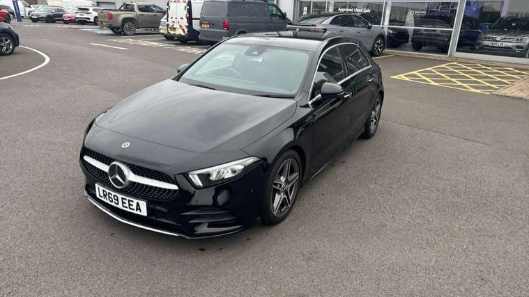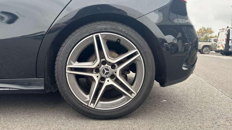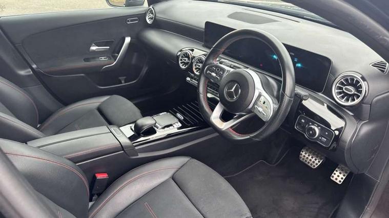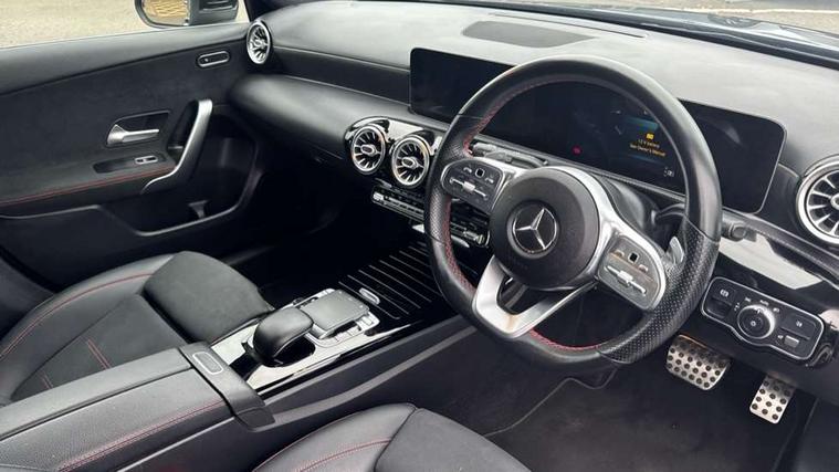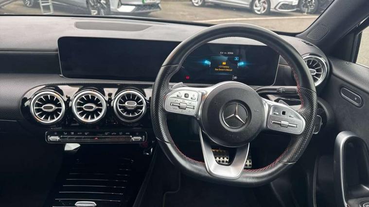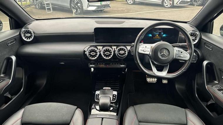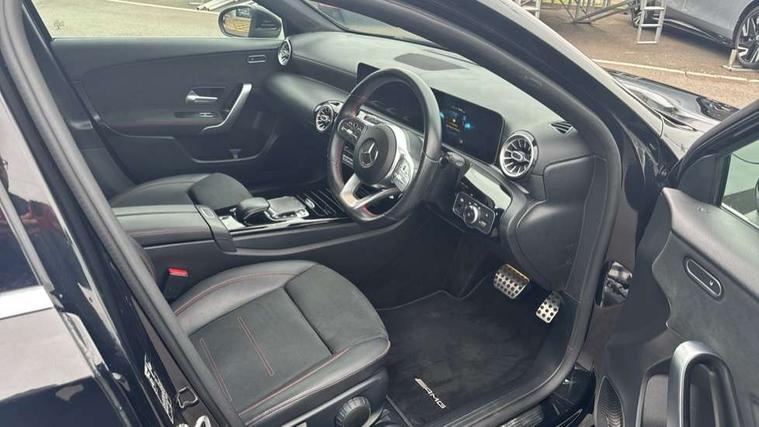 10.25" Digital instrument cluster display screen, 180 degree rear view camera with parking guidelines, Active lane keep assist, Active park assist with parktronic system including front and rear parking sensors, Attention assist, Brake pad wear indicator warning light, Direct steering, DYNAMIC SELECT with a choice of driving modes (ECO, Comfort, Sport and Individual), ECO start/stop function, Fluid level warning indicator for fuel, oil, coolant and washer fluid, Hard-disk navigation, Hey Mercedes Voice activation, Lamp failure indicator, Mercedes me connect including emergency call system, accident recovery, breakdown management and maintenance, Outside temperature gauge, Radio aerial integrated into roof spoiler, Service indicator (ASSYST), Speed sensitive power steering, Trip computer, Lowered comfort suspension, DAB Digital radio, Dual bluetooth interface, 2 USB ports (type C), MBUX multimedia system with DAB digital radio and touchpad including satellite navigation, Mid-range sound system, 4 Electric Front and Rear windows, Active aerodynamics with AIRPANEL in the front apron, Adaptive brake lights, AMG front, rear apron and side skirts, Blue tinted glass, Body colour bumpers, Body colour door handles, Body colour side skirt, Body coloured door mirrors, Chrome beltline trim, Diamond radiator grille with chrome pins and silver louvre + chrome insert, Electric adjustable and heated door mirrors with integrated LED side indicators, Exhaust system - Twin trapezoidal tailpipes in polished stainless steel, Headlamp assist automatic headlamp activation, Heated glass rear windscreen + timer control, LED high performance headlamps with integrated LED daytime running lights, LED tail lamp, LED third brake light, Privacy glass, Rain sensor windscreen wipers, Rear fog lights, Rear wiper, 12V socket, 3 Spoke flat bottom leather multi function steering wheel with perforated leather in grip area, 40:20:40 split folding rear seats, Air vents surround and cruciform nozzle in silver chrome, AMG floor mats with red stitching, Artico man-made leather/Microfibre Dinamica upholstery with red contrast stitching, Auto Mercedes-Benz child seat recognition sensor, Black roof lining, Brushed stainless steel sports pedals with rubber studs, Controller on centre console with chrome surround, Cup holder and stowage compartment lighting, Freight packaging without tie-down hooks, Front centre armrest with storage compartment, Front door sills with Mercedes Benz lettering, Front footwell lights, Front reading lamps in left and right console downlighter, Front seat backs luggage nets, Front seat cushion length adjustment, Front signal exit lamp, Front vanity lights, Gearshift paddles on steering wheel, Handle recess/closing light, Heated front seats, Height/reach adjustable steering column, Illuminated door sills, Illuminated glove compartment stowage, Interior lighting - 64 colour Ambient lighting, ISOFIX Child seat top tethers and anchor fixings, Luggage compartment cover, Manual height adjustable front seats, Oddments tray lighting, Rear armrest, Rear head restraints, Rear Reading Lamps, Seat occupancy sensor for front passenger seat, Spectacles compartment for driver, Sports seats with integrated headrests, Storage compartment under load area floor, Stowage compartment in centre console with retractable cover, Sunvisors with illuminated vanity mirrors, Touchpad, Touchpad illumination, Twin front cupholders, Two zone thermotronic luxury automatic climate control, Light and sight pack - A Class, Mirror package - A Class, Seat comfort pack - A Class, 3 rear 3 point seatbelts, ABS with Brake Assist, Active bonnet, Adaptive brake assist with hold function and hill start assist, Black seatbelts, Childproof locks manually operated for rear doors and electrically operated for rear power windows, Crash responsive emergency lighting, Driver and passenger head and side airbags, Drivers knee airbag, Dual stage driver/passenger airbags, Electronic parking brake, ESP curve dynamic assist, ESP with ASR, Front and rear seatbelt reminder, Front brake callipers with Mercedes Benz lettering, Tyre pressure monitoring system, Warning triangle and first aid kit, Window airbags, Alarm system/interior protection/immobiliser, Keyless entry lock/unlock, Remote central locking and crash sensor with emergency opening function, 18" AMG 5 twin spoke light alloy wheels in titanium grey with highsheen finish, Summer tyres, Tirefit sealant kit,