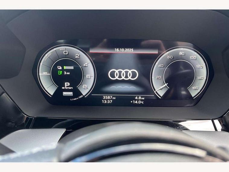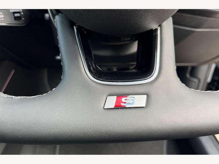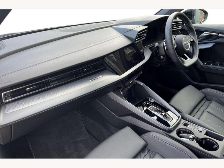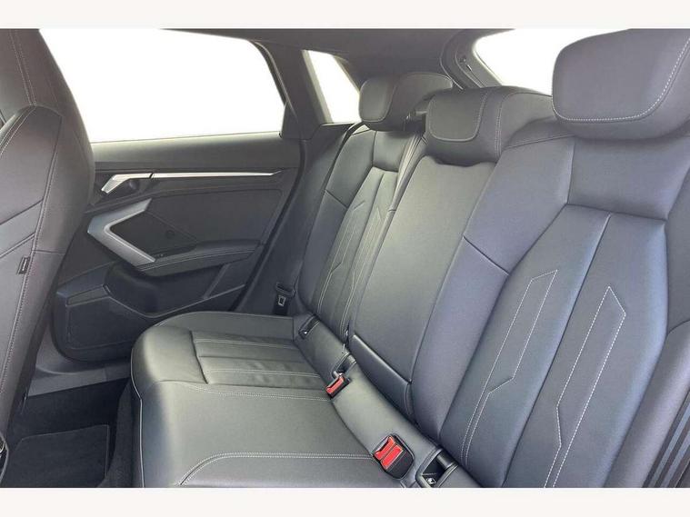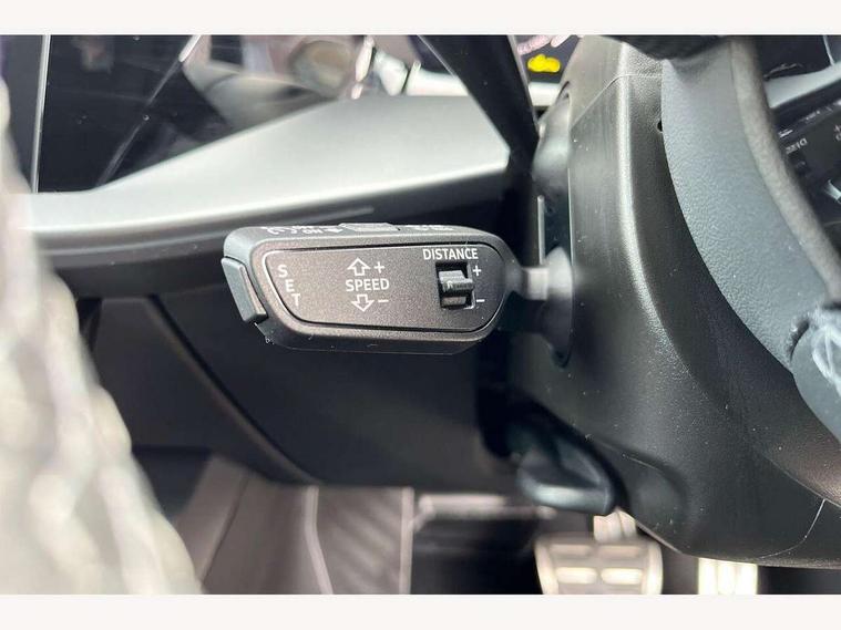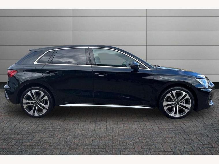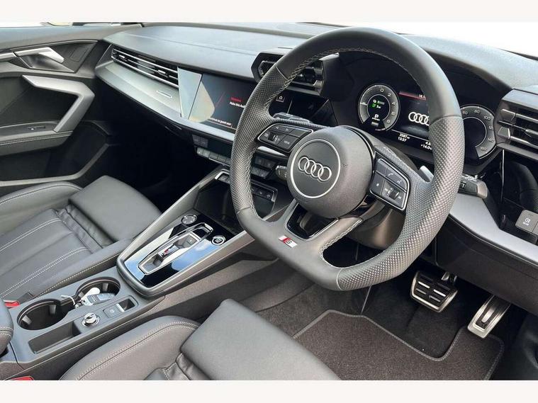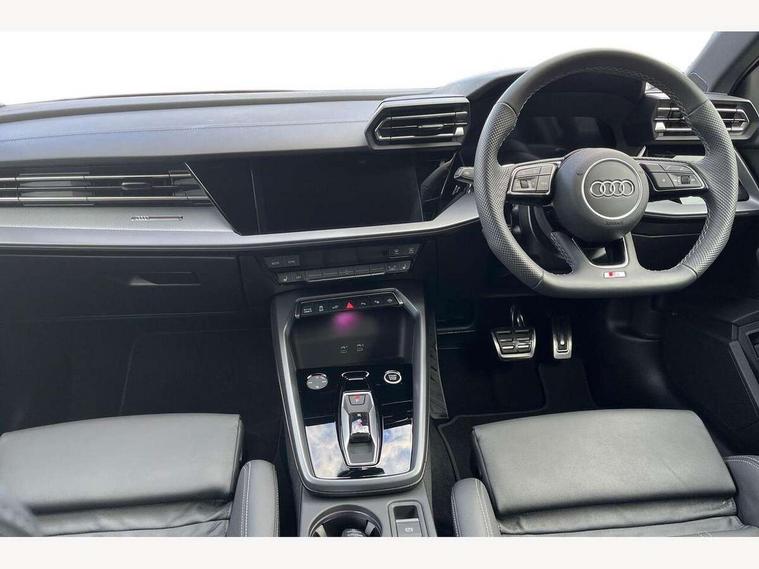 Adjustable speed limiter, Audi drive select, Audi smartphone interface with app store includes wireless Apple carplay, Android auto and Amazon alexa integration, Audi virtual cockpit plus - 12.3" full HD resolution dynamic digital instrument cluster, Automatic start/stop system with recuperation, Bluetooth interface, Camera based traffic sign recognition, Collision avoidance assistant, Cruise control, Distraction and Fatigue warning, e-Call (emergency call), Electromechanical power speed sensitive steering, Lane departure warning system, MMI Navigation Plus with high resolution 10.1" colour touch screen display, Park Assist with parking system Plus, Service indicator, Trip computer, Voice control system with natural language interaction, 3 pin 10 amp domestic charging cable, CCS socket for DC charging, Charging cable for public charging, mode 3 (type 2), up to 22 kW (AC), Compact charging system, Industrial connector CEE 32 A, 230 V, length 1.6 m, Standard suspension, Type 2 socket for AC charging, Audi Phonebox light with wireless charging, Audi sound system - 10 loudspeakers including centre loudspeaker and subwoofer, DAB Digital radio, USB ports with charging function in the rear, Acoustic glass windscreen, Aluminium window trim, Auto dimming frameless rear view mirror, Body colour exterior mirrors, Chrome exhaust tailpipes, Electrically adjustable/heated/folding/auto dimming door mirrors with integrated LED indications + kerb view function for passenger side, Exterior model badging, Front and rear side air inlets in grained matt black with dark liquid chrome frame, Front electric windows, Front radiator grill in high gloss dark chrome, Heat insulating glass windscreen, Illuminated door sills with aluminium inserts at the front with S logo, LED 3rd brake light, LED daytime running lights, LED headlights with LED rear lights and dynamic rear indicators, Light and rain sensors, Privacy glass - dark tinted rear window, rear door and side windows, Rear diffuser and grill in grained matt black with inlay in dark liquid chrome, Rear electric windows, Rear side wing doors, Rear wiper, S line bumpers, S roof spoiler, Side S line emblems on front wings, Side sill trim in dark liquid chrome, 12V socket and storage compartment in front centre console, 3 seat bench in 2nd row, 3 spoke flat bottomed leather multifunction sport steering wheel with gear shift paddles, 3-zone deluxe automatic air conditioning, 4 way electrically adjustable lumbar support for driver and front passenger, 40/20/40 split folding rear seat bench, Black cloth headlining, Convenience auxiliary air conditioning, Front and rear centre armrest in artificial leather, Front and rear centre armrest in artificial leather with contrasting stitching on armrests and instrument panel, Front and rear headrests, Front/rear floor mats, Heated front seats, Height and reach adjustable steering wheel, Manual boot compartment lid, Manually adjustable front seats, Rear cup holders, S badging on the steering wheel, Seat side bolsters, Single front passenger seat, Stainless steel pedals and front footrest in black, Twin leather upholstery with front sports seats S embossed logo, Aluminium interior elements pack - A3 Sportback, Multi-coloured LED interior lighting package - A3, 3x3 point rear seat belts, Acoustic vehicle alerting system, Driver and front passenger airbag with passenger airbag deactivation, Electronic Stabilisation Control (ESC) including ABS, ASR and EDL, First aid kit with warning triangle and 2 safety vests, Front side airbags with head airbags and interaction airbag, Hill hold assist, Pre-sense front with pedestrian and cyclist detection, Seatbelt monitoring, Tyre pressure loss indicator, Anti theft alarm, Anti-theft wheel bolts, Electronically operated child locks, Immobiliser, Remote central locking with safelock, Dash & door Inlay in dark aluminium Spectrum, Tyre repair kit,