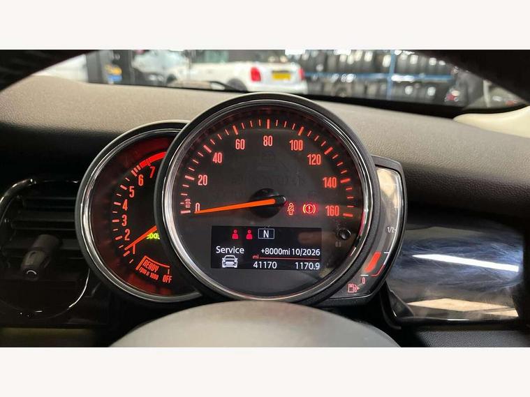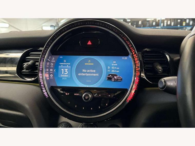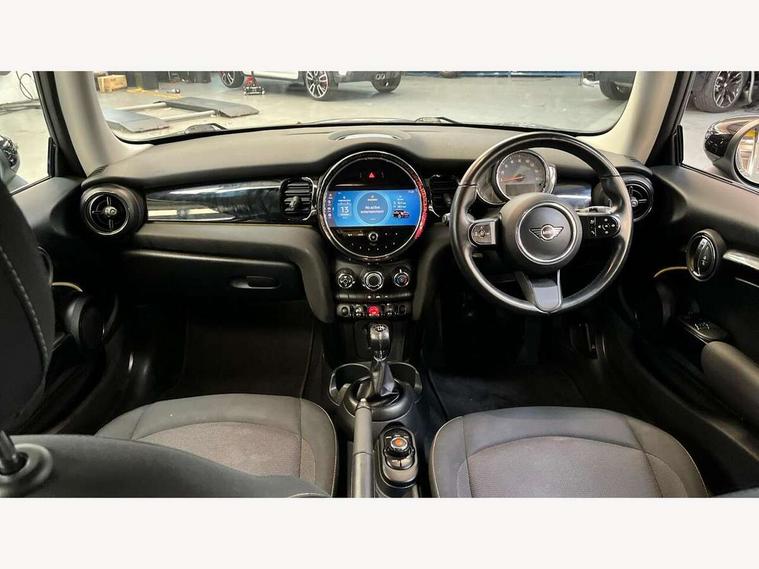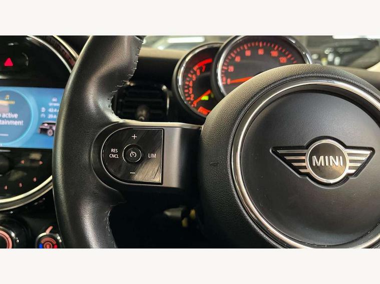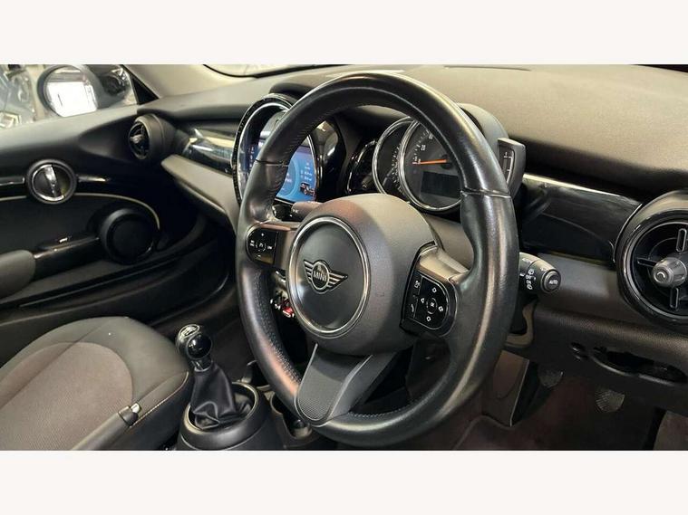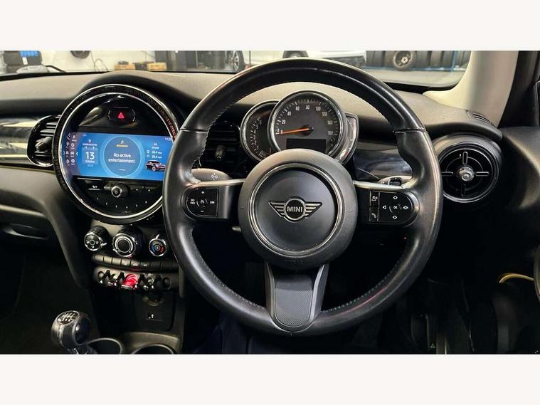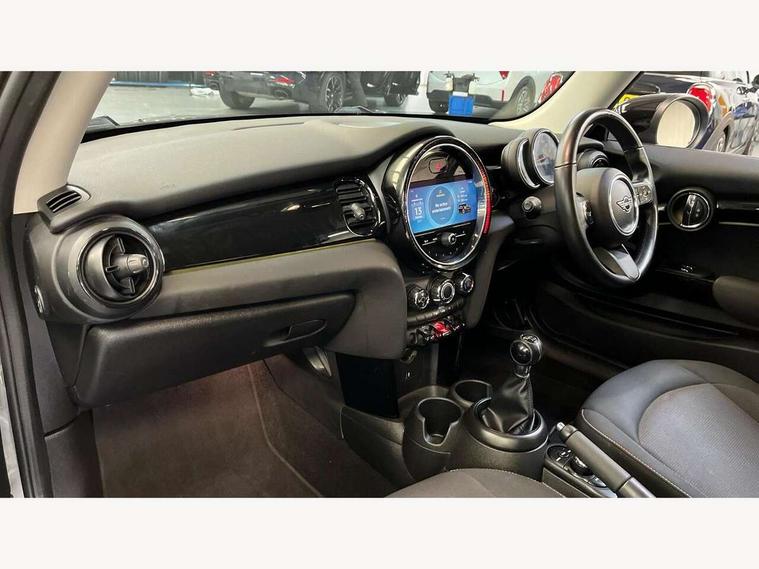 Automatic start/stop function with brake energy recuperation, Compatible mobile phone bluetooth with audio streaming, Cruise control with brake assist, Electro-mechanical speed dependant steering assistance, Flexible car sharing preparation, Instrument cluster, Mini E-call, MINI TeleServices, On board computer, Service interval indicator, 6 Speed manual transmission including gear change indicator display, Double Vanos system, Fully variable valve control, High precision injection, Performance Control, 4 speakers in front door trims and underneath front seats, 8.8" touchscreen with LED ring, FM tuner and DAB digital radio, Automatic headlight activation switch, Body colour fuel filler cap, Chrome border high gloss black slats radiator grille, Dynamic brake lights, Electric front windows, Exhaust tailpipe on left with chrome finisher, Heated rear window, Heated windscreen washer jets, LED headlight with closed ring and daytime driving lights, Metal door sill strips with MINI imprint, Model logo Cooper on right of tailgate, Rain sensor window wipers, Rear fog lights, Rear LED lights with union jack design, Rear window wiper, Side scuttle panel with integrated indicator, Sun/heat protection glass, White indicator lenses, 12V Accessory socket in centre console, 4 lashing eyes in luggage compartment, 60/40 split folding rear seat, Ambient lighting, Carbon black colour line - Knee roll and door armrest, Chrome interior highlights, Cupholders, Front and rear head restraints, Front and rear isofix with front passenger airbag deactivation, Glove compartment, Height and length steering column adjustment, Interior lighting with 12 different colours across the dashboard, underneath door bezel with illuminated laser-engraved design on central display, Leatherette gearshift lever and handbrake gaiters, LED reading lights, vanity mirror lights, front foot well light and spotlight on front seats, Manual air conditioning, Mechanical seat adjustment - forward/back & backrest for front seats and driver seat height adjust, Multifunction steering wheel, Passenger seat height adjuster, Satellite grey headlining including grab handles and clothes hooks, Sport leather steering wheel with speed limiter and audio/communication controls, Storage compartments in doors, Sunvisors with vanity mirrors, Velour floor mats, 3 point seatbelts on all four seats, 6 Airbags - front, side, head and seat belt tensioners, Anti-lock braking system (ABS), DSC - Dynamic Stability Control, Front and rear disc brakes, Single tone fanfare horn, Tyre pressure monitoring system, Alarm system with tilt sensor, monitoring doors, bonnet interior and tailgate, Electronic vehicle immobiliser, Start/stop toggle with keyless go, Piano black interior trim, Tool kit, Tyre repair kit,