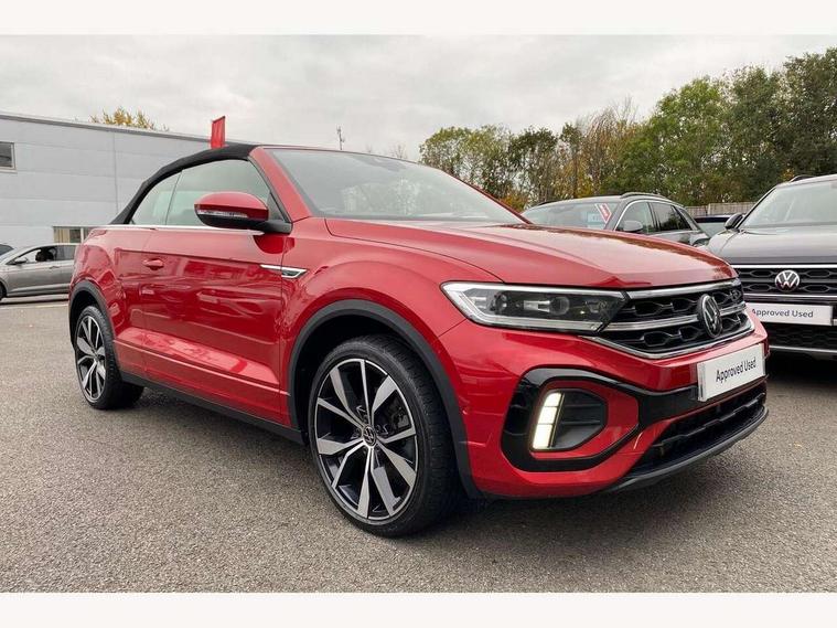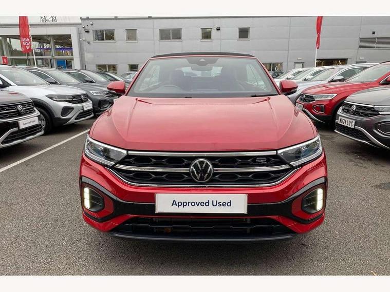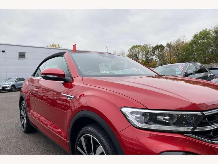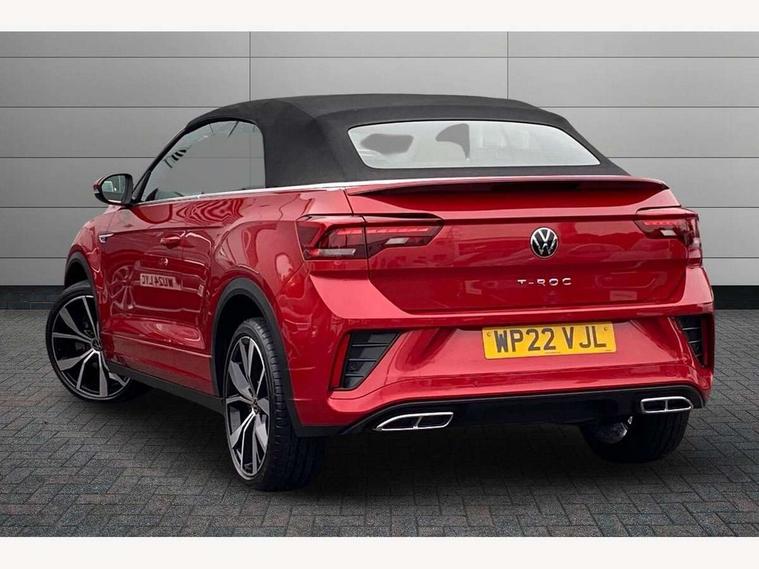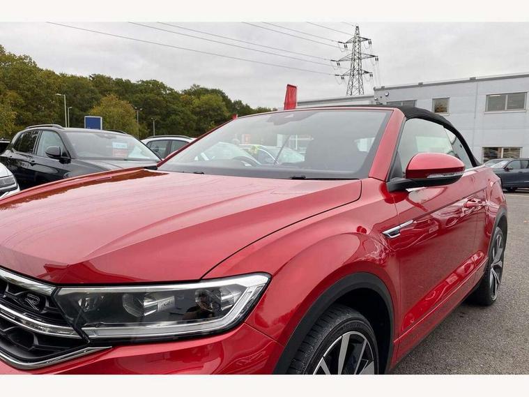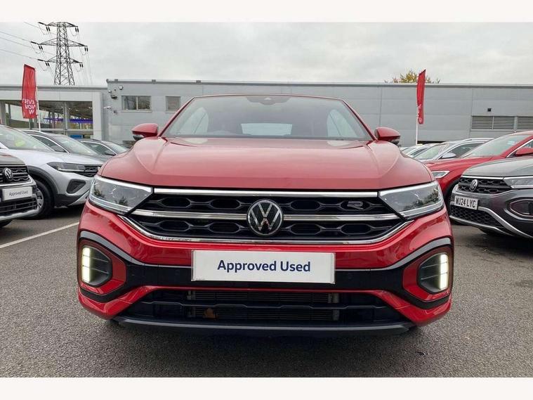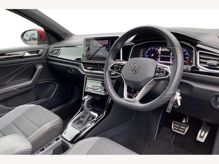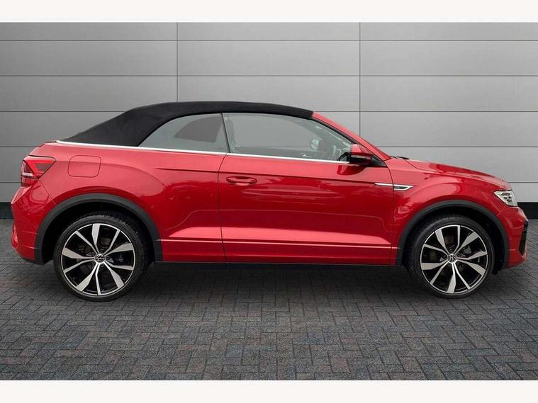 Adaptive cruise control and speed limiter, Bluetooth mobile phone interface, Brake pad wear indicator, Car information display, Digital Cockpit Pro with 10.25" Display, Driver alert system with fatigue detection, Driver tips and journey analysis, Emergency call service, Modified key software - reduce switch off time for key status change to Long no motion, Multifunction computer with visual gear change recommendation for fuel consumption, Multifunction front facing camera, Park assist including front and rear parking sensors, Speedo and rev counter, electronic odometer, trip, service interval display and exterior temperature gauge, Start/stop system with brake energy recovery, Tailgate/trunk lid release from outside, Warning sound and light for front seatbelts unfastened, Diversity antenna for FM reception, Music playback - MP3, WMA and AAC files, SMS functionality - read, compose and send SMS messages using touch-screen display, Title and cover art display, USB-C Interface and USB charging socket, We Connect and We Connect Plus functionality, Ambient lighting with logo projection, Auto dimming interior rear view mirror, Automatic hazard lights activation under emergency braking, Automatic headlight control with LED separate daytime running lights with coming/leaving home function, Black roof, Body colour door handles, Body colour rear spoiler, Chrome effect left and right trapezoid exhaust tailpipe fascia surround, Chrome trim on upper and lower radiator grille, Dark red rear combination lamps in LED technology, Dusk sensor, Exterior mirrors aspherical on driver side, convex on front passenger side, Heat insulating glass windscreen, High level 3rd brake light, LED performance matrix headlights - dynamic range control, dynamic cornering light and turn signal + light mode for rain/fog/snow, LED rear number plate lights, Power operated canvas convertible top, Power windows with comfort operation and circuit breaker, R-Line design body coloured bumpers, Rain sensor, Rear boot, Rear exhaust tailpipe, Rear fog light on one side and reversing lights on both sides, Remote electrically foldable door mirrors, puddle lights and reverse activated passenger door mirror, Volkswagen roundel, Windscreen wiper with intermittent wipe light, Without exterior ambient lighting, 12V socket in centre console storage area, 2 LED front reading lights, 2 seat bench in 2nd row, 50:50 Split folding rear seat backrests with fixed rear seat bench, Air care climatronic air conditoning system with active combination filter and 2-zone temperature control, Black door lower parts with chrome trim, Chrome plated surround to light, mirror and window switch, Door and side trim panel with leatherette insert, Easy entry backrest release, Front and rear carpet mats with black stitching, Front centre armrest, Front cupholders x 2, Front door pockets, Front seat back storage pockets, Front sports comfort seats with manual height adjustment, Heated leather wrapped multi function sports steering wheel with tiptronic, Height/reach adjust steering wheel, Inserts of front seats and outer rear seats in ArtVelours titan black, Instrument lighting, white adjustable panel illumination, Interior light delay, Interior light in footwell, Interior lighting with switch off delay and contact switches on all doors, Interior white ambient lighting and surround lighting, Isofix child seat preparation, Lockable glove compartment with light, Luggage compartment lighting, Power adjustable lumbar support in front, Rear head restraints, Single front passenger seat, Stainless steel pedals, Sun visors with illuminated vanity mirrors, Unique R Line door sill protectors, Driver assistance pack without proactive passenger protection - T-Roc Cabriolet DSG, 2 x 3-point seatbelts/outer rear seats with ECE label, Driver and front passenger airbag with front passenger airbag deactivation, Driver and front passenger safety-optimised head restraints, Drivers seatbelt reminder, Electronic parking brake, Electronic Stability Control (ESC) including ABS, ASR and EDL, Front and rear disc brakes, Front assist with autonomous emergency braking, Pedestrian monitoring, Predictive pedestrian protection, Rigid safety cell with front and rear crumple zones, Side airbag/thorax airbag system, for front passengers, Single tone horn, Three point height adjust front seatbelts + pretensioners, Tyre pressure loss indicator, Volkswagen roadside assistance, Anti-theft alarm system with interior protection and central locking system with SAFELOCK, radio remote control and 2 remote control folding keys, Electronic engine immobiliser, Trims for alloy wheels,