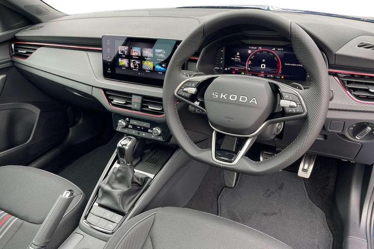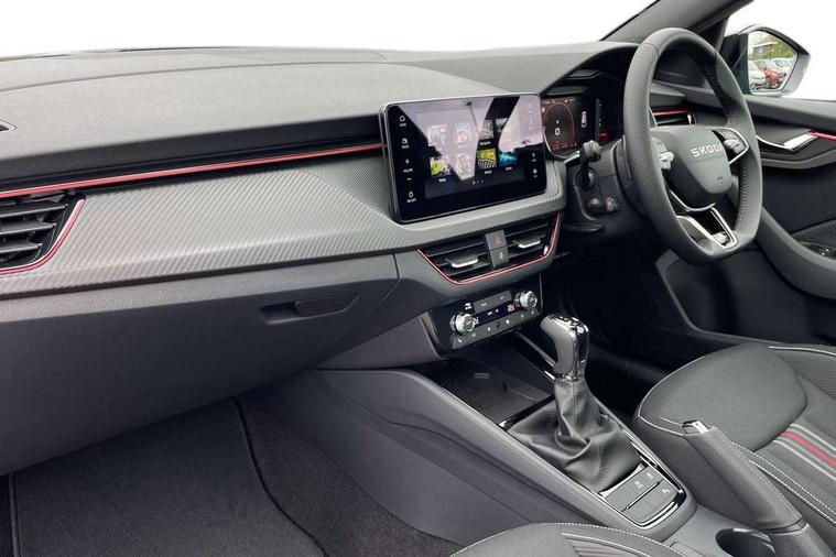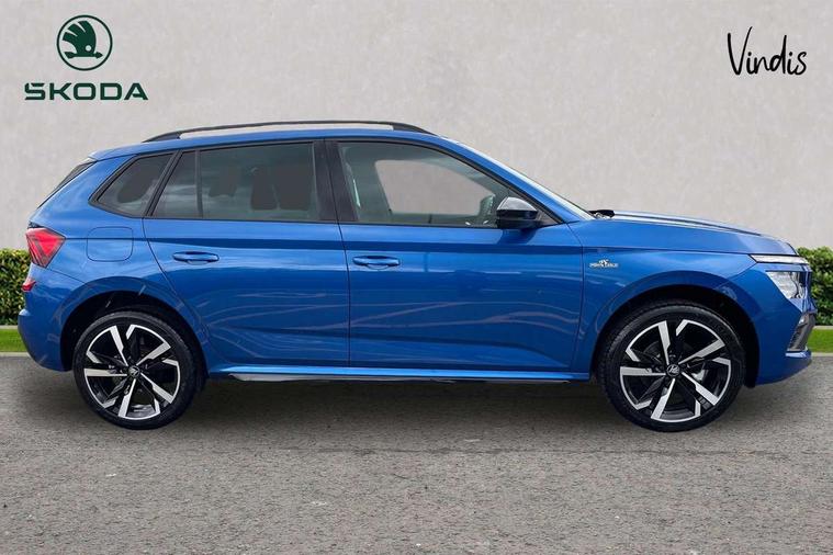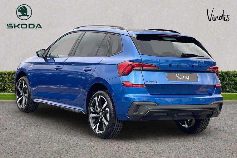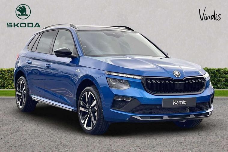 Advanced driver attention and drowsiness monitor, Bluetooth system, E-call, Front assist system, PAS, Rear parking sensors, Rear view camera, Service indicator, Speed limiter, Traffic sign recognition, Virtual cockpit with 10.25" display, Voice control system, Wireless smartlink, 4 USB C ports, 8 Speakers, 9.2" Skoda navigation display, DAB Digital radio, Auto dimming rear view mirror, Automatic headlight control with coming home and leaving home feature, Black door mirrors, Black radiator grille, Black rear diffuser, Black roof spoiler, Body colour bumpers, Body colour door handles, Boot lettering in black, Extended tailgate glass, Fixed panoramic sunroof with black roof rails, Front and rear electric windows, Heated rear window, LED daytime running lights, LED high beam, LED low beam, LED third brake light, Light sensors, Monte carlo plaque, Privacy glass, Rear side wing doors, Rear wiper, Ticket holder inside windscreen, 12V socket in luggage compartment, 3 seat bench in 2nd row, Aluminium pedals, Ambient lighting in white/red, Art leather carbon decor inserts, Art leather carbon door inserts, Black roof lining, Cargo elements, Chrome inner door handles, Driver and passenger sun visors with vanity mirror, Dual zone climate control, Front and rear roof lights, Front centre armrest, Front head restraints, Glove compartment with illumination, Height adjustable driver seat, Height adjustable front passenger seat, Ice scraper, Inner circulation control with pollen filter, ISOFIX on front passenger seat, Isofix preparation for back seats, Leather gearknob and handbrake lever, Manual lumbar support for front seats, Monte Carlo cloth upholstery, Net package and top tether hooks in boot space, Net under rear shelf, Pocket on the back of both front seats include mobile phone pockets, Rake/reach adjustable steering wheel, Reading lights, Rear centre armrests, Red hotstamping, Single front passenger seat, Sports seats, Textile floor mats, Third rear headrest, Top tether for front passenger seat, Umbrella in driver's door, Light and view plus package - Kamiq, 3x3 point rear seatbelts, Airbags - driver and front passenger, Disc brakes, ESP, Extended and predictive pedestrian/cyclist protection, Front passenger airbag deactivation switch, Front side airbags with curtain airbags, Hill hold control, Manual leather parking brake, Manual rear child locks, One tone horn, Seatbelt reminder for driver an co-driver, Traction control, Tyre pressure monitor, Anti-theft alarm system with interior monitoring, backup horn, towing protection and remote central locking with SAFE system, Anti-theft wheel bolts, Electronic engine immobilizer, 18" Ursa black diamond cut alloy wheels,