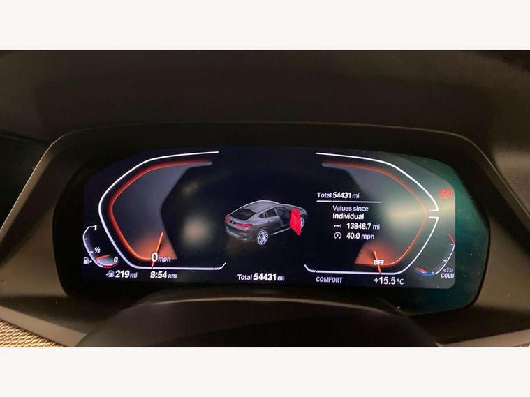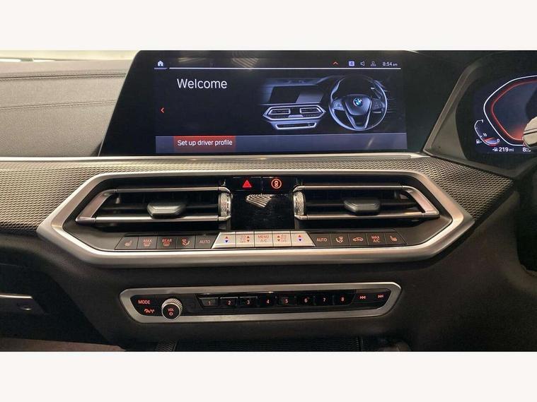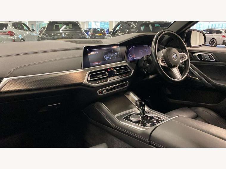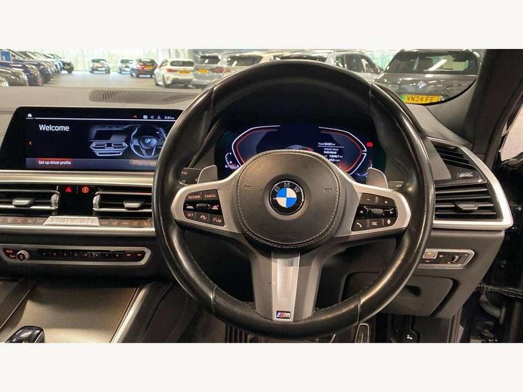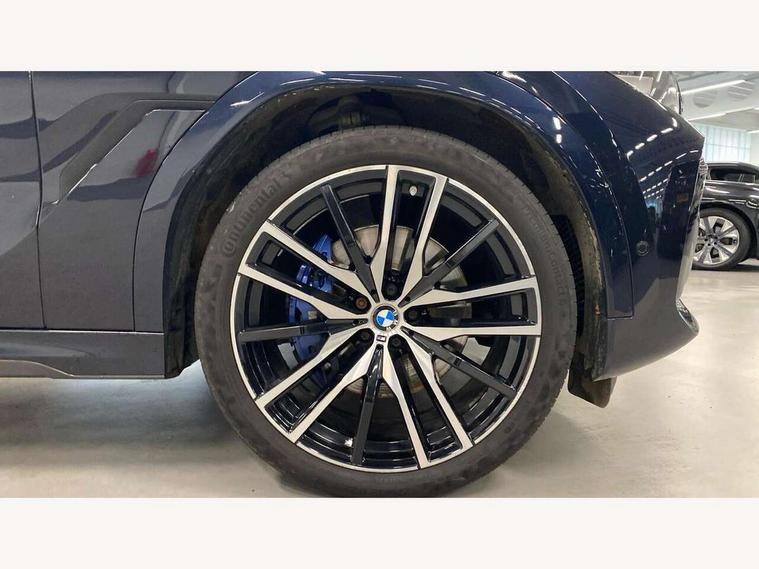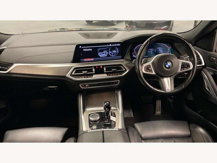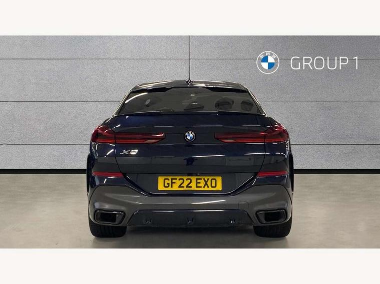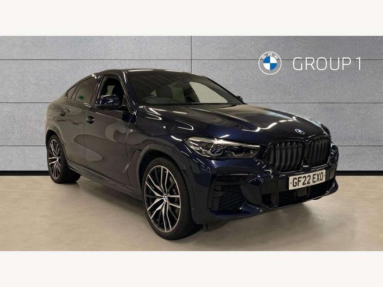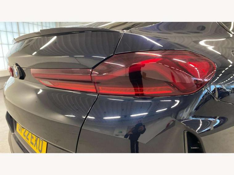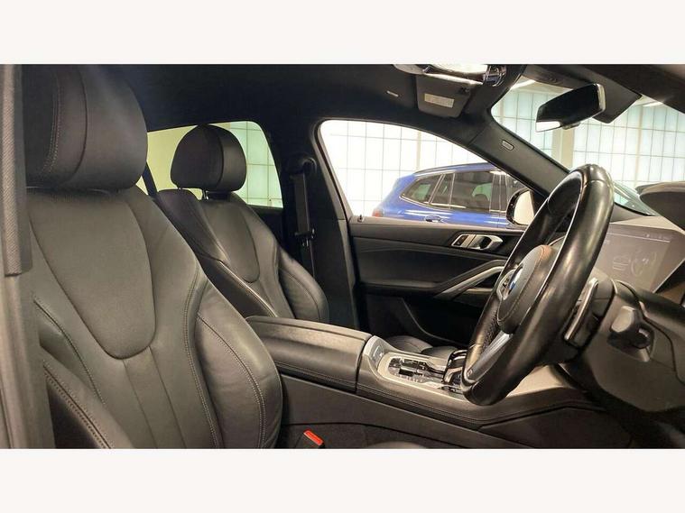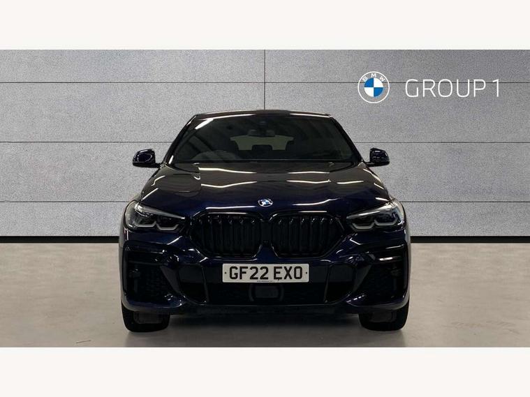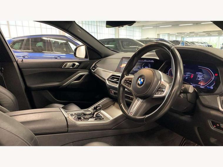 50GB hard disc drive (HDD) memory, Active guard plus, Attentiveness assist, Automatic tailgate two part with top hinged section open and manual bottom hinged section, BMW ConnectedDrive online services, BMW digital live cockpit professional - 12.3" digital instrument panel and 12.3" CID, with touch/voice command, BMW legal emergency call, BMW Teleservices, Brake force display, Brake pad wear indicator warning light, Cruise control with brake assist, Enhanced bluetooth with wireless charging, Front/rear park distance control (PDC), iDrive controller with shortcut buttons, Lights on warning, Oil sensor for level and grade, On board computer inc. average speed, fuel consumption, liquid crystal Info display, journey computer, outside temperature display, personal profile, Service interval indicator, Speed limit info display, Speed limiting function, Wifi hotspot preparation, 48V Mild hybrid technology, Double VANOS, Double wishbone front axle, Drive performance control with ECO PRO comfort + sport mode, Eight speed steptronic sport automatic transmission and gearshift paddles on the steering wheel, High precision injection, Petrol Particulate Filter, Safety battery terminal clamp, Twin scroll turbocharger with Valvetronic, DAB Tuner enables digital radio reception, Favourite buttons, USB connection, USB type A 1.5A in cupholder, USB Type C 3A in centre armrest, Active Air Stream kidney grille with high-gloss chrome, Adaptive air flap control bar in high-gloss black, Automatically dimming rear view mirror, BMW individual exterior line aluminium satinated window frame and window guide rail in front door/pillar trim/door mirrors in high gloss black, BMW Individual high gloss shadow line, Body colour bumpers, Body colour door handles, Dynamic brake lights with LED technology, Exhaust tailpipes - single, left and right with Chrome finisher, Follow me home headlight function, Front and rear electric windows with open and close fingertip control, anti trap facility and comfort closing, Heated windscreen washer jets, High beam assistant, High gloss black outer and central air intakes on front bumper with pearlescent chrome finish, High gloss black Side elements, LED daytime running lights, LED rear lights, M aerodynamic body styling, M designation on left and right front side panels, M Sport exhaust system, Rain sensor with automatic headlight activation and windscreen wiper control, Rear side wing doors, Satin aluminium side window graphic, Third brake light in rear spoiler, Welcome light carpet, X6 on left tailgate, xDrive designation on right tailgate, 12V - Power sockets with 2x centre console and 1x luggage compartment, 3 seat bench in 2nd row, 40:20:40 split folding rear seats, Centre and rear interior light, Child seat ISOFIX attachment with rear outer seats includes top tether, Compartment in front of cupholder, Electrical steering column with adjustable height and length with activation and control on the steering column, Foldable rear centre armrest with 2 cupholders and storage compartment, Front and rear cupholders x 2, Front and rear door pockets, Front and rear door sill inlays with illuminated BMW M designation, Front and rear side armrest integrated into door trim, Front reading lights, Light inside glove compartment, Lockable glove compartment, Luggage compartment floor panel with integral storage tray, Luggage compartment lighting, M specific key, M specific velour floor mats, M sport leather steering wheel, Make-up mirror lights, Multifunction controls for leather steering wheel, Multifunctional hooks, Rear head restraints, Seat back with flap pocket, Single front passenger seat, Storage tray and compartment with cover in centre console, Sunvisors with illuminated vanity mirrors, Toolkit located in luggage compartment, Ambient light interior pack - X6, Connected Package Professional - X6, Expanded exterior mirror pack with electric folding door mirror - X6, Non-smokers pack - X6, 3 rear seatbelts, Airbags - driver/front passenger, rear and side, first and second row seats head airbags, front passenger seat airbag deactivation + knee airbag, Anti-lock braking system (ABS), Automatic Stability Control (ASC), Brake drying, Brake energy regeneration, Brake fade compensation, Braking pre-tensioning, Child proof locking system in rear door, Cornering brake control (CBC), Crash sensor activating central locking release, hazard warning lights, fuel cut off, interior lighting + activation of safety battery terminal clamp, Deformation zones - front and rear with door reinforcements and bumpers up to 2.5 mph, DSC - Dynamic Stability Control, Dynamic brake control, Dynamic Traction Control - DTC, Electromechanical parking brake with automatic drive away release and auto hold function, Electronic brake force distribution, Front and rear brake discs with interior ventilation, Front and rear seatbelts with seatbelt stopper, seatbelt tensioner for front and outer rear seats and belt force limiter, Front head restraints with anti-whiplash, Hill start assistant, Integrated brake system, M Compound brake in high gloss blue, M Sport braking system, Mechanical child proof lock on rear doors, Passive protection for pedestrians, Seat occupancy detection for driver and passenger side, Side impact protection, Two tone horn, Tyre pressure monitoring system, Warning triangle and first aid kit, Closing system with central locking, Driver and front passenger door centre lock switch, Locking wheel bolts, Thatcham 1 alarm system with remote control and engine immobiliser, Start/stop toggle diamond shaped trim finisher in pearl chrome,