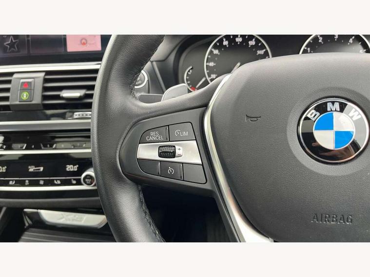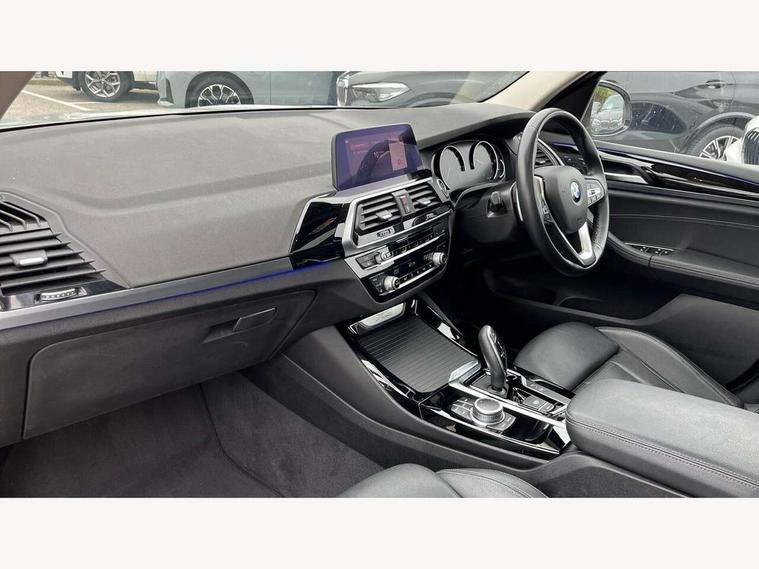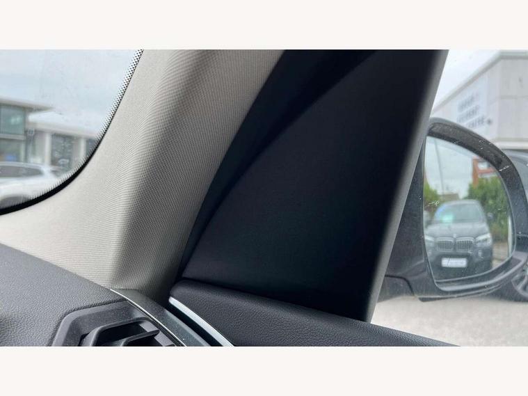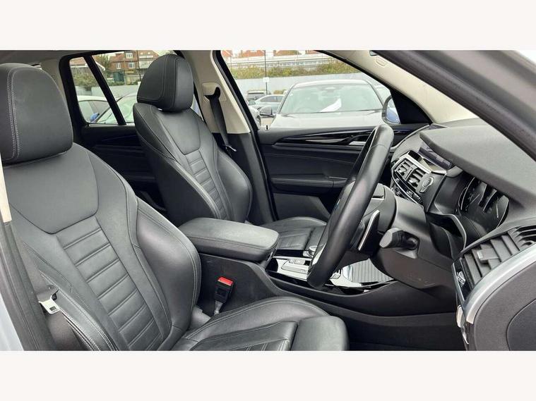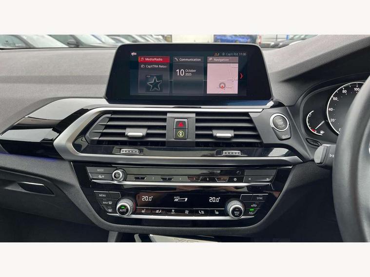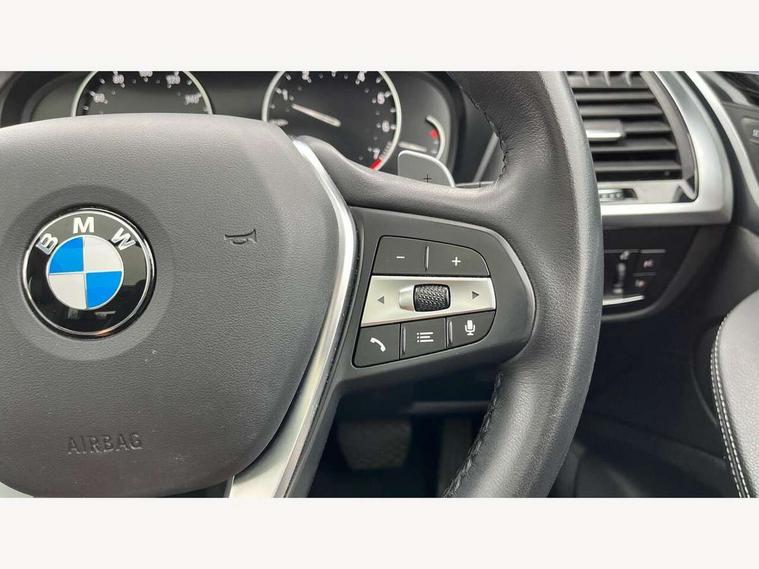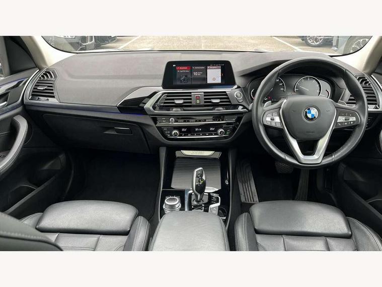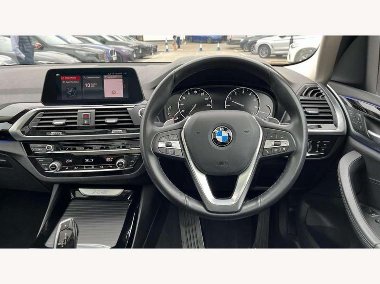 Active Guard incl speed limiting and lane departure functions with auto steering, and front collision warning with brake intervention, Attentiveness assist, Automatic tailgate operation, BMW Live Cockpit Plus with 8.8" central information display + nav function, BMW Online services, BMW Teleservices, Brake pad wear indicator in front and rear, Check Control warning system for monitoring of lights and door/luggage compartment open warning, Control display - 6.5" colour display screen, Electric Power Steering (EPS) with Servotronic, iDrive Controller with 8 favourite buttons, Instrument cluster with speedometer with mph readout, tachometer, fuel gauge and oil temperature gauge, Lights on warning by audio warning signal when ignition is switched off, Oil sensor for level and grade, warning by check control system, On board computer - average speed+fuel consumption, service interval, clock/date, odometer/trip meter, outside temperature display and ice warning, Optimum shift indicator, Personal Profile - automatic lock when driving away selectable, Stop/start system, Automatic transmission with gearshift paddles, Drive performance control with ECO PRO comfort + sport mode, Incorrect fuelling protection, Multi-link rear suspension, 6 speakers, Auxiliary socket for external MP3 player, BMW professional radio/CD/MP3, DAB Digital radio, Acoustic glazing, Black finish on B pillars, Body colour door handles, Body colour electric adjust heated aspherical door mirrors, Body colour roof mouldings, Body coloured bumpers, Chrome kidney grille with matt aluminium vertical slats, Direction indicator, side repeaters, integrated in exterior mirrors, Dual chrome exhaust, Dynamic brake lights, Exterior mirrors - electrically folding with anti-dazzle, Fingertip control / anti-trap function on electric window, Follow me home headlights, Front and rear bumper system with replaceable deformation elements, Front and rear electric windows, Glacier silver metallic matt in side sills, Green tinted heat insulating glass, Heated windscreen washer jets, Height adjustable headlamps, High level 3rd brake light incorporating LED Technology, Interior rear view electrochromatic mirror with automatic anti dazzle function, LED front fog lights, LED tail lights, Lightweight engineering, Matt aluminium roof rails, Model designation, Rain sensor including auto headlights activation, Rear wiper, Shark fin antenna, Visible VIN plate, Welcome lighting, Windscreen wipers with adjustable interval, xLine exterior styling with underbody protection, 12V socket in centre console and luggage area, 3 rear headrests, 3 spoke sports leather multi-function steering wheel, 3 zone automatic air conditioning, 4 lashing points to secure luggage, Ambient lighting, Anthracite Velour floor mats, Driver/passenger sunvisors with ticket holders + illuminated vanity mirrors, Foldable boot floor with storage compartment, Four grab handles integrated in roof lining, Front and rear bottle holders integrated into door trim storage compartments, Front and rear side armrests integrated into door trim, Front centre armrest with storage compartment, Front door sill finishers with BMW X-line designation, Front footwell lights, Front sports seats, Front/rear courtesy lights with soft on/off dimming, Front/rear reading lights, Height adjustable front/rear head restraints, Isofix rear child seat preparation, Leather gear knob, Luggage area underfloor compartment, Luggage compartment lighting, Parcel shelf removeable and storable under boot floor, Reach and rake adjustable steering column, Rear centre armrest with 2 cupholders, Removable / retractable luggage cover, Slope adjustable rear seats, Stainless steel load sill protection, Storage compartment in rear centre console and front/rear door trims, Through loading system with 40/20/40 split folding rear seat, Toolkit located in luggage compartment, Two front cupholders with removable oddments tray/lid, Vernasca leather upholstery, Connected pack plus - X3, Media pack - Business - X3, ABS/EBD, ADB - Automatic Differential Brake, Automatic Stability Control (ASC), Battery safety cut-off, BMW emergency call, Brake assist, Brake drying, Brake energy regeneration, Braking pre-tensioning, CBC - (Cornering brake control), Child locks on rear doors, Crash Sensor - activation of central locking release, hazard warning light and interior lighting, Deactivation of fuel pump in the event of a crash, Driver and front passenger front and side airbags with passenger deactivation and ITS front and rear head airbags, DSC+, Dynamic brake control, Dynamic Traction Control - DTC, Electromechanical parking brake, Front seat belts warning, Hill descent control, Hill start assist, Seatbelt security check for front seats, Side impact protection, Three point seatbelts to all seats with front and outer rear pyrotechnic belt tensioners and seat belt force limiters, Two tone horn, Tyre pressure monitoring system, Ventilated front and rear disc brakes, Warning triangle and first aid kit, Central locking switch for all doors, fuel filler cap and luggage compartment, Electronic engine immobiliser, Locking wheel nuts, Remote control including two integrated key - one button for open/close all lockable content, windows and separate button for open luggage compartment, Remote control Thatcham category 1 alarm, Start/stop button with Comfort Go keyless engine start and auto Start/stop deactivation button, Low rolling resistance tyres,