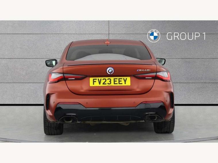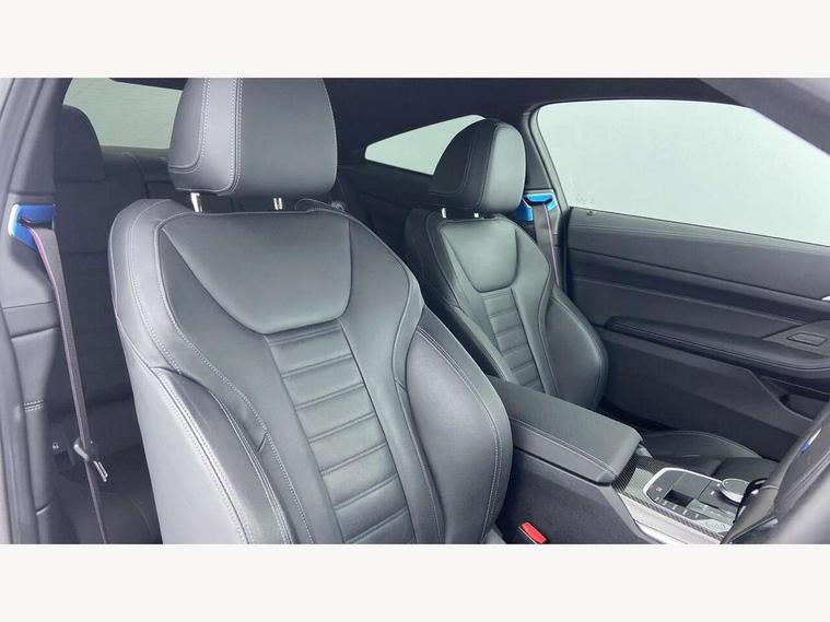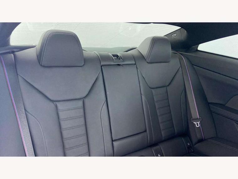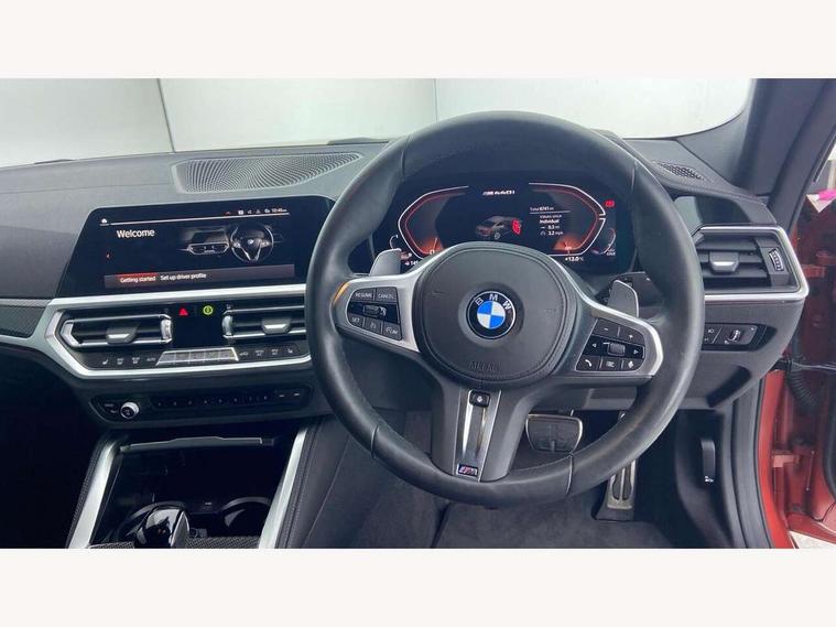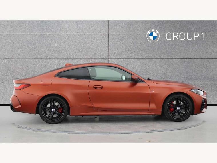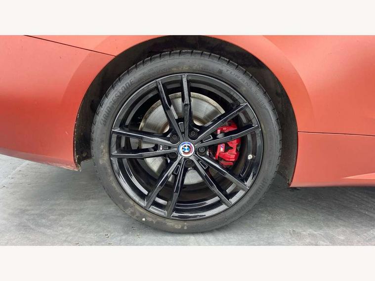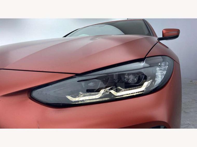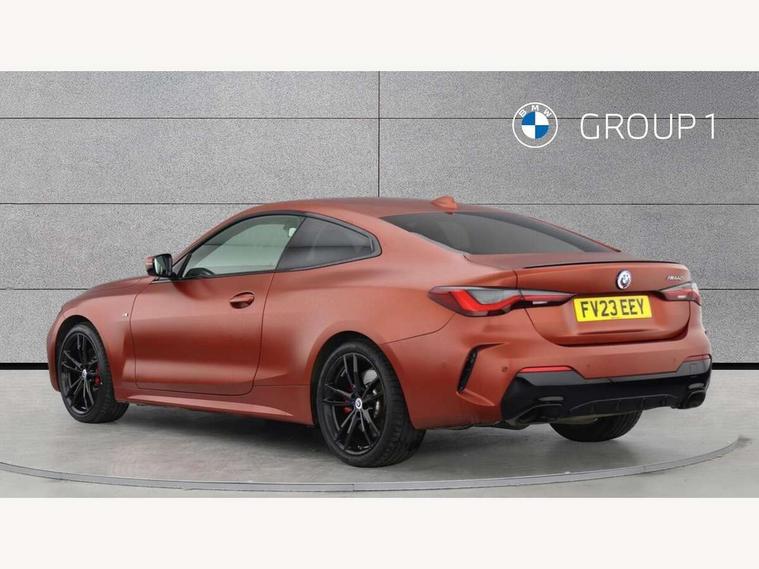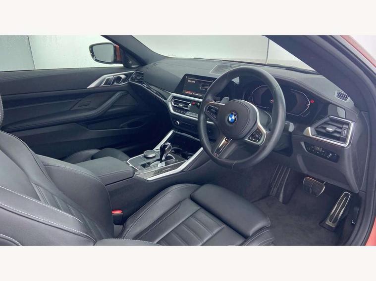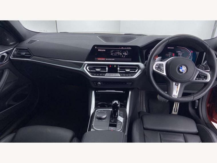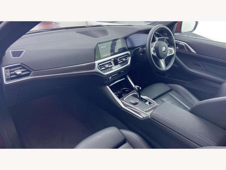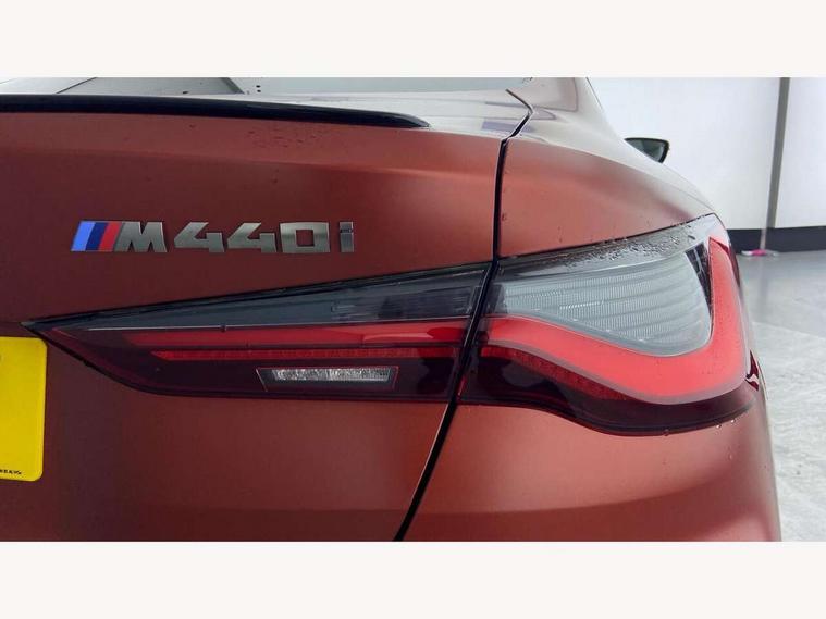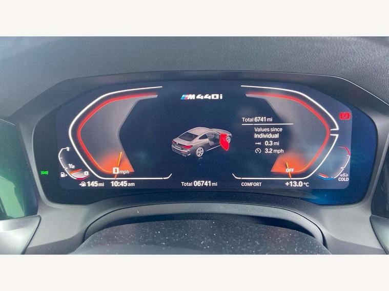 Active guard plus, Attentiveness assist, Auto start-stop, Bluetooth hands free facility with USB audio interface with audio streaming, BMW ConnectedDrive online services, BMW iDrive controller on centre console, BMW service history, BMW Teleservices, Brake pad wear indicator in front and rear, Check Control warning system for monitoring of lights and door/luggage compartment open warning, Condition based service, Electric power steering with Servotronic steering optimised at all speed ranges, Gearshift time display in manual mode, Instrument cluster with speedometer with mph readout, tachometer, fuel gauge and oil temperature gauge, Integrated owners handbook, Oil sensor for level and grade, warning by check control system, On board computer - average speed, fuel consumption, outside temp display with acoustic warning, clock/date, service interval, odometer/trip meter, Optimum shift indicator, Run flat indicator, Shifting point display, Variable sport steering, 48V Mild hybrid technology, 8 speed automatic steptronic transmission with gearshift paddles, Active sound design, Adaptive M suspension, Balanced 50/50 weight distribution, Double joint spring strut front axle, Drive performance control - ECO PRO, comfort and sport modes, Low centre of gravity, M Sport differential, Petrol Particulate Filter, Sprint mode, Stroke dependent dampers, xDrive system permanent all-wheel drive variable torque distribution, 2x USB Type C ports in front centre console for charging and data transfer, 2x USB Type C ports in rear centre console for charging, DAB tuner, Electronic service booklet, 3rd brake light, Acoustic glazing, Automatic headlight beam throw control with load dependent regulating reaction, dynamic compensation of braking dive and acceleration squat, Automatic windscreen wipers and automatic headlight, Automatically dimming electrochromatic rear view mirror, BMW emblem on engine compartment lid and tailgate, BMW Individual high gloss shadow line with extended contents, BMW individual lights shadow line, Body colour fuel filler flap, Body colour roof fin, Brushed aluminium inserts in the front door sill finishers with BMW designation, Door sill strips, Dynamic brake lights, Electric windows - front and rear, with open/close fingertip control, anti trap facility and comfort closing function all round, Exterior mirrors - electrically folding with anti-dazzle, Fading support, Follow me home headlights, Front and rear bumper system, Front apron plastic in body colour, Green tinted heat protection glazing, High gloss shadow line exterior trim, Illuminated bow type door handles in body colour drivers side with door lock, Interior rear view electrochromatic mirror with automatic anti dazzle function, LED daytime running lights, LED front indicators, Licence plate panel integrated into front bumper and tailgate, Lightweight engineering, M designation on front side panels, left and right, M rear boot spoiler, Model designation on right side of tailgate, One piece front bumper cover including towing eye cover in body colour, Preparation for high beam assistant, Rear boot, Reversing light, Side frame decorative moulding black matt, Sun protection glass, Two part LED tailights in L-shape with components in smoked glass, brake light, LED turn indicator and rear fog light, Visible exhaust tailpipe finisher, Visible VIN plate, Welcome lights in interior and door handle area, Widened track and increased camber values for max transverse dynamics, agility and steering precision, Window recess cover black high gloss, Windscreen wipers with integrated heated washing jets, xDrive designation on left tailgate, 12V power socket in front centre console, 2 front cupholder in centre console with clamping elements and matt black inlay, 2 Rear seat headrests, 2 seat bench in second row, 3 spoke M sport leather multifunction steering wheel, 3 zone automatic air conditioning, 4 pieces lashing eyelets in luggage compartment, 40:20:40 split folding rear seat and rear centre armrest with two cupholders, Anthracite headlining, Armrest integrated in front and rear door trim + front centre console armrest, Battery in luggage compartment, BMW ID, Extended storage - Luggage compartment partition net on left side trim panel, Bag hook on both sides of the luggage compartment, Four grab handles integrated in roof lining, Front and rear door pockets, Front and rear reading lights, Heated driver and front passenger seats, Height adjustable front headrests, Height adjustable mechanically and infinitely variable steering column, Illuminated armrest storage compartment, Illuminated glove compartment with separate small compartment, Make-up mirror lights, Single front passenger seat, Storage compartment in rear centre console, Sunvisors with illuminated vanity mirrors and ticket pocket, Toolkit located in luggage compartment, Velour front floor mats, Ambient lighting pack - 4 Series, Connected professional package - 4 Series, M sport exterior styling pack - 4 Series M440i, 2 x 3-point rear seatbelts, Battery safety cut-off, BMW emergency call, Brake energy regeneration, Braking pre-tensioning, Child seat ISOFIX attachment for the two outer rear seats, Coasting in idle in ECO PRO mode, Cornering brake control (CBC), Crash sensor activating of airbags, Unlocking doors, hazard warning lights, interior light, safety battery terminal, Driver and front passenger side airbags, integrated in the door side seat backrest bolsters for all seat variants, Driver/Front Passenger airbags, Dry braking, Dynamic brake control, Dynamic stability control + (DSC+) - Anti-lock Braking System (ABS) with brake assist and cornering brake control + Automatic Stability Control (ASC), Dynamic Traction Control - DTC, Electric parking brake including automatic hold function and automatic release of the parking brake when driving off, Electronic differential lock control (EDLC), Front and rear ventilated brake disc, Front passenger manual airbag deactivation, Head ai