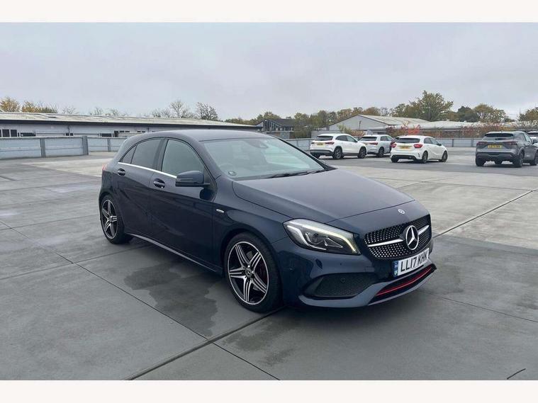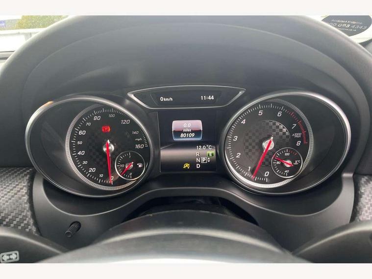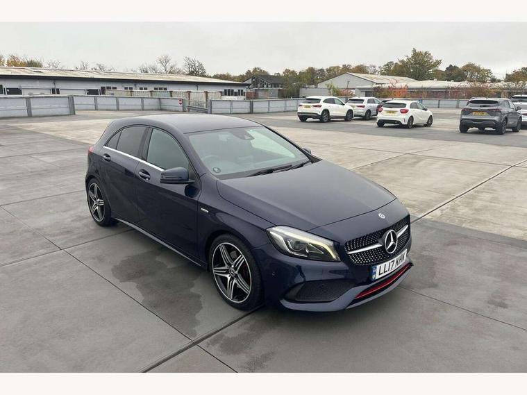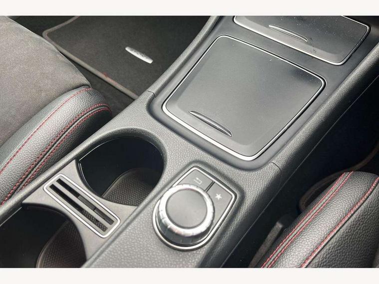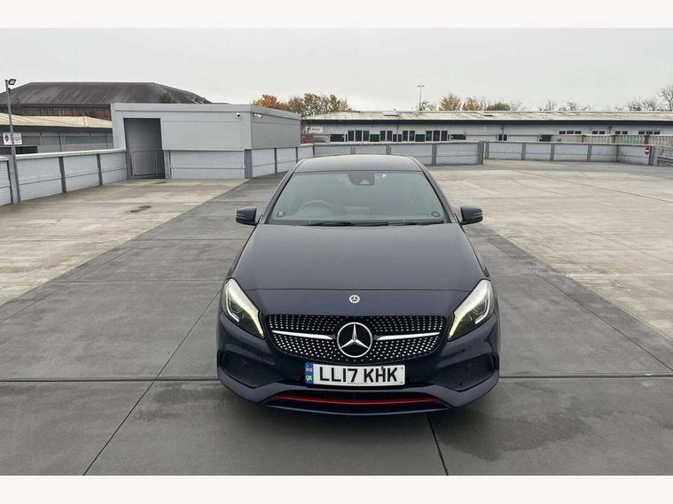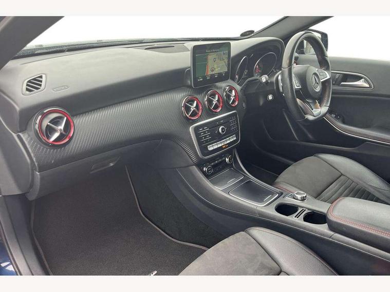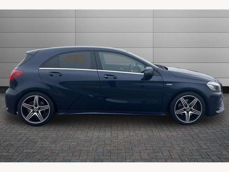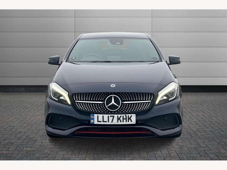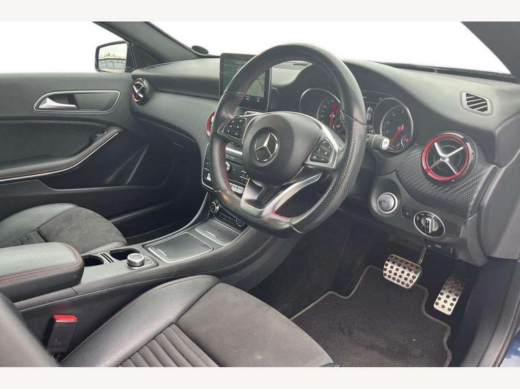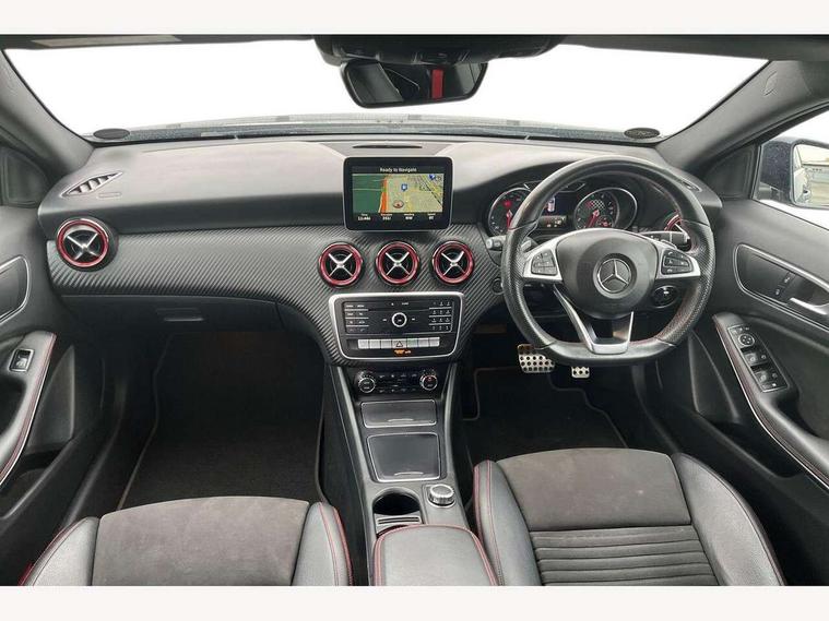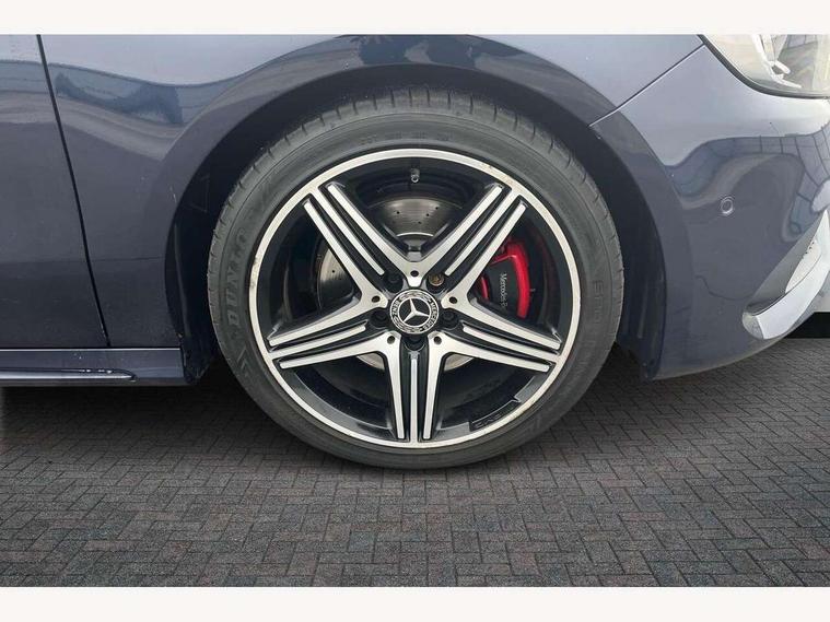 8" colour display screen, AMG speed sensitive sports steering, Attention assist, Bluetooth interface for hands free telephone, Bulb failure indicator, Collision prevention assist plus, DYNAMIC SELECT with a choice of driving modes (ECO, Comfort, Sport, Sport+ and Individual), External temperature gauge, Low fluid warning light, Park assist pilot with front and rear park assist, Reversing camera, Service indicator (ASSYST PLUS), Trip computer, Sports suspension, 6 speakers, USB port, Adaptive brake lights, AMG body styling, Auto dimming driver's door mirror, Auto dimming rear view mirror, Body colour bumpers/red strips, Body colour door handles, Body colour side skirt, Body coloured door mirrors, Chrome beltline trim, Diamond radiator grille with chrome pins and gloss black louvre + chrome insert, Electric adjustable heated door mirrors, Electric folding door mirrors, Electric front windows, Electric rear windows, Headlamp assist, Heated rear window with timer, Heated windscreen wash system, High beam assist, LED daytime running lights, LED Headlights, LED rear lights, LED tail lights, Rain sensor windscreen wipers, Rear wiper, Twin Trapezoidal tailpipes, 1/3 to 2/3 split folding rear seats, 12 colour Ambient lighting, 12V socket, 3 Spoke sports multifunction flat bottomed leather steering wheel, AMG performance seats, Artico man-made leather/Dinamica upholstery, Auto Mercedes-Benz child seat recognition sensor, Black headlining, Brushed stainless steel sports pedals, Dual zone automatic climate control, Floor mats with red stitching, Footwell lights, Front and rear reading lights, Front centre armrest with storage compartment, Front head restraints, Front sport seats, Gearshift paddles on steering wheel, Heated front seats, Height adjustable front seats, Height/reach adjustable steering column, Illuminated door sills, Illuminated glovebox, Illuminated storage compartment, Isofix rear child seat preparation, Load securing rings in luggage compartment, Luggage compartment cover, Rear head restraints, Storage compartment under load area floor, Sunvisors with illuminated vanity mirrors, Twin front cupholders, Seat comfort pack - A Class, 3 rear 3 point seatbelts, ABS with Brake Assist, Active bonnet, Adaptive brake system, Brake calipers with Mercedes-Benz lettering + perforated brake discs, Child proof door locks, Crash responsive emergency lighting, Drivers knee airbag, Dual stage driver/passenger airbags, Electronic parking brake, ESP with ASR, Front and rear seatbelt reminder, Front head airbags, Front passenger seat occupancy sensor, Front side airbags, Hill start assist, Red painted brake calipers, Tyre pressure monitoring system, Warning triangle and first aid kit, Window airbags, Alarm system/interior protection/immobiliser, Keyless ignition, Remote central locking, Black air vent surrounds with red insert, Carbon effect trim, Tirefit sealant with electric air pump,