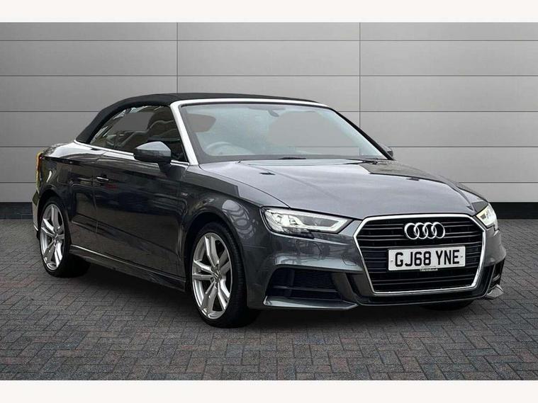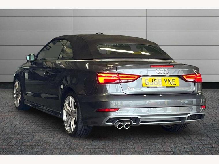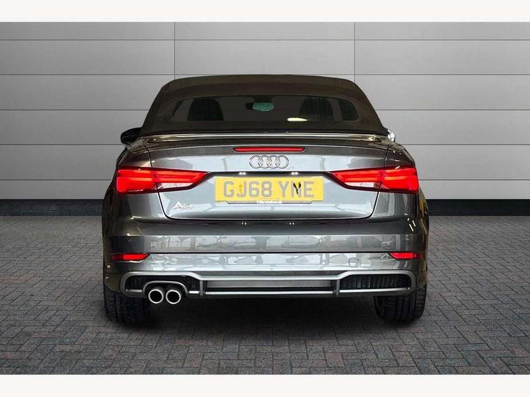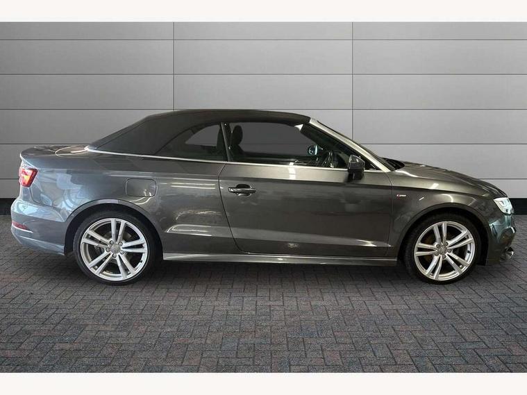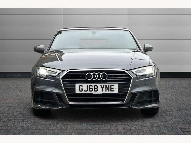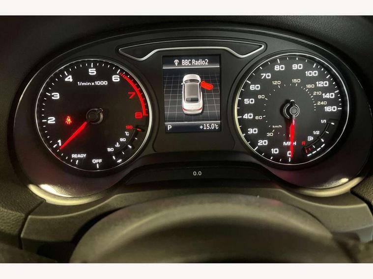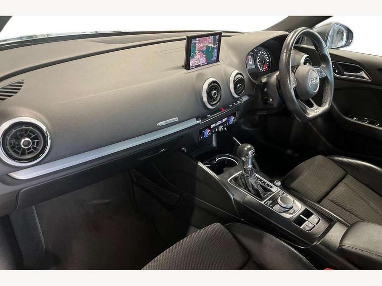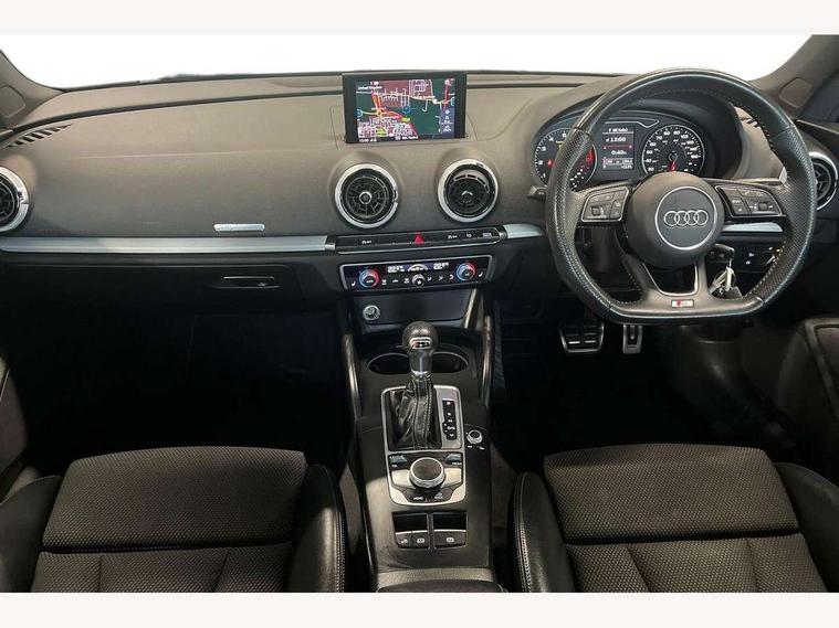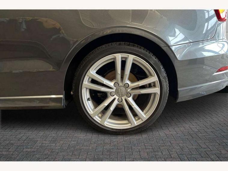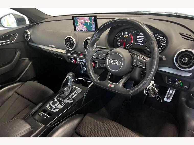 Audi drive select, Audi smartphone interface, Automatic start/stop system, Bluetooth interface, Colour driver's information system display, Electro-mechanical PAS, SD card based MMI navigation, Service interval indicator, 2 USB ports, Audi music interface, Auxiliary input socket, CD player, DAB Digital radio, MMI radio plus with 7" colour MMI screen and MMI controller, Aluminium side window trim, Auto dimming rear view mirror with light and rain sensors, Automatic lights and wipers, Body colour bumpers, Body colour door mirrors with integral indicators, Chrome exhaust tailpipes, Dark chrome grille, Electric operated/heated door mirrors, Front and rear electric windows, Fully automatic acoustic hood, Heated front windscreen, Heated rear window, Heated windscreen washer jets, LED daytime running lights, Roof spoiler, S Line body styling, 2 height adjustable rear headrests, 3 spoke flat bottom multi-function leather steering wheel including paddle shift, 4 lashing points to secure luggage, 50/50 split folding rear seat, Adjustable front armrest, Black headlining, Driver/passenger sunvisors, Dual zone electronic climate control, Front/rear floor mats, Height adjustable front seats, Height/reach adjustable steering column, Illuminated glovebox, Isofix child seat preparation, Perforated leather gearknob, Stainless steel pedals, Storage box under drivers seat, Storage compartment in centre console, Storage compartments in doors, Tool kit, LED interior light pack - A3/RS3, Light and rain sensor pack - A3 Cabriolet, Non smoking pack - A3, Storage pack - A3 Cabriolet/Saloon, 3 point seatbelts on all seats, ABS/EBD, Active bonnet, Active front headrests, ASR, Automatic roll over protection, Driver and passenger side airbags, Driver/Front Passenger airbags, Drivers knee airbag, EDL, Electromechanical parking brake, ESC - Electronic Stability Control + traction control, Front passenger airbag deactivation, Hill hold assist, Seatbelt warning, Tyre pressure monitor, Warning triangle and first aid kit, Anti theft alarm, Anti-theft wheel bolts, Immobiliser, Remote control central locking, Aluminium air vent surrounds, Aluminium trim elements, Matt brushed aluminium inlays, Space saver spare wheel,