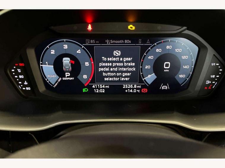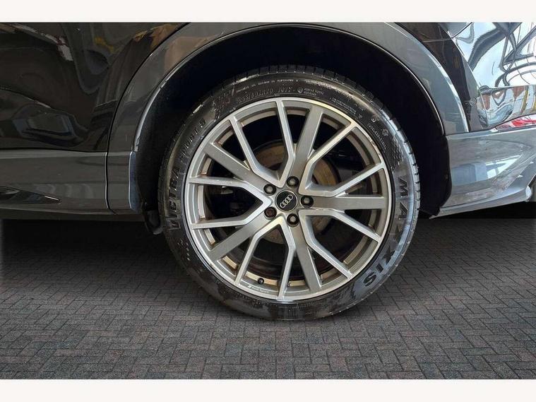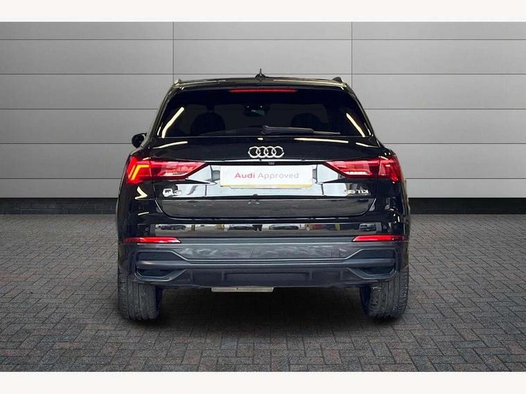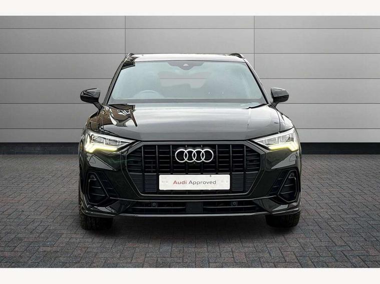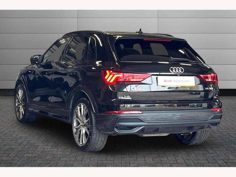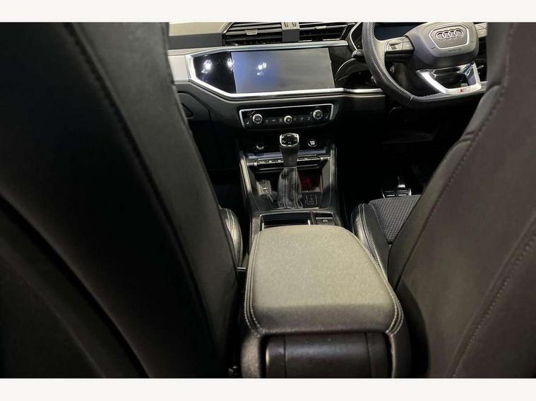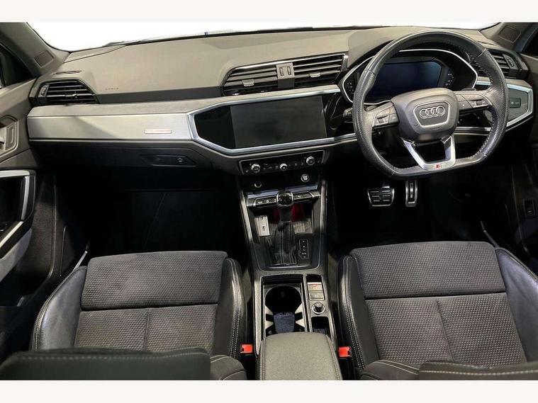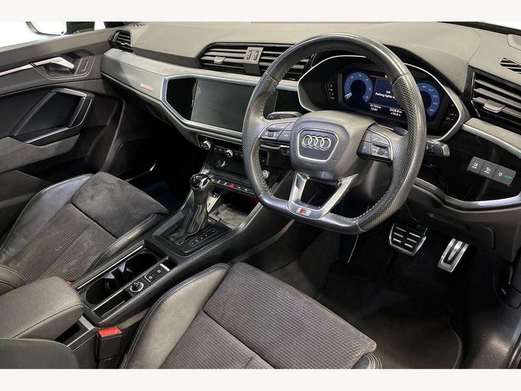 360 degree parking camera, Audi connect safety and service (e-call), Audi drive select, Audi lane departure warning, Audi parking system plus with front and rear sensors, Audi phone box with wireless charging, Audi side assist, Audi smartphone interface, Audi virtual cockpit plus, Bluetooth interface, MMI navigation plus with MMI touch, Power opening/closing tailgate, Progressive steering, Rear cross traffic alert, Service interval indicator, Stop/start system, Voice control system, Adaptive suspension with damping control, Diesel particulate filter, 1 x USB type C and 1 USB type A charging points, Bang & Olufsen 3D Premium Sound System, DAB digital radio module, Acoustic windscreen, Audi Beam uses LEDs to project the Audi Sport logo, Auto dimming and folding door mirrors, Auto dimming rear view mirror, Black roof rails, Contrast bumpers in Manhattan grey paint finish, Diffuser in matt Platinum grey, Electrically adjustable and heated door mirrors with integrated LED side indicators, Front and rear electric windows, Front fog lights, Front spoiler blade in matt platinum grey, Headlight washers, High gloss black finish B and C pillars, Matrix LED headlights with LED rear lights and dynamic front and rear indicator, Panoramic opening glass sunroof, Privacy glass, Rain and light sensors, Rear diffuser strip in matt titanium black, S line bumpers in contrasting Manhattan grey, 12V socket in rear centre console, 3 spoke flat bottomed high multi-function leather sport steering wheel with gearshift paddles, 4 way electric lumbar support for driver and front passenger, 40:20:40 split folding rear bench seat, Adjustable rear seat bench/backrest with centre armrest and cupholder, Aluminium door sill trims, Black cloth headlining, Dual zone climate control, Electrically adjustable front seats, Front and rear black floor mats with contrast stitching in rock grey, Front and rear headrests, Front and rear roof module including reading lights, Front centre armrest with storage compartment and angle adjustment, Glove compartment lighting, Heated front seats, Height and reach adjustable steering wheel, ISOFIX child seat mounting and Top Tether with front passenger airbag deactivation, Luggage compartment light, Perforated leather gearknob, Stainless steel luggage compartment sill finisher, Stainless steel pedals, Black styling pack - Q3, Driver Assistance Pack - Q3, Multi coloured extended ambient interior lighting pack - Q3, Non smoking pack - Q3, 3x3 point rear seatbelts, 6 airbags - Driver, front passenger, curtain and side windows, Audi pre-sense front with pedestrain and cyclist recognition, Electrically operated child locks on rear doors, Electromechanical parking brake, Electronic stabilisation control including ABS, ASR and EDL, Hill descent control, Hill hold assist, Pre sense basic, Seatbelt monitoring, Tyre pressure warning, Warning triangle and first aid kit, Advanced key, Anti theft alarm, Anti theft wheel bolts, Remote central locking, Dark matt brushed aluminium inlay, MMI touch colour display in gloss black with aluminium surround,