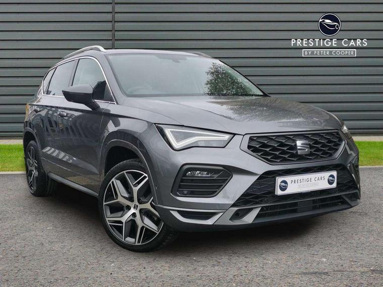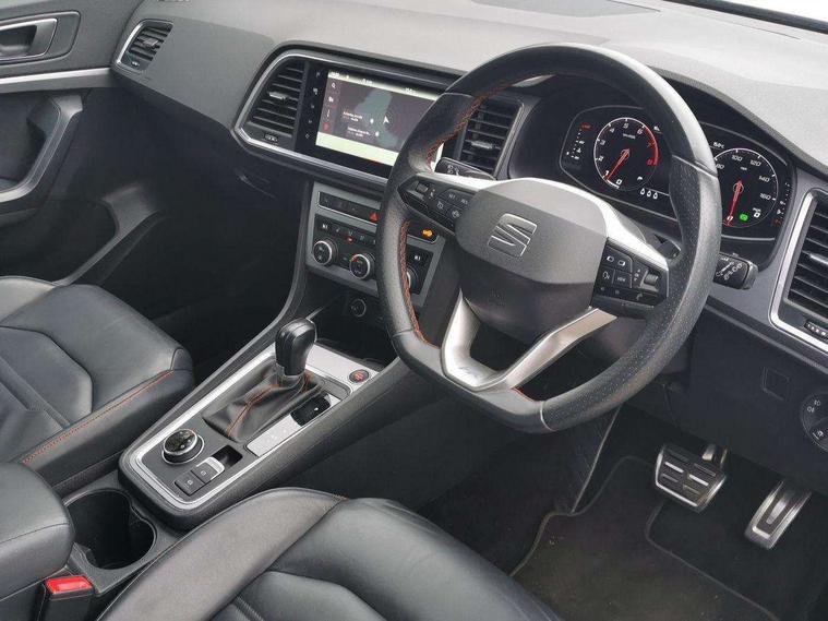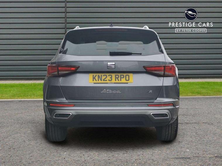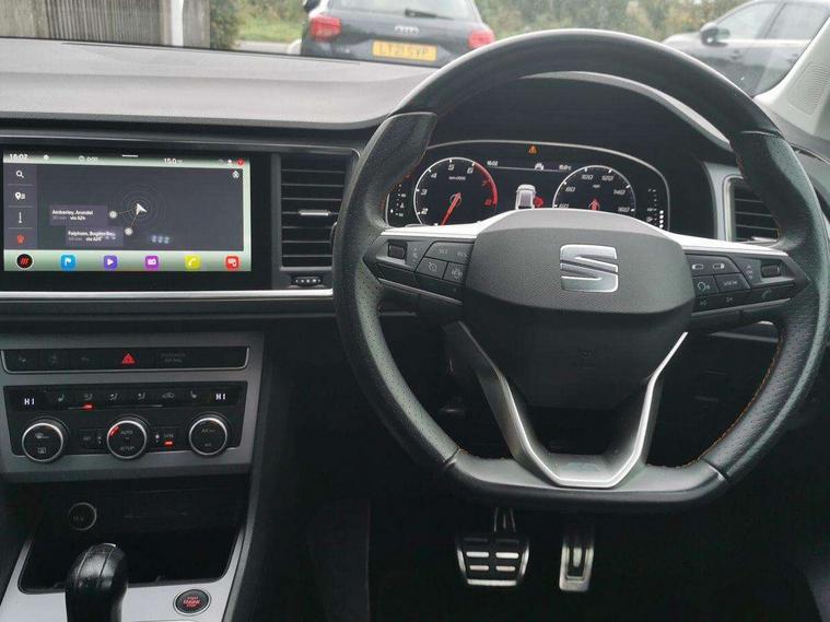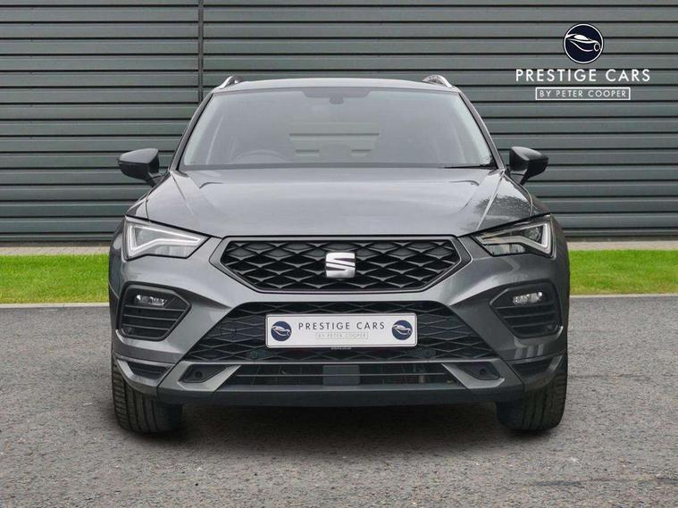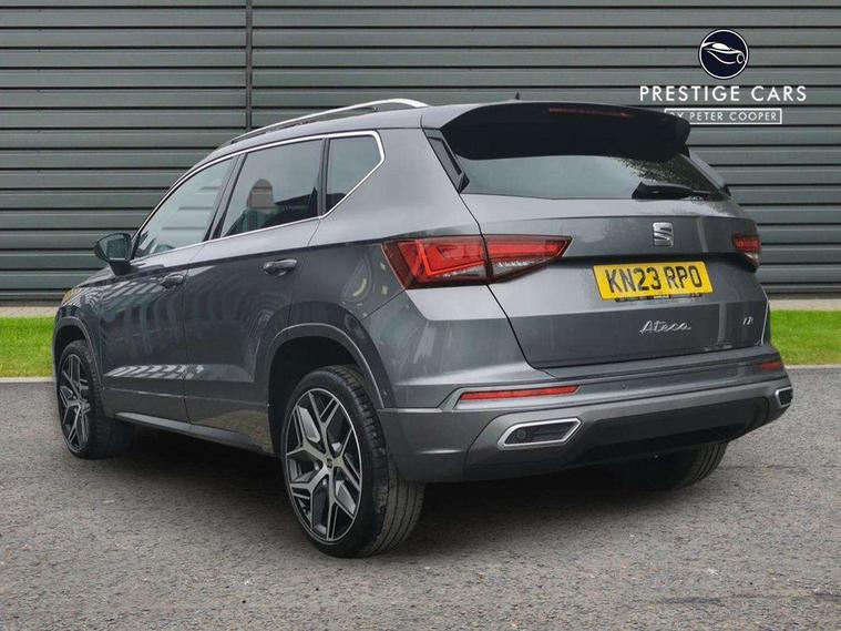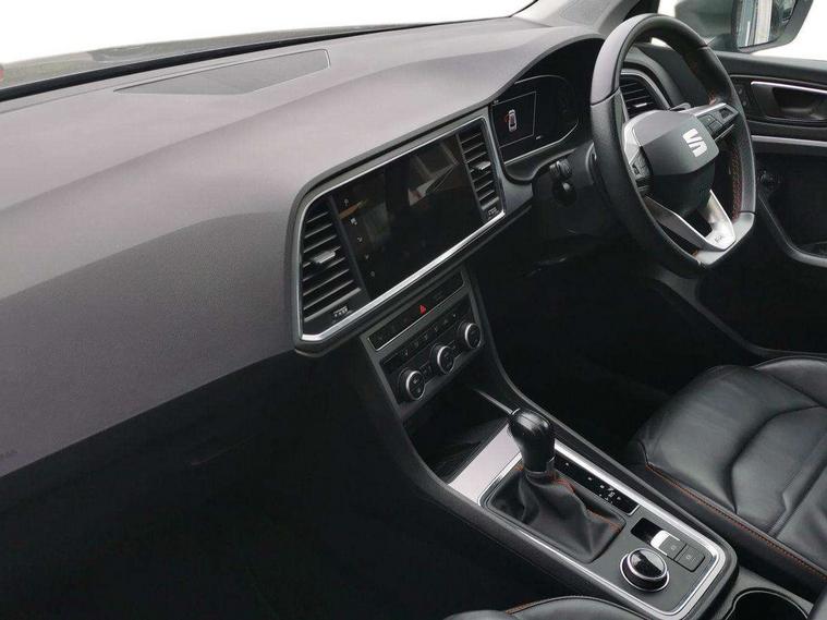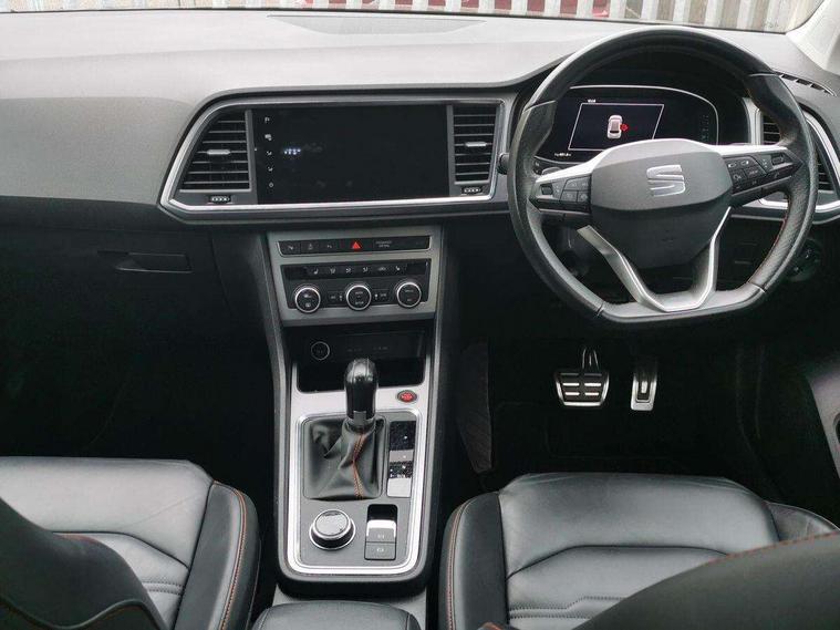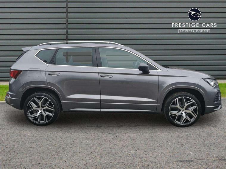 10" Digital cockpit, Cruise control system with speed limiter, E-call, Outside temperature gauge, Progressive power assisted steering, SEAT drive profile with driving experience button - Normal, Sport, Eco and Individual mode, gearshift, steering and throttle response, Self parking functionality (includes front and rear parking sensors), Start/stop system, Tailgate, Trip computer, Wireless full link smartphone integration, Wireless phone charger, Steering wheel mounted audio/phone controls, Body colour bumpers, Body coloured wheel arch surrounds, Chrome front grille frame, Chrome roof rails, Chrome side window trim, Dark tinted rear windows, Daytime running lights, Door mirrors with welcome light silhouette, Dynamic headlight range control with self adjusting whilst driving, Electric adjustable/heated/folding door mirrors, Front and rear electric windows, Full LED headlamps with lens and LED front fog lamps with cornering function, Illuminated aluminium front door sill, LED rear tail lights with dynamic indicators, Rear fog lights, Rear side wing doors, Rear wash/wipe, Roof spoiler, Simulated exhaust pipes in chrome frame, Third brake light, Variable front intermittent wipers, 12v socket in front, 3 seat bench in 2nd row, 60/40 split folding rear seat, Aluminium pedals, Dual zone climate control, Electric adjustable driver seat with lumbar adjustment, Front and rear head restraints, Front centre armrest, Front seat back storage pockets, Heated front seats, Height adjustable passenger seats with lumbar adjustment, ISOFIX points in outer rear seats with top tether anchorage points, Leather steering wheel and gear knob, Leather upholstery with Comfort seats, Rear armrest and easy back seat release mechanism from boot, Single front passenger seat, Steering wheel mounted gearshift paddles, Convenience pack - Ateca, Interior lighting pack - Ateca, Navigation system pack with DAB - Ateca, 3x3 point rear seatbelts, ABS, Traction control system (TCS), Electronic stability control (ESC) and Electronic differential lock system (XDS), Airbags - Driver and front passenger airbag with deactivation, front side, two curtain and driver's knee airbags, Electric parking brake with auto hold function, Front and rear seatbelt reminder, Front assist with autonomous emergency braking, Hill hold control, Manual rear child locks, Single tone horn, Tiredness recognition system, Traction control, Tyre pressure monitoring system, Alarm, Keyless entry, Locking wheel bolts, Remote central locking, Chrome interior detailing, 19" Exclusive machined alloy wheels with decorative inserts 36/7 in cosmo grey,