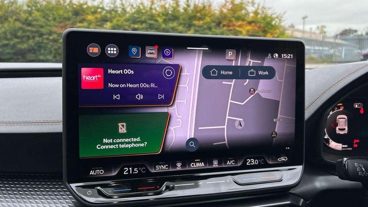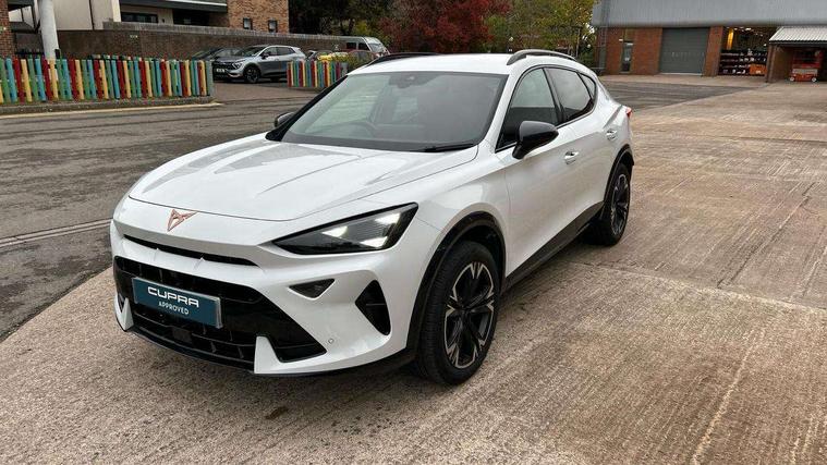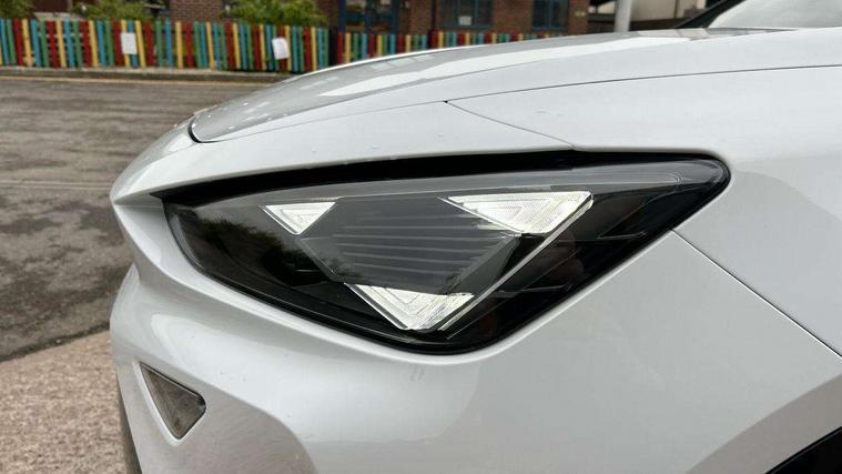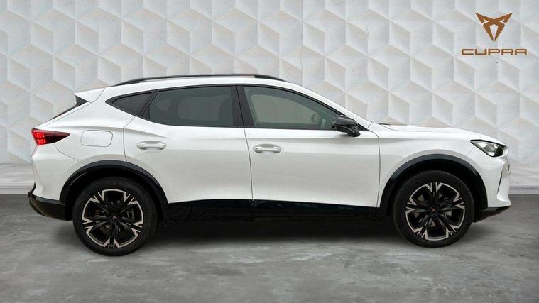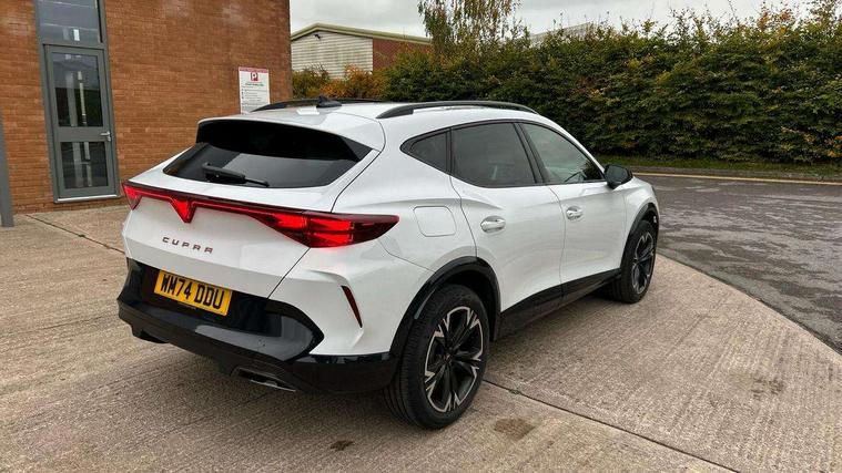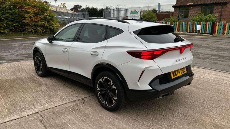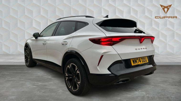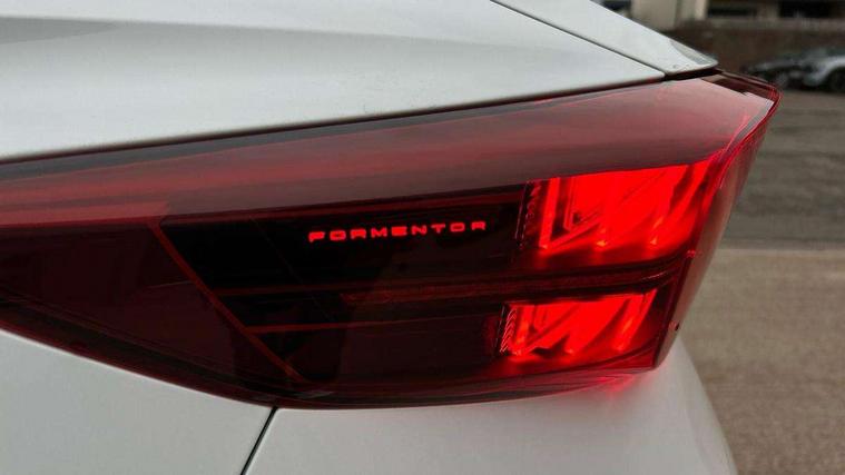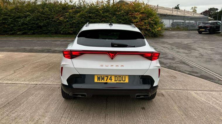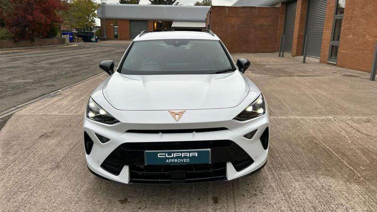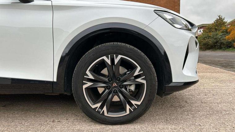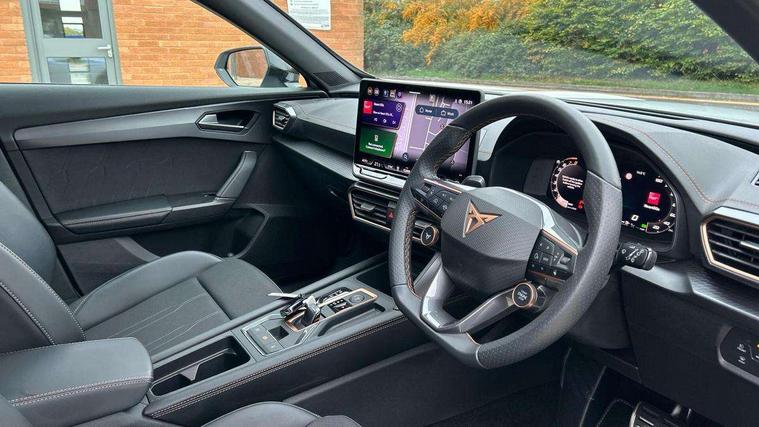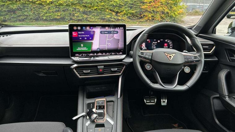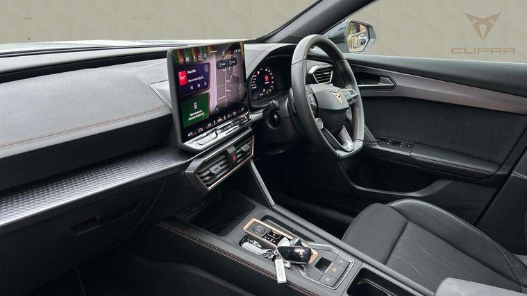 10.25" digital cockpit and configurable dashboard, Adaptive cruise control with follow-to-stop and speed limiter, Advanced driver alert system, Driving profile selection, Dynamic road sign display, Emergency steering support with turn assist, Forward collision warning with automatic braking, Front and rear parking sensors, Full link phone integration, Lane assist, Progressive steering, RPM, trip computer, outside temp gauge, instrument light brightness, low fuel warning light, lights on reminder, gearshift indicator, Service interval indicator, Start/stop system with regenerative braking, Voice control system, Wired Android Auto, Wireless apple carplay, Wireless phone charger, CUPRA sport suspension, Electronic locking differential and dynamic traction support, 2 front and 2 rear USB type C sockets, 7 speakers, Media system with navigation, 12.9" touchscreen display, voice control, DAB, steering wheel mounted controls, Auto dimming rear view mirror, Body colour door handles, Body coloured bumpers, Dark grey wing mirror, Daytime running light with automatic headlight control and coming home feature, Door panel ambient lighting, Dynamic headlight range control, Electric front/rear windows, Electrically adjustable, heated and folding door mirrors, Gloss black roof rails and window surrounds, High beam assist, LED 3rd brake light, LED front fog lamps with cornering function, LED Headlights, LED Taillights with dynamic indicator, Rain sensing wipers, Rear diffuser with black simulated exhaust pipes, Rear fog lights, Rear side wing doors, Rear wash/wipe, Tinted rear windows, Welcome lights (within exterior mirror housing), 12V socket, 2 front and 2 rear reading lights, 3 seat bench in 2nd row, 60/40 split rear bench seat with armrest and mechanical seat release, Black headlining, Black interior roof lining, Cupra sports pedals, Dust/pollen filter, Front and rear head restraints, Front centre armrest, Heated supersports multifunction leather steering wheel with satellite buttons and gear shift paddles, Height/reach adjust steering wheel, Illuminated aluminium doorsteps, Illuminated interior front door sills, Illuminated sunvisor with mirror, Interior ambient lighting, Isofix, Manually adjustable height and lumbar support for front seats, PVC/Cloth upholstery with copper stitching + Sport seats, Satellite steering wheel, Single front passenger seat, Storage pockets on rear of front seats, Three zone climate control with control panel in rear, Variable luggage/load compartment floor, 3 point seatbelts on all rear seats, ABS, Brake control system - ESC and brake booster, Child proof door locks, Driver and front passenger airbags with front passenger airbag de-activation, Electronic parking brake, Front and rear disc brakes, Front side curtain airbags, Hill hold control, Public e-call, Seat belt reminder for front and rear seats, Tyre pressure monitoring system, Anti theft alarm system, Central locking system Keyless Go, Locking wheel bolts, Copper and aluminium interior detailing, 18" Sonora machined silver alloy wheels,