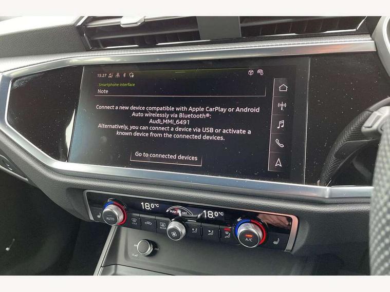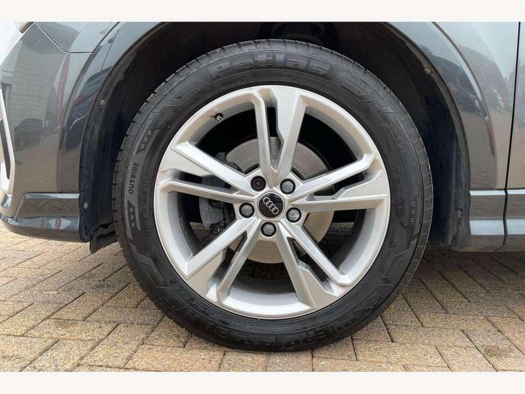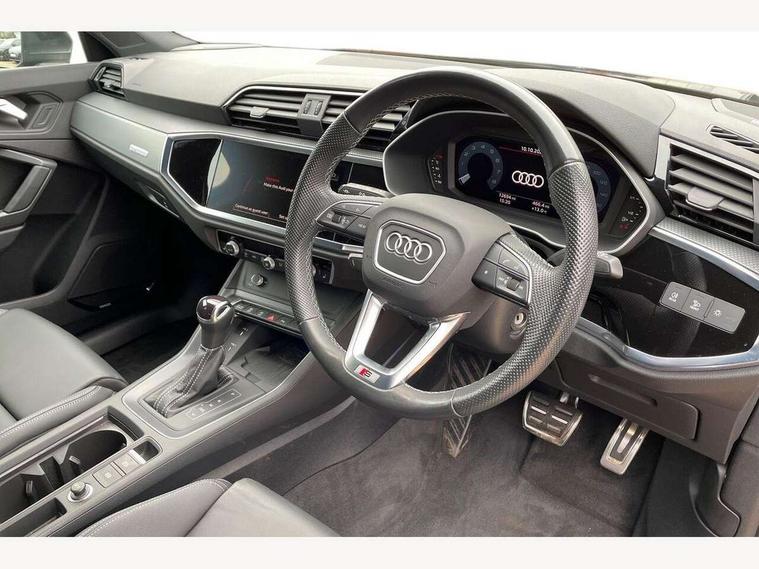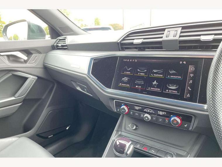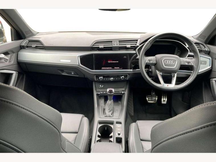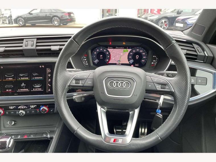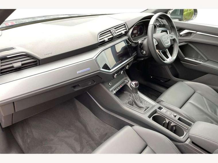 Audi drive select, Audi lane departure warning, Audi Virtual Cockpit - 10.25" display, Bluetooth interface, Camera based traffic sign recognition, Legal emergency call, MMI Navigation Plus with high resolution 10.1 inch touchscreen colour display, Power operated tailgate, Progressive steering, Service interval indicator, Smartphone interface includes wireless Apple carplay/Android Auto, Start stop system with recuperation, Voice control system with natural language interaction, Sports suspension, 2 USB-C ports with charge and data functions, 6 passive loudspeakers, DAB digital radio module, Acoustic windscreen, Aluminium window trim, Auto dimming frameless rear view mirror, Diffuser grille in grained matt black, Diffuser trim in selenite silver, Electrically folding, adjustable and heated door mirrors with integrated LED side indicators and kerb view function for passenger side, Front and rear electric windows, Front fog lights, Front side air inlets in selenite silver, Front underbody protection in manhattan grey paint finish, Grille surround in aluminium silver matt, High gloss black finish B and C pillars, LED Dynamic rear indicators, LED headlights with LED daytime running lights, LED rear lights, LED third brake light, Privacy glass dark tinted rear and rear-side windows (from B-pillar backwards), Radiator grille in anthracite black with inlay in matt aluminium silver, Rain and light sensors, Rear side wing doors, Rear underbody protection in matt black, Rear wiper, S line badges on front wings, S line front and rear bumpers and side skirts in contrasting Manhattan grey paint finish, Side skirt insert in matt Platinium grey, Variable front intermittent wipers, 12V socket in rear centre console, 3 seat bench in 2nd row, 3 spoke leather multifunction steering wheel features S badging and grips in perforated leather with contrast stitching, 40:20:40 folding with manual adjustment for 60:40 forwards/backwards position and backrest angle, Adjustable rear seat bench/backrest with centre armrest and cupholder, Black cloth headlining, Dual zone electronic climate control, Front and rear black floor mats with contrast stitching, Front and rear headrests, Front and rear roof module including reading lights, Front centre armrest, Glove compartment lighting, Height and reach adjustable steering wheel, Illuminated door sill trims with S logo, ISOFIX child seat mounting for front passenger with airbag deactivation and outer rear seat including top tether attachment point for outer rear seats, Luggage compartment light right in white, Luggage compartment sill protection in stainless steel, Manual front seats with height adjustment, Perforated leather gearknob, Single front passenger seat, Stainless steel pedals, Ambient lighting pack - Q3, Non smoking pack - Q3, 3x3 point rear seatbelts, 6 airbags - Driver, front passenger, curtain and side windows, Audi pre-sense front with pedestrain and cyclist recognition, Electrically operated child locks on rear doors, Electromechanical parking brake, Electronic stabilisation control including ABS, ASR and EDL, Front seatbelt reminder, Hill descent control, Hill hold assist, Pre sense basic, Seatbelt monitoring, Tyre pressure warning, Warning triangle and first aid kit, Anti theft alarm, Anti theft wheel bolts, Immobiliser, Remote central locking, Aluminium look interior elements, Black dashboard, Dark matt brushed aluminium inlay, Detail dashboard around MMI touch colour display in glass look, black with surround in aluminium look, Leatherette door armrest,