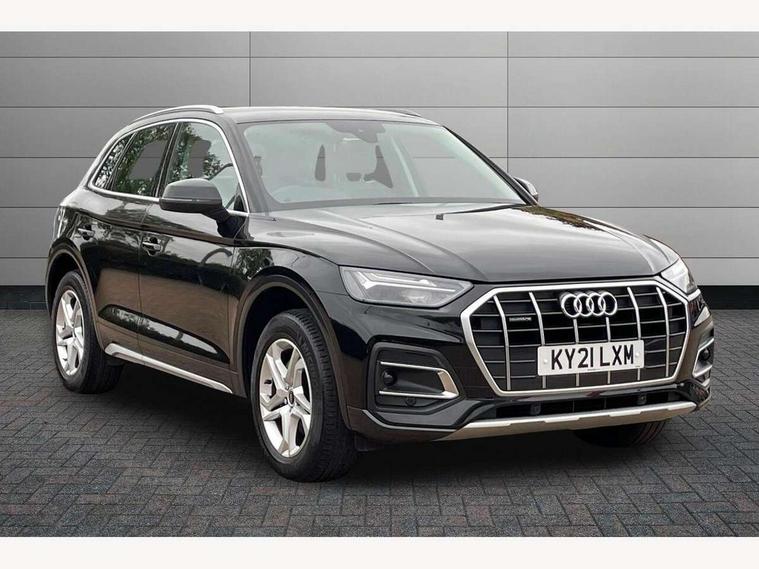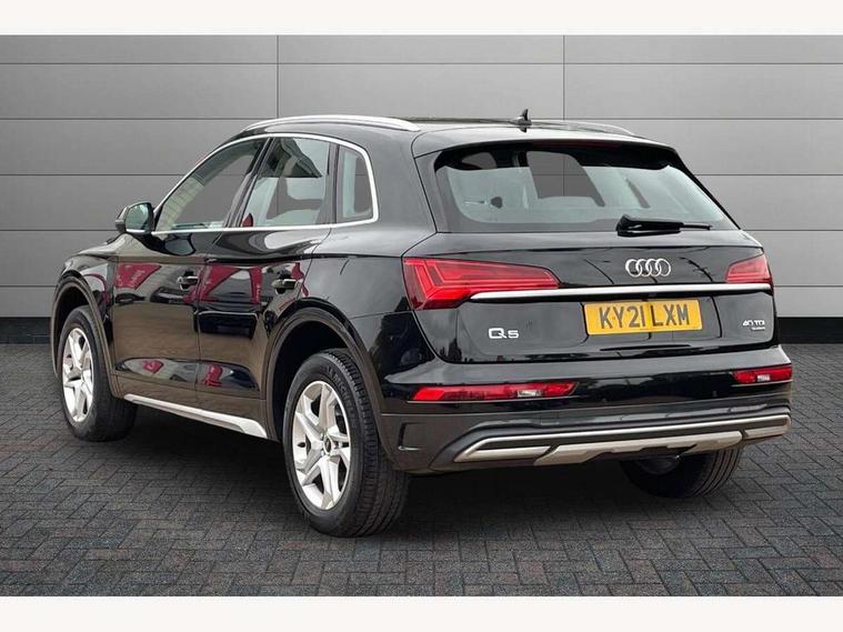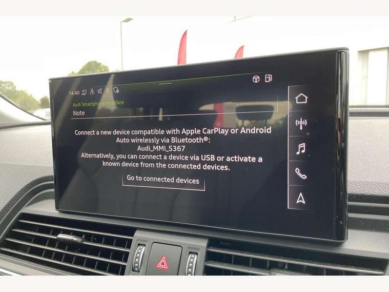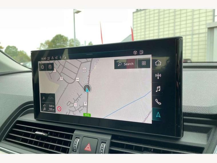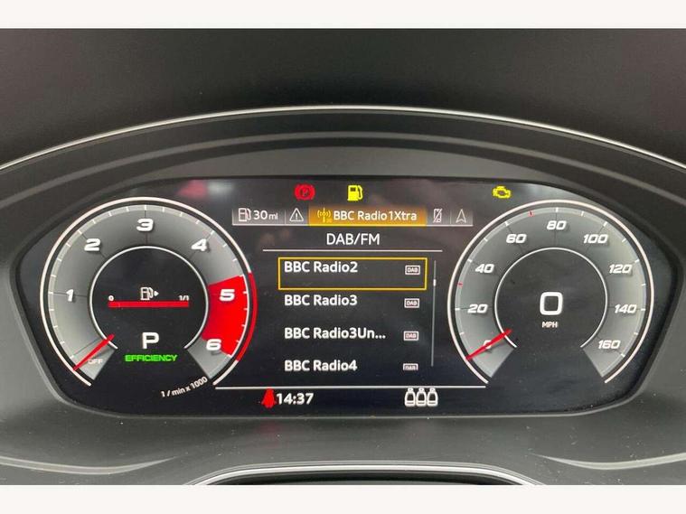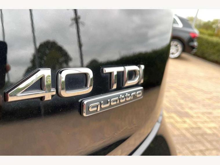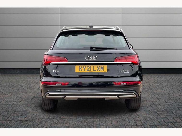 Acoustic front and rear parking sensor, Amazon alexa Integration, Audi connect safety and service (e-call), Audi drive select, Audi virtual cockpit plus with 12.3" screen and three different layout designs, Audi wireless smartphone interface, Automatic start-stop system with coasting functionality and efficiency programme, Cruise control + speed limiter, Electro - mechanical power assisted steering, MMI navigation plus with 10.1" touch screen, Mobile telephone preparation - bluetooth interface, Power tailgate, Reversing camera, Service interval indicator, Voice control system with Audi hotword activation "Hey Audi", Diesel particulate filter, Dynamic suspension, Quattro on demand, 2 USB charging ports, DAB Digital radio, Acoustic windscreen, Air inlets in matt titanium black with blades in matt aluminium silver, Aluminium roof rails, Auto dimming rear view mirror, Automatic headlight adjustment, Automatic headlights and windscreen wipers, Body colour bumpers, Body colour door mirrors, Chrome plated exhaust trims, Door sills in Selenite silver, Electric adjustable/heated/folding door mirrors, Front and rear electric windows, LED headlights and LED tail lights, Lower bumpers painted in contrast Manhattan grey, Matt selenite silver underbody protection, Matt twilight grey radiator grille with chrome vertical struts, Rear chrome trim strip below lights, Rear diffuser strip in selenite silver, Rear spoiler, Rear wiper, Roof bars, 3 rear headrests, 3 spoke multifunction leather steering wheel with shift paddles, 40:20:40 split folding rear seat with rear centre armrest, Deluxe 3 zone electronic climate control, Door sills trims with aluminium inlays, Front centre armrest, Front/rear floor mats, Heated front seats, Height adjustable front head restraints, Height/reach adjustable steering column, ISOFIX child seat mounting and top tether, Manual seat adjustment with 4-way electric lumbar support, Removable luggage compartment floor, Silver cloth headlining, Sunvisors with vanity mirrors, Tool kit, Trunk roller cover, Twin leather upholstery + front sports seats, High gloss pack - Q5, LED interior light pack - Q5, 3 point seatbelts on all seats, 6 airbags - Driver, front passenger, curtain and side airbags, Electrically operated child locks on rear doors, Electromechanical parking brake, Electronic stabilisation control including ABS, ASR and EDL, Front passenger airbag deactivation, Hill descent control, Hill hold assist, Multi collision brake assist, Pop-up bonnet for pedestrian protection, Pre sense city, Seat belt force limiter, Seatbelt monitoring, Tyre pressure warning, Warning triangle and first aid kit, Anti theft alarm, Anti-theft wheel bolts, Keyless Go access/ignition system, Aluminium rhombus inlay,