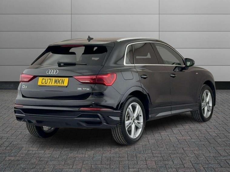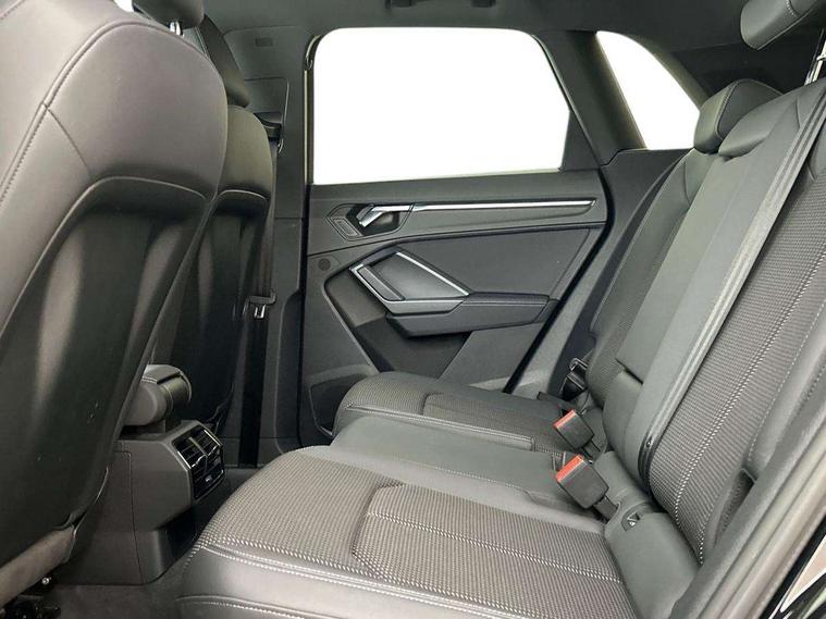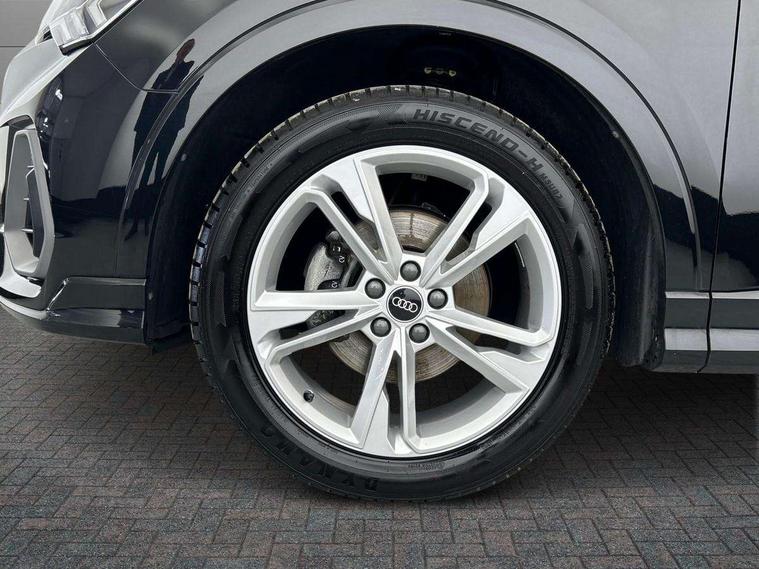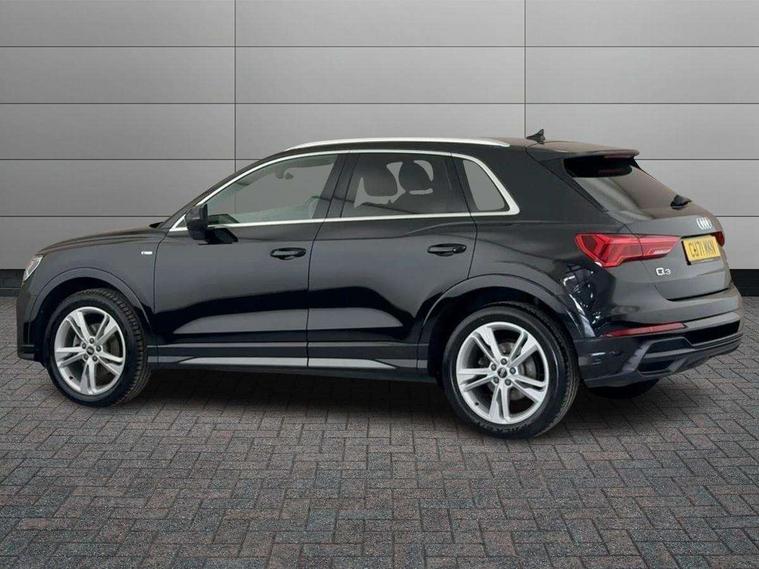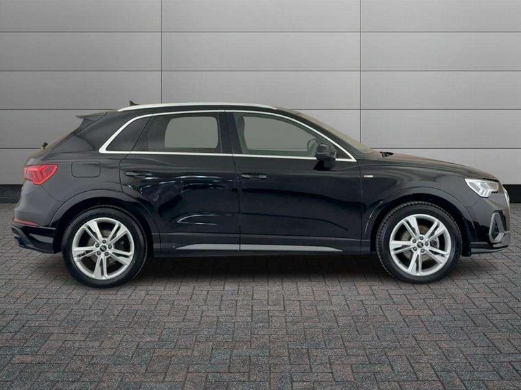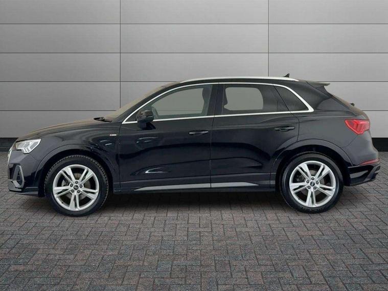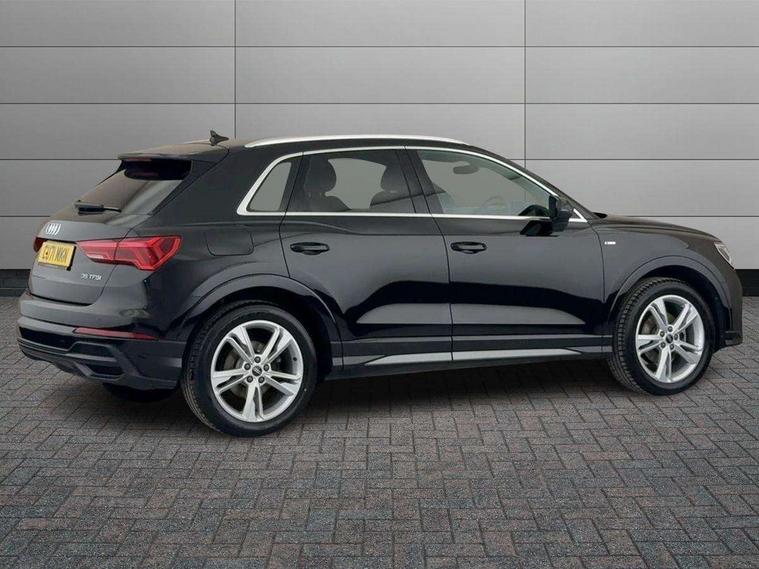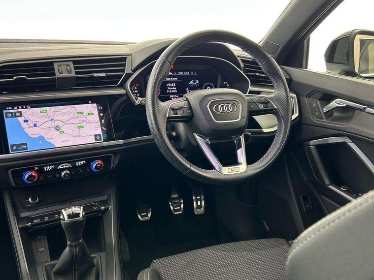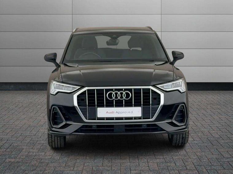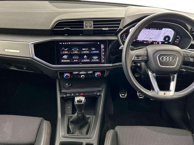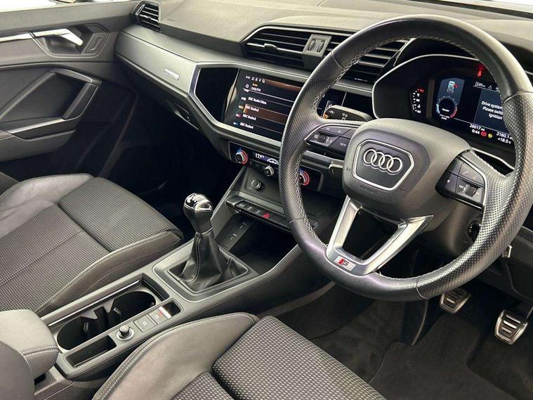 Amazon alexa Integration, Audi connect safety and service (e-call), Audi drive select, Audi lane departure warning, Audi Virtual Cockpit - 10.25" display, Bluetooth interface, Camera based traffic sign recognition, Cruise control + speed limiter, MMI Navigation Plus with high resolution 10.1 inch touchscreen colour display, Power operated tailgate, Progressive steering, Rear parking sensors, Service interval indicator, Smartphone interface includes wireless Apple carplay/Android Auto, Start stop system with recuperation, Voice control system with natural language interaction, Sports suspension, 2 USB-C ports with charge and data functions, 6 passive loudspeakers, DAB digital radio module, Acoustic windscreen, Aluminium roof rails, Aluminium window trim, Auto dimming frameless rear view mirror, Body coloured bumpers, Electrically folding, adjustable and heated door mirrors with integrated LED side indicators and kerb view function for passenger side, Front and rear electric windows, Front fog lights, Front side air inlets in matt platinum grey, Front spoiler blade in matt platinum grey, Grille vertical bars in aluminium silver/Matt, High gloss black finish B and C pillars, LED headlights with LED daytime running lights and dynamic rear indicator, LED rear lights, Privacy glass dark tinted rear and rear-side windows (from B-pillar backwards), Rain and light sensors, Rear diffuser strip in matt titanium black, S line badges on front wings, S Line front and rear bumpers, Side skirt insert in matt Platinium grey, Silver chrome grille surround, Titanium black radiator grille, 12V socket in rear centre console, 40:20:40 folding with manual adjustment for 60:40 forwards/backwards position and backrest angle, Adjustable rear seat bench/backrest with centre armrest and cupholder, Black cloth headlining, Dual zone electronic climate control, Front and rear black floor mats with contrast stitching in rock grey, Front and rear headrests, Front and rear roof module including reading lights, Front centre armrest, Glove compartment lighting, Height and reach adjustable steering wheel, Illuminated door sill trims with S logo, ISOFIX child seat mounting for front passenger with airbag deactivation and outer rear seat including top tether attachment point for outer rear seats, Luggage compartment light, Manual front seats with height adjustment, Perforated leather gearknob, Stainless steel luggage compartment sill finisher, Stainless steel pedals, Non smoking pack - Q3, 3x3 point rear seatbelts, 6 airbags - Driver, front passenger, curtain and side windows, Audi pre-sense front with pedestrain and cyclist recognition, Electrically operated child locks on rear doors, Electromechanical parking brake, Electronic stabilisation control including ABS, ASR and EDL, Hill descent control, Hill hold assist, Pre sense basic, Seatbelt monitoring, Tyre pressure warning, Warning triangle and first aid kit, Anti theft alarm, Anti theft wheel bolts, Remote central locking, Dark matt brushed aluminium inlay, Detail dashboard around MMI touch colour display in glass look, black with surround in aluminium look, Leatherette door armrest,