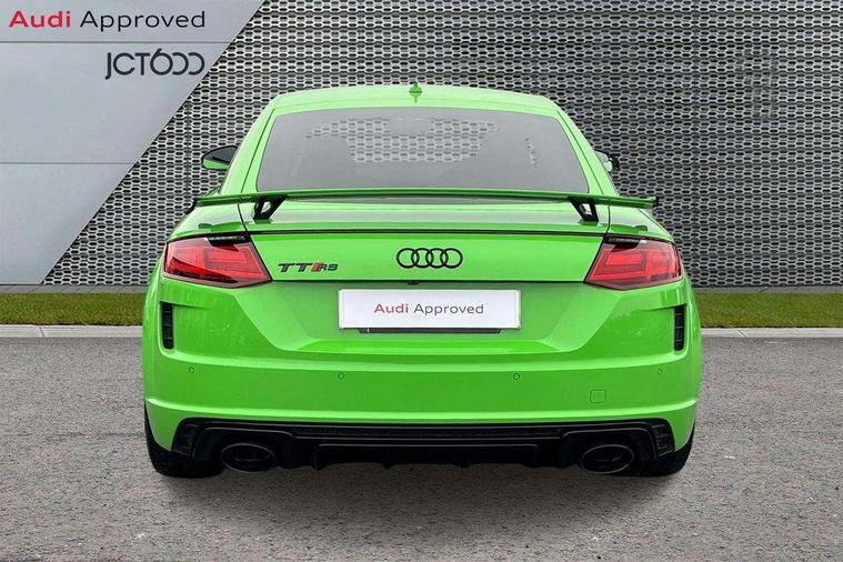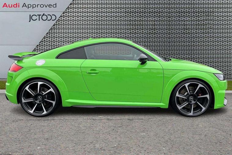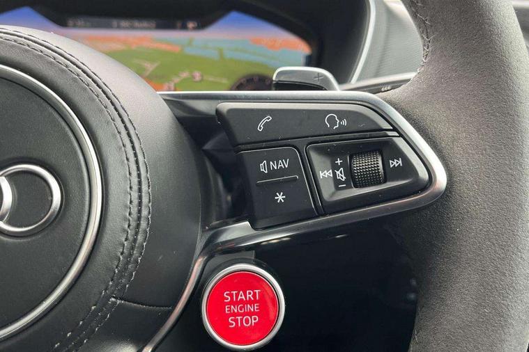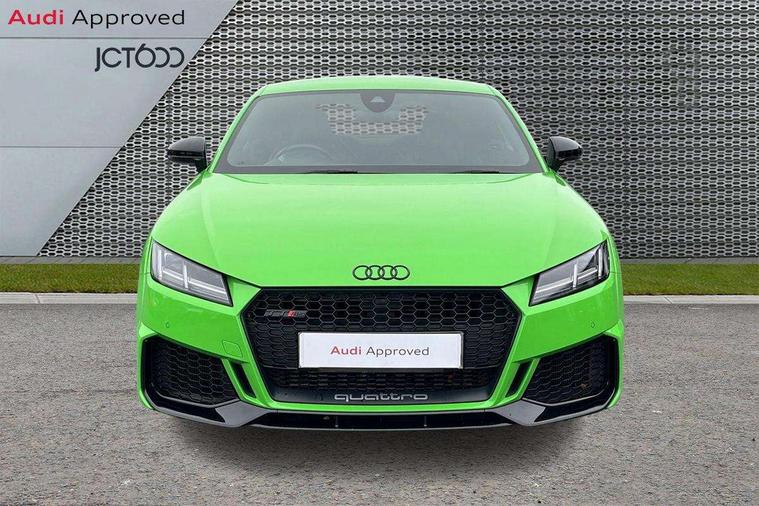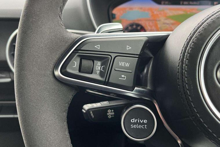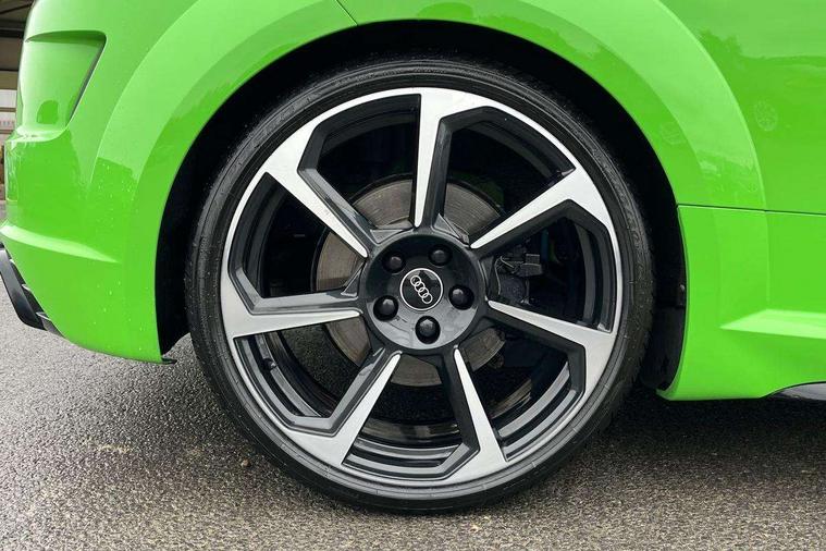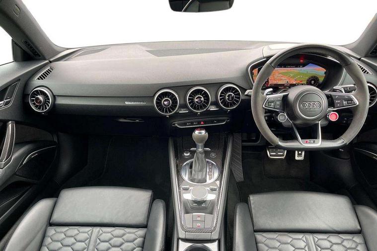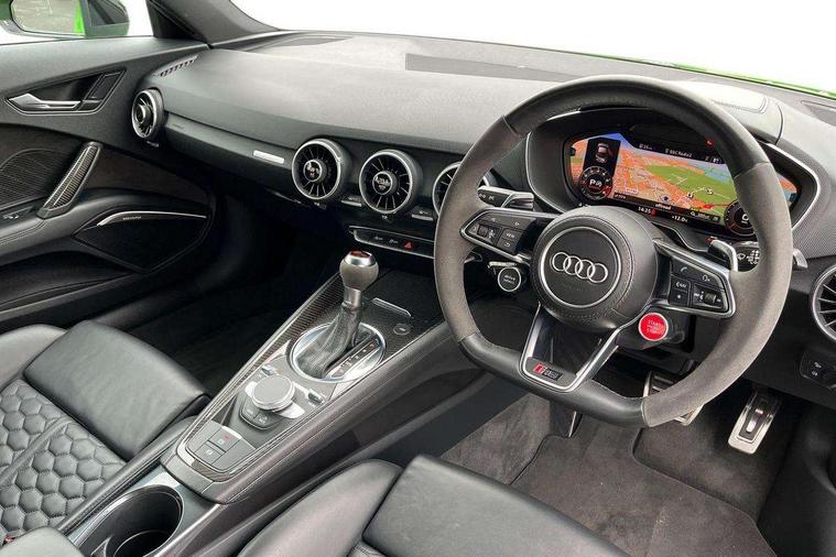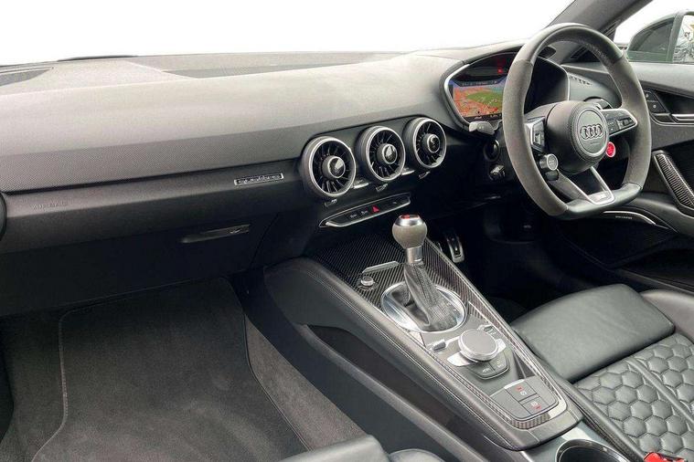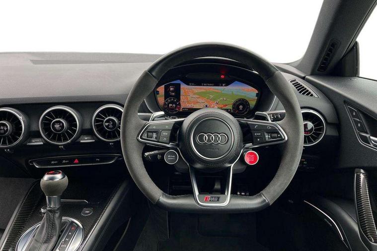 Audi drive select, Audi parking system plus with front and rear sensors, Audi smartphone interface, Audi virtual cockpit with RS specific with 12.3" full colour digital cluster, 3D navi, info, MMI functionalities, RS specific menu + g force indicator, Cruise control + speed limiter, Mobile phone preparation with bluetooth interface, Progressive power assisted steering, Service interval indicator, Start/Stop system with energy recuperation, TP memo, TT RS specification sports suspension, Audi sound system, Auxiliary input socket, Bluetooth audio streaming, DAB Digital radio, MMI Radio with CD player and SD/XC card slot, Online medta streaming, All weather LED headlights, Auto dimming rear view mirror, Auto headlight range control, Black door mirrors, Electric front windows, Electrically adjustable, foldable and heated auto dimming on driver side and automatic kerb view dipping function on the passenger side, Front spoiler, Green tinted heat insulating glass, High beam assist, LED daytime running lights, LED Dynamic rear indicators, LED rear lights, Light and rain sensors, Privacy glass, RS design body styling, RS sport exhaust system, Sunband for windscreen, TTRS fixed rear wing, Twin oval tailpipes, 3 spoke alcantara sports leather multifunction plus steering wheel, Black headlining, Coloured interior elements in slate grey on the side of seat, sides of the centre console and air vents, Deluxe auto air conditioning with integrated digital display, Door sill trims with aluminium inlays and TTRS logo, Front centre armrest, Front passenger seat isofix location point, Heated front seats, Height adjustable front head restraints, Height/reach adjust steering wheel, ISOFIX child seat mounting for front passenger seat with airbag deactivation, Rear head restraints, Rear top tether child seat ISOFIX attachment, RS Gear lever knob in alcantara, Split folding rear seat, Stainless steel pedals and footrest, Tool kit, TTRS badge on the steering wheel, TTRS exhaust sound button in centre console, Black styling pack - TT RS Sport, Extended leather package - TT RS, LED interior light pack - TT/TT RS, Non smoking pack - TT/TT RS, Technology pack - TT with MMI Navigation, 3 point front seat belts, Curtain airbags, Driver and front passenger airbag with front passenger airbag deactivation, Electromechanical parking brake, Electronic stabilisation control (ESC) with Sport mode, including ABS, ASR, EBD and EDL, ESP, First aid kit, Front side airbags, Head airbags, Hill hold assist, RS brake system, Seatbelt warning, Warning triangle, Anti theft alarm, Anti theft wheel bolts, Immobiliser, Keyless Go, Remote central locking, Carbon inlays, 20" 7-spoke rotor design alloy wheels in gloss anthracite black, diamond cut finish, Tyre repair kit,