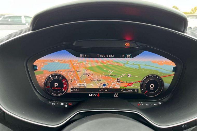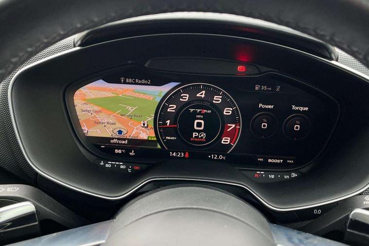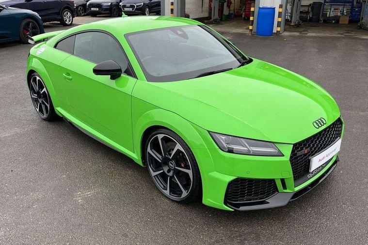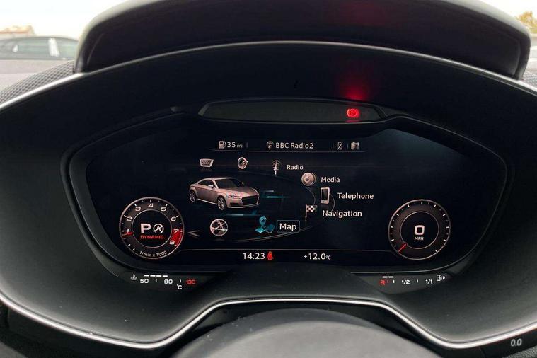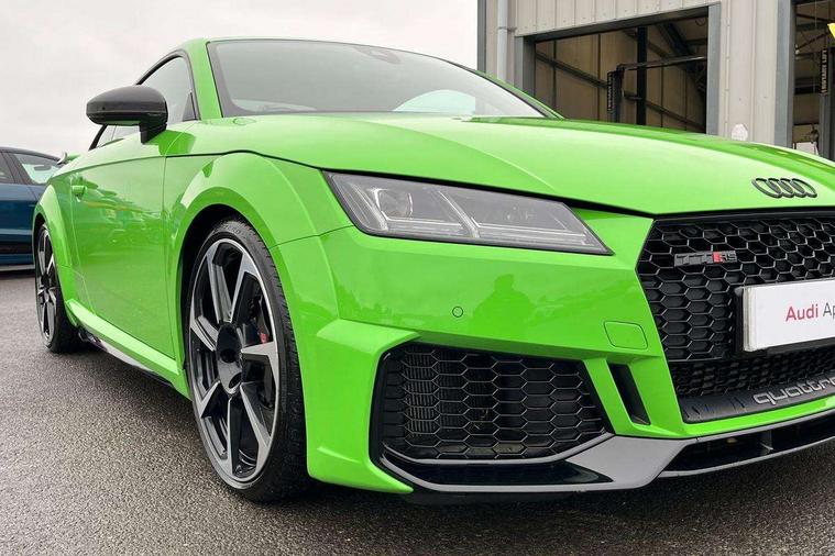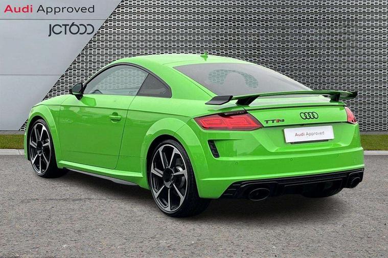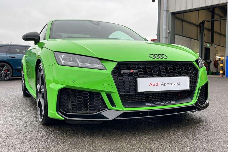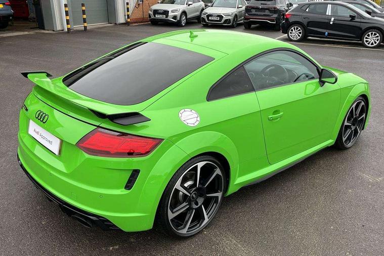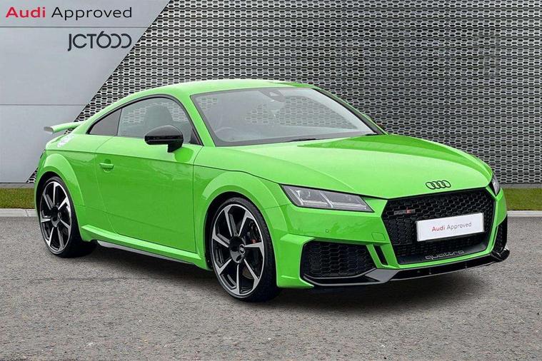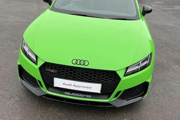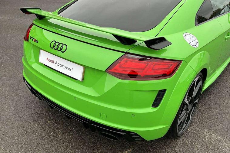 Audi drive select, Audi parking system plus with front and rear sensors, Audi smartphone interface, Audi virtual cockpit with RS specific with 12.3" full colour digital cluster, 3D navi, info, MMI functionalities, RS specific menu + g force indicator, Cruise control + speed limiter, Mobile phone preparation with bluetooth interface, Progressive power assisted steering, Service interval indicator, Start/Stop system with energy recuperation, TP memo, TT RS specification sports suspension, Audi sound system, Auxiliary input socket, Bluetooth audio streaming, DAB Digital radio, MMI Radio with CD player and SD/XC card slot, Online medta streaming, All weather LED headlights, Auto dimming rear view mirror, Auto headlight range control, Black door mirrors, Electric front windows, Electrically adjustable, foldable and heated auto dimming on driver side and automatic kerb view dipping function on the passenger side, Front spoiler, Green tinted heat insulating glass, High beam assist, LED daytime running lights, LED Dynamic rear indicators, LED rear lights, Light and rain sensors, Privacy glass, RS design body styling, RS sport exhaust system, Sunband for windscreen, TTRS fixed rear wing, Twin oval tailpipes, 3 spoke alcantara sports leather multifunction plus steering wheel, Black headlining, Coloured interior elements in slate grey on the side of seat, sides of the centre console and air vents, Deluxe auto air conditioning with integrated digital display, Door sill trims with aluminium inlays and TTRS logo, Front centre armrest, Front passenger seat isofix location point, Heated front seats, Height adjustable front head restraints, Height/reach adjust steering wheel, ISOFIX child seat mounting for front passenger seat with airbag deactivation, Rear head restraints, Rear top tether child seat ISOFIX attachment, RS Gear lever knob in alcantara, Split folding rear seat, Stainless steel pedals and footrest, Tool kit, TTRS badge on the steering wheel, TTRS exhaust sound button in centre console, Black styling pack - TT RS Sport, Extended leather package - TT RS, LED interior light pack - TT/TT RS, Non smoking pack - TT/TT RS, Technology pack - TT with MMI Navigation, 3 point front seat belts, Curtain airbags, Driver and front passenger airbag with front passenger airbag deactivation, Electromechanical parking brake, Electronic stabilisation control (ESC) with Sport mode, including ABS, ASR, EBD and EDL, ESP, First aid kit, Front side airbags, Head airbags, Hill hold assist, RS brake system, Seatbelt warning, Warning triangle, Anti theft alarm, Anti theft wheel bolts, Immobiliser, Keyless Go, Remote central locking, Carbon inlays, 20" 7-spoke rotor design alloy wheels in gloss anthracite black, diamond cut finish, Tyre repair kit,