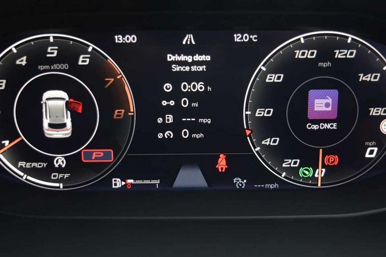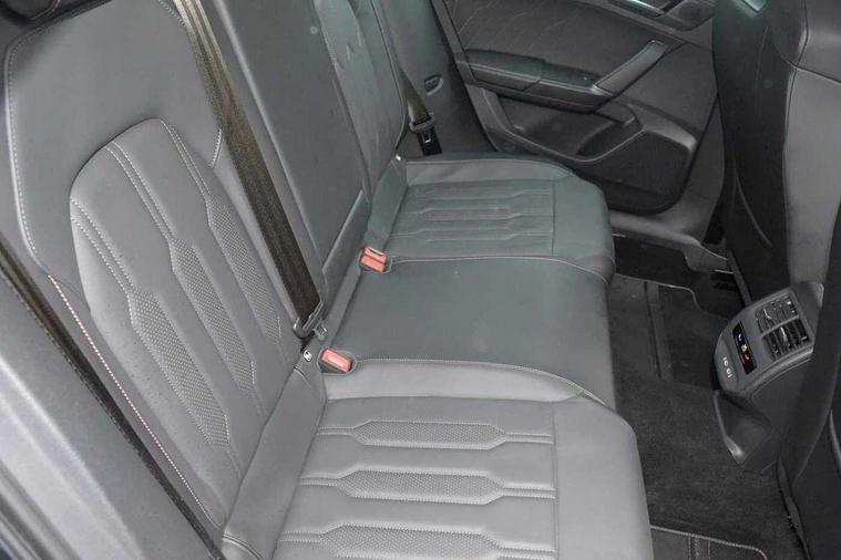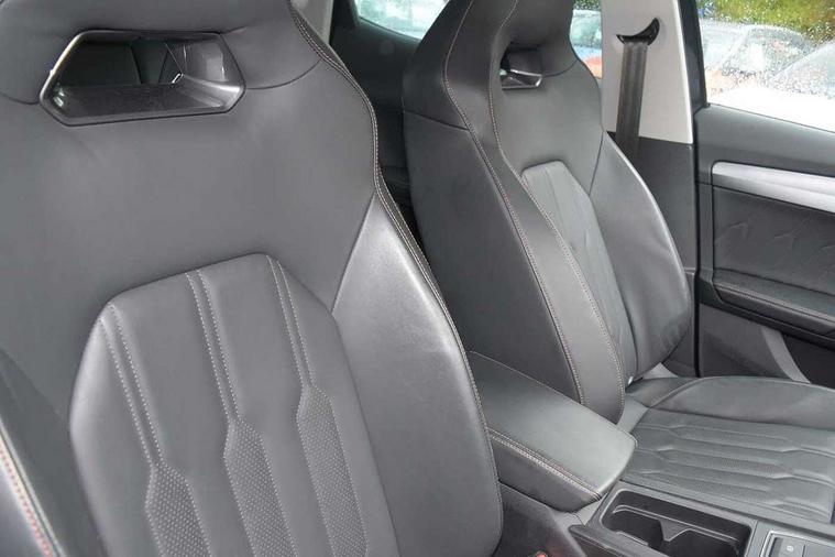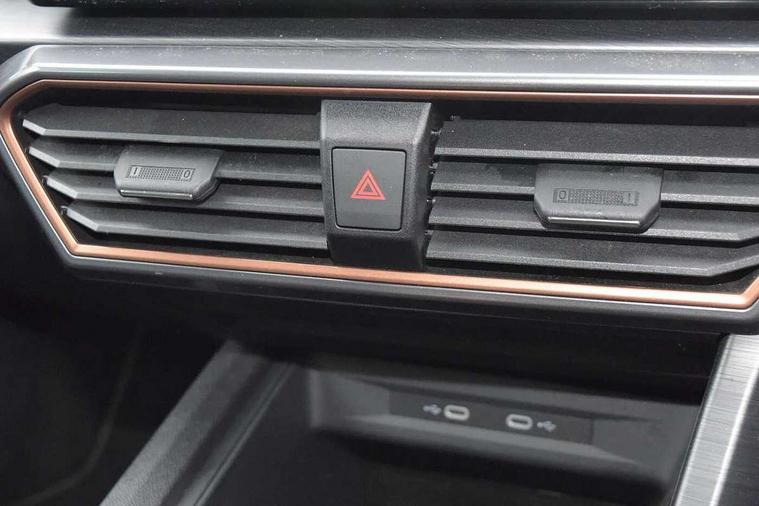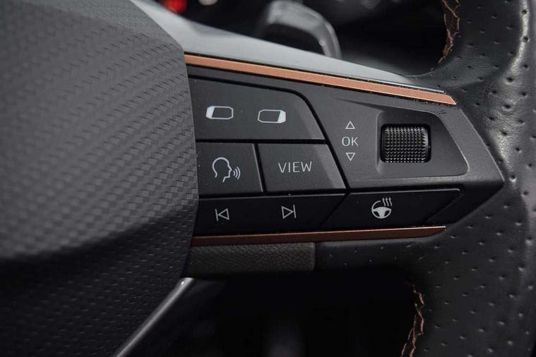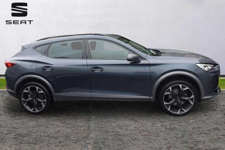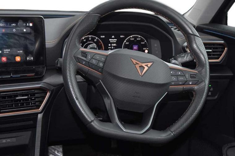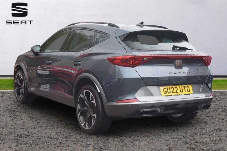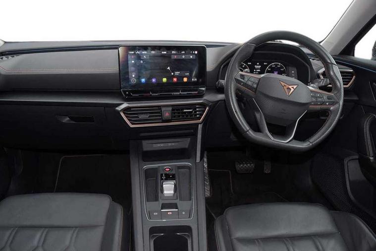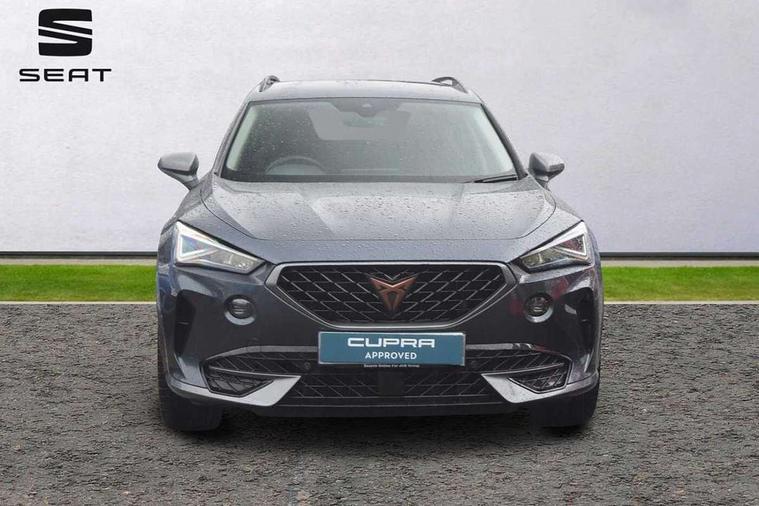 Digital cockpit and configurable dashboard, Driver alert system, Driving profile selection, E-call, Forward collision warning with automatic braking, Lane assist, Park assist (inc front/rear parking sensors), PAS, Predictive adaptive cruise control with speed limiter, Rear view camera, RPM, trip computer, outside temp gauge, instrument light brightness, low fuel warning light, lights on reminder, gearshift indicator, Service interval indicator, Start/stop system with regenerative braking, Wireless apple carplay, Wireless phone charger, Electronic locking differential and dynamic traction support, Standard suspension, 2 front and 2 rear USB type C sockets, Auxiliary input socket, DAB radio, Auto dimming rear view mirror, Body colour door handles, Body coloured bumpers, Dark grey wing mirror, Daytime running light with automatic headlight control and coming home feature, Dynamic headlight range control, Electric front/rear windows, Electrically adjustable heated and folding door mirrors with memory function, Front fog lamps with cornering function, Gloss black roof rails and window surrounds, LED Headlights, LED Taillights with dynamic indicator, Rain sensing wipers, Rear diffuser with black simulated exhaust pipes, Rear side wing doors, Rear wash/wipe, Third brake light, Tinted rear windows, Welcome lights, 12v power supply in centre console, 12V socket, 12v socket in loadspace, 2 front and 2 rear reading lights, 230V socket, 3 seat bench in 2nd row, 60/40 split rear bench seat with armrest and mechanical seat release, Dust/pollen filter, Front and rear head restraints, Front centre armrest, Height/reach adjust steering wheel, Illuminated interior front door sills, Illuminated sunvisor with mirror, Isofix, Leather multi function heated steering wheel with gear shift paddles, Luggage tie-down hooks, Single front passenger seat, Three zone climate control with control panel in rear, Variable luggage/load compartment floor, Wraparound lighting, Genuine Nappa leather Pack - Cupra, Navigation system pack with 10" navigation system - Formentor, 3 point seatbelts on all rear seats, ABS, Brake control system - ESC and brake booster, Child proof door locks, Driver and front passenger airbags with front passenger airbag de-activation, Electronic parking brake, Front and rear disc brakes, Front side curtain airbags, Hill hold control, Seat belt reminder for front and rear seats, Tyre pressure monitoring system, Anti theft alarm system, Keyless entry and start system (KESSY), Locking wheel bolts, Copper and aluminium interior detailing, 19" 'Exclusive' machined sport matte black and silver alloy wheels,