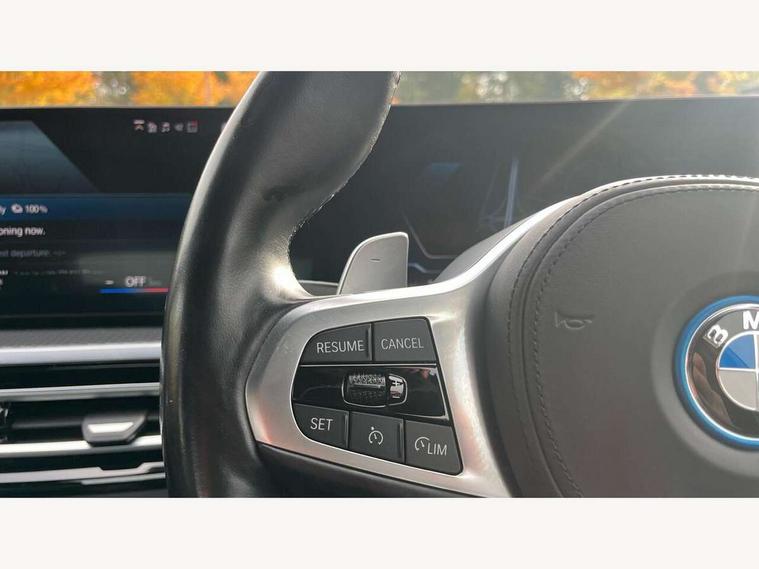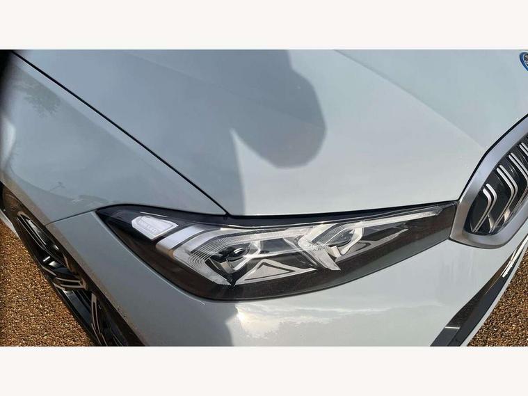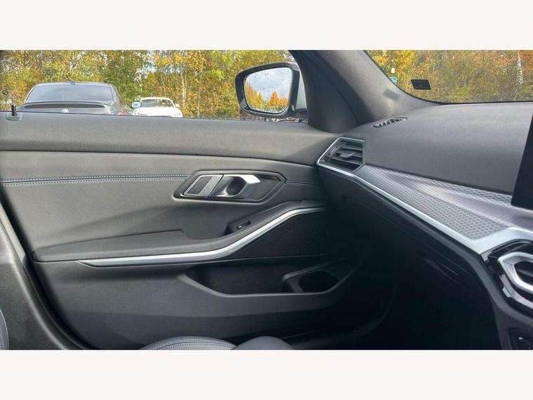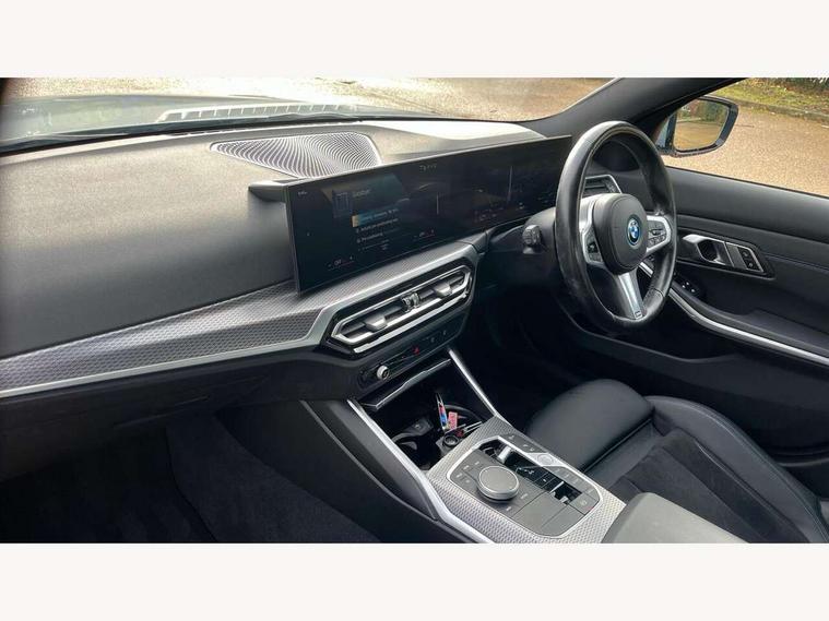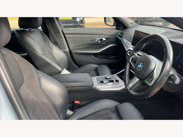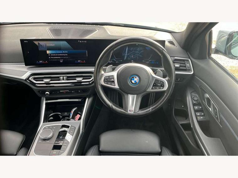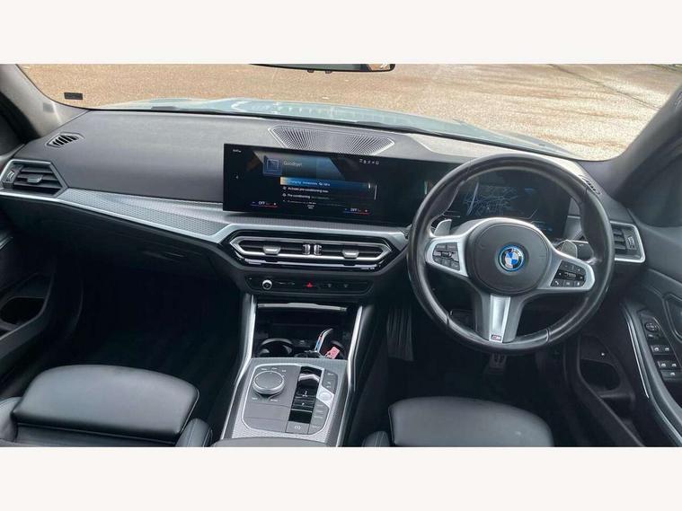 Active guard plus, Attentiveness assist, Automatic Start/stop button, BMW iDrive, BMW Teleservices, Condition based service, ConnectedDrive Services, Driving experience switch, Live cockpit plus with Navigation + 12.3" instrument display + 14.9" display, Intelligent voice assist, 2 USB, 4G LTE connect, Oil sensor for level and grade, PAS, Preparation for driver assistance, Shifting point display, Smartphone integration, Charging cable - Mode 2, Double joint spring strut front axle, Fuel tank breather system, Sport automatic transmission with steering-wheel mounted gearshift paddles and launch control, Standard suspension, DAB tuner, "Electrified by i" exterior badging on charging flap, 3rd brake light, Acoustic glazing, Auto dimming rear view mirror, Automatic headlight beam throw control with load dependent regulating reaction, dynamic compensation of braking dive and acceleration squat, BMW emblem, engine compartment lid and tailgate, Body colour roof fin, Door sill strips, Electric windows - front and rear, with open/close fingertip control, anti-trap facility and comfort closing, Follow me home headlight function, Front and rear bumper system with replaceable deformation elements, Front apron plastic in body colour, Fuel filler flap - right rear in body colour, Heated washer jets, Illuminated bow type door handles in body colour drivers side with door lock, Interior rear view electrochromatic mirror with automatic anti dazzle function, LED headlights with LED daytime running lights and LED turn indicator, LED rear lights, Licence plate panel integrated into front bumper and tailgate, Matt black B-pillar finsher, Matt black window recess cover, Model designation on right side of tailgate, One piece front bumper cover including towing eye cover in body colour, Rain sensor with automatic headlight activation, Rear boot, Rear side wing doors, Reversing lights, Side frame decorative moulding black matt, Visible exhaust tailpipe finisher, Welcome lights in interior and door handle area, 12V power socket in front storage compartment, 2 front cupholder in centre console with clamping elements and matt black inlay, 3 seat bench in 2nd row, 3 zone automatic air conditioning, 40:20:40 split folding rear seat with loading system, Anthracite headlining, Armrest integrated in front and rear door trim + front centre console armrest, Battery in luggage compartment, BMW ID, Cruise control operation in steering wheel, Driver backrest width adjustment, Folding rear centre armrest with 2 cupholders, Front and rear door exit lighting (left / right), Front and rear footwell lighting, Front and rear headrests, Front and rear reading lights, Front and rear velour floor mats, Front sport seats, Heated front seats, Height adjustable mechanically and infinitely variable steering column, Illuminated armrest storage compartment, Illuminated glove compartment, Illuminated luggage compartment, Lashing eyelets in luggage compartment, LED ambient lighting with welcome carpet light, M Sport multifunction leather steering wheel, Make-up mirror lights, Single front passenger seat, Standard seat for driver and passenger with manual adjustment, Sunvisors with vanity mirrors and ticket pocket, Toolkit located in luggage compartment, Connected pack professional - 3 Series Saloon/Touring, Interior and exterior mirror pack - 3 Series Touring/Saloon, M Aerodynamics package - 3 Series Saloon/Touring, M sport exterior styling pack - 3 Series Saloon/Touring, Storage compartment pack - 3 Series Saloon/Touring, 3x3 point rear seatbelts, BMW emergency call, Child locks on rear doors, Crash sensor activating of airbags, Unlocking doors, hazard warning lights, interior light, safety battery terminal, Driver and front passenger with seat occupancy detection for driver's and passenger side, Driver and passenger side airbags, body protection at side and airbags deploy from seat backrests, Dynamic brake control, Dynamic stability control + (DSC+) - Anti-lock Braking System (ABS) with brake assist and cornering brake control + Automatic Stability Control (ASC), Dynamic Traction Control - DTC, Electric parking brake including automatic hold function and automatic release of the parking brake when driving off, Electronic differential lock control (EDLC), Head airbags in 1st and 2nd row, head protection at side, curtain airbags open from headliner above 1st and 2nd row, Side impact protection, Tyre pressure monitoring with three level warning strategy, Ventilated front and rear disc brakes, Warning triangle and first aid kit, Alarm system, Centre lock switch, Closing system with central locking, Electronic vehicle immobiliser,