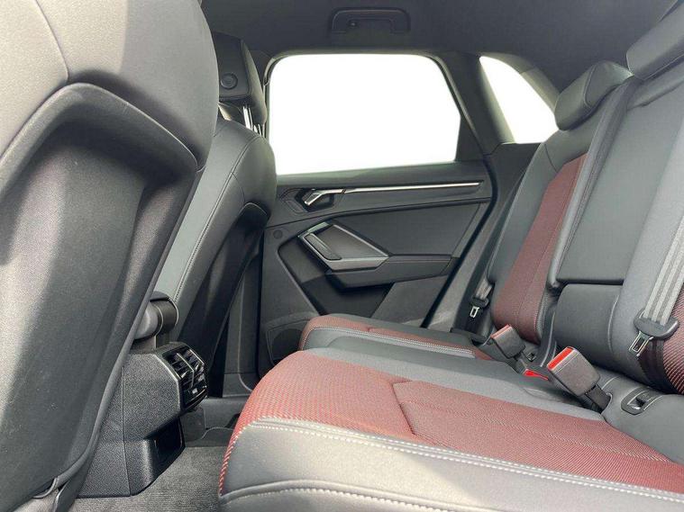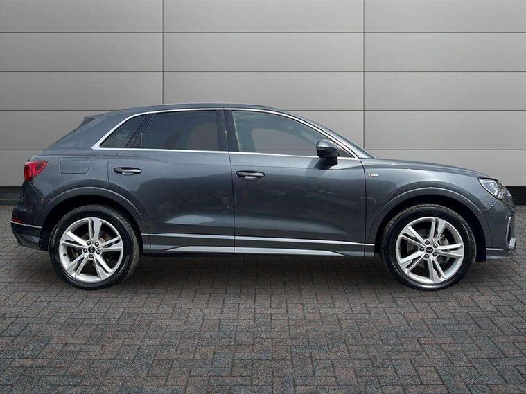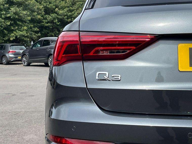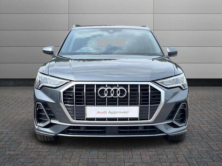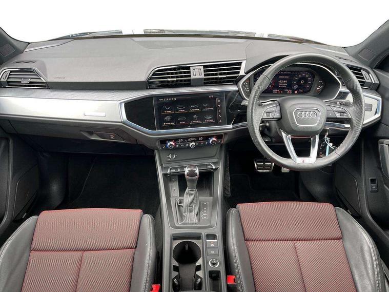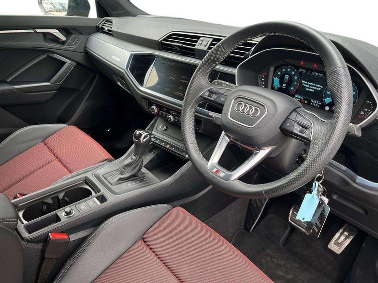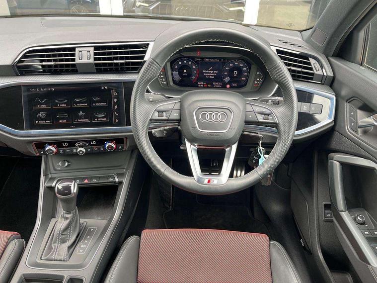 Amazon alexa Integration, Audi drive select, Audi lane departure warning, Audi smartphone interface includes wireless Apple carplay/Android Auto, Audi Virtual Cockpit - 10.25" display, Bluetooth interface, Camera based traffic sign recognition, Legal emergency call, MMI Navigation Plus with high resolution 10.1 inch touchscreen colour display, Power operated tailgate, Progressive steering, Service interval indicator, Start stop system with recuperation, Voice control system with natural language interaction, Sports suspension, 2 USB-C ports with charge and data functions, 6 passive loudspeakers, DAB digital radio module, Acoustic windscreen, Aluminium roof rails, Aluminium window trim, Anthracite black radiator grille, Auto dimming frameless rear view mirror, Body colour front spoiler blade, Body coloured bumpers, Electrically folding, adjustable and heated door mirrors with integrated LED side indicators and kerb view function for passenger side, Front and rear electric windows, Front fog lights, Front side air inlets in matt platinum grey, Grille vertical bars in aluminium silver/Matt, High gloss black finish B and C pillars, LED Dynamic rear indicators, LED headlights with LED daytime running lights, LED rear lights, LED third brake light, Privacy glass dark tinted rear and rear-side windows (from B-pillar backwards), Rain and light sensors, Rear diffuser grille in grained matt black, Rear diffuser strip in matt anthracite black, Rear side wing doors, Rear wiper, S line badges on front wings, S Line front and rear bumpers, Side skirt insert in matt Platinium grey, Variable front intermittent wipers, 12V socket in rear centre console, 3 seat bench in 2nd row, 3 spoke leather multifunction steering wheel features S badging and grips in perforated leather with contrast stitching, 40:20:40 folding with manual adjustment for 60:40 forwards/backwards position and backrest angle, Adjustable rear seat bench/backrest with centre armrest and cupholder, Black cloth headlining, Dual zone electronic climate control, Front and rear black floor mats with contrast stitching in rock grey, Front and rear headrests, Front and rear roof module including reading lights, Front centre armrest, Glove compartment lighting, Height and reach adjustable steering wheel, Illuminated door sill trims with S logo, ISOFIX child seat mounting for front passenger with airbag deactivation and outer rear seat including top tether attachment point for outer rear seats, Luggage compartment light, Manual front seats with height adjustment, Perforated leather gearknob, Single front passenger seat, Stainless steel luggage compartment sill finisher, Stainless steel pedals, Ambient lighting pack - Q3, Non smoking pack - Q3, 3x3 point rear seatbelts, 6 airbags - Driver, front passenger, curtain and side windows, Audi pre-sense front with pedestrain and cyclist recognition, Electrically operated child locks on rear doors, Electromechanical parking brake, Electronic stabilisation control including ABS, ASR and EDL, Front seatbelt reminder, Hill descent control, Hill hold assist, Pre sense basic, Seatbelt monitoring, Tyre pressure warning, Warning triangle and first aid kit, Anti theft alarm, Anti theft wheel bolts, Immobiliser, Remote central locking, Aluminium look interior elements, Dark matt brushed aluminium inlay, Detail dashboard around MMI touch colour display in glass look, black with surround in aluminium look, Leatherette door armrest,