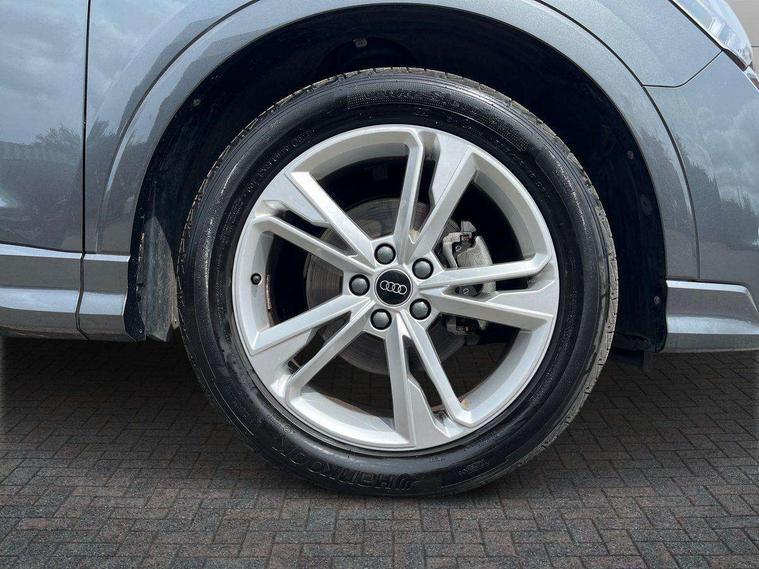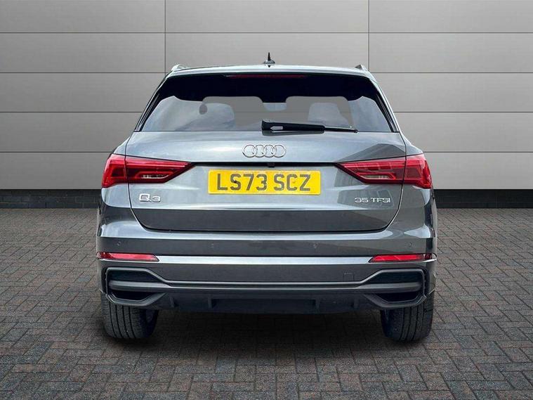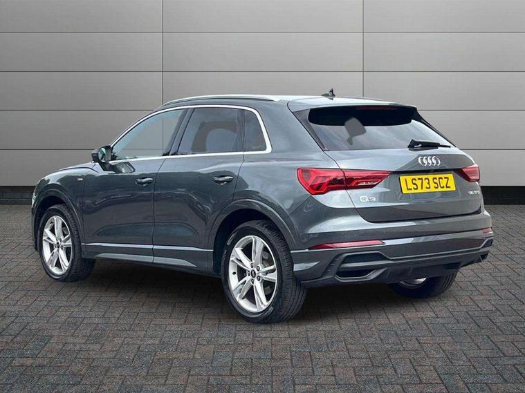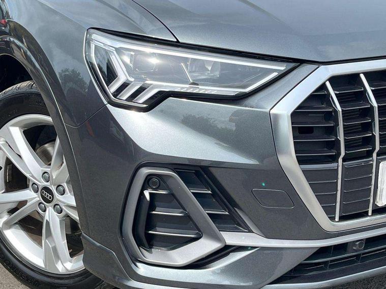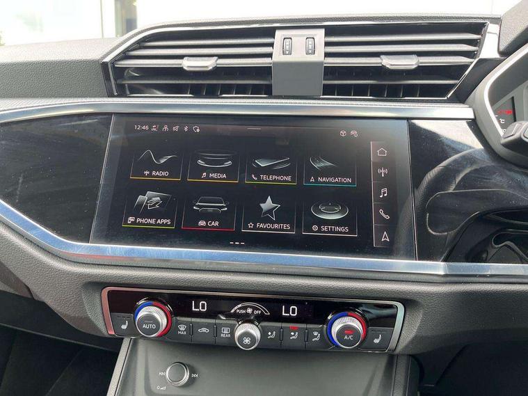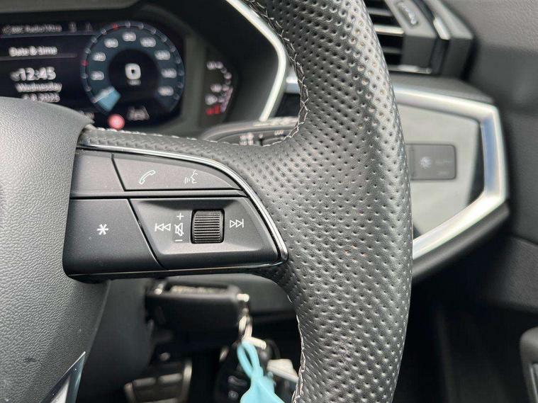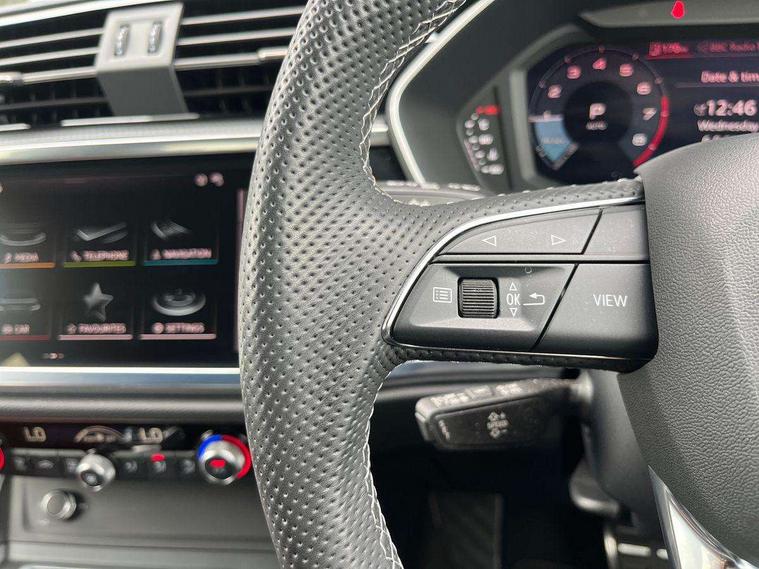 Amazon alexa Integration, Audi drive select, Audi lane departure warning, Audi smartphone interface includes wireless Apple carplay/Android Auto, Audi Virtual Cockpit - 10.25" display, Bluetooth interface, Camera based traffic sign recognition, Legal emergency call, MMI Navigation Plus with high resolution 10.1 inch touchscreen colour display, Power operated tailgate, Progressive steering, Service interval indicator, Start stop system with recuperation, Voice control system with natural language interaction, Sports suspension, 2 USB-C ports with charge and data functions, 6 passive loudspeakers, DAB digital radio module, Acoustic windscreen, Aluminium roof rails, Aluminium window trim, Anthracite black radiator grille, Auto dimming frameless rear view mirror, Body colour front spoiler blade, Body coloured bumpers, Electrically folding, adjustable and heated door mirrors with integrated LED side indicators and kerb view function for passenger side, Front and rear electric windows, Front fog lights, Front side air inlets in matt platinum grey, Grille vertical bars in aluminium silver/Matt, High gloss black finish B and C pillars, LED Dynamic rear indicators, LED headlights with LED daytime running lights, LED rear lights, LED third brake light, Privacy glass dark tinted rear and rear-side windows (from B-pillar backwards), Rain and light sensors, Rear diffuser grille in grained matt black, Rear diffuser strip in matt anthracite black, Rear side wing doors, Rear wiper, S line badges on front wings, S Line front and rear bumpers, Side skirt insert in matt Platinium grey, Variable front intermittent wipers, 12V socket in rear centre console, 3 seat bench in 2nd row, 3 spoke leather multifunction steering wheel features S badging and grips in perforated leather with contrast stitching, 40:20:40 folding with manual adjustment for 60:40 forwards/backwards position and backrest angle, Adjustable rear seat bench/backrest with centre armrest and cupholder, Black cloth headlining, Dual zone electronic climate control, Front and rear black floor mats with contrast stitching in rock grey, Front and rear headrests, Front and rear roof module including reading lights, Front centre armrest, Glove compartment lighting, Height and reach adjustable steering wheel, Illuminated door sill trims with S logo, ISOFIX child seat mounting for front passenger with airbag deactivation and outer rear seat including top tether attachment point for outer rear seats, Luggage compartment light, Manual front seats with height adjustment, Perforated leather gearknob, Single front passenger seat, Stainless steel luggage compartment sill finisher, Stainless steel pedals, Ambient lighting pack - Q3, Non smoking pack - Q3, 3x3 point rear seatbelts, 6 airbags - Driver, front passenger, curtain and side windows, Audi pre-sense front with pedestrain and cyclist recognition, Electrically operated child locks on rear doors, Electromechanical parking brake, Electronic stabilisation control including ABS, ASR and EDL, Front seatbelt reminder, Hill descent control, Hill hold assist, Pre sense basic, Seatbelt monitoring, Tyre pressure warning, Warning triangle and first aid kit, Anti theft alarm, Anti theft wheel bolts, Immobiliser, Remote central locking, Aluminium look interior elements, Dark matt brushed aluminium inlay, Detail dashboard around MMI touch colour display in glass look, black with surround in aluminium look, Leatherette door armrest,