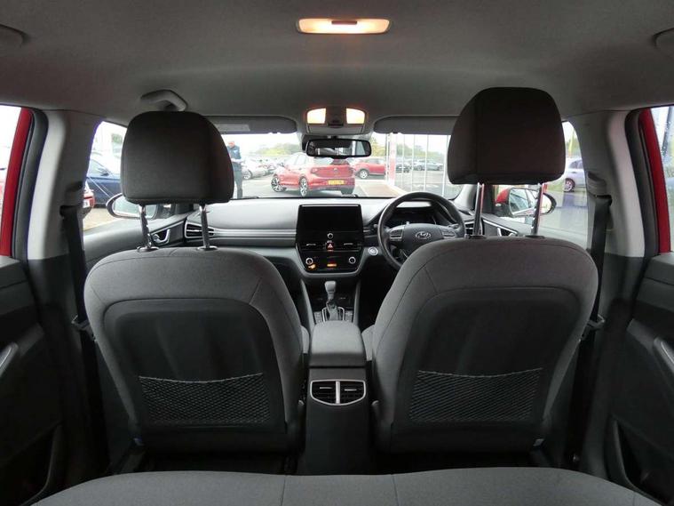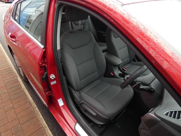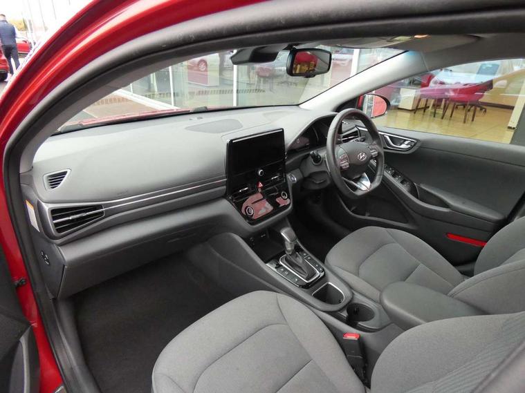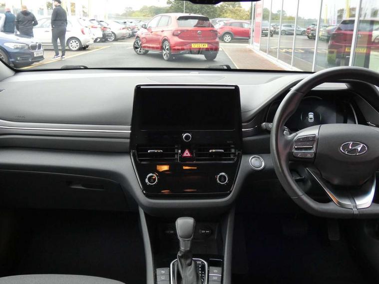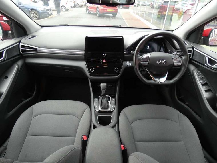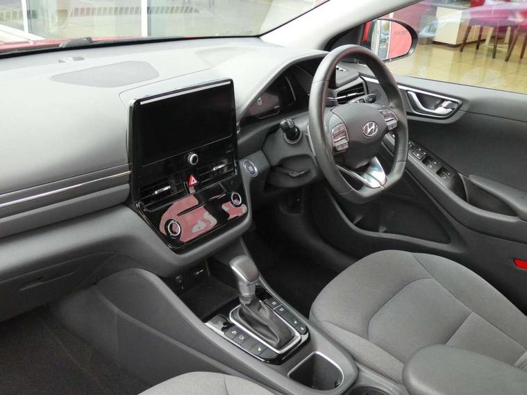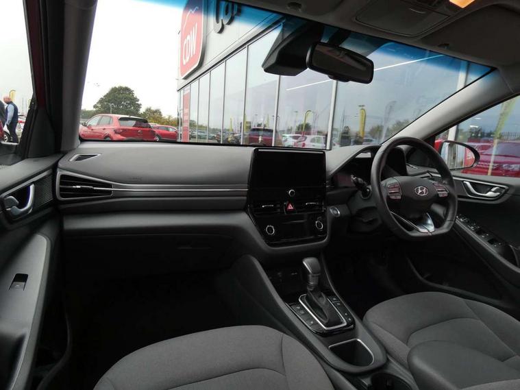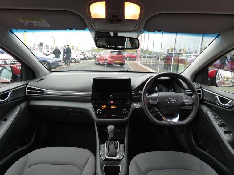 10.25" touchscreen satellite navigation includes traffic messaging channel, mapcare, live services and bluelink, Apple car play/Android Auto, Bluetooth system, Cruise control, Driver attention alert system, E-call, Eco driving assistant system (ECO DAS), Electric power steering with variable drive modes, Gear lever drive mode selector, Lane departure warning system with lane keep assist - LKAS, Parking Brake - Foot Brake, Parking system with rear camera and guidance system, Rear parking sensor, Rear view monitor, Roadside assistance, Supervision cluster with 7" high resolution TFT LCD, Voice recognition, Windscreen washer fluid sensor and warning indicator, Wireless phone charging pad, DAB Digital radio, Infinity sound system includes 1 centre, 2 tweeters, 2 front, 2 rear and 1 ext amp, Radio data system, Steering wheel audio, phone and cruise controls, USB and aux connection in front, Active air flap radiator grille, Auto dimming rear view mirror, Automatic headlights with dusk sensor, Body colour bumpers, Body colour door handles with chrome inserts, Body colour door mirrors, Bodyside mouldings, Chrome door scuff with ioniq logo, Chrome finish window surround, Chrome radiator grille, Door mirror puddle lights, Electric adjustable door mirrors, Electric front windows - anti trap + one touch, Electric heated door mirrors, Heated rear windscreen, High beam assist, LED daytime running lights, LED Headlights, LED indicators in door mirrors, LED rear fog light, Positioning Lights - LED, Power folding door mirrors, Rain sensor, Rear electric windows, Rear LED lights, Rear roof spoiler with integrated LED brake light, Rear side wing doors, Rear wiper, Solar glass with windscreen shade band, Tinted windows, Two tone rear bumper, Variable front intermittent wipers, 12V power outlets, 3 rear seats, 60/40 split folding rear seat, Centre console storage, Centre interior light, Chrome interior door handles, Cloth upholstery, Driver seat height adjust, Driver's electric adjustable lumbar support, Driver/passenger sunvisors with illuminated vanity mirrors, Dual zone climate control, Front centre armrest with storage compartment, Front cupholder, Front head restraints with vertical and horizontal adjustment, Front seat and rear pockets, Heated front seats, Heated steering wheel, Illuminated luggage compartment, Interior mood lighting, Leather wrapped steering wheel, Luggage net, Manual height adjustable front passenger seat, Map and reading lights, Paddle shifter, Rear centre console with air vents, Single front passenger seat, Sunglasses holder, USB - driver arm rest (charging only), Vertical adjustment rear head restraints, 3x3 point rear seatbelts, Airbags - front, front side, curtain and drivers knee airbags, Anti-lock brake system (ABS), Autonomous emergency braking, Electronic stability control, Front passenger airbag deactivation switch, Hill start assist control (HAC), Manual child lock in rear doors, Regenerative braking system, Traction control, Tyre pressure monitoring system with individual tyre pressure display, Deadlocks, Immobiliser, Keyless smart entry with push button start, Remote central locking, 15" Design B alloy wheels, Tyre repair kit,