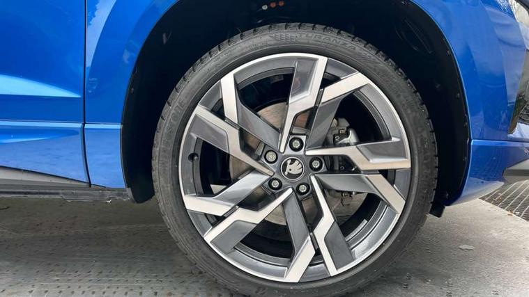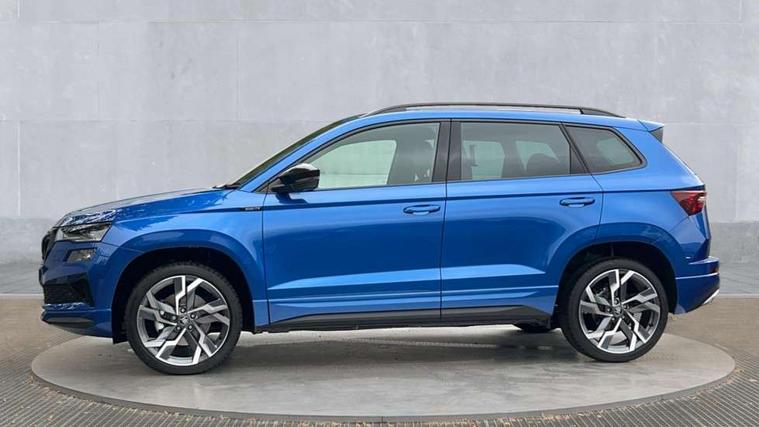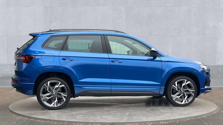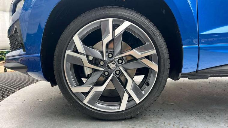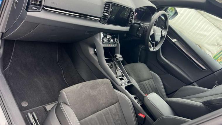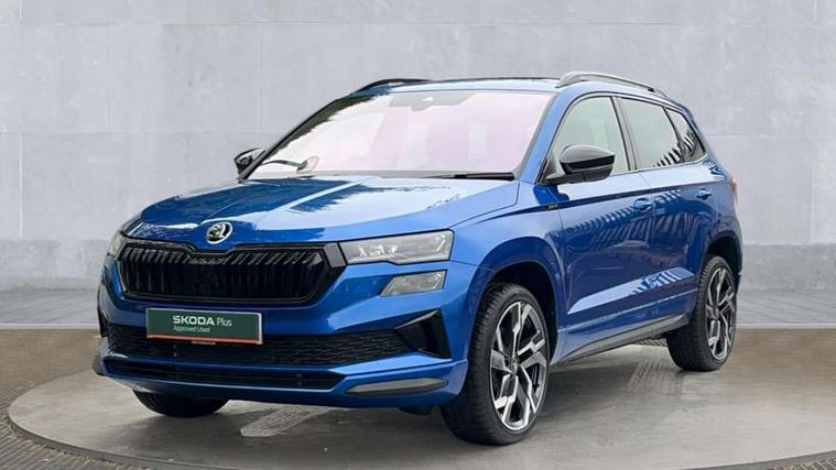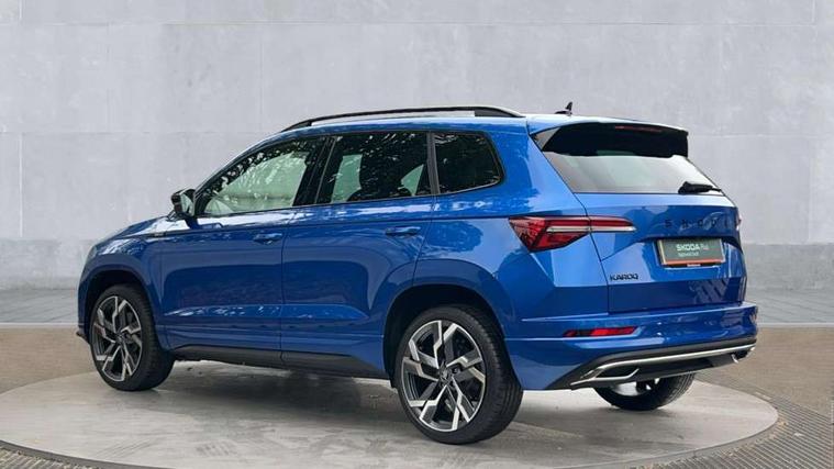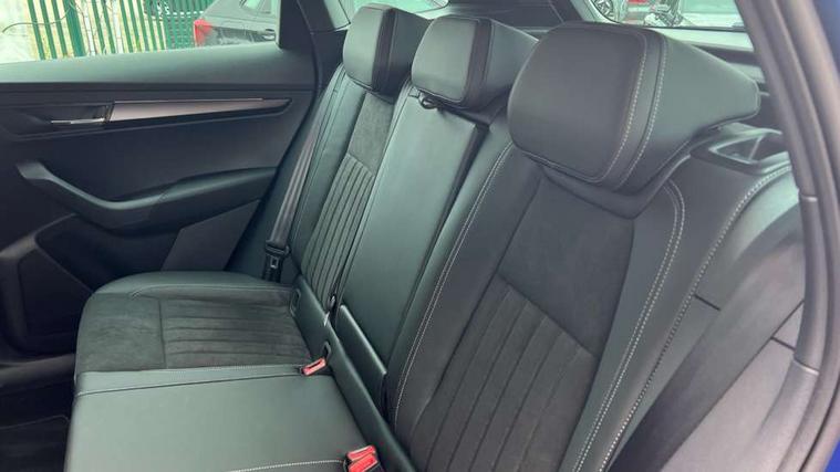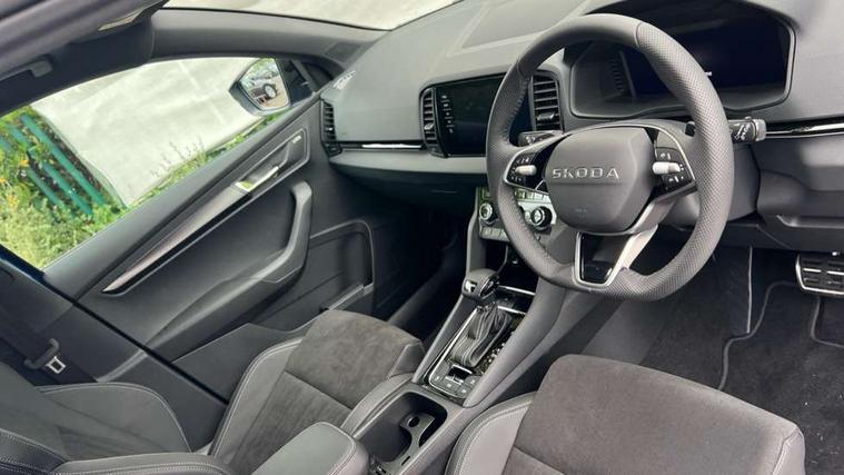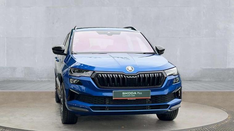 Advanced driver attention and drowsiness monitor, Emergency services call system, Outside temperature gauge, Sensor for driver assistance systems, Service interval indicator, SmartLink wireless for Apple and wired for Android, Start/stop system with regenerative braking, Traffic sign recognition, USB C Port x 2 in front centre console, Virtual Cockpit - 10.25" digital display, Virtual pedal with electrically operated boot door, Wireless smartphone charging, DAB radio with Bluetooth, USB connection, Acoustic glass, Aero front windscreen wipers with intermittent function, Auto dimming rear view mirror with light and rain sensors, Black door mirrors, Black electric window control buttons, Black radiator grille, Black roof rails, Body colour door handles, Electric front and rear windows with child proof lock, Extended rear roof spoiler, Front door steps with SportLine logo, Heated rear windscreen, LED daytime running lights, LED rear lights with high functionality welcome effect and dynamic indicators, Light assistant (coming/leaving home/tunnel light), Panoramic sliding sunroof, Plastic scuff plates in door apertures, Privacy glass, Protective door side sills in body colour, Rear diffuser, Rear side wing doors, Rear window wiper with washer system and intermittent control, Safety reflectors on front doors, Skoda lettering on tailgate in black, Sportline badge on front fender, Sports front and rear bumpers, Third brake light, Unique dark chrome design logo on alloy wheels, 1.5 litre bottle holders in driver and front passenger door panels, 12V socket in boot, 12v socket in front centre armrest with storage compartment and rear air vents, 2 x Tablet holder, 3 rear height adjustable headrests, 3 seat bench in 2nd row, 3 spoke sports leather heated multifunction steering wheel with DSG paddles, 4 foldable roof handles with rear coat hooks, Black floor carpet, Cargo elements in boot, Chrome inner door handles, Foldable hooks in the boot, Front head restraints, Height adjustable front three point seats belts with tensioners, Height/reach adjust steering wheel, Ice scraper, Illuminated glovebox, Illuminated luggage compartment, Isofix child seat preparation for front passenger seat, Isofix child seat preparation outer rear, Manual lumbar support for front seats, Pen holder, Pollen filter, Rear backrest release from boot, Rear boot cover, Rear package tray, Rear reading lights, Rear seats fixed folding and divided 60:40, Rubbish bin door, Safety vest holder, Single front passenger seat, Skoda lettering on steering wheel, Sportline decorative inserts, Storage box in upper central dashboard closed, Sunvisors with illuminated vanity mirrors, Textile floor mats, Ticket holder, Titan black interior ceiling, Umbrella under passenger seat, Under passenger seat storage compartment, Columbus pack - Karoq, LED Interior lighting pack with Skoda welcome logo - Karoq, Light Pack - Karoq, Non Smokers pack, Performance pack - Karoq, Winter plus pack with heated front and rear seats - Karoq, Automatic door unlocking in case of crash, Automatic fuel cut off in case of crash, Driver airbag, Electronic parking brake with auto hold function, Emergency rear braking signal, ESC (incl. ABS+MSR+ASR+EDS+HBA+DSR+RBS+MKB), Front side airbags, Head airbags, Hill hold control, Knee airbags, Passenger airbag with switch-off function, Pedestrian monitor, Seatbelt reminder signalisation and pretensioner for all seats, Three point seatbelts rear, Two tone horn, Tyre pressure monitor, Alarm with interior monitoring, back up horn and tilt sensor with safe function, Electronic engine immobiliser, Keyless entry and start/stop, Remote central locking with 2 remote folding keys, Black air vent surround, Black centre console, carbon door decor, Satin black dashboard, Satin black door trim, 19" Sagittarius anthracite alloy wheels, Anti-theft wheel bolts protection, Breakdown and tool kit,