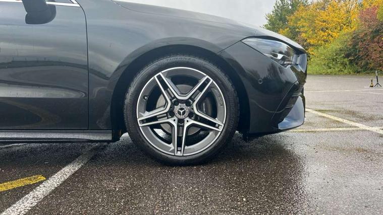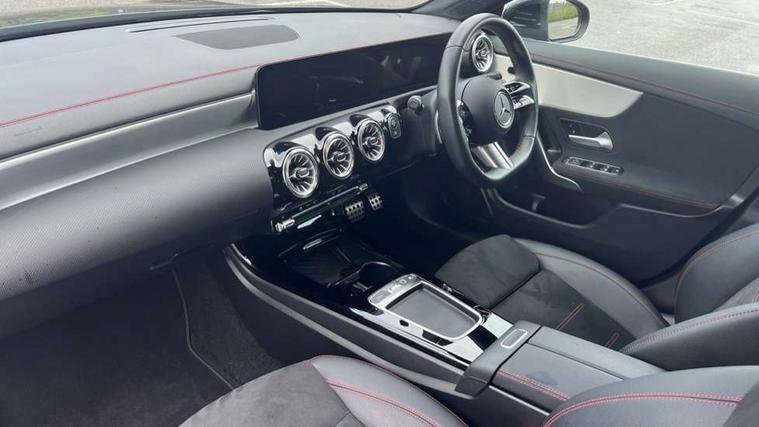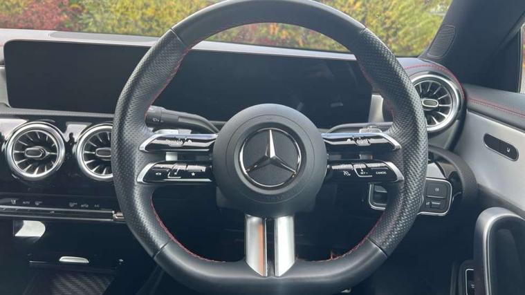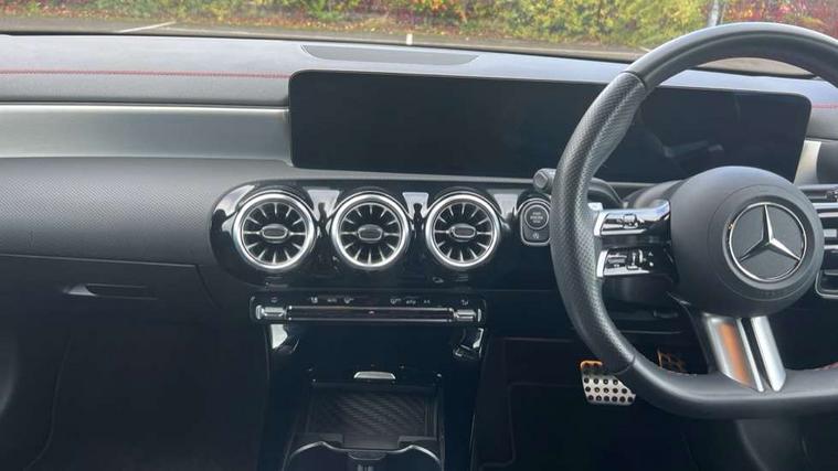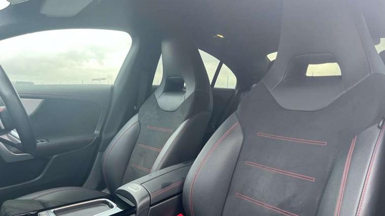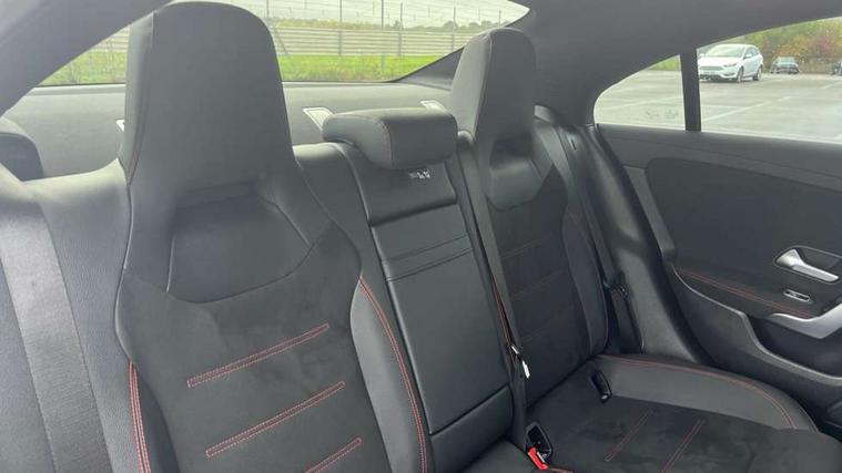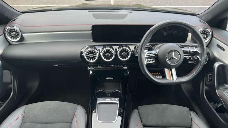 10.25 inch Instrument display with digital cockpit, 10.25 inch touchscreen central media display, Active lane keeping assist, Attention assist - Monitors steering behaviour and long journey fatigue, Blind spot assist, Bluetooth connection, Car wash mode, Cruise control with limiter, Direct steer system, DYNAMIC SELECT with a choice of driving modes (ECO, Comfort, Sport and Individual), ECO start/stop function, Fingerprint sensor, Fluid level warning indicator for fuel, oil, coolant and washer fluid, Hard-disk navigation, Hey Mercedes Voice activation, Lamp failure indicator, Mercedes me connect including emergency call system, accident recovery, breakdown and maintenance management, Mercedes me remote services, Outside temperature gauge, Owners manual in English, Pre-installation of private car share, Radio aerial integrated into front and rear windshields, Service indicator (ASSYST), Smartphone integration with Apple CarPlay and Android auto, Speed limit assist, Trip computer in multifunction display with current consumption indicator, Wireless charging in the front centre console, Comfort suspension with ride height lowering, Rear axle multi-link, DAB digital radio tuner, MBUX multimedia system, Mercedes Benz sound system (100 W) with 6 speakers, Pre installation for Mercedes Benz Link, Adaptive brake lights, AMG body styling with AMG front apron and rear apron and visible exhaust tailpipe in chrome trim elements, Body colour door handles, Electric windows, Electrically adjustable and heated door mirrors with integrated LED indicators, Exhaust system with 2 Visible tailpipe trim elements and rear apron with trim in chrome, Hand free access, Headlamp assist automatic headlamp activation, Heated glass rear windscreen + timer control, High gloss aluminium beltline strips, High level LED third brake light, Interior mirror with black reading lamps and frameless, LED high performance headlamps with integrated LED daytime running lights and adaptive highbeam assist, LED tail lamp, Privacy glass with dark tinting on rear side windows and rear window, Radiator grille with Mercedes-Benz pattern in chrome and central Mercedes star, single louvre in high-gloss black with chrome inserts, Rain sensing windscreen wipers with two sensitivity settings, Rear boot, Rear fog lamp, Rear side wing doors, Variable front intermittent wipers, Window line trim strip in high gloss aluminium, 3 seat bench in 2nd row, 3 twin spoke flattened multifunction steering wheel in nappa leather - horizontal twin spoke in high gloss black, vertical twin spoke in silver chrome, 4 way lumbar support, 40:20:40 split folding rear seat backrests, Air conditioning - One zone THERMATIC automatic climate control with automatically controlled air distribution, Air vents with surround in silver chrome, Artico man-made leather/Microcut microfibre upholstery, Automatic child seat recognition sensor, Black roof lining, Brushed stainless steel sports pedals with rubber studs, Floor mats with stitched AMG lettering, Fluorescent jacket, Front centre armrest with stowage, Galvanished gear shift paddles in silver chrome, Heated front seats, Interior lighting - 64 colour Ambient lighting, Luggage net on driver/front passenger seat backrest, Manually height and reach adjustable steering column, Rear head restraints, Single front passenger seat, Sport seats with fixed head restraints, Stowage compartment in centre console with retractable cover, Sunvisors with illuminated vanity mirrors, Twin front cupholders, Two outer rear seat isofix and top tether child seat fixing points, Keyless go comfort pack - CLA, Light and sight pack - CLA, Mirror pack - CLA, Parking pack with reversing camera - CLA, Seat comfort pack - CLA, USB package plus - CLA, Active bonnet pedestrain safety measure which detects an impact and raises bonnet by 65mm, Active brake assist includes forward collision warning system with autonomous braking, Adaptive brake assist with hold function and hill start assist, Anti lock braking system (ABS) with brake assist, Black seat belts, Bonnet with power domes, Brake calipers with Mercedes-Benz lettering, Brake pad wear warning indicator, Childproof locks manually operated for rear doors and electrically operated for rear power windows, Crash responsive emergency lighting, Driver and front passenger head and sidebags, Driver and front passenger windowbags, Drivers knee airbag, Dual stage driver and front passenger airbags, Electric parking brake, Electronic stability programme with acceleration skid control, ESP curve dynamic assist, Front and rear seatbelt reminder, Front passenger seat occupancy sensor, Perforated front brake discs, Sports braking system, Three point rear seat belts, Tyre pressure monitoring system, Warning triangle and first aid kit, Alarm system with immobiliser and interior protection -Thatcham category 1, Guard 360 deg vehicle protection - tow away protection with visual, acoustic warning, interior monitoring, preinstallation for parking damage, Remote central locking and crash sensor with emergency opening function, Light aluminium with longitudinal grain interior trim, 18" AMG 5 twin spoke light alloy wheels painted in termolite grey with high sheen finish, Summer tyres, Tirefit tyre sealant kit,