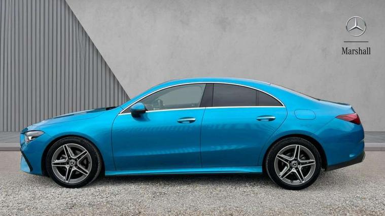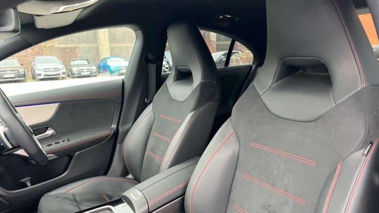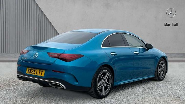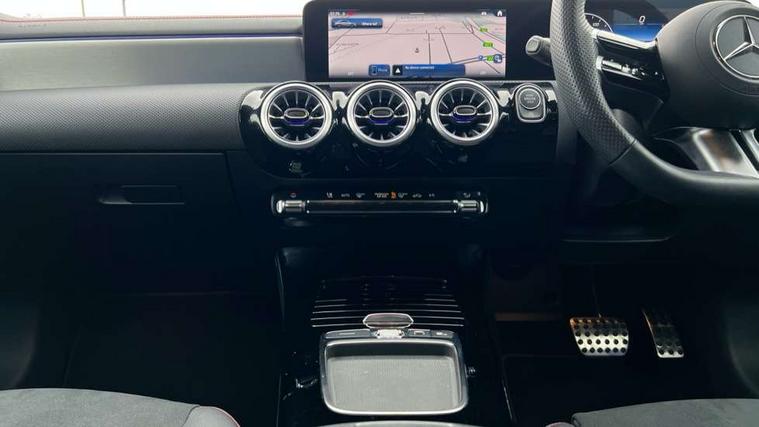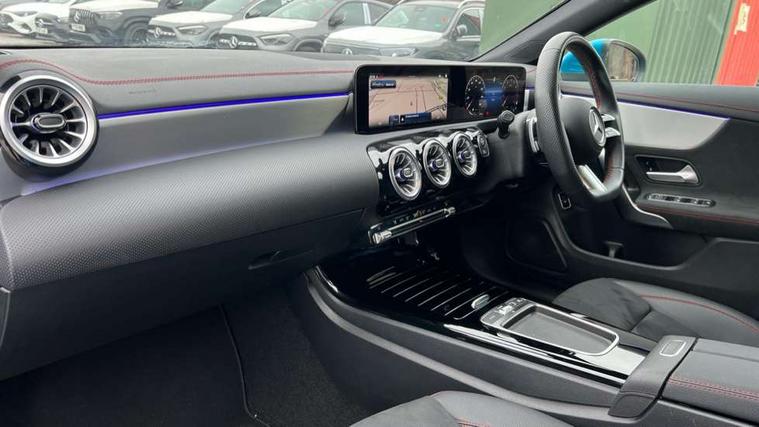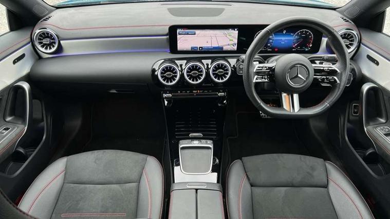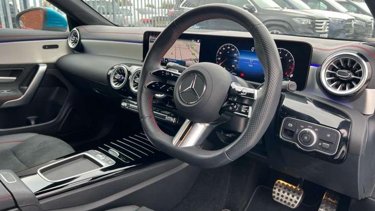 10.25 inch Instrument display with digital cockpit, 10.25 inch touchscreen central media display, Active lane keeping assist, Attention assist - Monitors steering behaviour and long journey fatigue, Blind spot assist, Bluetooth connection, Car wash mode, Cruise control with limiter, Direct steer system, DYNAMIC SELECT with a choice of driving modes (ECO, Comfort, Sport and Individual), ECO start/stop function, Fingerprint sensor, Fluid level warning indicator for fuel, oil, coolant and washer fluid, Hard-disk navigation, Hey Mercedes Voice activation, Lamp failure indicator, Mercedes me connect including emergency call system, accident recovery, breakdown and maintenance management, Mercedes me remote services, Outside temperature gauge, Owners manual in English, Pre-installation of private car share, Radio aerial integrated into front and rear windshields, Service indicator (ASSYST), Smartphone integration with Apple CarPlay and Android auto, Speed limit assist, Trip computer in multifunction display with current consumption indicator, Wireless charging in the front centre console, Comfort suspension with ride height lowering, Rear axle multi-link, DAB digital radio tuner, MBUX multimedia system, Mercedes Benz sound system (100 W) with 6 speakers, Pre installation for Mercedes Benz Link, Adaptive brake lights, AMG body styling with AMG front apron and rear apron and visible exhaust tailpipe in chrome trim elements, Body colour door handles, Electric windows, Electrically adjustable and heated door mirrors with integrated LED indicators, Exhaust system with 2 Visible tailpipe trim elements and rear apron with trim in chrome, Hand free access, Headlamp assist automatic headlamp activation, Heated glass rear windscreen + timer control, High gloss aluminium beltline strips, High level LED third brake light, Interior mirror with black reading lamps and frameless, LED high performance headlamps with integrated LED daytime running lights and adaptive highbeam assist, LED tail lamp, Privacy glass with dark tinting on rear side windows and rear window, Radiator grille with Mercedes-Benz pattern in chrome and central Mercedes star, single louvre in high-gloss black with chrome inserts, Rain sensing windscreen wipers with two sensitivity settings, Rear boot, Rear fog lamp, Rear side wing doors, Variable front intermittent wipers, Window line trim strip in high gloss aluminium, 3 seat bench in 2nd row, 3 twin spoke flattened multifunction steering wheel in nappa leather - horizontal twin spoke in high gloss black, vertical twin spoke in silver chrome, 4 way lumbar support, 40:20:40 split folding rear seat backrests, Air conditioning - One zone THERMATIC automatic climate control with automatically controlled air distribution, Air vents with surround in silver chrome, Artico man-made leather/Microcut microfibre upholstery, Automatic child seat recognition sensor, Black roof lining, Brushed stainless steel sports pedals with rubber studs, Floor mats with stitched AMG lettering, Fluorescent jacket, Front centre armrest with stowage, Galvanished gear shift paddles in silver chrome, Heated front seats, Interior lighting - 64 colour Ambient lighting, Luggage net on driver/front passenger seat backrest, Manually height and reach adjustable steering column, Rear head restraints, Single front passenger seat, Sport seats with fixed head restraints, Stowage compartment in centre console with retractable cover, Sunvisors with illuminated vanity mirrors, Twin front cupholders, Two outer rear seat isofix and top tether child seat fixing points, Keyless go comfort pack - CLA, Light and sight pack - CLA, Mirror pack - CLA, Parking pack with reversing camera - CLA, Seat comfort pack - CLA, USB package plus - CLA, Active bonnet pedestrain safety measure which detects an impact and raises bonnet by 65mm, Active brake assist includes forward collision warning system with autonomous braking, Adaptive brake assist with hold function and hill start assist, Anti lock braking system (ABS) with brake assist, Black seat belts, Bonnet with power domes, Brake calipers with Mercedes-Benz lettering, Brake pad wear warning indicator, Childproof locks manually operated for rear doors and electrically operated for rear power windows, Crash responsive emergency lighting, Driver and front passenger head and sidebags, Driver and front passenger windowbags, Drivers knee airbag, Dual stage driver and front passenger airbags, Electric parking brake, Electronic stability programme with acceleration skid control, ESP curve dynamic assist, Front and rear seatbelt reminder, Front passenger seat occupancy sensor, Perforated front brake discs, Sports braking system, Three point rear seat belts, Tyre pressure monitoring system, Warning triangle and first aid kit, Alarm system with immobiliser and interior protection -Thatcham category 1, Guard 360 deg vehicle protection - tow away protection with visual, acoustic warning, interior monitoring, preinstallation for parking damage, Remote central locking and crash sensor with emergency opening function, Light aluminium with longitudinal grain interior trim, 18" AMG 5 twin spoke light alloy wheels painted in termolite grey with high sheen finish, Summer tyres, Tirefit tyre sealant kit,