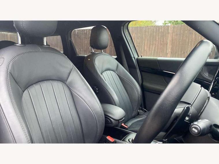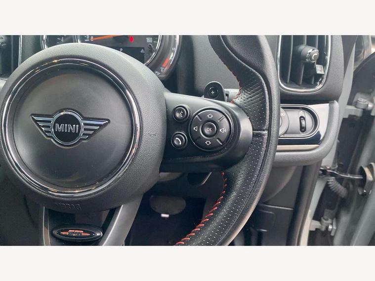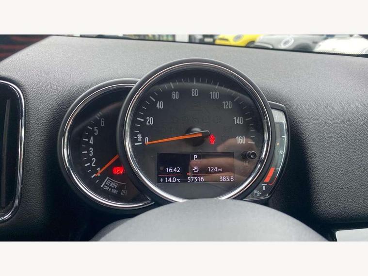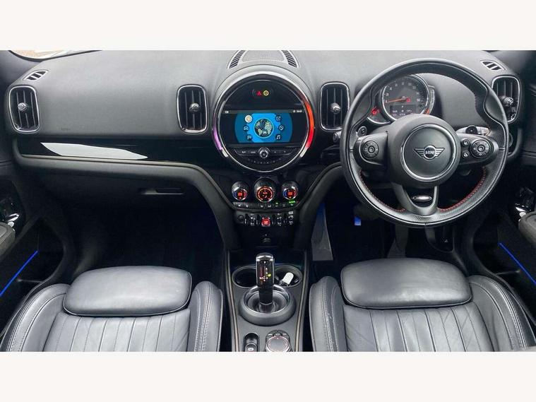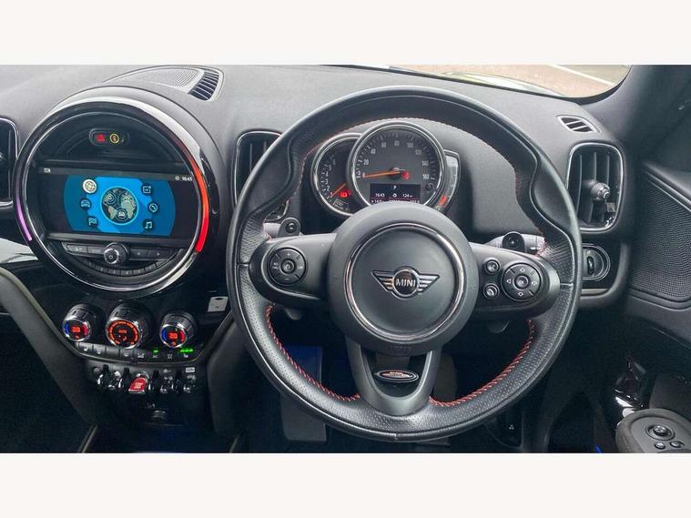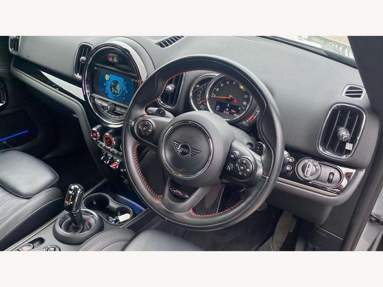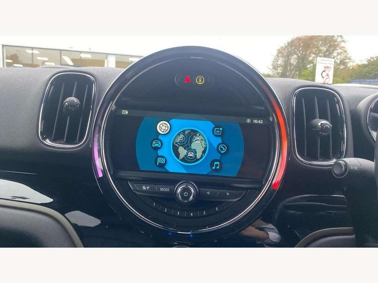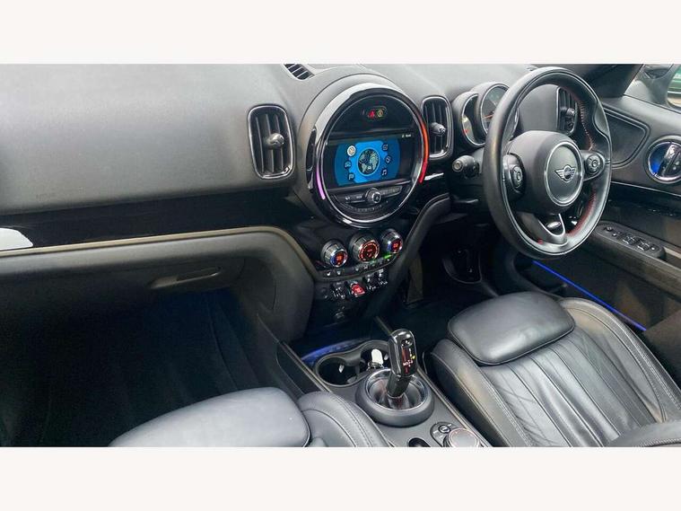 Apple CarPlay preparation, Brake pad wear indicator warning light, Central display with LED ring and 6.5" colour touch screen, Connected driver, DTC - Dynamic traction control, Exterior temperature gauge, Intelligent emergency call, MINI remote services, MINI TeleServices, Navigation system, On board computer, Personal Profile, Real time traffic information, Service interval indicator, Servotronic speed sensitive power steering, Electronic differential lock, Performance Control, Auxiliary input socket, DAB digital radio module, MP3 compatible radio/single CD player, Radio visual boost, Anti dazzle rear view mirror, Body colour scoop integrated into engine- compartment lid, Chrome door handles, Chrome headlight surround, Chrome plated radiator grille, Chrome side scuttle, Chrome window surround, Electric front windows + one touch + anti-pinch, Electrically adjustable door mirrors, Follow me home headlights, Green tinted glass, Heated door mirrors/heated windscreen washers, Heated rear window with automatic switch off, Metal look door sill finishers, Rain sensor including auto headlights activation, Rear wiper, Roof spoiler, Twin chrome exhaust tailpipes, White indicator lights, 12V power point front, 2 cupholders in front centre console, 4 lashing points to secure luggage, 40:20:40 split folding rear seats, Centre console storage box, Chrome interior door handles, Driver/passenger sunvisors, Front and rear headrests, Front interior light, Front passenger grab handle, Front seat backrest storage nets, Gearshift paddles, Heater with recirculation function, Height/reach adjust steering wheel, Isofix rear child seat preparation, Luggage compartment lighting, Multifunction steering wheel, Rear grab handles, Sensatec gearshift and handbrake, Sport front seats, Storage compartments in doors, Toolkit in luggage compartment, Interior lights pack - Countryman, MINI Excitement Pack - Countryman, 3 point automatic seatbelts, 3 point seatbelts on all rear seats, ABS, Cornering brake control (CBC), Crash Sensor - activates hazard/interior lighting + unlocks doors, Driver and passenger airbags, Driver and passenger side airbags, DSC - Dynamic Stability Control, Electronic brake force distribution, Electronic parking brake, Front curtain airbags, Front passenger airbag deactivation, Fuel cut off safety device, Hill start assist, Pyrotechnically pre-tensioned front seatbelts, Tyre pressure warning, Automatic door locking, Keyless Start, Locking wheel bolts, RF remote control central locking, Second remote key, Thatcham category 1 alarm + immobiliser,