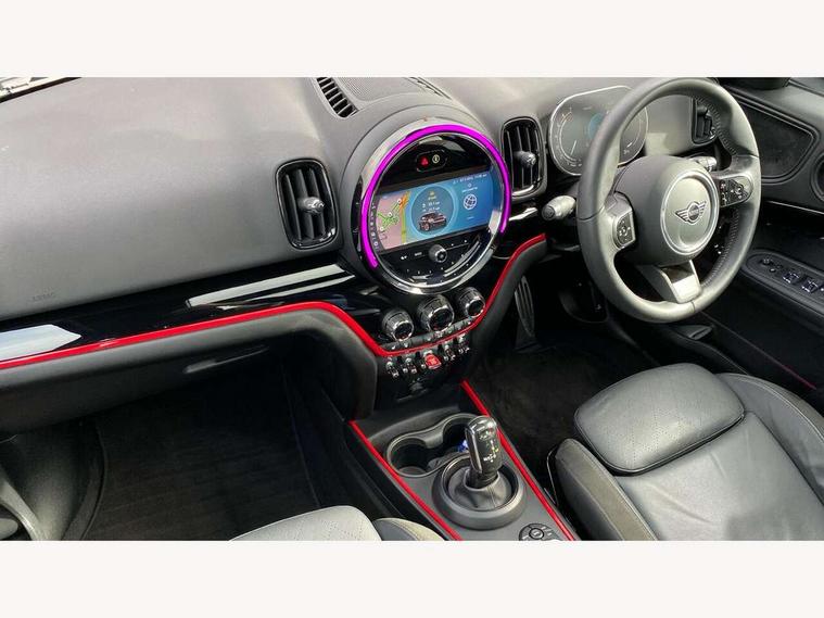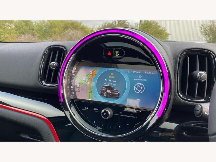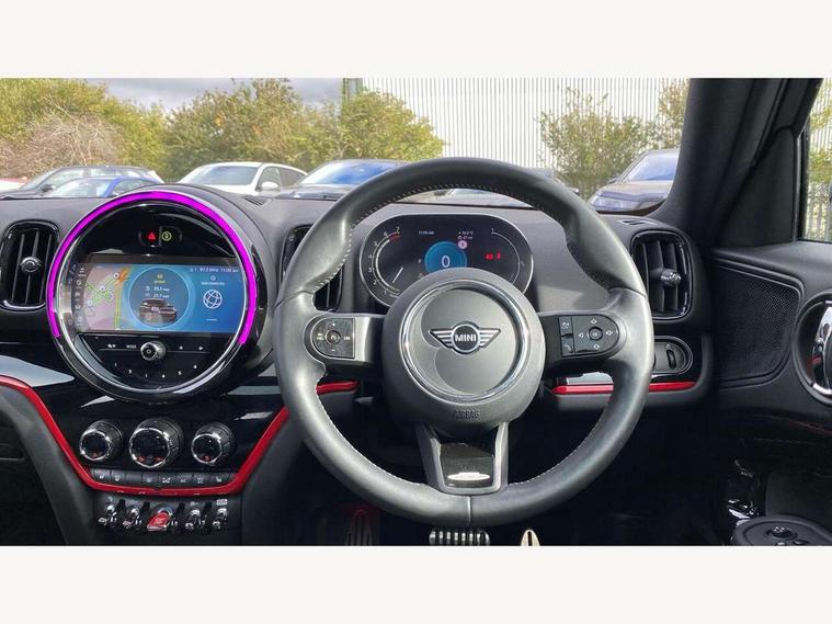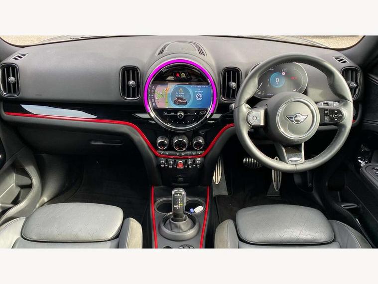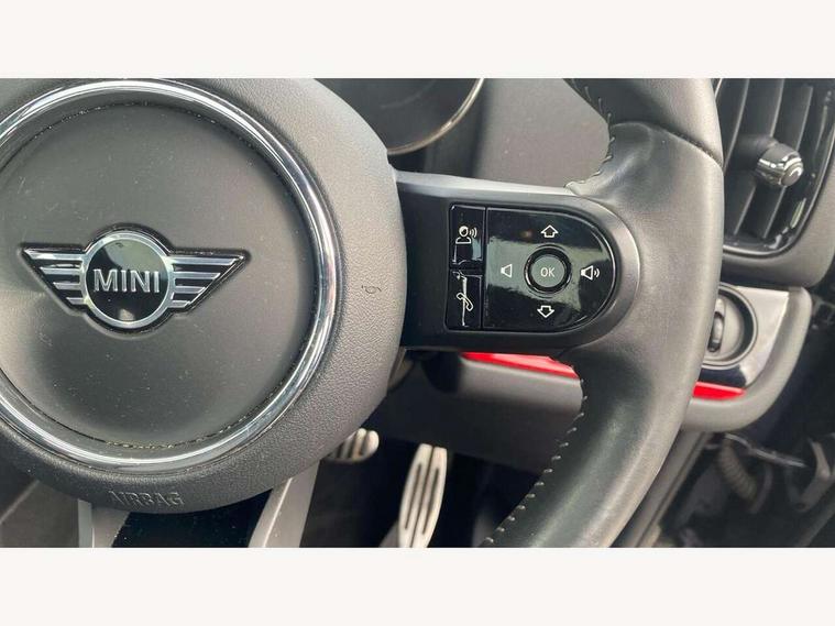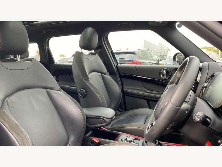 Active Guard incl speed limiting and lane departure functions with auto steering, and front collision warning with brake intervention, Automatic start/stop function with brake energy recuperation, Compatible mobile phone bluetooth with audio streaming, Cruise control with brake assist, Electro-mechanical speed dependant steering assistance, Instrument cluster, MINI Driving Modes - centre toggle switch to control driving setting (sport, mid and green), Mini E-call, On board computer, Double Vanos system, Fully variable valve control, High precision injection, Performance Control, Steptronic transmission with double clutch, FM tuner and DAB digital radio, 3rd brake light, Body colour fuel filler cap, Day time driving lights, Door sill strips, Dynamic brake lights, Electric windows, Heated rear window, Heated windscreen washer jets, John Cooper Works - aerodynamic kit (front and rear apron, spoiler), front and rear sport bumpers and part-painted side sills with door sill finishers, John Cooper Works Logo, LED fog lights, Model logo, Model logo on Tailgate, Rain sensor with auto headlights, Rear fog lights, Rear side wing doors, Rear window wiper, Side scuttle panel with integrated indicator, Split rear doors, Sun/heat protection glass, White indicator lenses, 12V socket in centre console, 3 seat bench in 2nd row, 360L luggage compartment capacity, 4 lashing eyes in luggage compartment, 40:20:40 split folding rear seats, Anthracite headlining with grab handles and clothes hooks, Chrome interior highlights, Colour line - Carbon black, Cupholders, English handbook, Front headrests, Glove compartment, Height and length steering column adjustment, Interior lighting with 12 basic colours selectable via toggle switch in roof, Isofix rear child seat preparation, LED reading lights, vanity mirror lights, front foot well light and spotlight on front seats, Mini John Cooper Works leather gearshift lever and handbrake gaiters, Multifunction steering wheel, Nappa leather steering wheel with MINI Yours logo, Rear headrests, Single front passenger seat, Stainless steel pedals and foot rest, Storage compartments in doors, Sunvisors with vanity mirrors, Excitement pack - Countryman, Navigation pack - Countryman, Piano black exterior pack - Countryman, 2 tone horn, 3 point seatbelts on all seats, 6 Airbags - front, side, head and seat belt tensioners, Anti-lock braking system (ABS), DSC - Dynamic Stability Control, Electronic handbrake, Front and rear disc brakes, Hill start assist, Manual rear child locks, Tyre pressure monitoring system, Alarm system with tilt sensor, monitoring doors, bonnet interior and tailgate, Auto drive away locking, Deadlocking function, Electronic vehicle immobiliser, Locking wheel bolts, Start/stop toggle with keyless go, Piano black JCW interior trim, Tool kit,