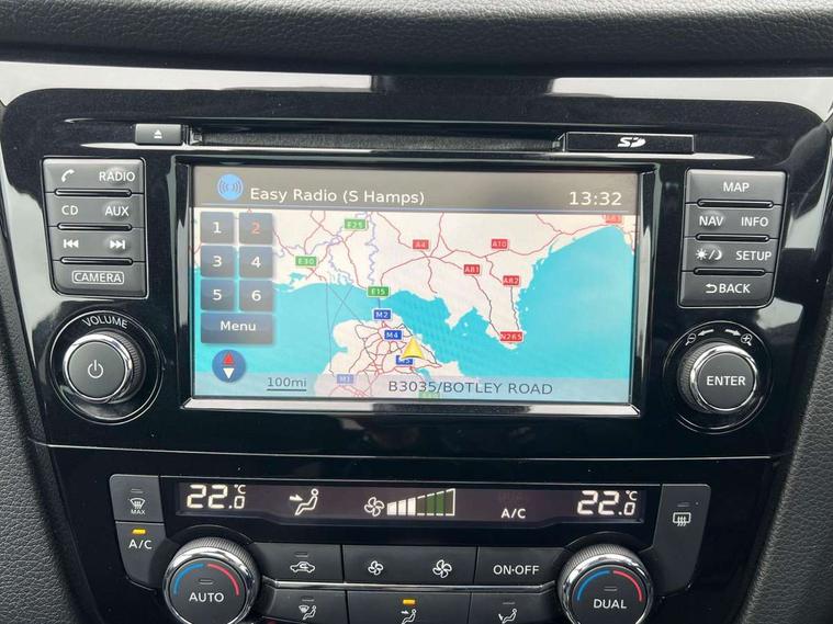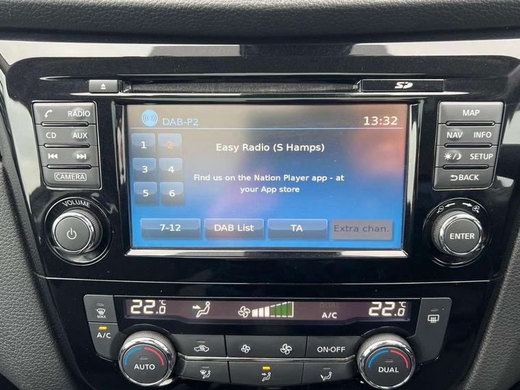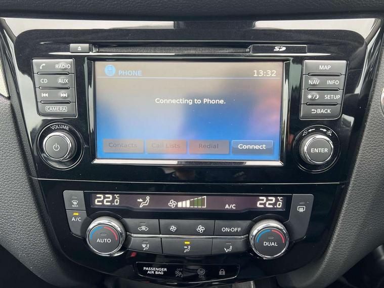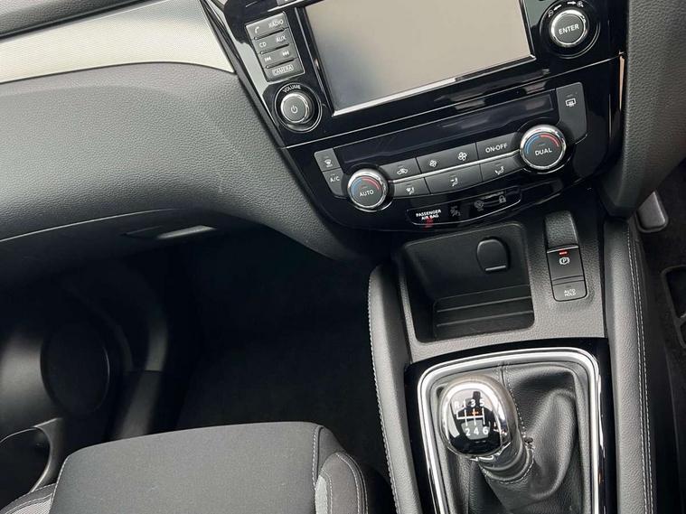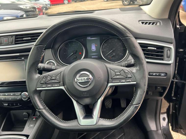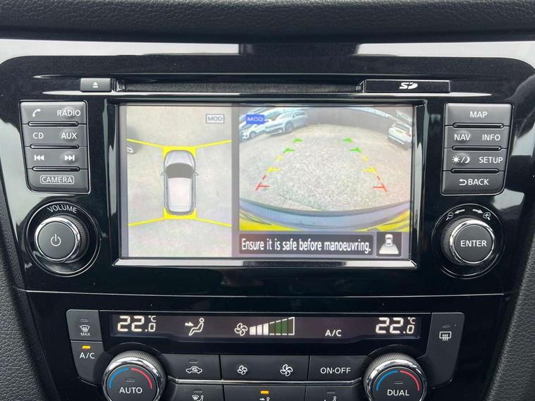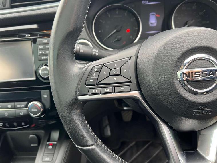5" TFT driver information centre, Around View Monitor, Bluetooth phone integration system, Cruise control, Electric speed sensitive power steering, Front and rear parking sensors, Lane departure warning system, Nissan connect sat nav system, Outside temperature display, Push button starter, Rear view camera, Service interval indicator, Speed limiter, Traffic sign recognition, Trip computer, 'Shark fin' mobile antenna, 6 speakers, DAB Digital radio, Radio/CD, Smartphone apps, Steering wheel mounted audio controls, USB/aux input socket, Automatic headlamp activation, Body colour bumpers, Body colour door handles, Body colour door mirrors, Chrome window surround, Electric folding and heated door mirrors, High beam assist, Interior mirror with auto anti dazzle, LED indicators in door mirrors, Matt silver roof rails, One touch electric front/rear windows, Privacy glass, Rain sensor windscreen wipers, Rear roof spoiler, Rear wiper, 2 X front 12v power sockets, 60/40 split folding rear seat, Ambient interior lighting, Centre console with armrest, Chrome interior door handles, Cloth upholstery, Configurable luggage board system, Driver + front passenger lumbar support, Dual zone climate control, Front and rear door pockets with bottle holders, Front headrests, Front seat belt pre-tensioners with load limiters, Height adjustable driver's seat, Height adjustable passenger seat, Illuminated electric window switch, Isofix child seat preparation, Leather gearknob, Leather interior door handles, Leather knee rest, Leather steering wheel, Luggage compartment lighting, Parcel shelf, Pollen filter, Rake/reach adjustable steering wheel, Rear headrests, ABS, brake assist and EBD, Child locks on rear doors, Curtain airbags, Driver/front passenger airbag, Electronic parking brake, ESP + traction control, Forward emergency braking, Front passenger airbag deactivation, Height adjustable front seatbelts, Hill start assist, Seatbelt warning, Side airbags, Three 3 point rear seatbelts, Tyre pressure monitoring system, Alarm, Immobiliser, Intelligent Key, Remote central locking, Piano black interior trim, 18" Bi-colour alloy wheels, Tyre puncture repair kit,