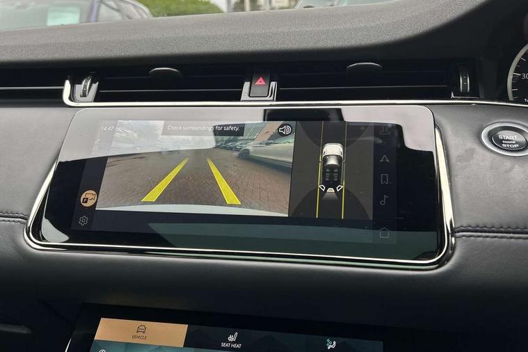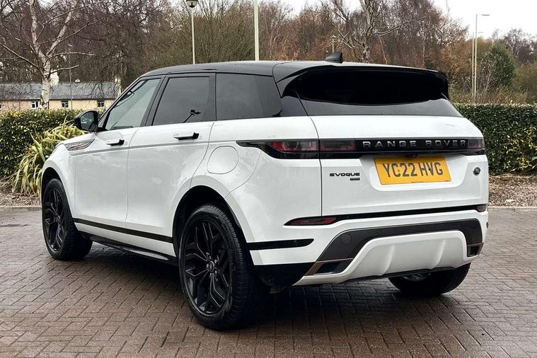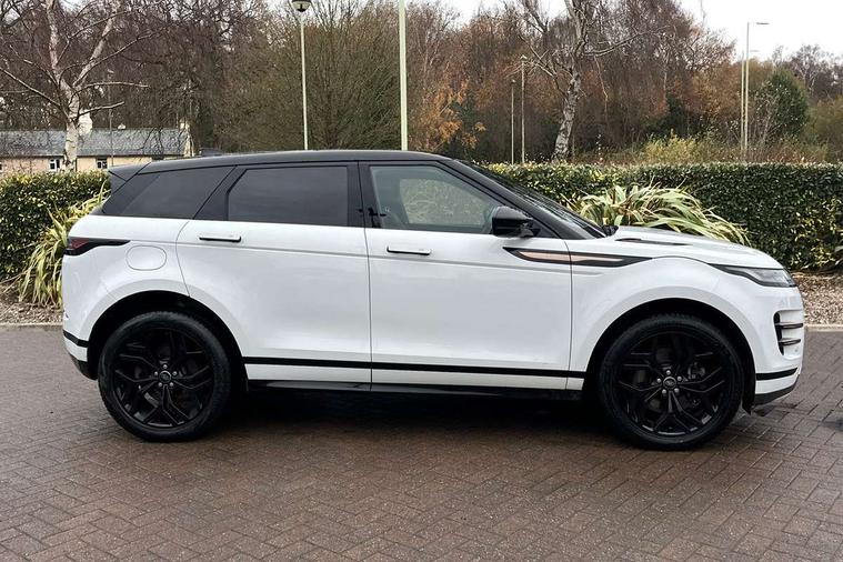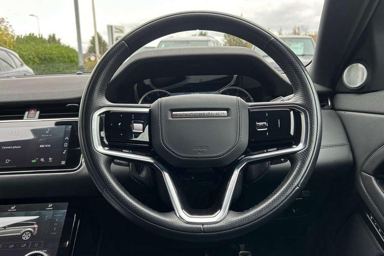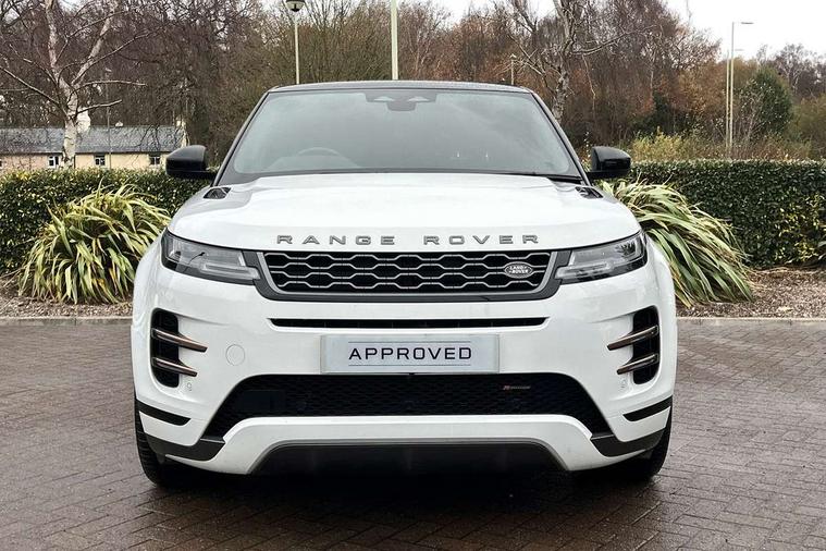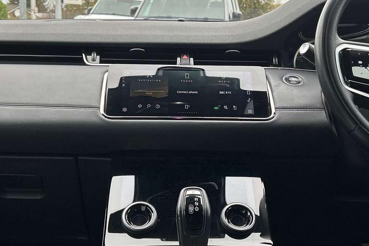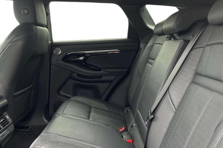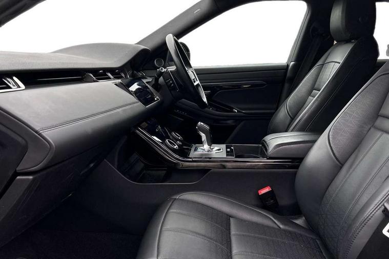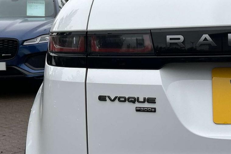 10" deployable touchscreen with lower touchscreen, Adaptive cruise control, Android Auto, Apple car play, Blind spot assist, Bluetooth connectivity, Brake pad wear indicator warning light, Driver condition monitor, eCall emergency system, Electronic power assisted steering (EPAS), Front and rear parking aid, InControl remote, Land Rover InControl apps, Lane keep assist, Pivi pro connected includes upgraded infotainment, connected navigation pro, Nuance speech licence, Push button starter, Rear collision monitor, Rear traffic monitor, Traffic sign recognition with adaptive speed limiter, Voice control system, 7 kW onboard charger, All terrain progress control, Configurable dynamics, Electric rear axle drive, Home charging cable, Large fuel tank, Passive suspension, Public charging cable, Terrain Response 2 Auto, Digital Audio Broadcast radio-DAB, Meridian surround sound system with 650W subwoofer and 14 speakers, Steering wheel mounted controls, Auto headlights, Automatic headlight levelling, Electric windows with one touch open/close and anti trap, Evoque and R-Dynamic badge, Flush deployable exterior door handles, Heated rear window with timer, Heated washer jets, Heated windscreen, P300e badge, Power fold, auto-dimming, heated door mirrors with approach lights and auto dimming driver side, Rain sensing windscreen wipers, Rear fog lights, Rear side wing doors, Rear wiper, Tailgate spoiler, Third brake light, 40:20:40 split folding rear seats with centre headrest and armrest, Ambient interior lighting, Bright metal pedals, Heated steering wheel, Isofix system on outer rear seats, Overhead lighting console, Overhead stowage for sunglasses, Passive front head restraints, Perforated full leather steering wheel, Rear air vents, Rear centre headrest, Rear head restraints, Satin chrome gearshift paddles, Single passenger seat, Sunvisors with illuminated vanity mirrors, Twin sliding front centre armrest, 3 rear 3 point seatbelts, Anti-lock braking system (ABS), Customer configurable autolock, DSC - Dynamic Stability Control, Electronic brake force distribution, Electronic parking brake, Electronic traction control, Emergency braking, Front and rear seatbelt reminder, Hill descent control, Hill launch assist, Low traction launch, Power operated child locks, Roll stability control, Six airbags - Driver and passenger airbags/driver knee airbag/front side airbag and curtain airbags, Torque vectoring brake, Tyre pressure monitoring system, Alarm, Immobiliser, Intrusion sensor, Keyless entry, Locking wheel nuts,