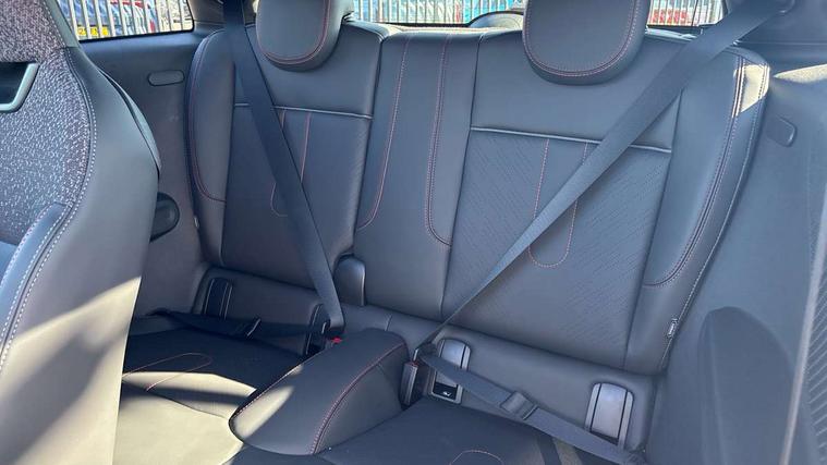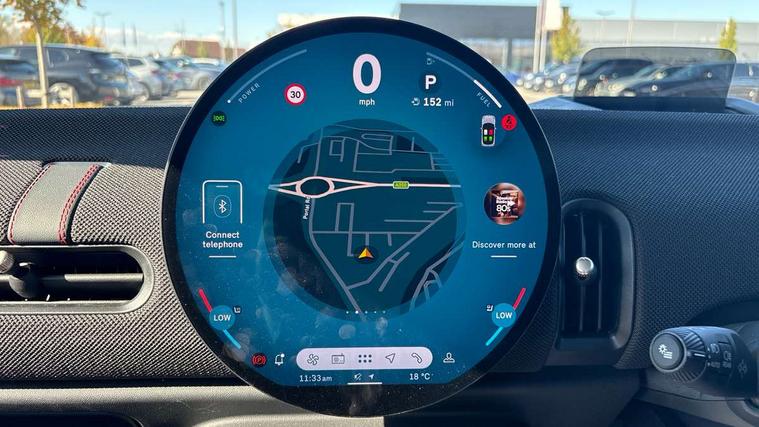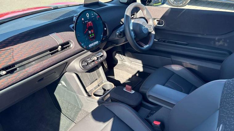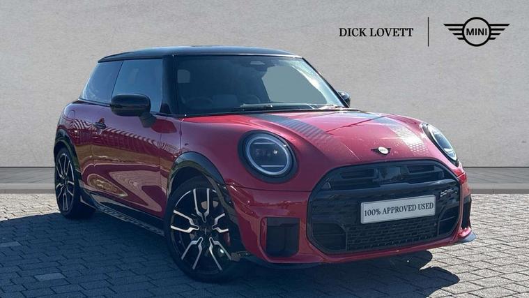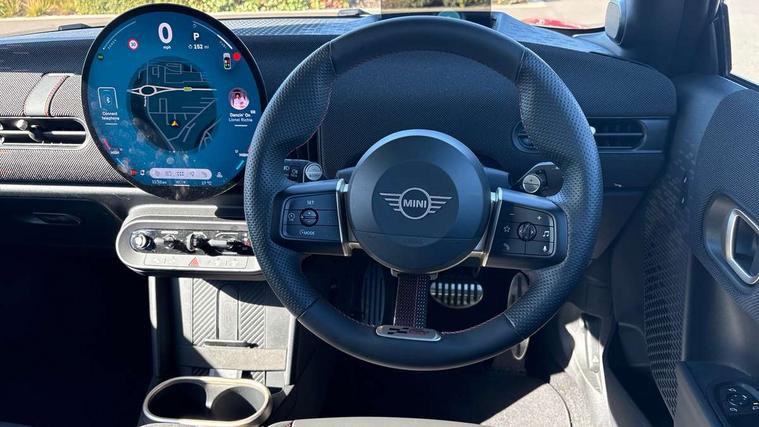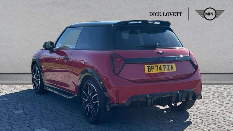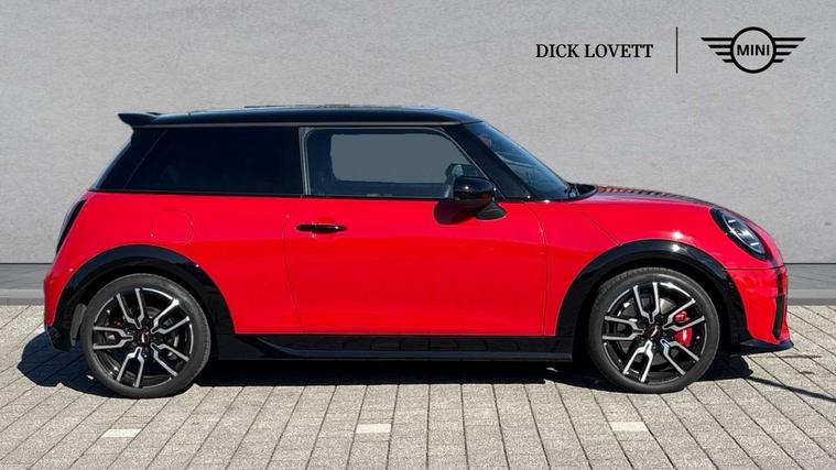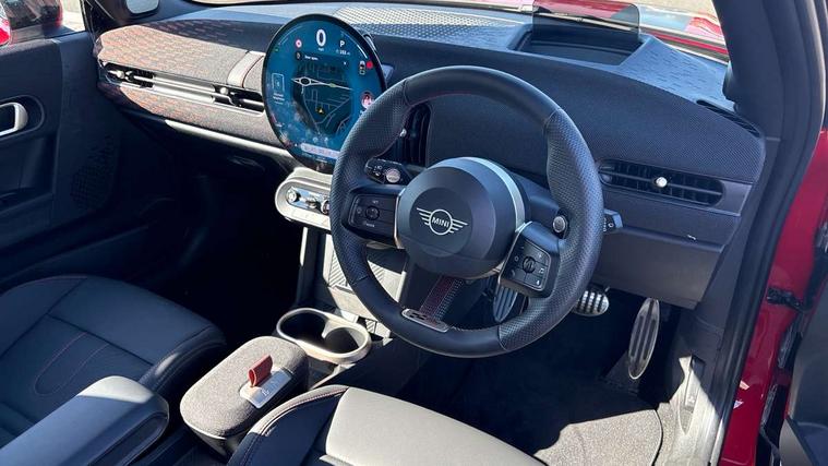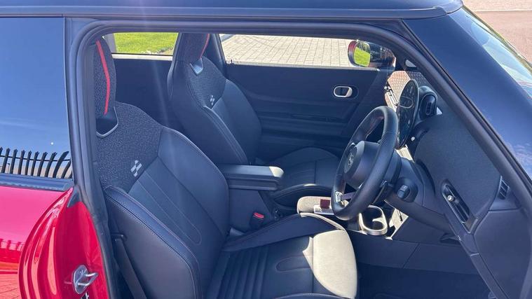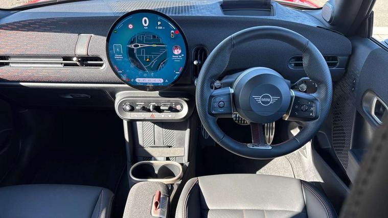 Central toggle bar, Circular OLED Screen, Compatible mobile phone bluetooth with audio streaming, Cruise control, Digital instrument cluster, Electro-mechanical speed dependant steering assistance, Emergency call service, JCW Experience mode, Mini navigation system, On board computer, Service interval indicator, Tailgate, 7 speed steptronic sport transmission with double clutch, Adaptive suspension, DAB Digital radio, Harman Kardon sound system, Personal eSim, Adaptable light signatures, Auto headlights, Central exhaust tailpipe, Electric adjustable heated door mirrors, Electric front windows, Front and rear apron, Heated rear window, Heated windscreen washer jets, High gloss black wheel arches, High gloss hexagonal patterned grille surround, JCW body kit, LED daytime running lights, LED indicator lights, LED rear lights, Rain sensor window wipers, Rear fog lights, Rear roof spoiler with airblades, Rear window wiper, 2 seat bench in second row, 2 zone automatic air conditioning, 60/40 rear seat bench, Ambient lighting, Black lower band in high gloss, Cupholders, Dark headliner, Floor mats, Front and rear head restraints, Front compact armrest, Heated steering wheel, Height adjustable passenger seat, Lidded storage box in Black/Red knit, Luggage compartment lighting, Partially perforated vescin steering wheel with red accent, black/red decorative strap, Single front passenger seat, Stainless steel pedals, Steering wheel paddle shift, Sunvisors with vanity mirrors, Vescin/Cord upholstery, Driving assistant pack - Cooper Hatchback, Level 1 pack - Mini Hatchback, Park assistant pack - Cooper Hatchback, 3 point seatbelts on all four seats, 6 Airbags - front, side, head and seat belt tensioners, Acoustic pedestrian protection, Anti-lock braking system (ABS), DSC - Dynamic Stability Control, Electronic parking brake, Front and rear disc brakes, Front ISOFIX (iSize), Front passenger airbag deactivation, JCW Sport Brakes, Red brake callipers, Traction control, Tyre pressure monitoring system, Alarm, Immobiliser, Remote central locking, Black/Red decorative dash strap, JCW Black/Red dashboard knit, Tyre repair kit,