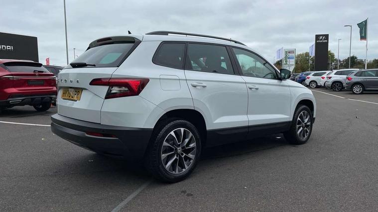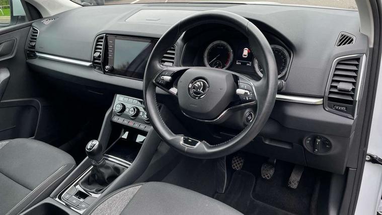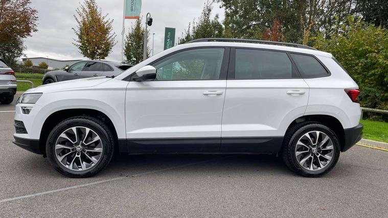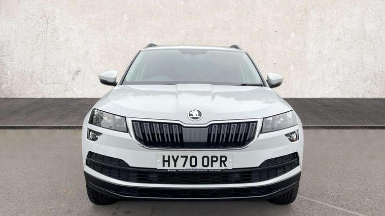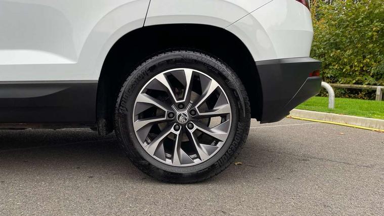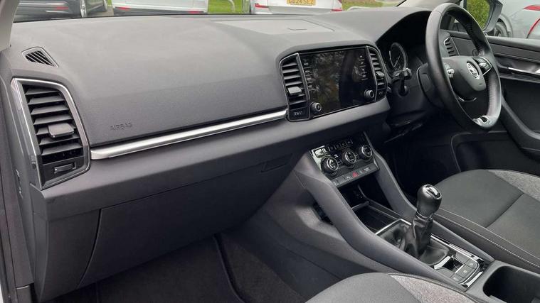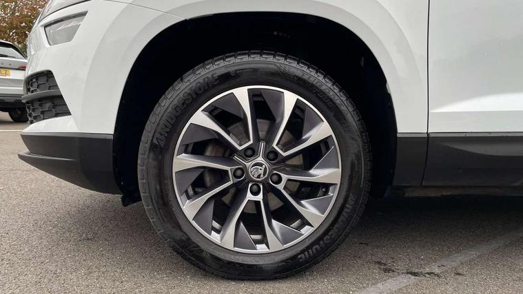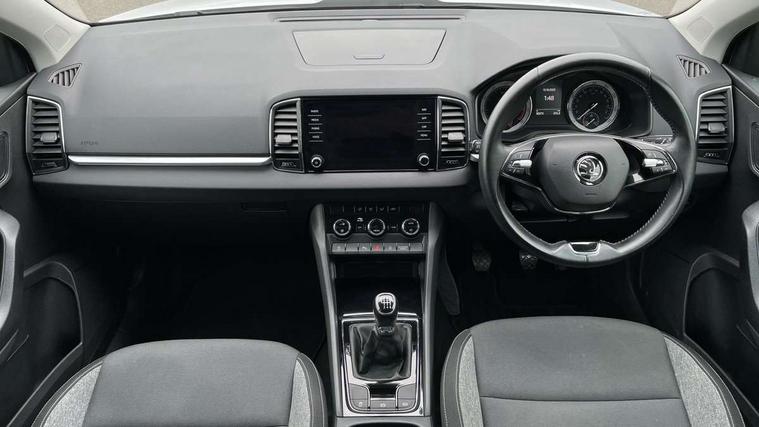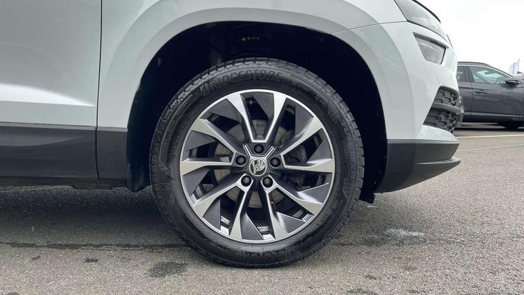 Amundsen satellite navigation with 8" touchscreen display with maps Europe, WLAN and web radio, Care connect, Driver alert system, Driver fatigue sensor, Driver profile selection, Electro-mechanical PAS, Multifunction colour trip computer, Outside temperature gauge, Rear view camera, Service interval indicator, SmartLink + wireless for Apple and wired for Android, Start/stop system with regenerative braking, USB C Port x 2 in front centre console, DAB radio with Bluetooth, SD card slot, USB connection, Acoustic glass, Aero front windscreen wipers with intermittent function, Automatic headlight control system, Black electric window control buttons, Body colour door mirrors and handles, Body coloured bumpers, Doors steps in front with Karoq badging, Electric front and rear windows with child proof lock, Electrically adjustable heated folding and auto dimming door mirrors, Heated rear windscreen, LED rear lights with high functionality, Light assistant (coming/leaving home/tunnel light), Privacy glass, Safety reflectors on front doors, Third brake light, 1.5 litre bottle holders in driver and front passenger door panels, 12V socket in boot, 12v socket in front centre armrest with storage compartment and rear air vents, 2 Folding hooks and nets in boot, 2 Front readings lights for driver and passenger, 3 rear height adjustable headrests, 4 foldable roof handles with rear coat hooks, 4 lashing points on luggage floor, Backrest release, Cargo elements in boot, Chrome inner door handles, Door sill scuff plates, Driver and passenger seats height adjust, Fabric upholstery, Folding tables on the front seat backrests, Front head restraints, Front seat and rear pockets, Height adjustable front three point seats belts with tensioners, Height/reach adjust steering wheel, Ice scraper, Illuminated and cooled glovebox, Illuminated luggage compartment, Isofix child seat preparation outer rear, Manual lumbar support for front seats, Net programme in boot, Pen holder, Pollen filter, Rear boot cover, Rear reading lights, Rear seats fixed folding and divided 60:40, Safety vest holder, Storage box in upper central dashboard closed, Sunvisors with illuminated vanity mirrors, Textile floor mats, Umbrella under passenger seat, LED Interior lighting pack with Skoda welcome logo - Karoq, Airbags - Front side, head, knee and curtain, Automatic door unlocking in case of crash, Automatic fuel cut off in case of crash, Driver airbag, Electronic parking brake with auto hold function, Emergency rear braking signal, ESC including ABS, MSR, ASR, EDS, HBA, DSR, RBS, MKB and traction control, Front assist radar scanning of the space in front of the car with automatic braking, Hill hold control, Passenger airbag with switch-off function, Pedestrian monitor, Seatbelt reminder signalisation and pretensioner for all seats, Three point seatbelts rear, Two tone horn, Tyre pressure display, Tyre pressure monitor, Alarm with interior monitoring, back up horn and tilt sensor with safe function, Electronic engine immobiliser, Remote central locking with 2 remote folding keys, Chrome framed air vents, 17" Aero alloy wheels with anti theft wheel bolts, Storage on wheel cover,