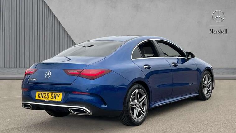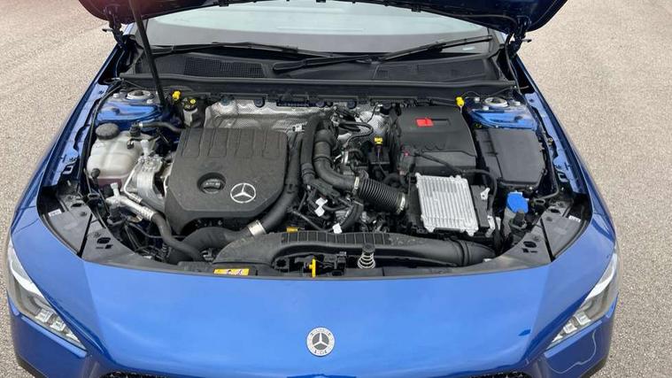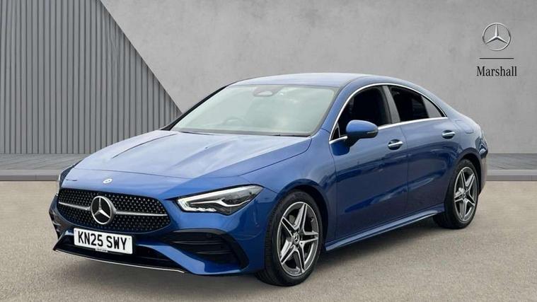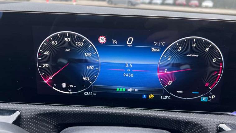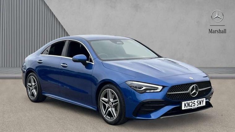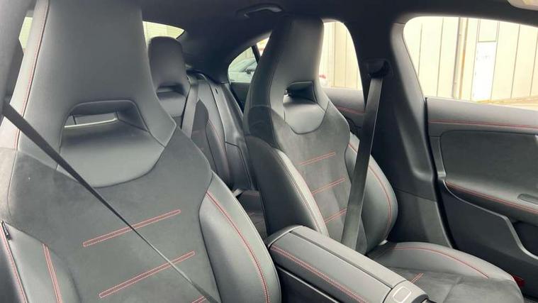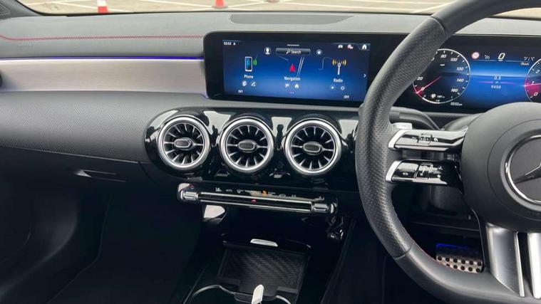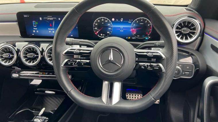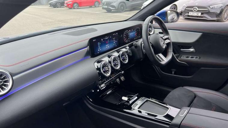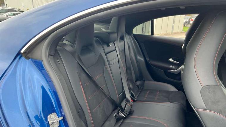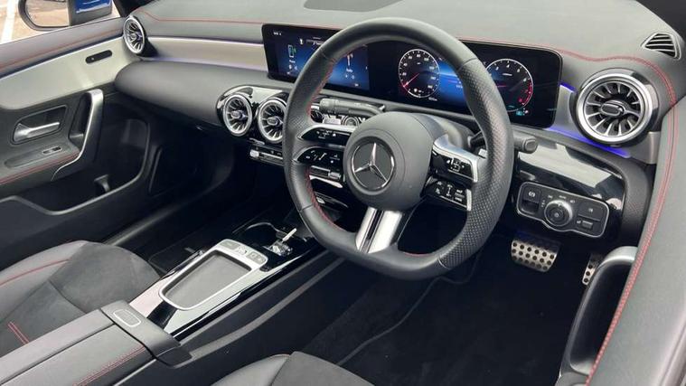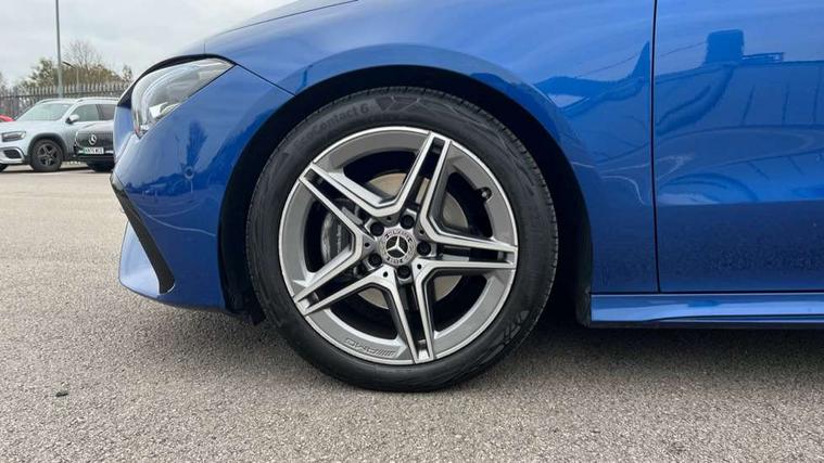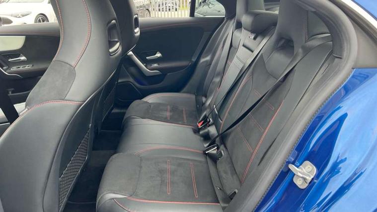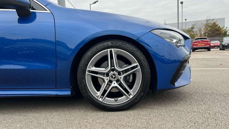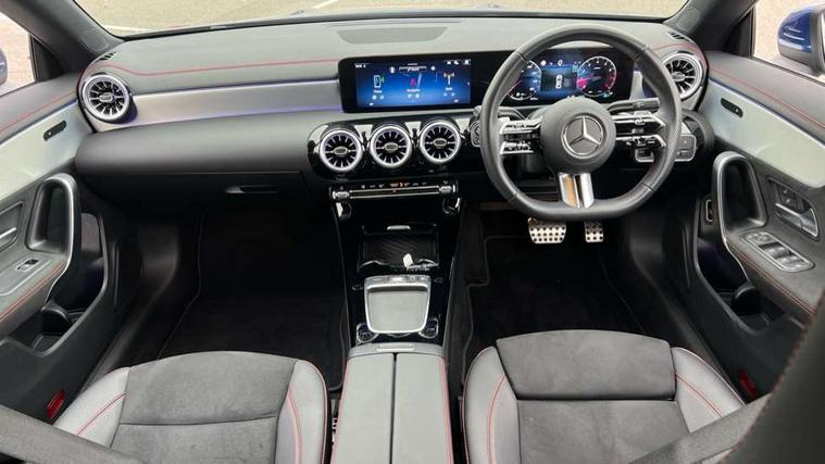 10.25 inch Instrument display with digital cockpit, 10.25 inch touchscreen central media display, Active lane keeping assist, Attention assist - Monitors steering behaviour and long journey fatigue, Blind spot assist, Bluetooth connection, Car wash mode, Cruise control with limiter, Direct steer system, DYNAMIC SELECT with a choice of driving modes (ECO, Comfort, Sport and Individual), ECO start/stop function, Fingerprint sensor, Fluid level warning indicator for fuel, oil, coolant and washer fluid, Hard-disk navigation, Hey Mercedes Voice activation, Lamp failure indicator, Mercedes me connect including emergency call system, accident recovery, breakdown and maintenance management, Mercedes me remote services, Outside temperature gauge, Owners manual in English, Pre-installation of private car share, Radio aerial integrated into front and rear windshields, Service indicator (ASSYST), Smartphone integration with Apple CarPlay and Android auto, Speed limit assist, Trip computer in multifunction display with current consumption indicator, Wireless charging in the front centre console, Comfort suspension with ride height lowering, Rear axle multi-link, DAB digital radio tuner, MBUX multimedia system, Mercedes Benz sound system (100 W) with 6 speakers, Pre installation for Mercedes Benz Link, Adaptive brake lights, AMG body styling with AMG front apron and rear apron and visible exhaust tailpipe in chrome trim elements, Body colour door handles, Electric windows, Electrically adjustable and heated door mirrors with integrated LED indicators, Exhaust system with 2 Visible tailpipe trim elements and rear apron with trim in chrome, Hand free access, Headlamp assist automatic headlamp activation, Heated glass rear windscreen + timer control, High gloss aluminium beltline strips, High level LED third brake light, Interior mirror with black reading lamps and frameless, LED high performance headlamps with integrated LED daytime running lights and adaptive highbeam assist, LED tail lamp, Privacy glass with dark tinting on rear side windows and rear window, Radiator grille with Mercedes-Benz pattern in chrome and central Mercedes star, single louvre in high-gloss black with chrome inserts, Rain sensing windscreen wipers with two sensitivity settings, Rear boot, Rear fog lamp, Rear side wing doors, Variable front intermittent wipers, Window line trim strip in high gloss aluminium, 3 seat bench in 2nd row, 3 twin spoke flattened multifunction steering wheel in nappa leather - horizontal twin spoke in high gloss black, vertical twin spoke in silver chrome, 4 way lumbar support, 40:20:40 split folding rear seat backrests, Air conditioning - One zone THERMATIC automatic climate control with automatically controlled air distribution, Air vents with surround in silver chrome, Artico man-made leather/Microcut microfibre upholstery, Automatic child seat recognition sensor, Black roof lining, Brushed stainless steel sports pedals with rubber studs, Floor mats with stitched AMG lettering, Fluorescent jacket, Front centre armrest with stowage, Galvanished gear shift paddles in silver chrome, Heated front seats, Interior lighting - 64 colour Ambient lighting, Luggage net on driver/front passenger seat backrest, Manually height and reach adjustable steering column, Rear head restraints, Single front passenger seat, Sport seats with fixed head restraints, Stowage compartment in centre console with retractable cover, Sunvisors with illuminated vanity mirrors, Twin front cupholders, Two outer rear seat isofix and top tether child seat fixing points, Keyless go comfort pack - CLA, Light and sight pack - CLA, Mirror pack - CLA, Parking pack with reversing camera - CLA, Seat comfort pack - CLA, USB package plus - CLA, Active bonnet pedestrain safety measure which detects an impact and raises bonnet by 65mm, Active brake assist includes forward collision warning system with autonomous braking, Adaptive brake assist with hold function and hill start assist, Anti lock braking system (ABS) with brake assist, Black seat belts, Bonnet with power domes, Brake calipers with Mercedes-Benz lettering, Brake pad wear warning indicator, Childproof locks manually operated for rear doors and electrically operated for rear power windows, Crash responsive emergency lighting, Driver and front passenger head and sidebags, Driver and front passenger windowbags, Drivers knee airbag, Dual stage driver and front passenger airbags, Electric parking brake, Electronic stability programme with acceleration skid control, ESP curve dynamic assist, Front and rear seatbelt reminder, Front passenger seat occupancy sensor, Perforated front brake discs, Sports braking system, Three point rear seat belts, Tyre pressure monitoring system, Warning triangle and first aid kit, Alarm system with immobiliser and interior protection -Thatcham category 1, Guard 360 deg vehicle protection - tow away protection with visual, acoustic warning, interior monitoring, preinstallation for parking damage, Remote central locking and crash sensor with emergency opening function, Light aluminium with longitudinal grain interior trim, 18" AMG 5 twin spoke light alloy wheels painted in termolite grey with high sheen finish, Summer tyres, Tirefit tyre sealant kit,