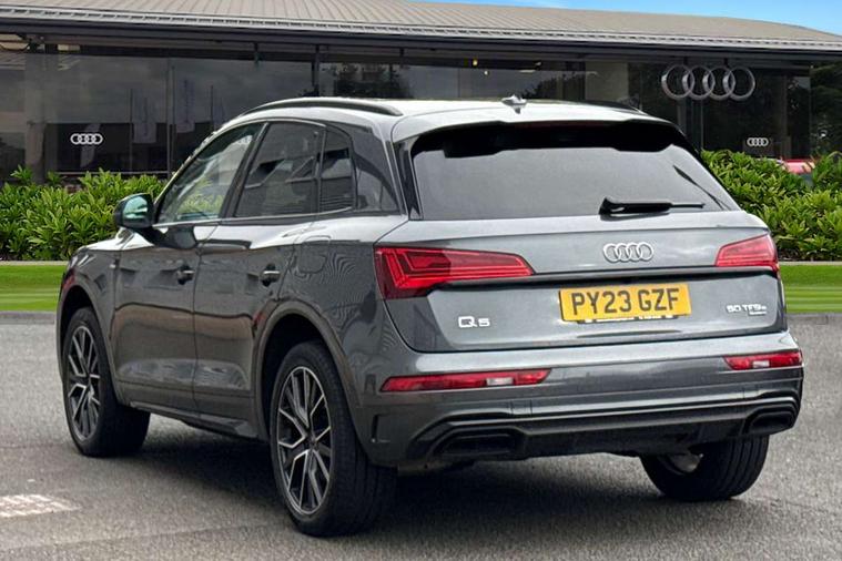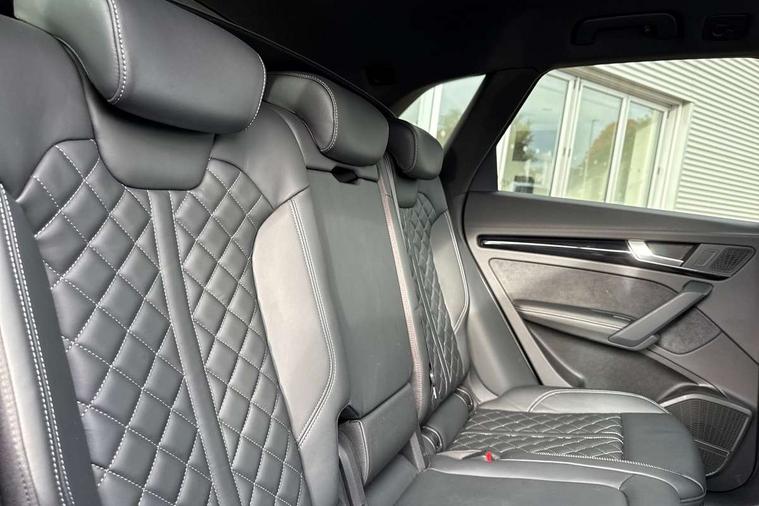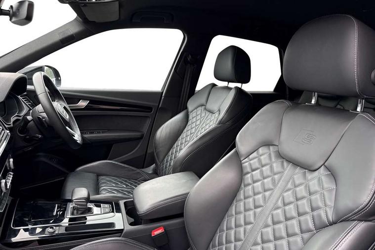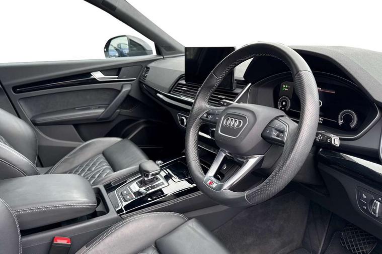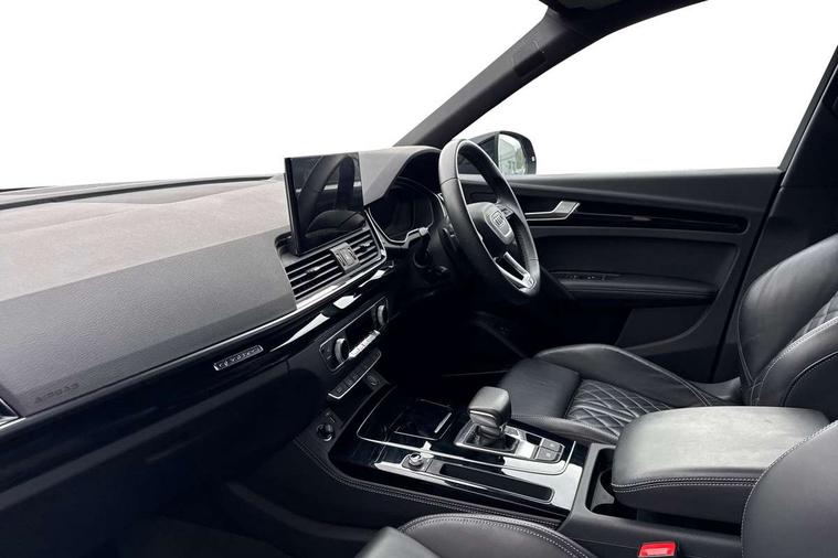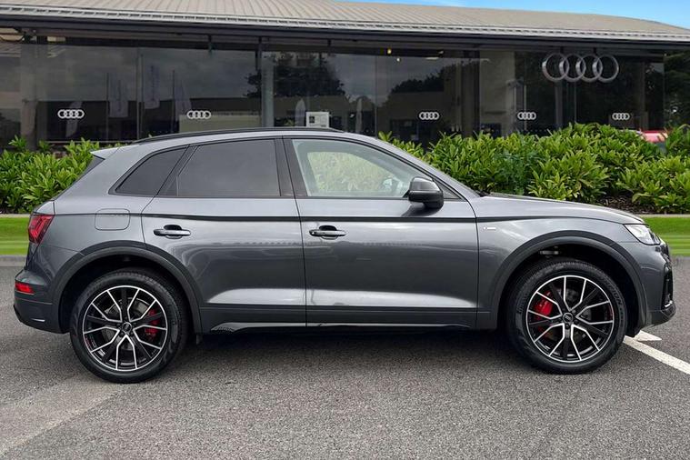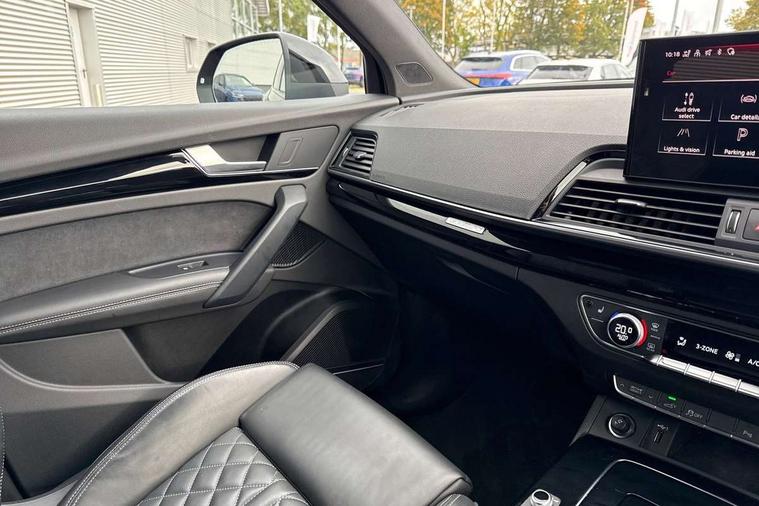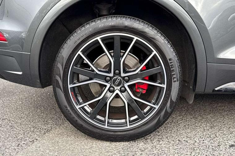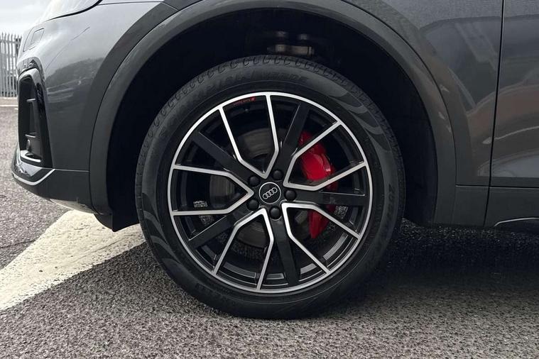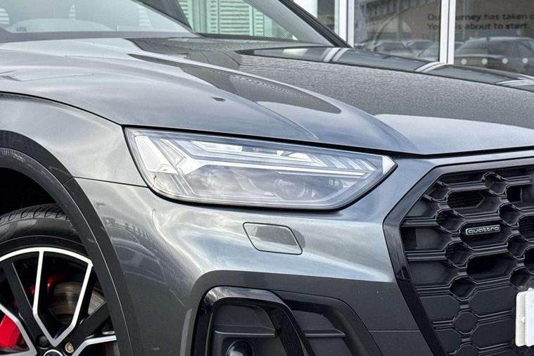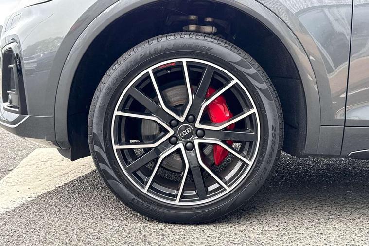 360 degree camera with top view, Acoustic front and rear parking sensor, Advanced key with electric hands free boot opening system, Audi connect safety and service (e-call), Audi connect with Amazon Alexa Integration, Audi drive select, Audi virtual cockpit with 12.3" screen with specific display, Audi wireless smartphone interface, Automatic start-stop system with coasting functionality and efficiency programme, Bluetooth interface, Electro - mechanical power assisted steering, MMI navigation plus with 10.1" touch screen, Power tailgate, Service interval indicator, Voice control system with Audi hotword activation "Hey Audi", 3 pin 10 amp domestic charging cable, 7.4 kW onboard charger, Dynamic suspension, Industrial connector CEE 32A, 230V, Quattro on demand, Type 2 mode 3 22kW 32 amp charging cable, Type 2 socket for AC charging, 2 x USB charging port with aux input socket, Bang + Olufsen sound system, DAB Digital radio, Acoustic windscreen, Audi matrix LED headlights with dynamic front and rear indicators, Audi rings at front and rear in black, Audi rings decal on rear doors, Auto dimming door mirrors, Auto dimming frameless rear view mirror, Automatic headlight adjustment, Automatic headlights and windscreen wipers, Black roof rails, Body colour bumpers, Body colour underbody protection, Chrome plated exhaust trims, Daytime running lights, Door sills in Selenite silver, Electric adjustable/heated/folding door mirrors, Front air inlet surrounds in anthracite black, Front and rear electric windows, Headlight washers, High gloss black B pillar trims and triangular rear door trim, High level LED brake light, Rear chrome trim strip below lights, Rear privacy glass and rear side windows, Rear side wing doors, Rear wiper, Roof bars, S Line rear spoiler, 3 rear headrests, 3 seater rear seat bench, 4 way electric lumbar support for driver and front passenger, Black cloth headlining, Comfort front centre armrest, Contrast stitching on seats, steering wheel and gear lever gaiter, Deluxe 3 zone electronic climate control, Electrically adjustable front seats, Fine Nappa leather upholstery with diamond pattern contrast stitching + front sport seats with S embossed logo, Front/rear floor mats, Gear lever in black leather, Heated front seats, Height adjustable front head restraints, Height/reach adjustable steering column, Illuminated door sill trims with S logo, Luggage compartment cover, Rear seat bench plus-adjust for forwards/backwards position/backrest angle, cupholders in the armrest, load through hatch and remote backrest release, Single front passenger seat, Sunvisors with vanity mirrors, Trunk roller cover, Black styling package - Q5 Edition 1, Extended interior upholstery pack - Q5, Extended LED Interior multi coloured Lighting Pack - Q5, 3 point seatbelts on all seats, 6 airbags - Driver, front passenger, curtain and side airbags, Electrically operated child locks on rear doors, Electromechanical parking brake, Electronic stabilisation control including ABS, ASR and EDL, First aid kit with warning triangle and vests, Front and rear brake calipers painted in red, Front passenger airbag deactivation, Hill descent control, Hill hold assist, ISOFIX child seat mounting for front passenger seat and ISOFIX child seat mounting with Top Tether for outer rear seats, Multi collision brake assist, Pop-up bonnet for pedestrian protection, Pre sense city, Seat belt force limiter, Seatbelt monitoring, Tyre pressure warning, Anti theft alarm, Anti-theft wheel bolts, Keyless Go access/ignition system, Remote central locking, Air vents inserts and centre console in gloss black, Piano black finish inlay, Tool kit, Tyre repair kit,