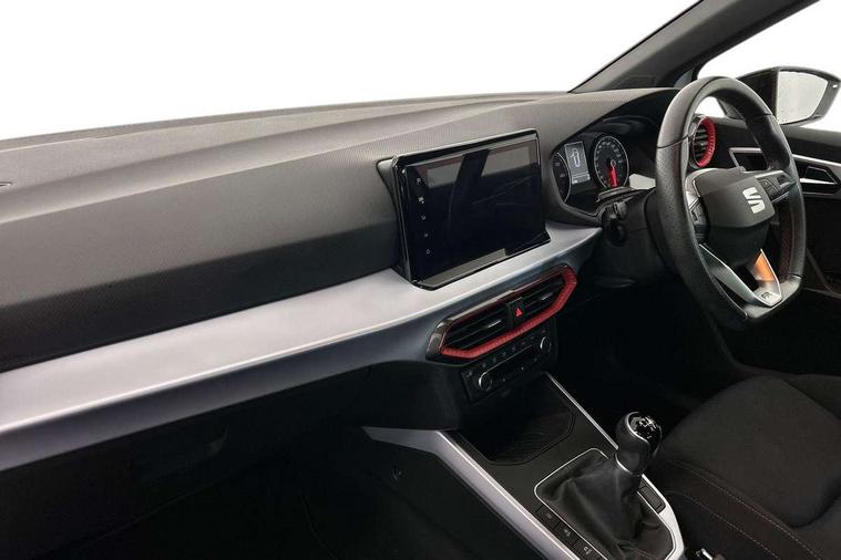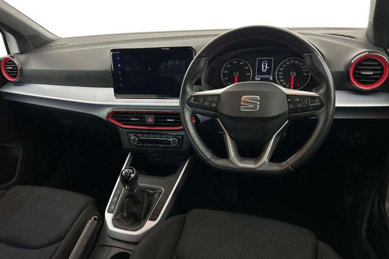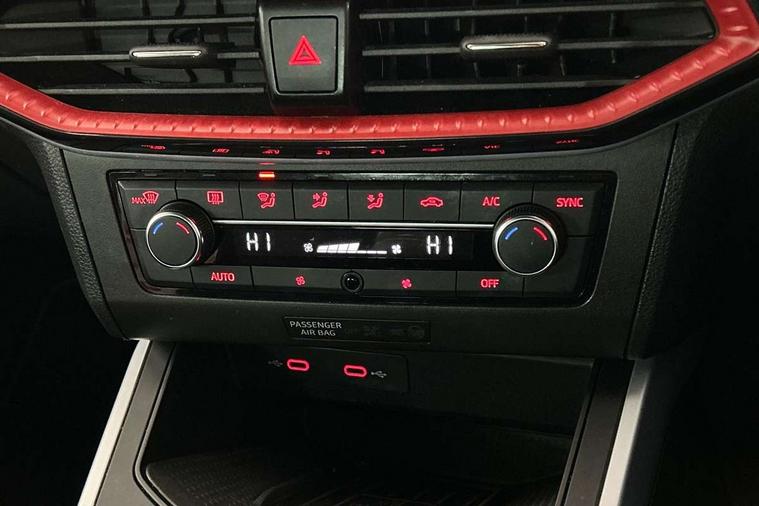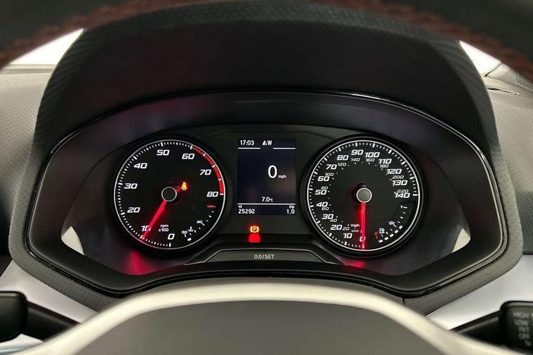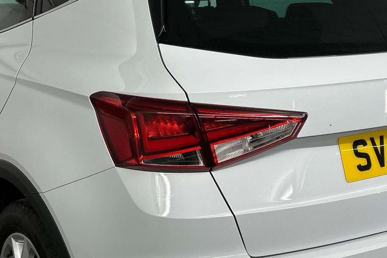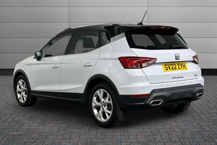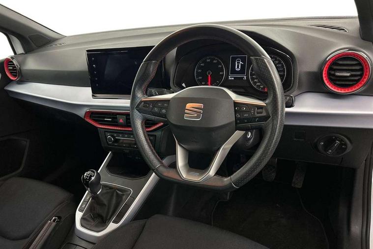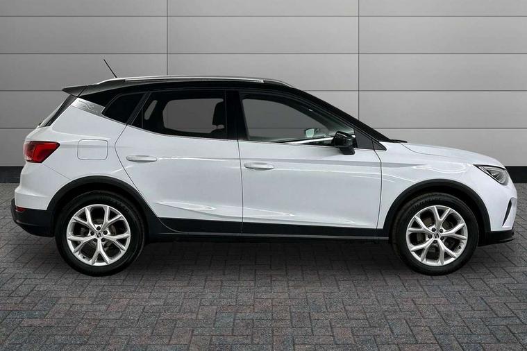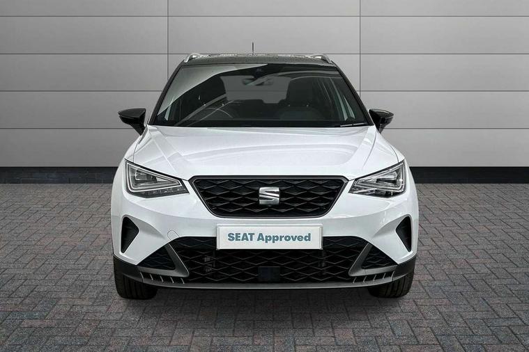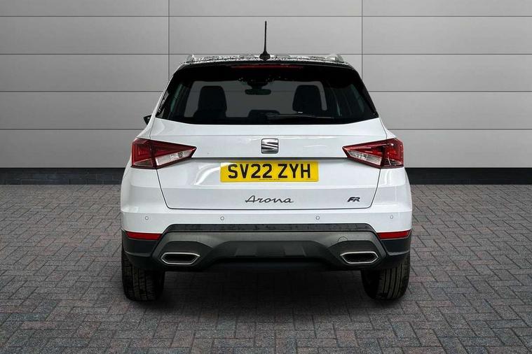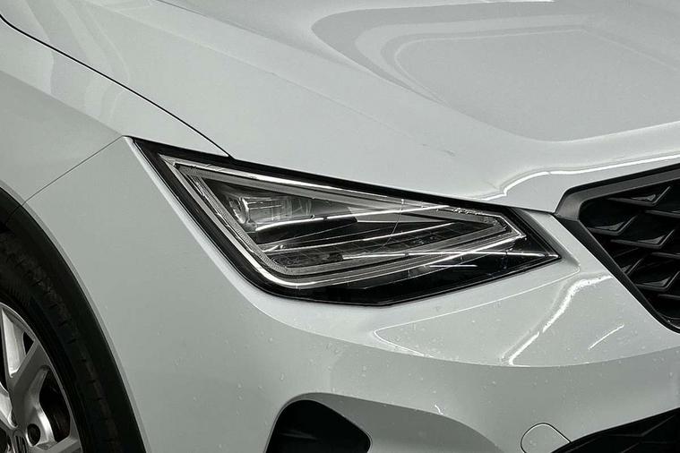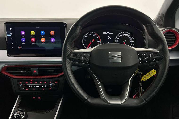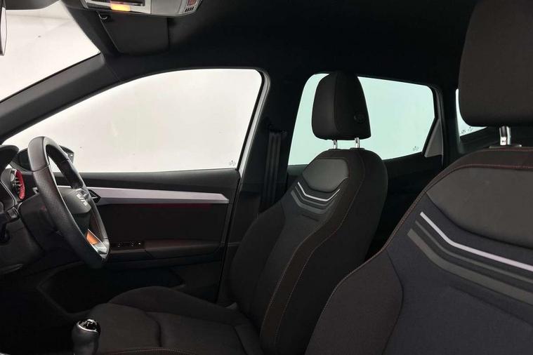 'Lights On' Reminder warning buzzer, 8" Digital cockpit, Digital clock, E-call, Electric speed sensitive power steering, Full Link Smartphone Integration with Mirror Link, Apple Car Play, Google Android Auto with USB Type C cable for Apple and Android compatibility, Lane keeping system, Low fuel warning light, Outside temperature display, Rear parking sensor, RPM counter, Seat connect with safety, service, remote and online, SEAT Drive profile - Four different models normal-sport-eco-individual, steering response, throttle response, Trip computer, Bluetooth interface for hands free and audio streaming, DAB digital radio and AM/FM radio, Steering wheel mounted audio controls, Anti theft roof antenna, Auto dimming interior rear view mirror, Automatic activation of hazard warning lights, Body coloured bumpers, Body coloured door handle inserts, Chrome roof rails and window surrounds, Dark tinted rear windows, Electric front/rear windows, Electrically adjustable, heated and folding door mirrors, Front fog lights with cornering function and rear fog light, FULL LED automatic headlights with dynamic headlight range control, coming and leaving home, LED daytime running lights, LED rear tail lights and licence plate lights, Protective side mouldings, Rain sensing wipers, Rear side wing doors, Rear spoiler, Rear window wash/wipe, Roof colour door mirrors, Third brake light, Twin exhaust pipe styling hidden exhaust pipe, Visible VIN plate, Windshield wiper with intermittent control and potentiometer, 2 cupholders, 3 seat bench in 2nd row, 60/40 split folding rear seat, Aircare filter, Black interior roof, Cloth upholstery, Double boot floor, Driver sunvisor with covered mirror + card holder, Dual zone climate control, Front courtesy light with 2x front and 2x rear reading lights, Front sport seats, Gear shift indicator, Height adjustable front seats, Height/reach adjustable steering column, Illuminated boot, Instrument lighting with brightness control, Interior ambient lighting, Interior light in footwell, central console and door panel, ISOFIX points in outer rear seats with top tether anchorage points, Passenger sunvisor with vanity mirror, Perforated flat bottomed leather steering wheel/gear knob/handbrake with red stitching and FR logo, Single front passenger seat, Two front and three rear height adjustable headrests, Connectivity pack plus - Arona, Interior chrome pack - Arona, 3 point seatbelts on all rear seats, ABS, Active front headrests, Child locks on rear doors, Driver and front passenger airbags with front passenger airbag de activation, front side and curtain airbags, Electronic stability control, Emergency Brake Assist (EBA) and front assist, Front and rear seatbelt reminder, Hill hold control, Multi-Collision braking, Tiredness recognition system, Traction control, Tyre pressure monitoring system, Alarm with back-up horn, Electronic engine immobiliser, Locking wheel bolts, Remote central locking + deadlocks, Tow away protection, Titan black dashboard, 17" Dynamic alloy wheels,