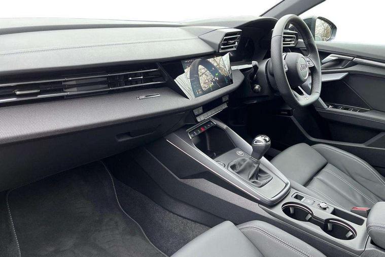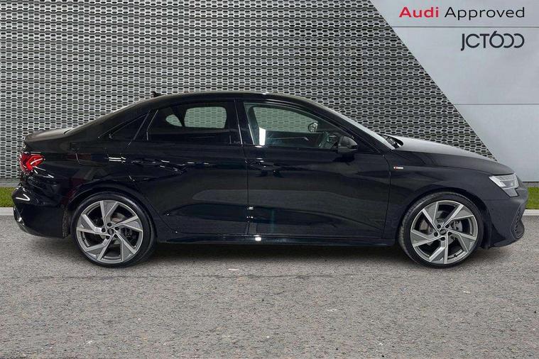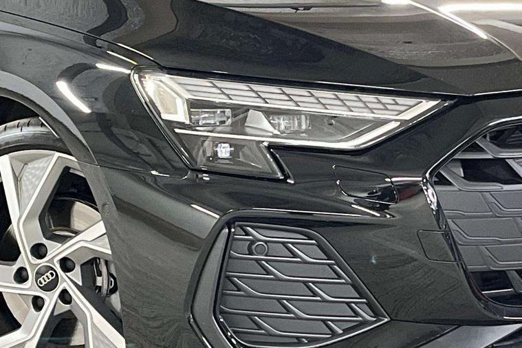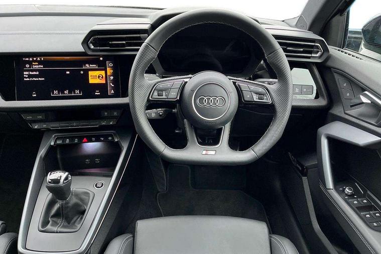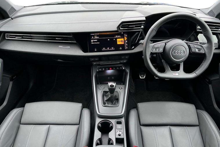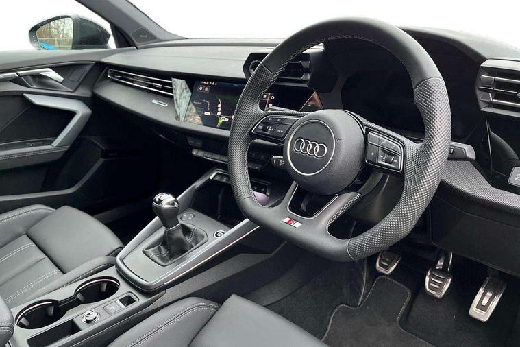 Adjustable speed limiter, Audi drive select, Audi smartphone interface with app store includes wireless Apple carplay, Android auto and Amazon alexa integration, Audi virtual cockpit plus - 12.3" full HD resolution dynamic digital instrument cluster, Automatic start/stop system with recuperation, Bluetooth interface, Camera based traffic sign recognition, Collision avoidance assistant, Cruise control, Distraction and Fatigue warning, e-Call (emergency call), Electromechanical power speed sensitive steering, Lane departure warning system, MMI Navigation Plus with high resolution 10.1" colour touch screen display, Park Assist with parking system Plus, Service indicator, Trip computer, Voice control system with natural language interaction, Sports suspension, Audi Phonebox light with wireless charging, Audi sound system - 10 loudspeakers including centre loudspeaker and subwoofer, DAB Digital radio, USB ports with charging function in the rear, Acoustic glass windscreen, All weather light, Anthracite grey Audi rings (front and rear), Audi beam uses LEDs to project the Audi logo onto the ground as you exit your A3, Auto dimming frameless rear view mirror, Automatic dynamic range control, Black accents front and rear bumpers, Black accents in the area of the Audi single frame grille, Black accents window trims strips, Dipped beam, main beam, position light and turning light, Electrically adjustable/heated/folding/auto dimming door mirrors with integrated LED indications + kerb view function for passenger side, Exterior model badging, Front and rear side air inlets in grained matt black with dark liquid chrome frame, Front electric windows, Heat insulating glass windscreen, Illuminated door sills with aluminium inserts at the front with S logo, Intersection light, LED 3rd brake light, LED brake lights, LED daytime running x3, LED headlights with LED rear lights and dynamic rear indicators, LED rear number plate lights, LED reverse light, LED tail lights, Light and rain sensors, Manoeuvring light, Motorway light, Privacy glass - dark tinted rear window, rear door and side windows, Rear boot, Rear diffuser and grill in grained matt black with inlay in dark liquid chrome, Rear electric windows, Rear side wing doors, Static Cornering lights, 12V socket and storage compartment in front centre console, 3 seat bench in 2nd row, 3 spoke flat bottomed multi-function leather sport steering wheel, 3-zone deluxe automatic air conditioning, 4 way electrically adjustable lumbar support for driver and front passenger, 40/20/40 split folding rear seat bench, Black cloth headlining, Black front and rear floor mats, Front and rear centre armrest in artificial leather with contrasting stitching on armrests and instrument panel, Front and rear headrests, Heated front seats, Height and reach adjustable steering wheel, Manual boot compartment lid, Manually adjustable front seats, Rear centre armrest with cupholder, S badging on the steering wheel, Seat side bolsters, Single front passenger seat, Stainless steel pedals and front footrest in black, Twin leather upholstery with front sports seats S embossed logo, Aluminium interior elements pack - A3, 3x3 point rear seat belts, Driver and front passenger airbag with passenger airbag deactivation, Electronic Stabilisation Control (ESC) including ABS, ASR and EDL, First aid kit with warning triangle and 2 safety vests, Front side airbags with head airbags and interaction airbag, Hill hold assist, Pre-sense front with pedestrian and cyclist detection, Seatbelt monitoring, Tyre pressure loss indicator, Anti theft alarm, Anti-theft wheel bolts, Electronically operated child locks, Immobiliser, Remote central locking with safelock, Black dashboard,