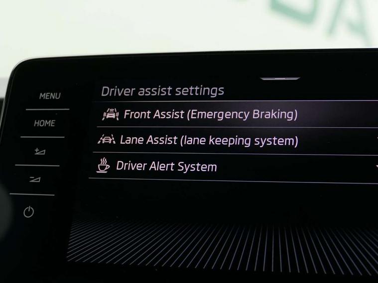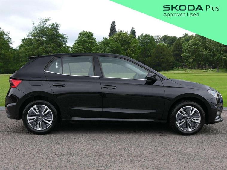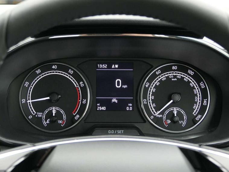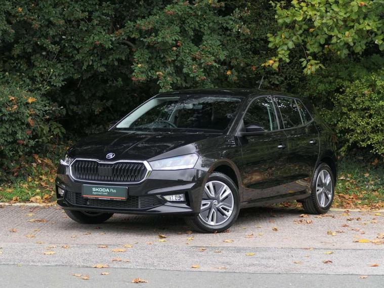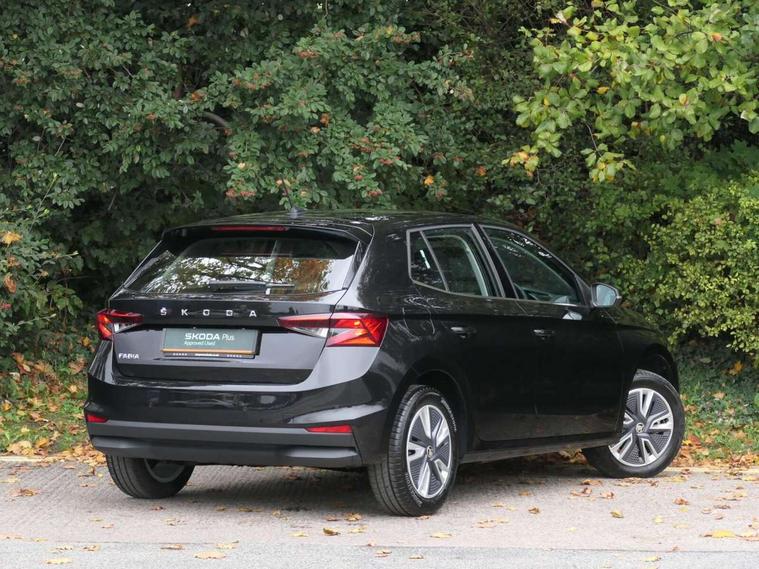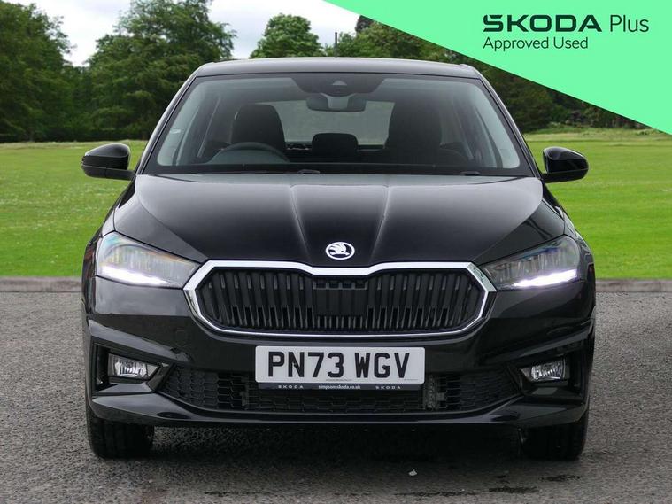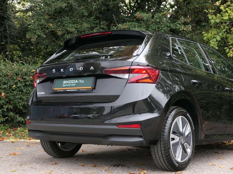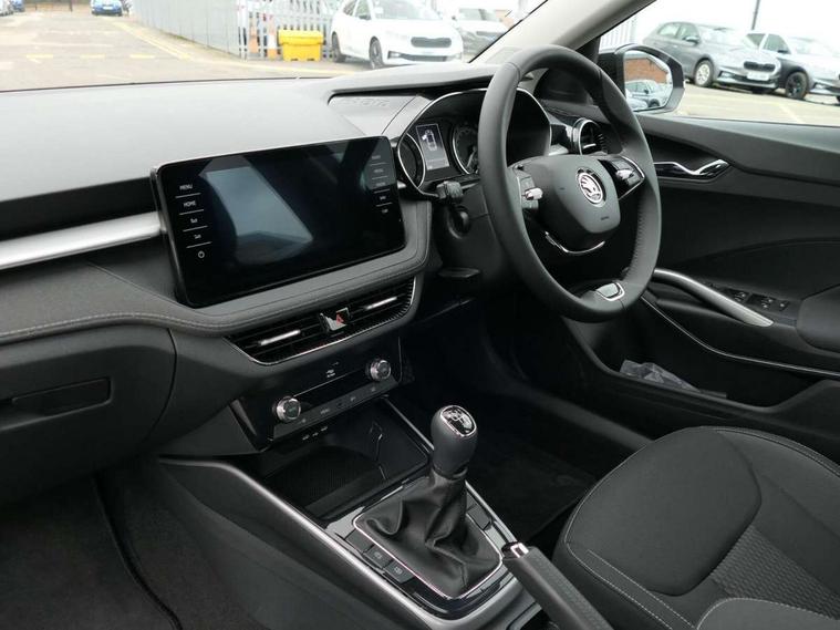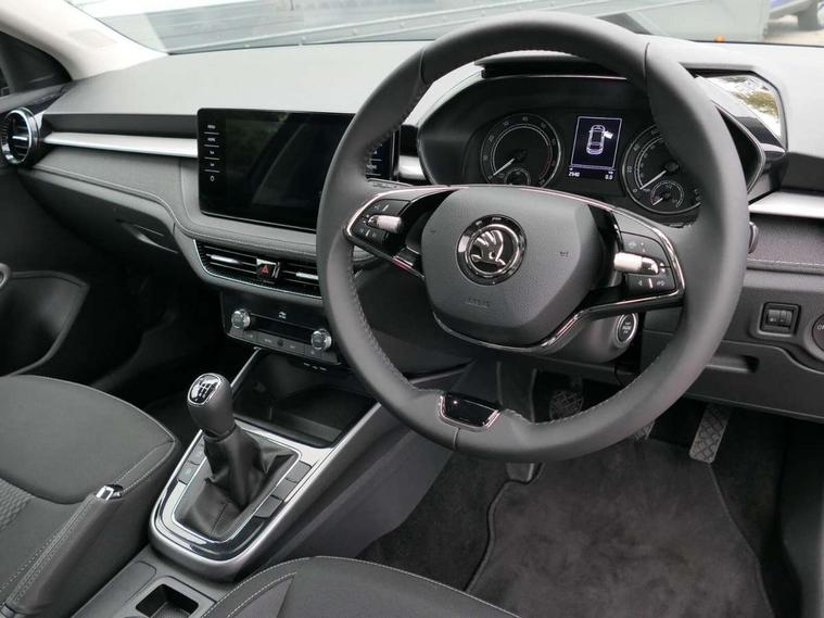Bluetooth connection, Driver alert system - DAS, Electromechanical power steering, Exterior temperature gauge, Service interval indicator, 2x USB-C in the front (for data transmission and charging), 6 Speakers (4 in front and 2 in rear), Auxiliary socket for external MP3 player, DAB digital radio reception, Web radio, Auto dimming rear view mirror, Body colour door mirrors, Body coloured bumpers, Chrome window surround, Door mirror integrated indicators, Electrically adjustable and heated door mirrors, Front and rear electric windows, Front window wiper intermittent control, Headlight range control - Automatic, Ice scraper in fuel cap, LED daytime running lights with coming and leaving home feature, Rear LED fog light, Rear side wing doors, Rear window wiper with washing nozzles, Roof mounted spoiler, SKODA tailgate lettering in chrome, Third brake light, 3 rear headrests, Backrest split and folding, Central console with fixed cup holder and storage box, Chrome handbrake release button, Comfort seats, Fabric upholstery, Front centre armrest, Gearshift knob/handle in leather, Hand brake lever handle in leather, Height adjustable front headrests, Height adjustable front seats, Height adjustable steering wheel, ISOFIX and TopTether anchorage points to the outer rear seats, ISOFIX and TopTether on the front passenger seat, Luggage compartment lighting, Manually adjustable lumbar support in front seats, Pollen filter, Rear seat bench unsplit, Removable cup holder, Single front passenger seat, Storm grey headlining, Sun visors with mirror and airbag label on passenger side, Textile floor mats, Ticket holder, Umbrella in drivers door, Ambient lighting pack 2 - Fabia Hatchback, 3-point height adjustable front seats belts with pretensioner and force limiter, Automatic warning lights in case of crash, Driver and passengers airbag with switch off function, e-Call+, ESC including ABS, MSR, ASR, EDS, HBA and XDS, Front and rear seat belt warning, FRONT ASSIST (AEB City and AEB Inter Urban), Front side airbags, Head airbags, One tone horn, Pedestrian protection, Three rear 3-points safety seat belts with pretensioner and force limiter including stop function for outer rear seat belts, Tyre pressure monitoring system, Anti-theft alarm system including immobiliser, interior monitoring, backup horn, and towing protection, Chrome edged air vents, Satin black door and side trim panel in front, Anti-theft wheel bolts protection, Super-low rolling resistance tyres,