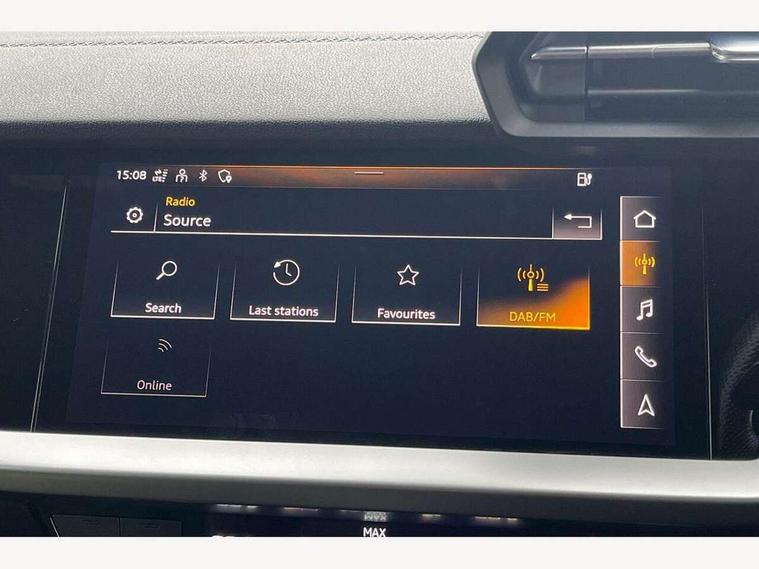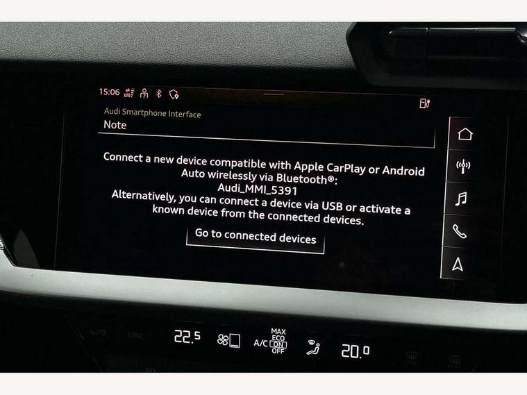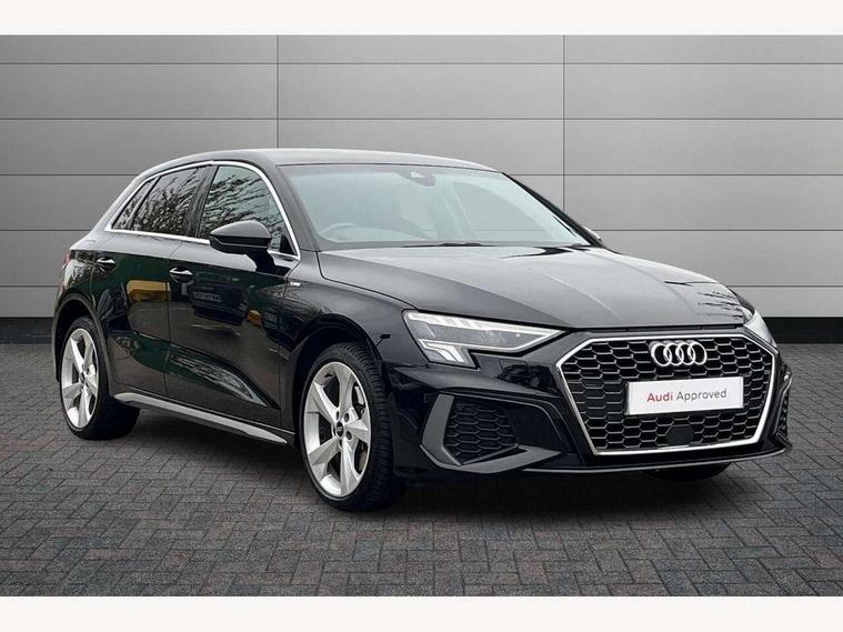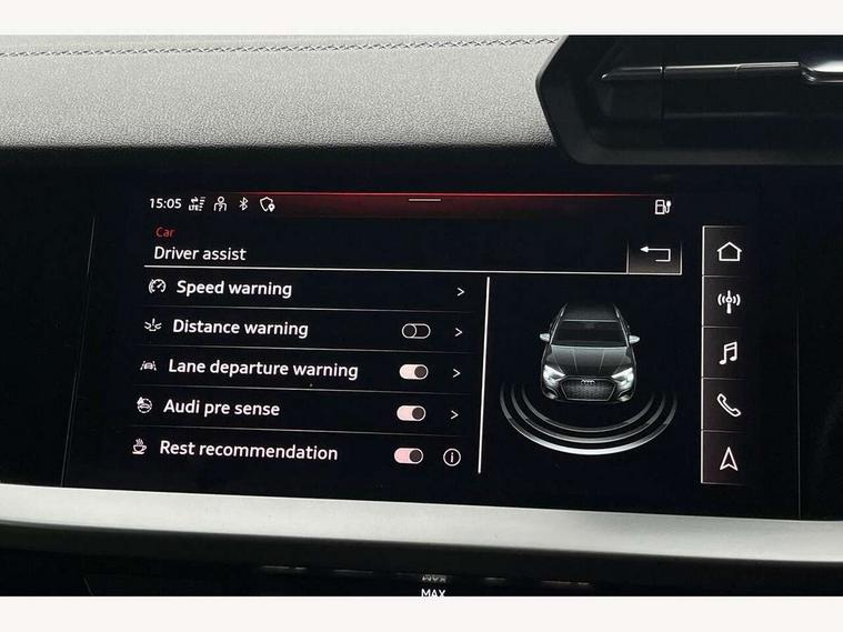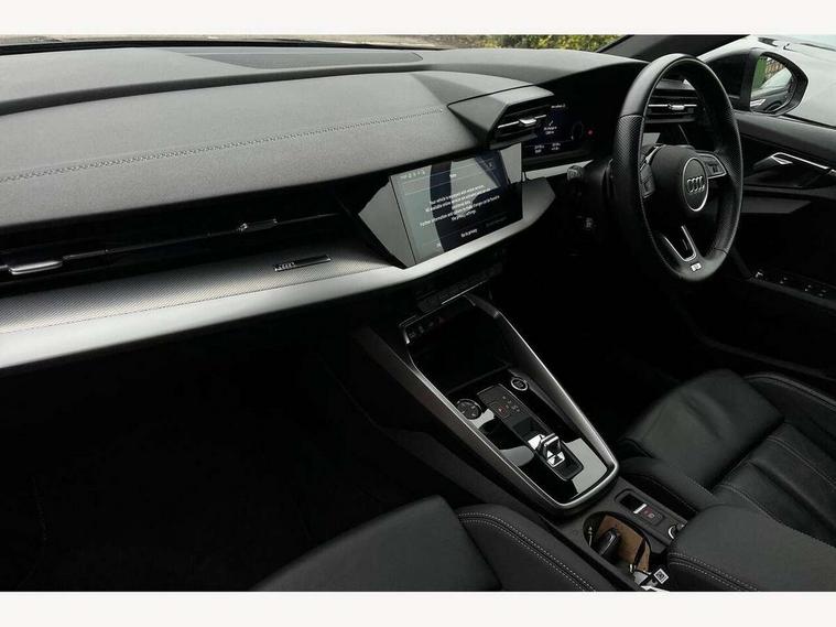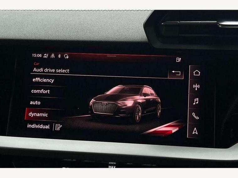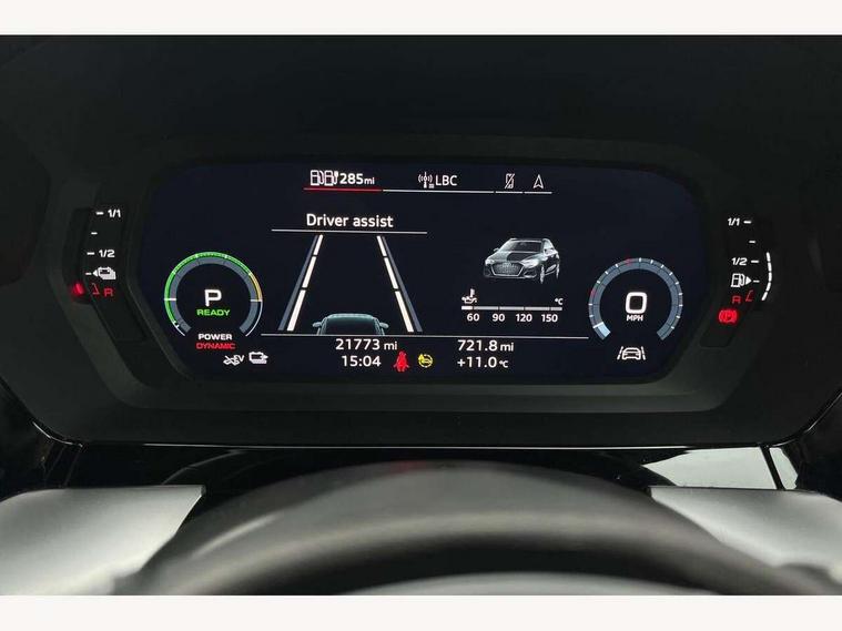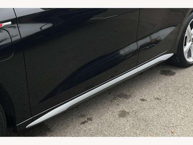 Audi drive select (Auto, Comfort, Dynamic, Efficiency and Individual), Audi smartphone interface, Audi Virtual Cockpit - 10.25" digital and colour instrument cluster, Automatic start/stop system with recuperation, Bluetooth interface, Collision avoidance assistant, e-Call (emergency call), Electromechanical power speed sensitive steering, Lane departure warning system, MMI Navigation Plus with high resolution 10.1" colour touch screen display, Service indicator, Trip computer, Voice control system with natural language interaction, 3 pin 10 amp domestic charging cable, 3.6 kw On-board charger, Standard suspension, Type 2 mode 3 32 amp charging cable, Type 2 socket for AC charging, 2xUSB-C connection with data and charging functions, 6 passive loudspeakers, DAB Digital radio, 3rd brake light, Acoustic glass windscreen, Aluminium window trim, Auto dimming frameless rear view mirror, Electrically adjustable/heated/folding/auto dimming door mirrors with integrated LED indications + kerb view function for passenger side, Front electric windows, Illuminated aluminium inserts front door sills with S logo, LED daytime running lights, LED headlights with LED rear lights and dynamic rear indicators, Light and rain sensors, Privacy glass - dark tinted rear window, rear door and side windows, Rear electric windows, Rear side air outlets in grained matt black, Rear side wing doors, Rear wiper, S line bumpers, S roof spoiler, 12V socket and storage compartment in front centre console, 3 seat bench in 2nd row, 40/20/40 split folding rear seat bench with cupholder, Black cloth headlining, Dual zone electronic climate control, Front and rear centre armrest in leather, Front and rear headrests, Front/rear floor mats, Height and reach adjustable steering wheel, Illuminated vanity mirror, Interior lighting - glove compartment light and right hand side, Luggage compartment floor covering, Manual boot compartment lid, Manually adjustable front seats, Seat side bolsters, Single front passenger seat, Stainless steel pedals and front footrest in black, Twin leather upholstery with front sports seats S embossed logo, Aluminium interior elements pack - A3 Sportback, S line styling pack - A3 Sportback, 3x3 point rear seat belts, Audi pre sense front, Driver and front passenger airbag with passenger airbag deactivation, Electronic Stabilisation Control (ESC) including ABS, ASR and EDL, First aid kit with warning triangle and 2 safety vests, Front side airbags with head airbags and interaction airbag, Pre-sense front with pedestrian and cyclist detection, Seatbelt monitoring, Tyre pressure loss indicator, Anti theft alarm, Anti-theft wheel bolts, Immobiliser, Manual child locks, Remote control central locking, Accent surfaces in the dashboard and centre console in platinum grey silk effect paint finish, Dark spectrum aluminium inlays, Tool kit, Tyre repair kit,