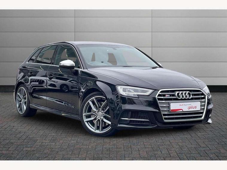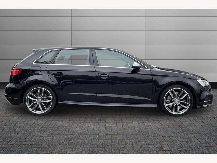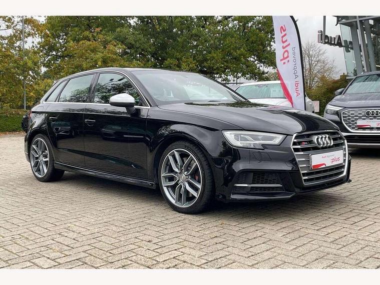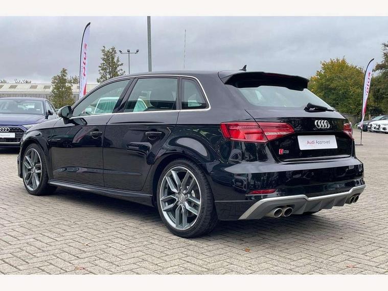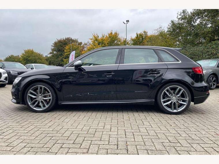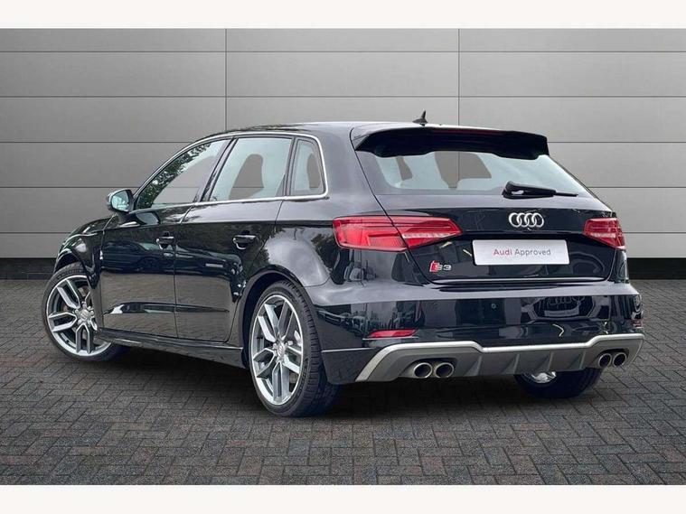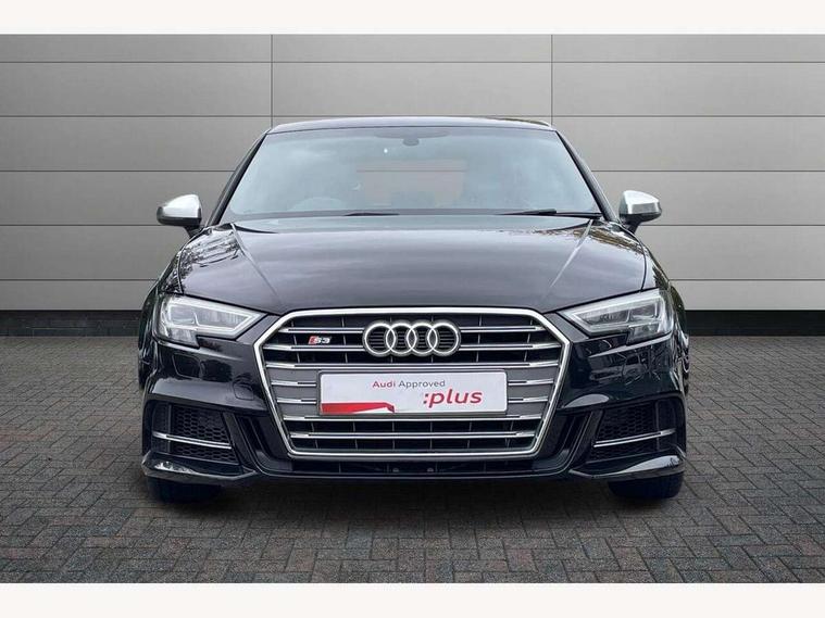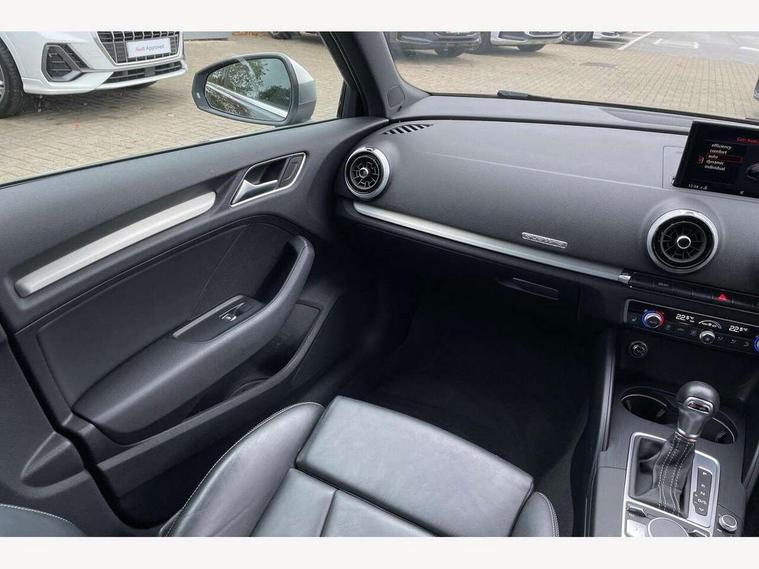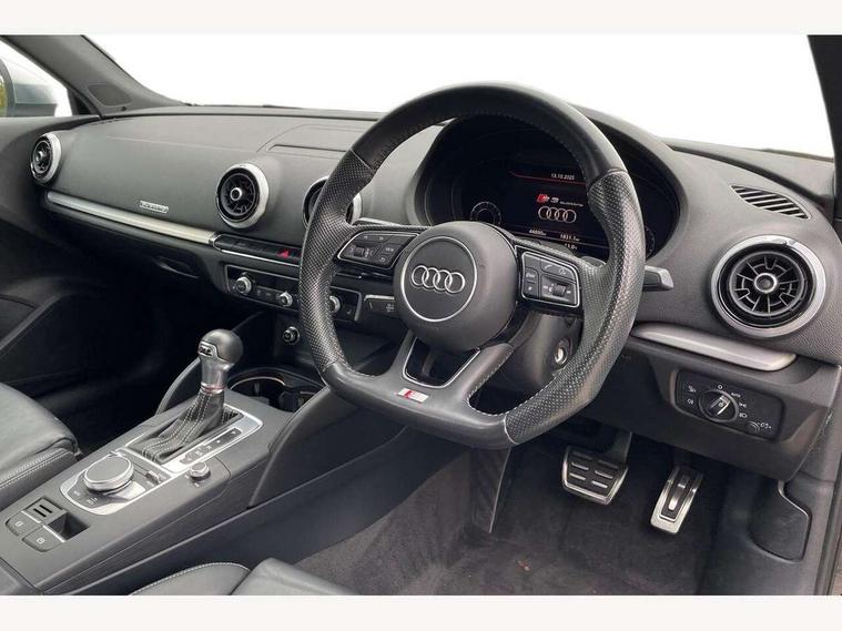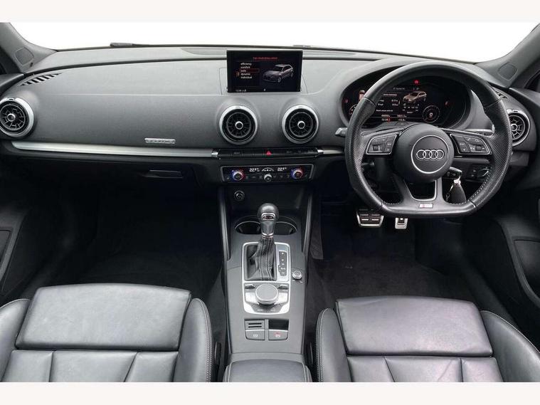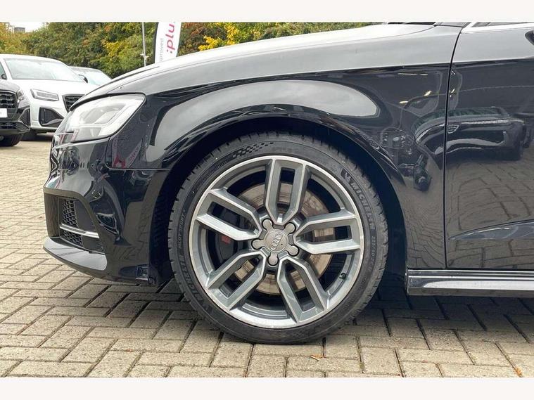 Audi connect, Audi drive select, Audi smartphone interface, Automatic start/stop system, Colour driver's information system display, Instrument dials with S3 logo, Mobile telephone preparation - bluetooth interface, Progressive power assisted steering, SD card based satellite navigation system, Service interval indicator, Speed limit display, Voice control system, Voice recognition for navigation system, S sports suspension, 2 USB interfaces and Aux-In jack, Audi music interface, CD player, DAB Digital radio, MMI radio plus with 7" colour MMI screen and MMI controller, Aluminium door mirror housings, Aluminium window trim, Audi Beam uses LEDs to project the Audi Sport logo, Auto dimming rear view mirror with light and rain sensors, Electric front windows, Electric rear windows, Electrically adjustable and heated door mirrors with integrated LED side indicators, Headlight washers, Heated windscreen washer jets, LED daytime running lights, Matt black radiator grille, Rear wiper, S body styling with front bumper 'S' specific air intake grille, rear diffuser with platinum grey insert, roof spoiler, Sport specific side air inlet grille and diffuser insert, Twin oval chrome trimmed exhaust tailpipes, 3 adjustable rear headrests, 4 lashing points to secure luggage, Adjustable front centre armrest, Black cloth headlining, Dual zone electronic climate control, Front and rear interior lights with delay, Front/rear floor mats, Glovebox light, Height and reach adjustable steering wheel, Illuminated door sill trims with S logo, Isofix child seat preparation for front passenger/outer rear seats inc passenger airbag deactivation, Stainless steel pedals, Storage compartments in doors side trims, centre console and under front drivers seat, LED interior light pack - A3/RS3, Non smoking pack - A3, Storage and luggage pack - A3/RS3, 3 point seatbelts on all seats, ABS/EBD, Active bonnet, Active front headrests, Airbags - front driver/passenger, front & rear side, curtain, drivers knee, ASR, EDL, Electromechanical parking brake, ESC - Electronic Stability Control + traction control, Front passenger airbag deactivation, Hill hold assist, Manual rear child locks, Multi-Collision braking, Seatbelt warning, Tyre pressure warning, Warning triangle and first aid kit, Anti theft alarm, Anti-theft wheel bolts, Remote control central locking, Thatcham category 1 alarm + immobiliser, Aluminium air vent surrounds, Aluminium trim elements, Matt brushed aluminium inlays, Tool kit, Tyre repair kit,