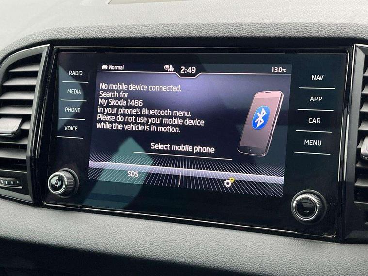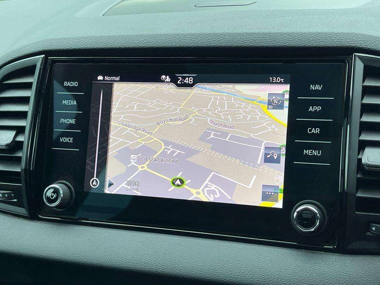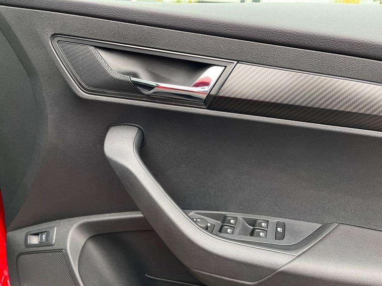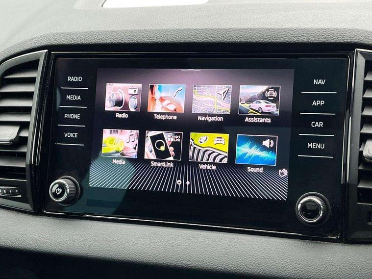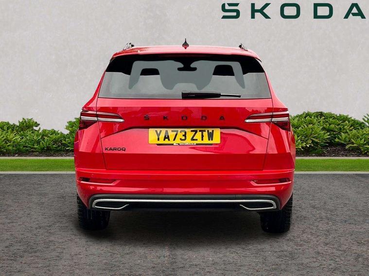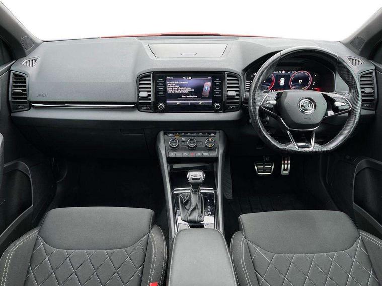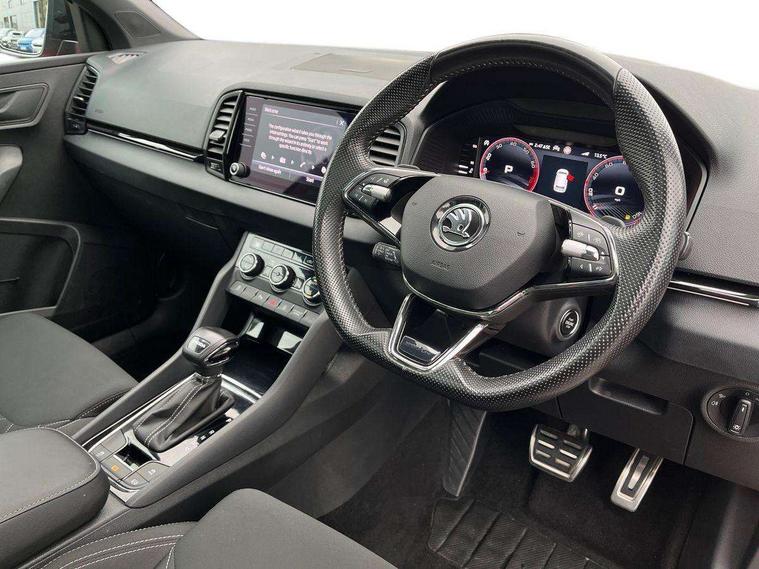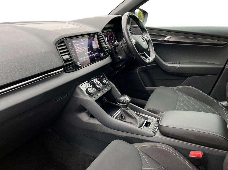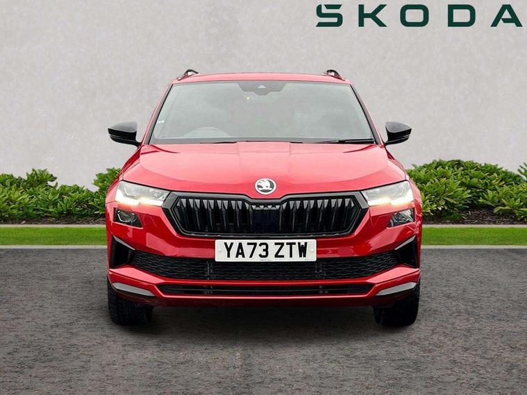 8" Digital display, Care connect, Driver fatigue sensor, Emergency services call system, Outside temperature gauge, Service interval indicator, SmartLink wireless for Apple and wired for Android, Start/stop system with regenerative braking, USB C Port x 2 in front centre console, Virtual cockpit, Virtual pedal with electrically operated boot door, 8 Speakers, DAB radio with Bluetooth, USB connection, Wireless charging without wireless aerial connection, Acoustic glass, Aero front windscreen wipers with intermittent function, Auto dimming rear view mirror with light and rain sensors, Black door mirrors, Black electric window control buttons, Black radiator grille, Black roof rails, Body colour door handles, Electric front and rear windows with child proof lock, Front door steps with SportLine logo, Heated rear windscreen, LED daytime running lights, LED rear lights with high functionality welcome effect and dynamic indicators, Light assistant (coming/leaving home/tunnel light), Panoramic sliding sunroof, Plastic scuff plates, Privacy glass, Protective door side sills in body colour, Rear diffuser, Rear side wing doors, Rear spoiler, Rear window wiper with washer system and intermittent control, Safety reflectors on front doors, Skoda lettering on tailgate in black, Sportline badge on front fender, Sportline decorative inserts with badging, Sports front and rear bumpers, 1.5 litre bottle holders in driver and front passenger door panels, 12V socket in boot, 12v socket in front centre armrest with storage compartment and rear air vents, 3 rear height adjustable headrests, 3 seat bench in 2nd row, 3 spoke leather sports multifunction steering wheel and silver stitching with gear shift paddles, 4 foldable roof handles with rear coat hooks, Black floor carpet, Black roof headlining, Chrome inner door handles, Double sided boot floor, Foldable hooks in the boot, Front head restraints, Height adjustable front three point seats belts with tensioners, Height/reach adjust steering wheel, Ice scraper, Illuminated glovebox, Illuminated luggage compartment, Isofix child seat preparation outer rear, Manual lumbar support for front seats, Pen holder, Pollen filter, Rear boot cover, Rear reading lights, Rear seats fixed folding and divided 60:40, Rubbish bin door, Safety vest holder, Single front passenger seat, Storage box in upper central dashboard closed, Sunvisors with illuminated vanity mirrors, Textile floor mats, Ticket holder, Titan black interior ceiling, Welcome animation with sportline logo, Boot pack - Karoq, Light Pack - Karoq, Parking pack - Karoq, Automatic door unlocking in case of crash, Automatic fuel cut off in case of crash, Child locks on rear doors, Driver airbag, Electronic parking brake with auto hold function, Emergency rear braking signal, ESC including ABS, MSR, ASR, EDS, HBA, DSR, RBS, MKB and traction control, Front side airbags, Hill hold control, Knee airbags, Passenger airbag with switch-off function, Pedestrian monitor, Seatbelt reminder signalisation and pretensioner for all seats, Three point seatbelts rear, Two tone horn, Tyre pressure display, Tyre pressure monitor, Alarm with interior monitoring, back up horn and tilt sensor with safe function, Electronic engine immobiliser, Keyless entry and start/stop, Remote central locking with 2 remote folding keys, Black air vent surround, Black centre console, Satin black dashboard, Satin black door trim, 19" Sagitarius anthracite alloy wheels with matt black aero inserts, Anti-theft wheel bolts protection, Matt black aero hub caps, Tool kit,
